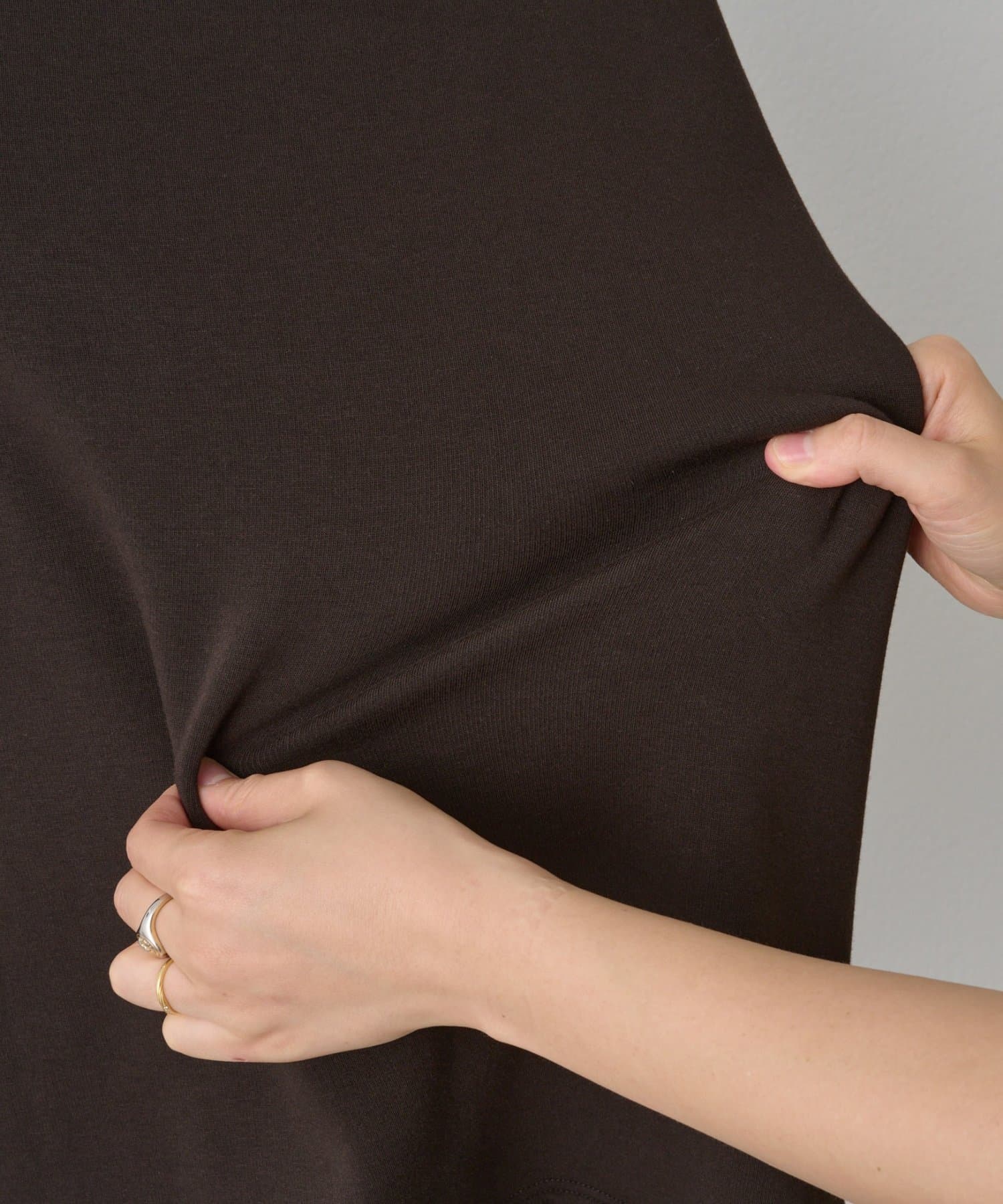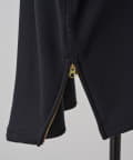 後ろ裾は緩やかなラウンドカットで、両サイドのゴールドジップを開けると軽やかな抜け感が。