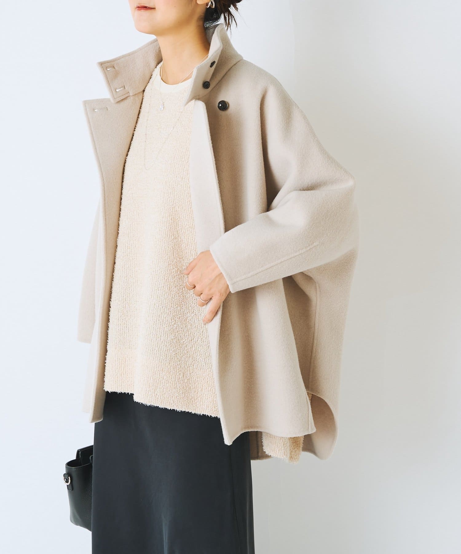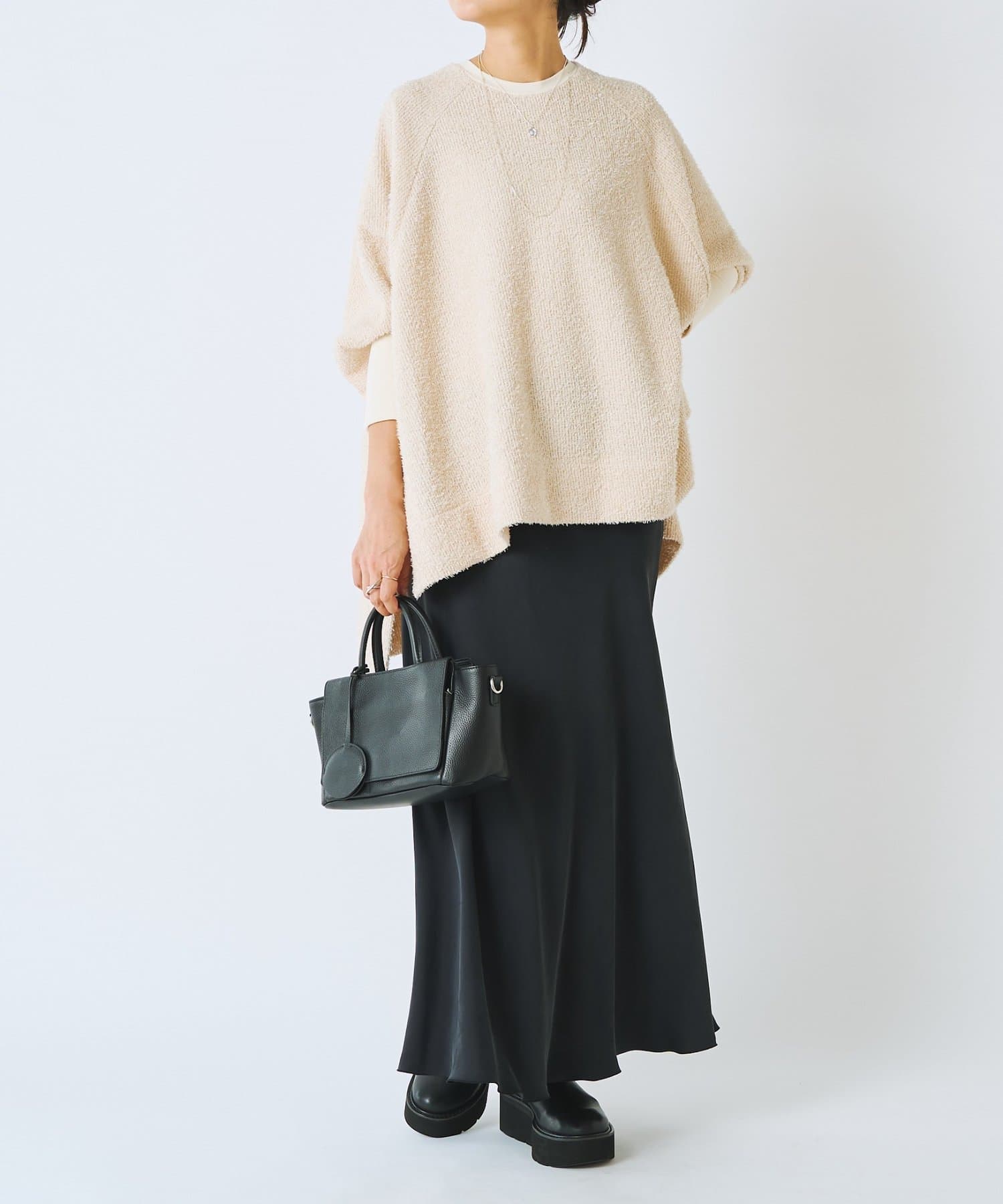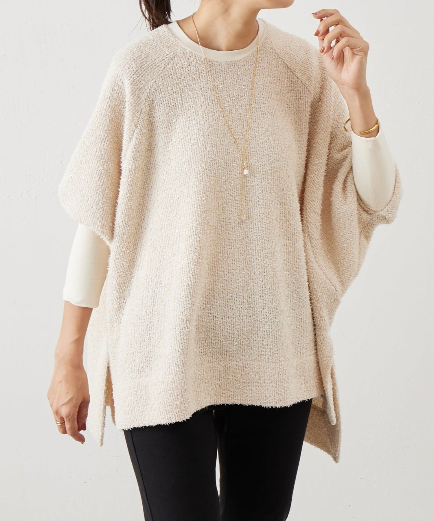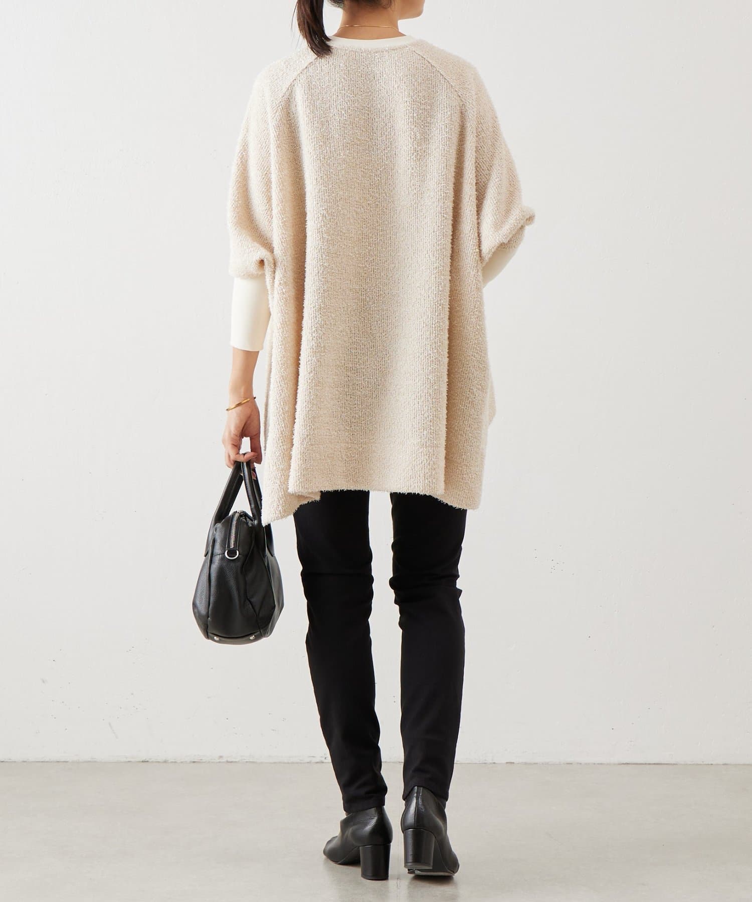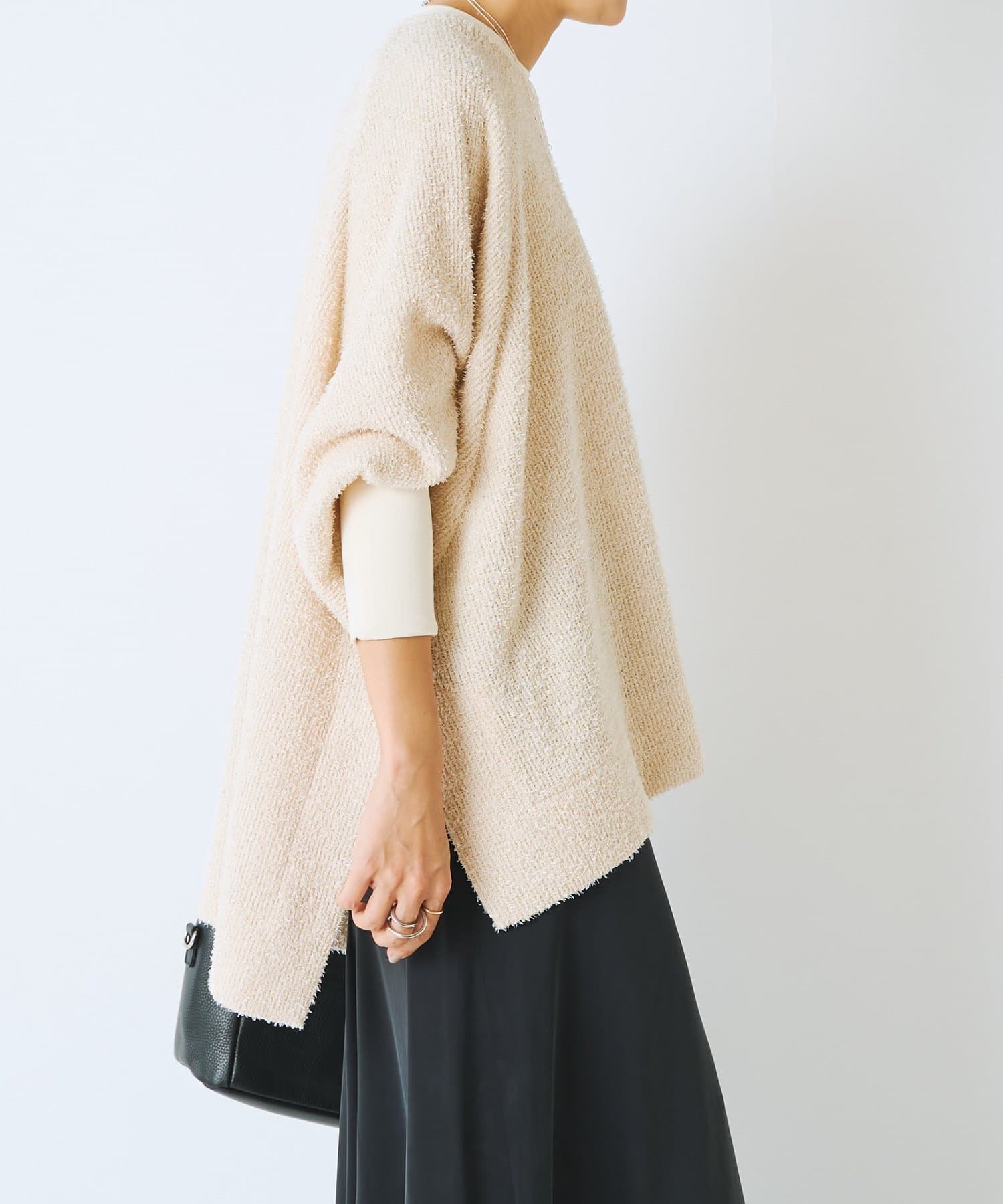 ドルマンスリーブのプルオーバーで、ビッグシルエットで身幅があり腰まわりがすっぽりと隠れます。