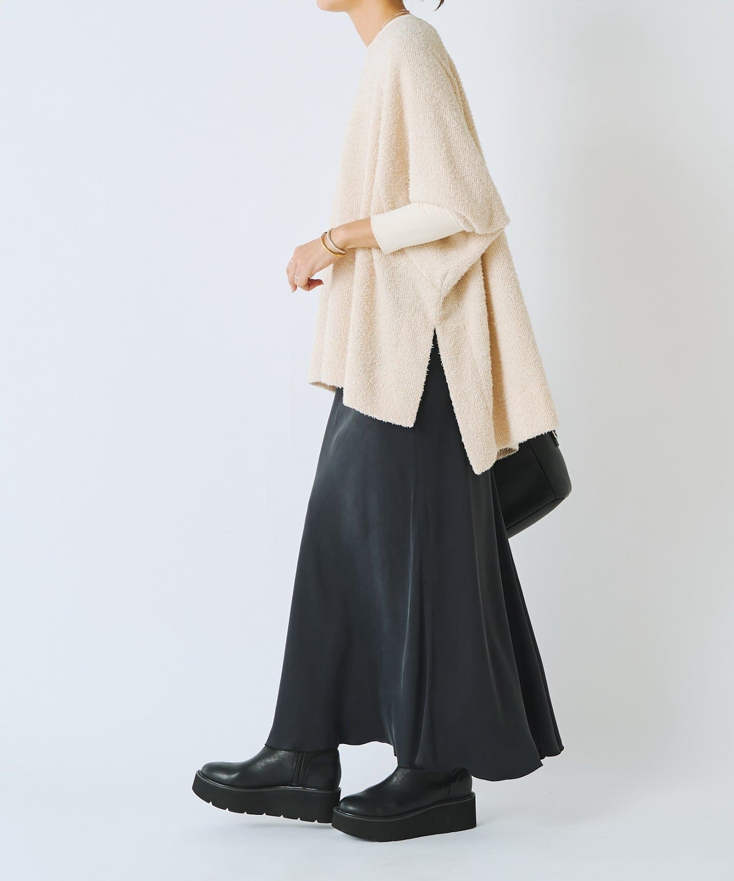 裾には長めのスリットが入り、前後差のある着丈。透け感がなく、後ろ裾が長いのでヒップラインが隠れるて安心です。