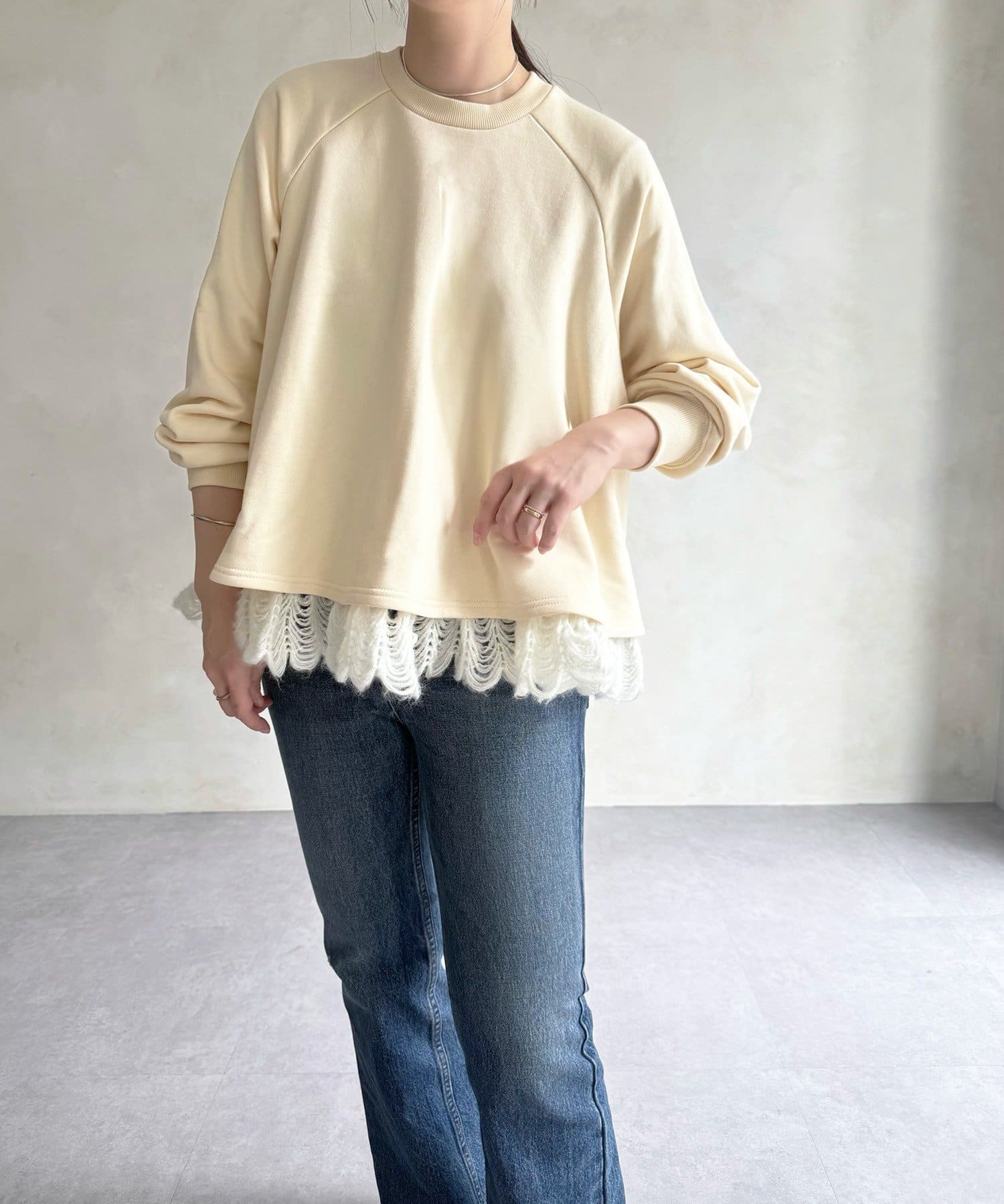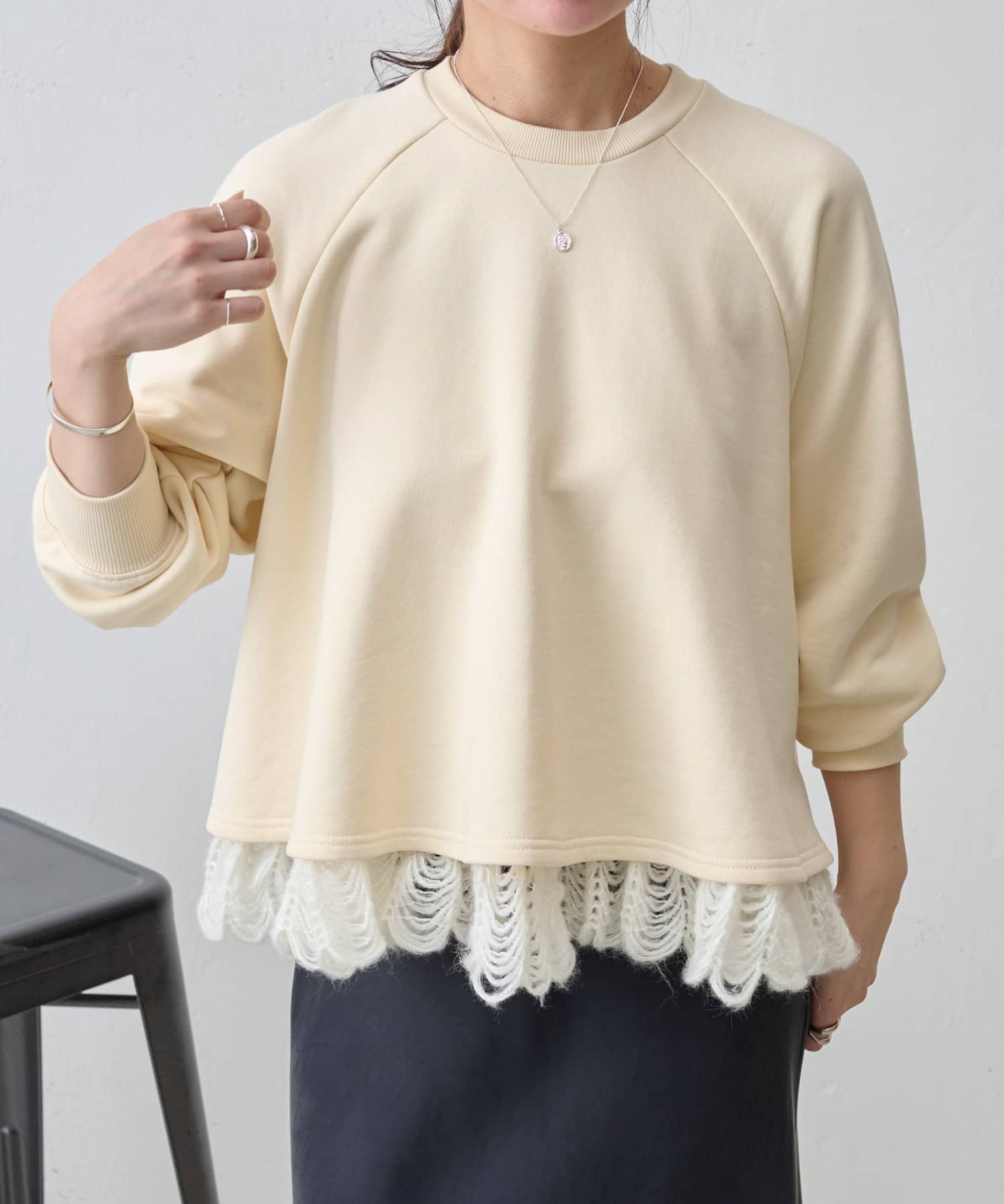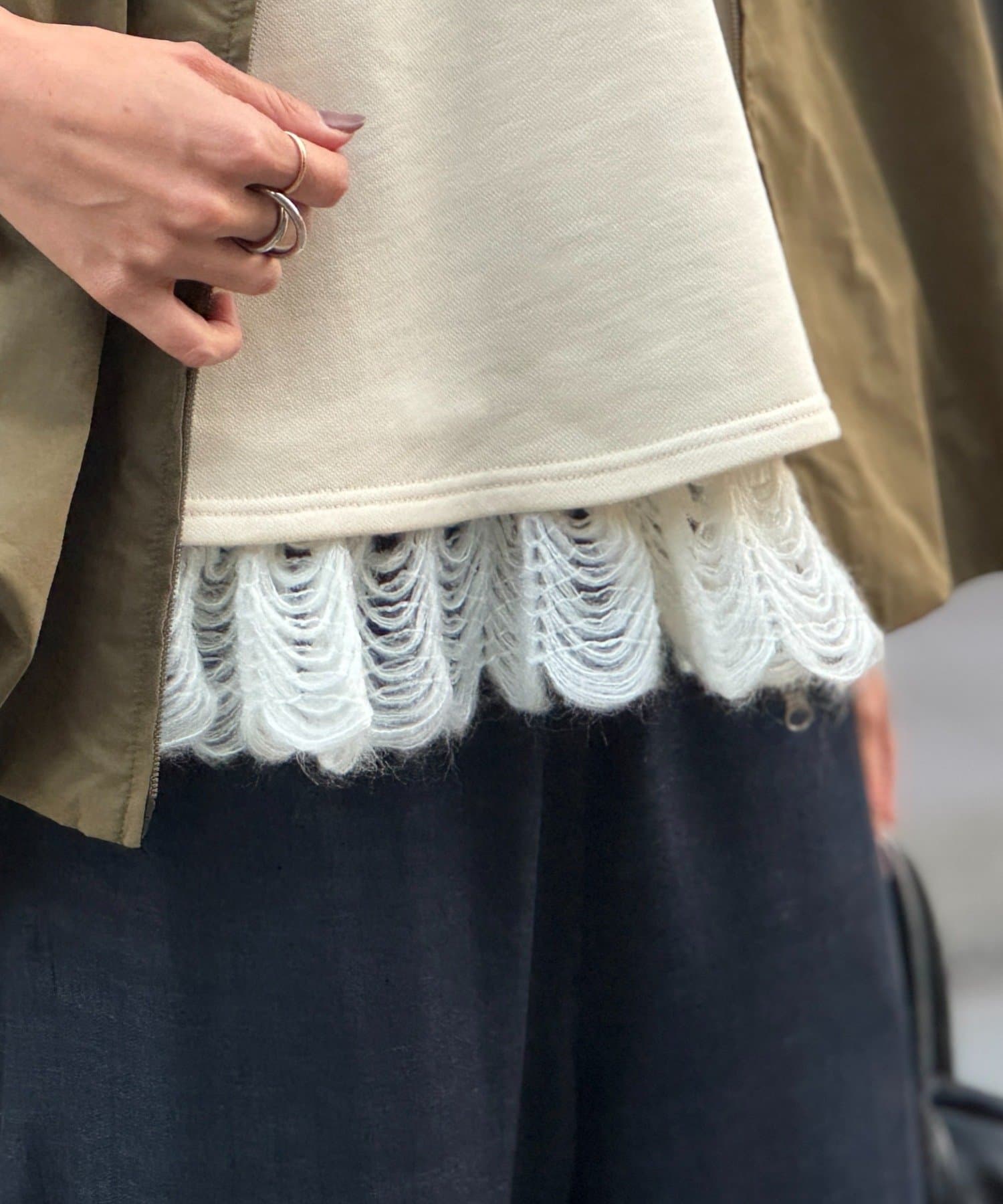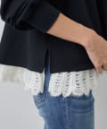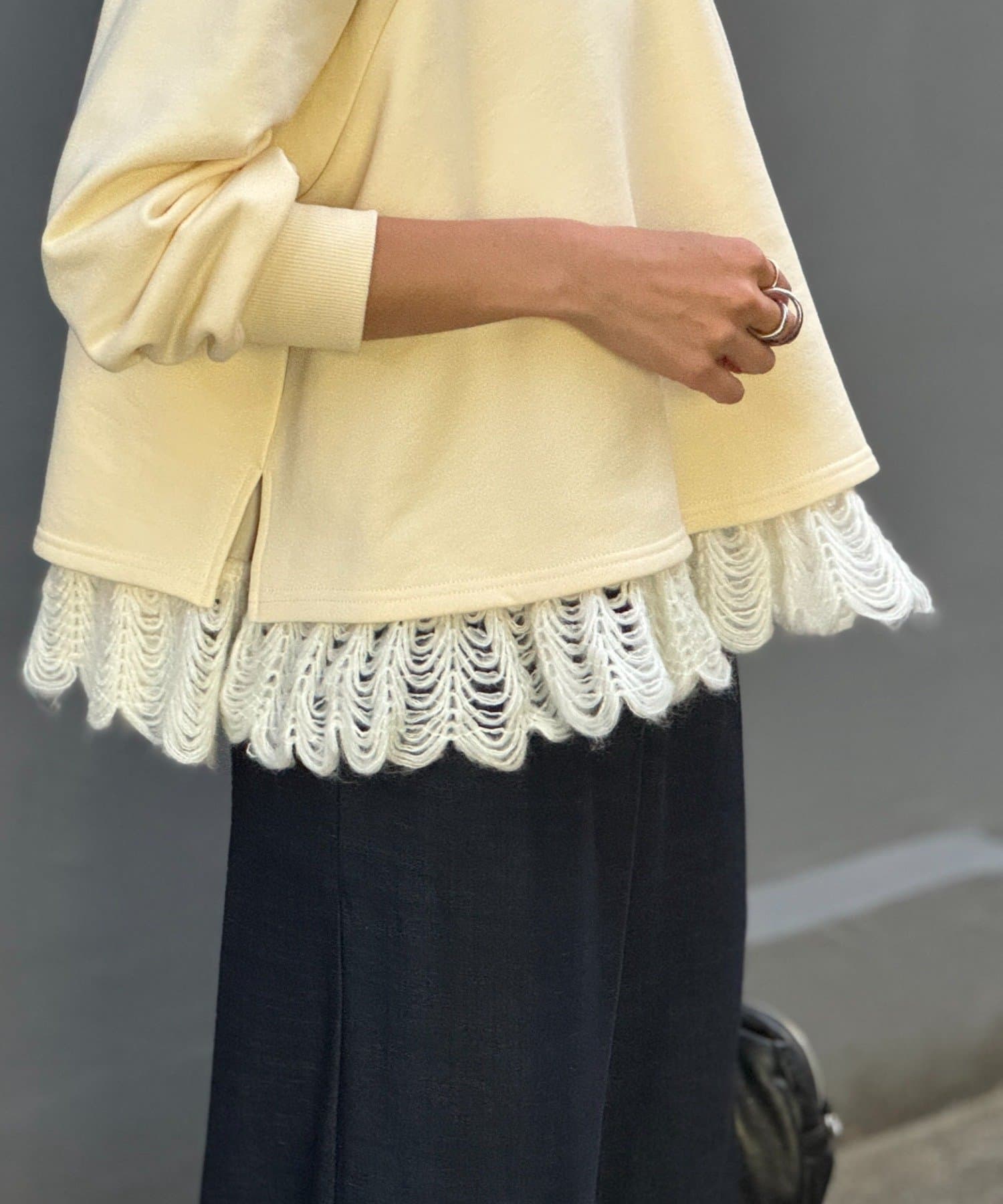 裾に、タム糸を使用した透かし編みのニットレースをあしらったカットソー。