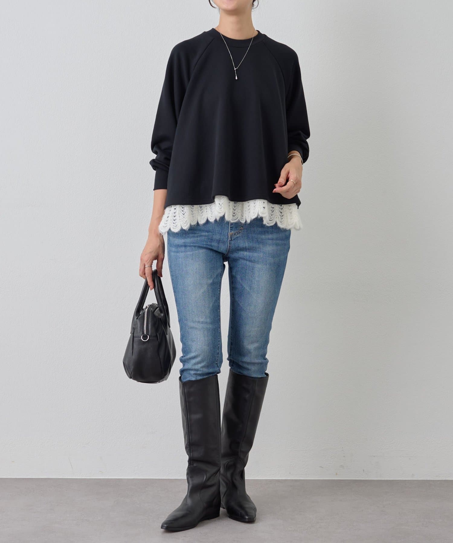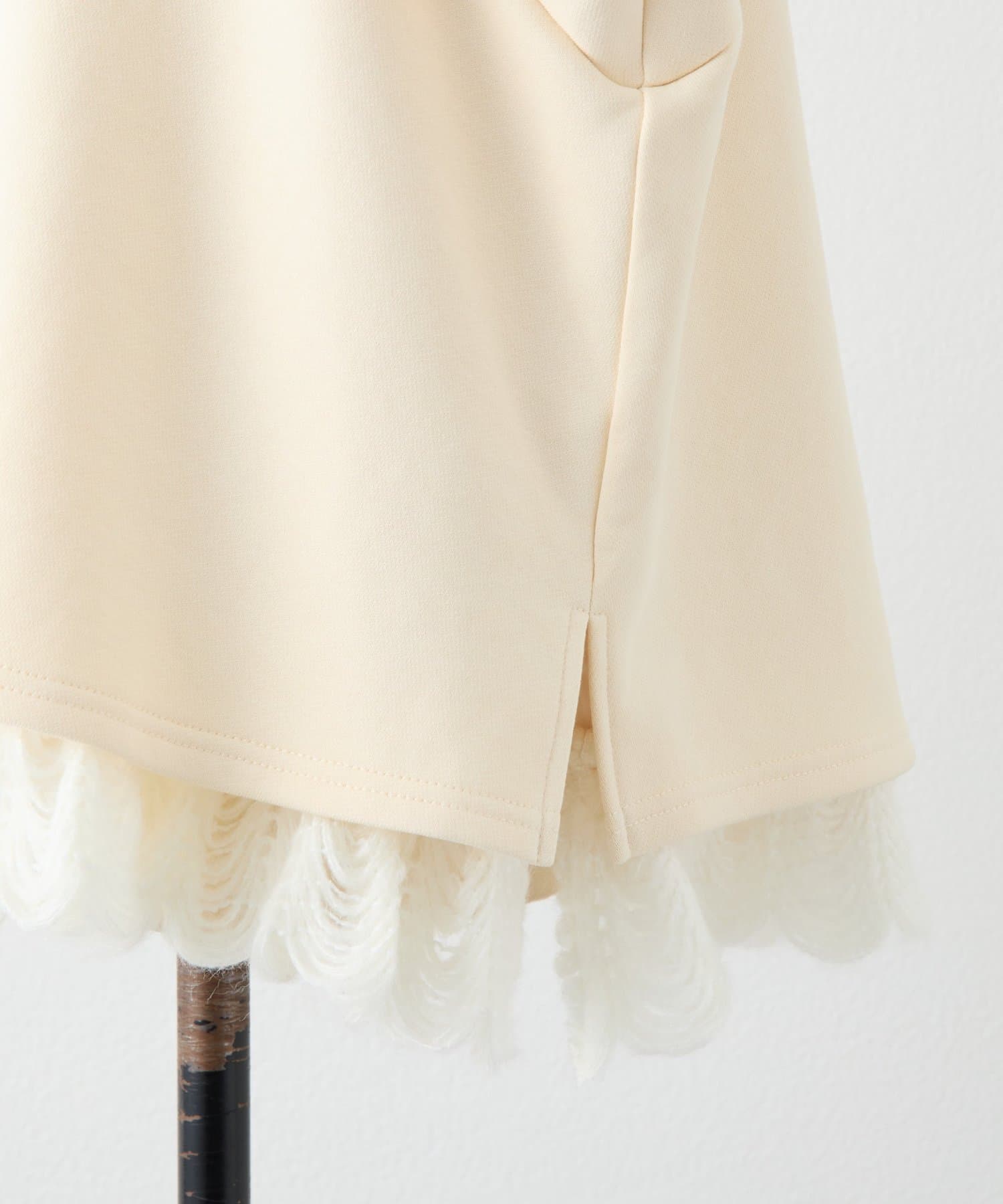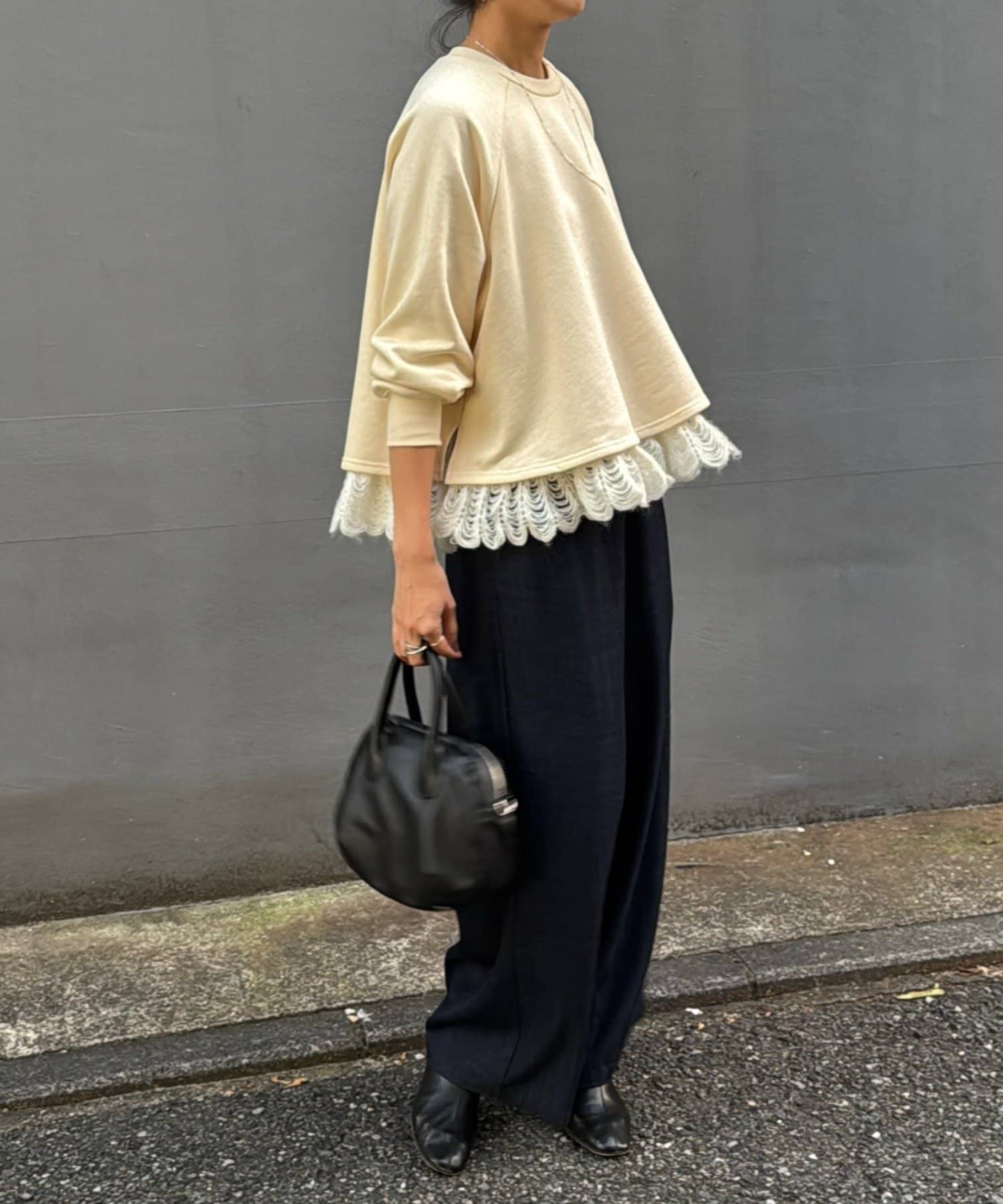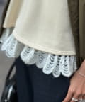 動くたびに裾のレースがやさしく揺れて、シンプルな着こなしに華やぎをプラス。