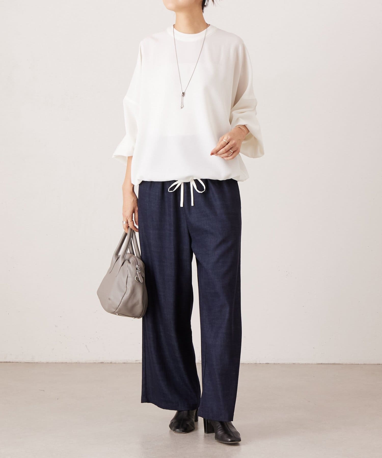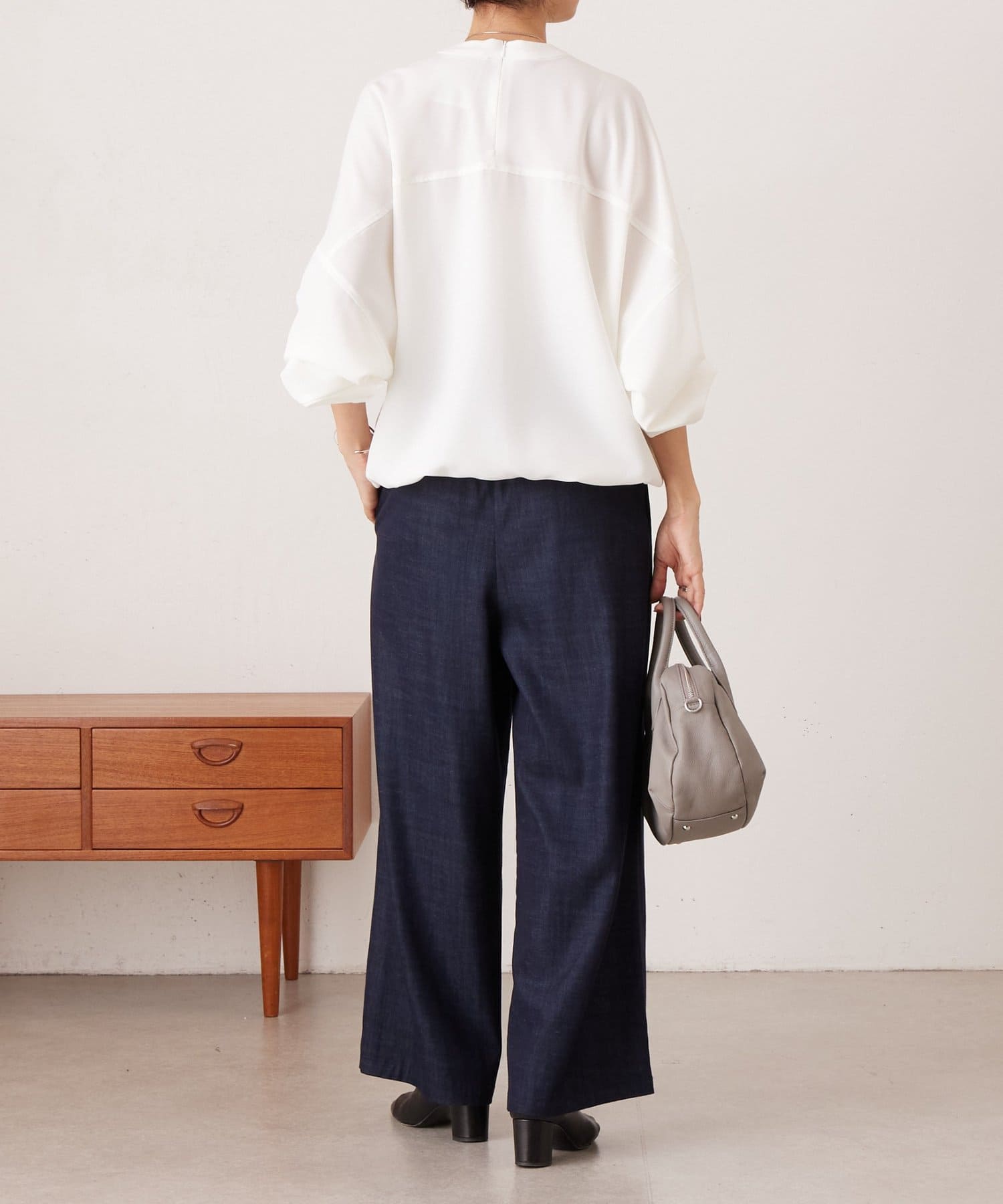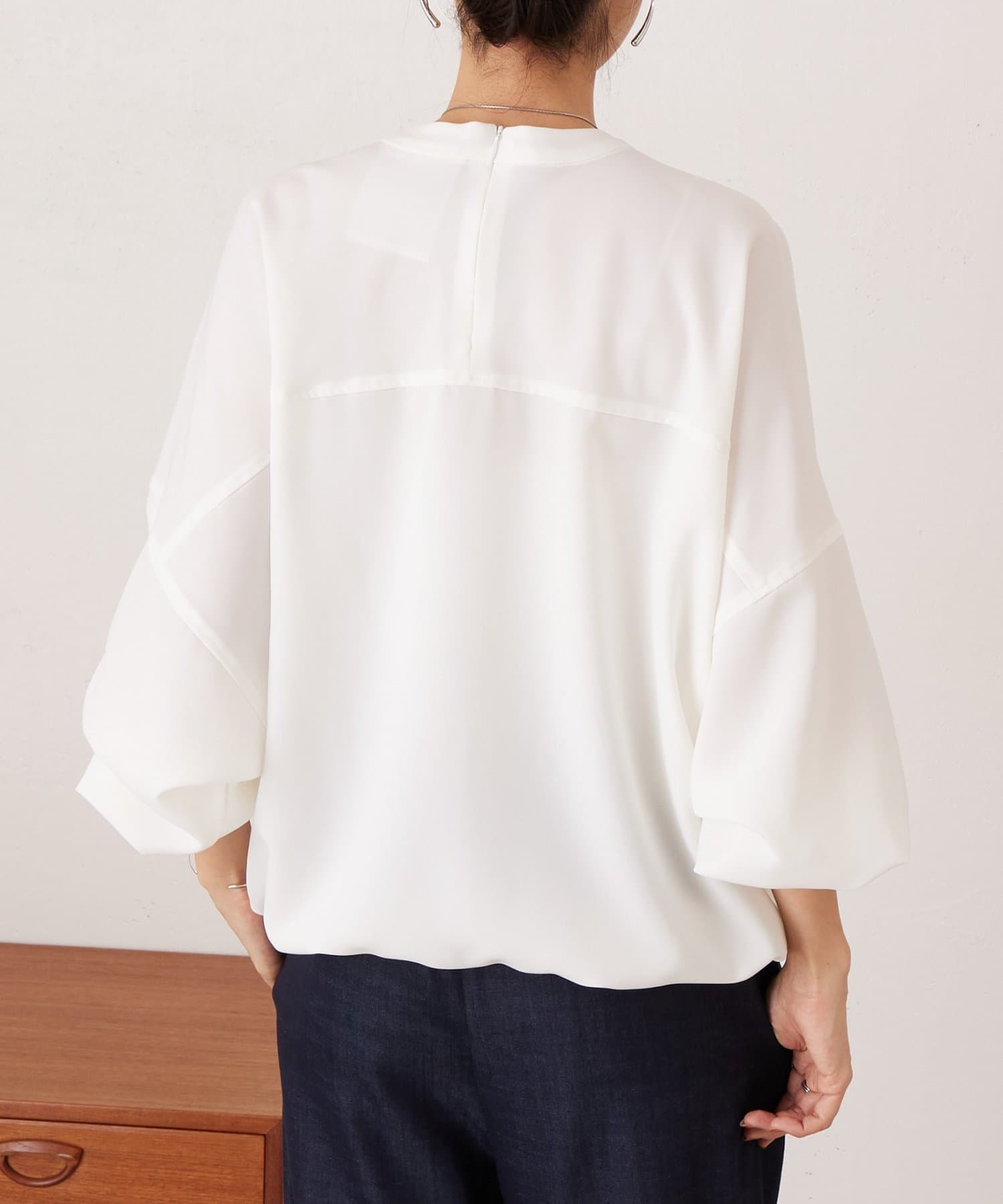 バンドカラーの上品な衿元がほどよいきちんと感を演出し、オケージョンにも活躍します。