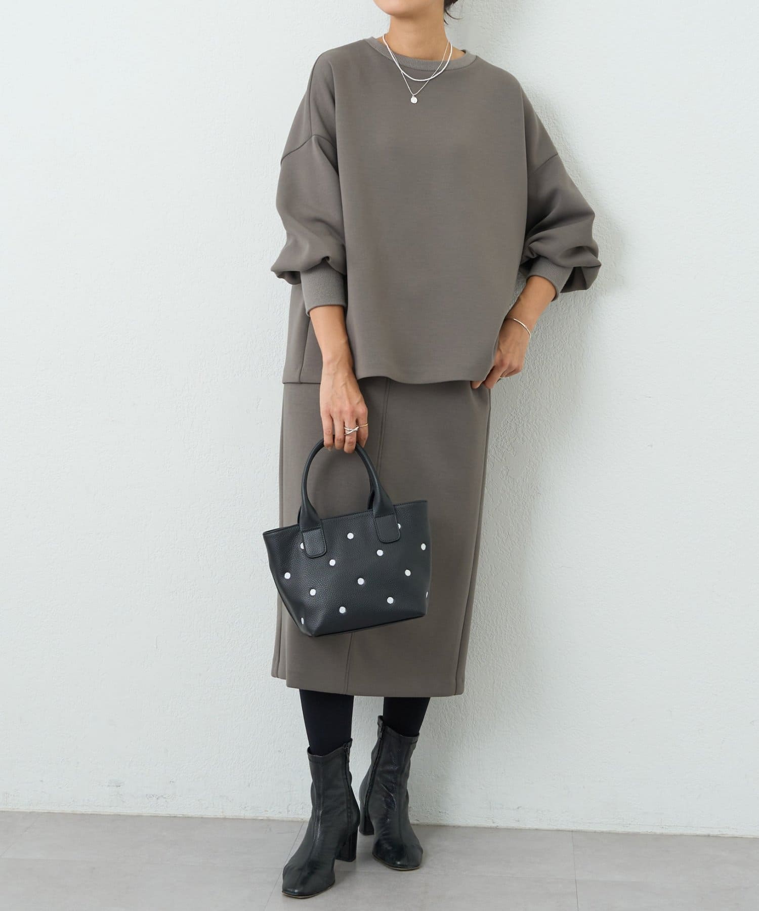 やわらかなレザーの質感と、刺繍ならではの温もりのあるドット模様がポイントです。