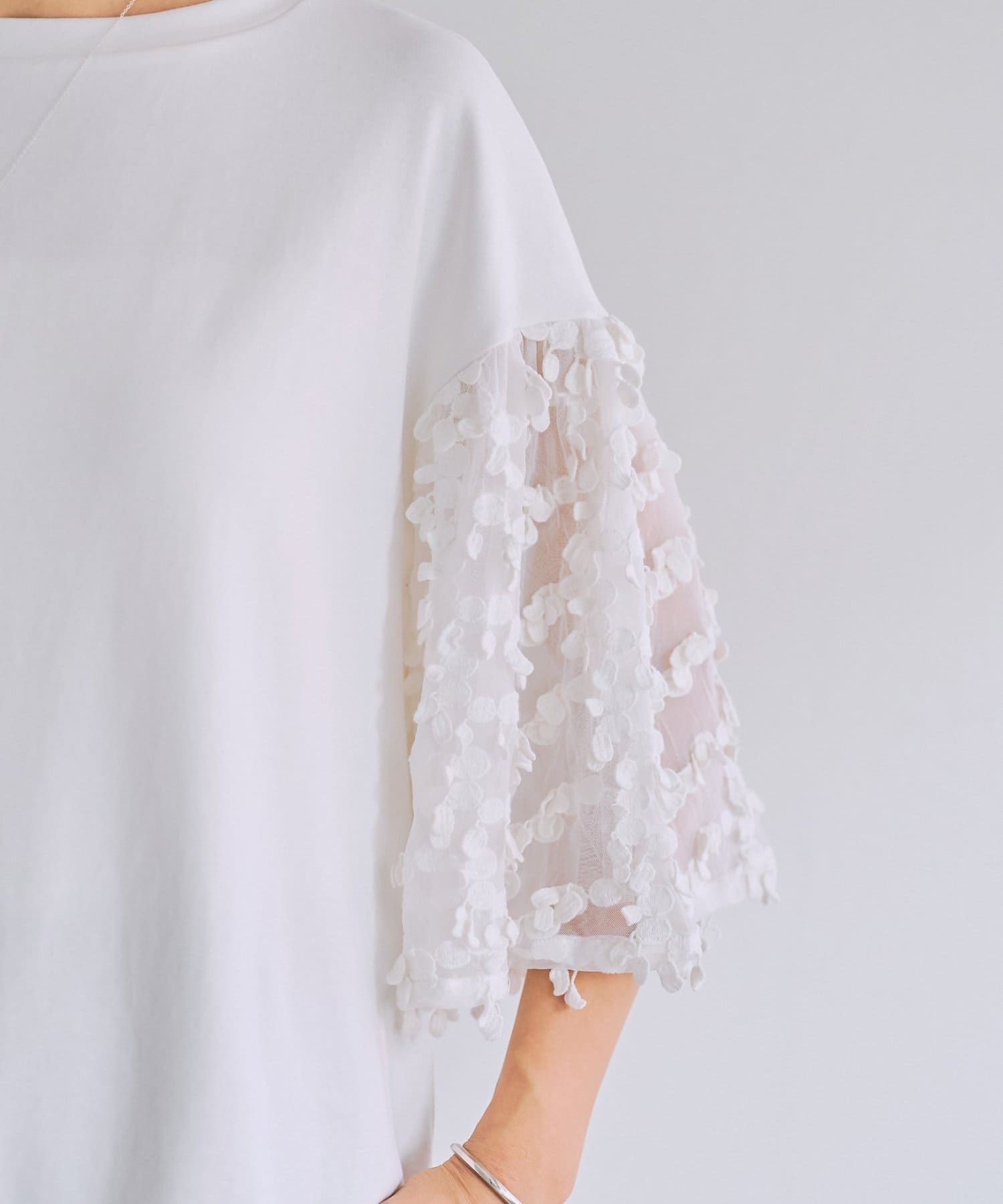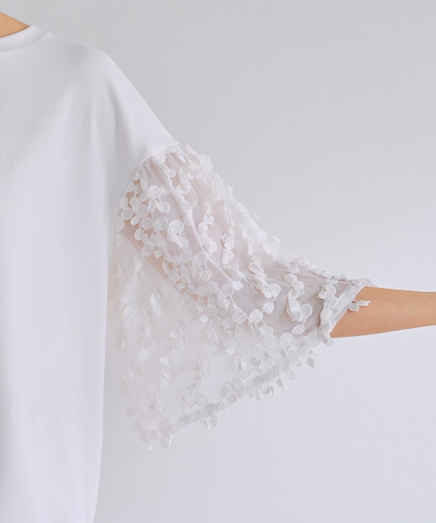 袖にはチュール素材と、チェリーモチーフが連なる繊細なレースをあしらい、動くたびに表情の出るデザインが魅力です。