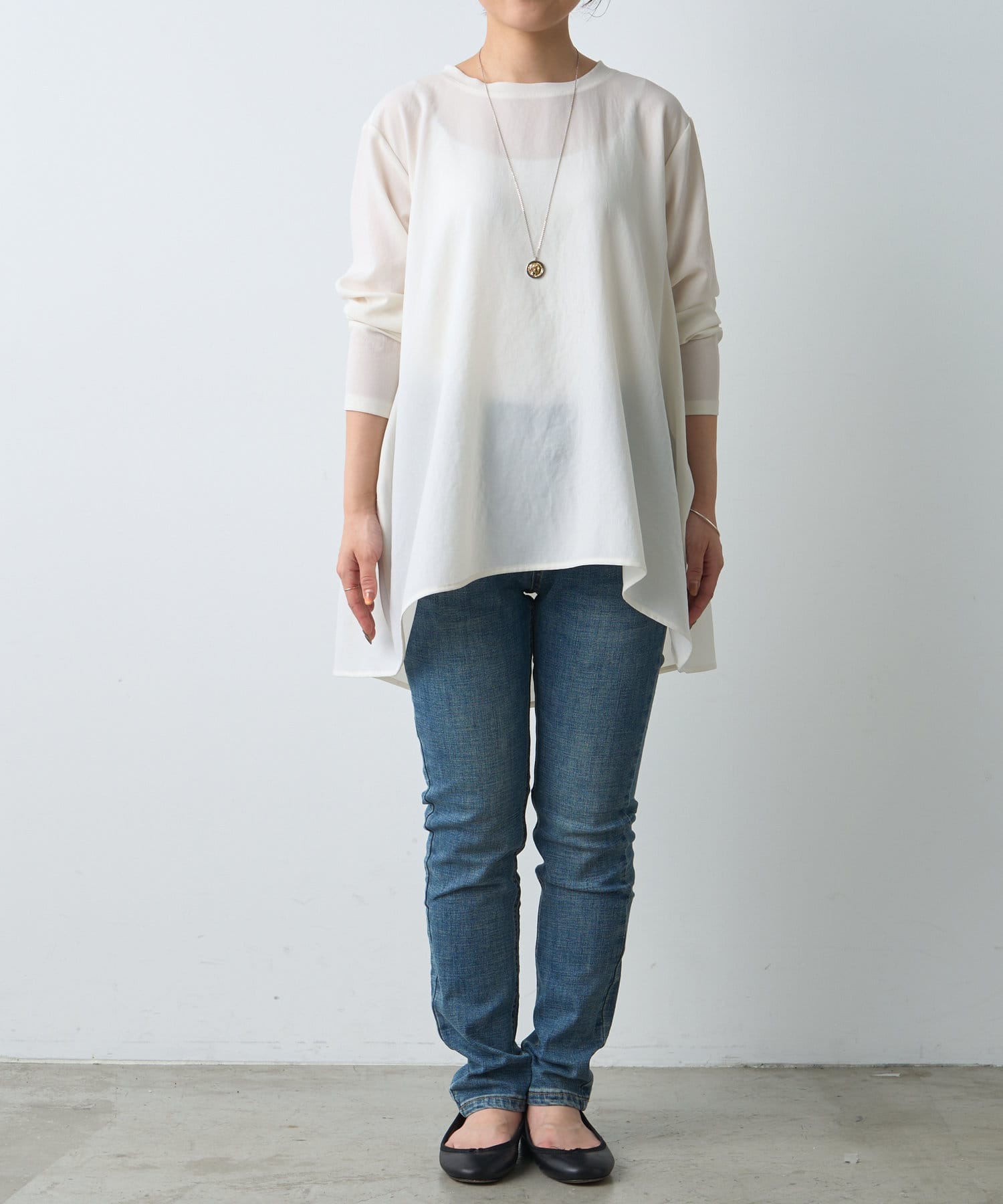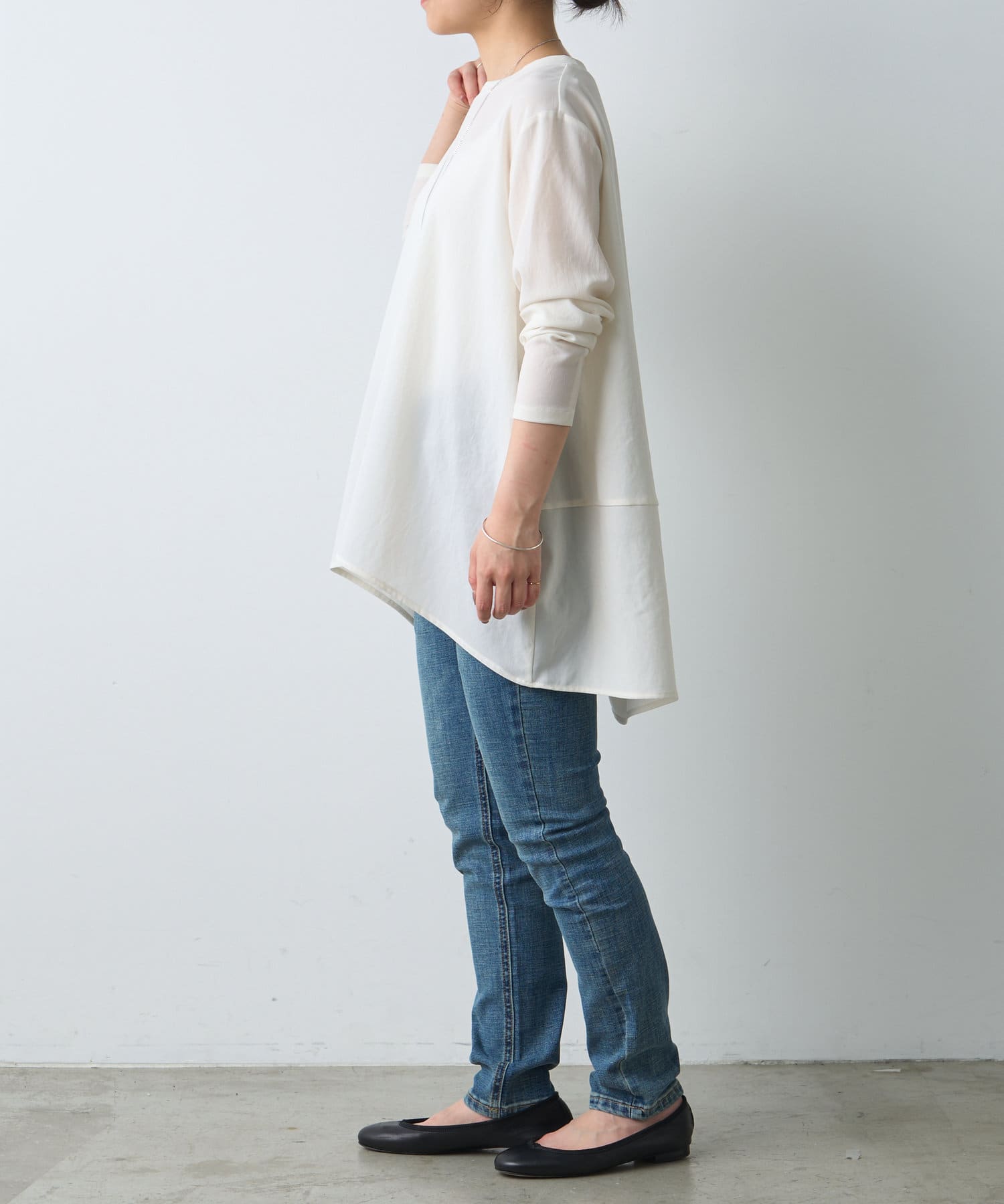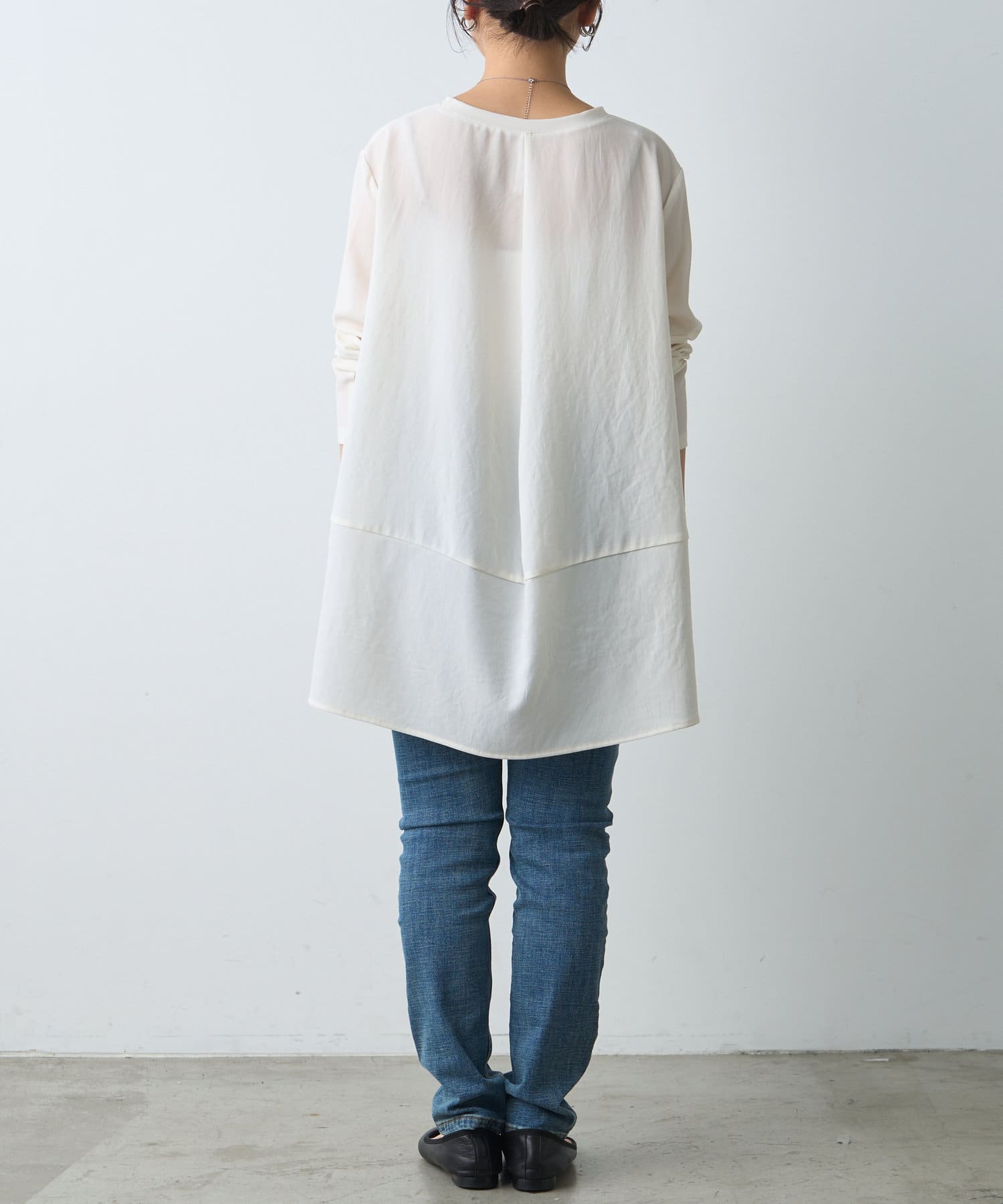 前後差のあるシルエットで後身頃は少し長くなっており、気になるヒップラインをカバーしてくれるデザイン。