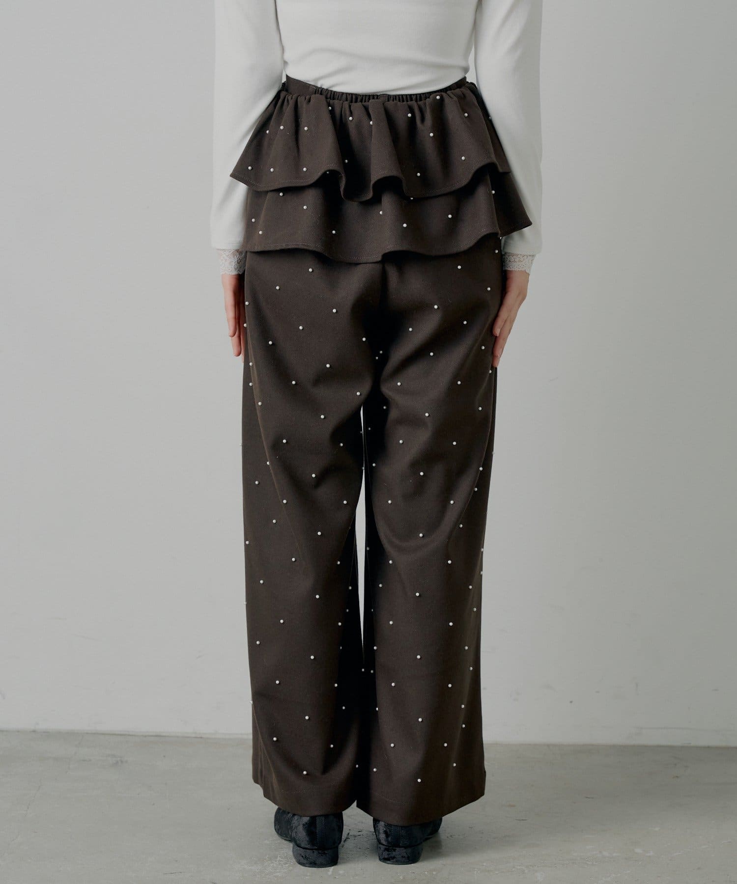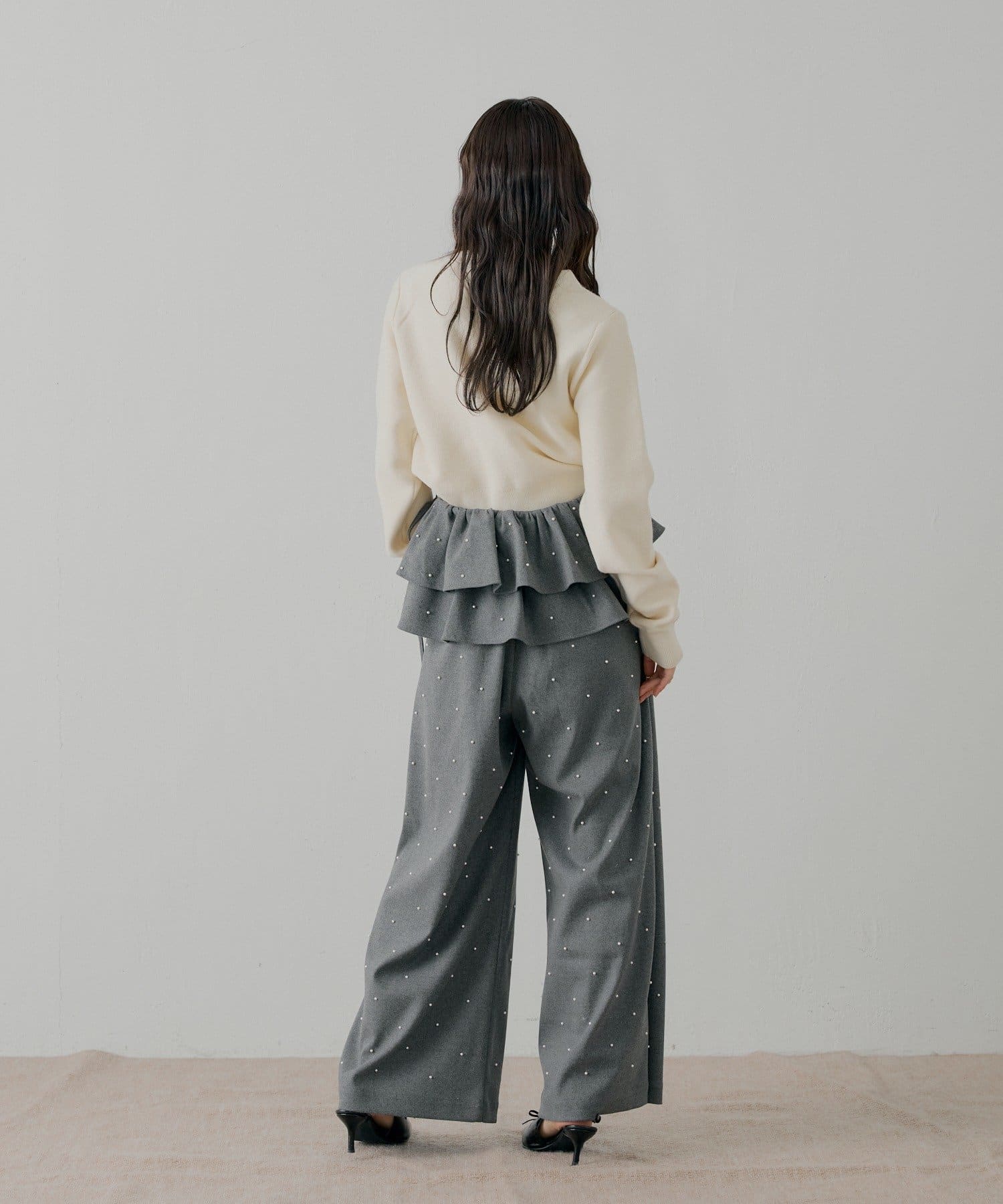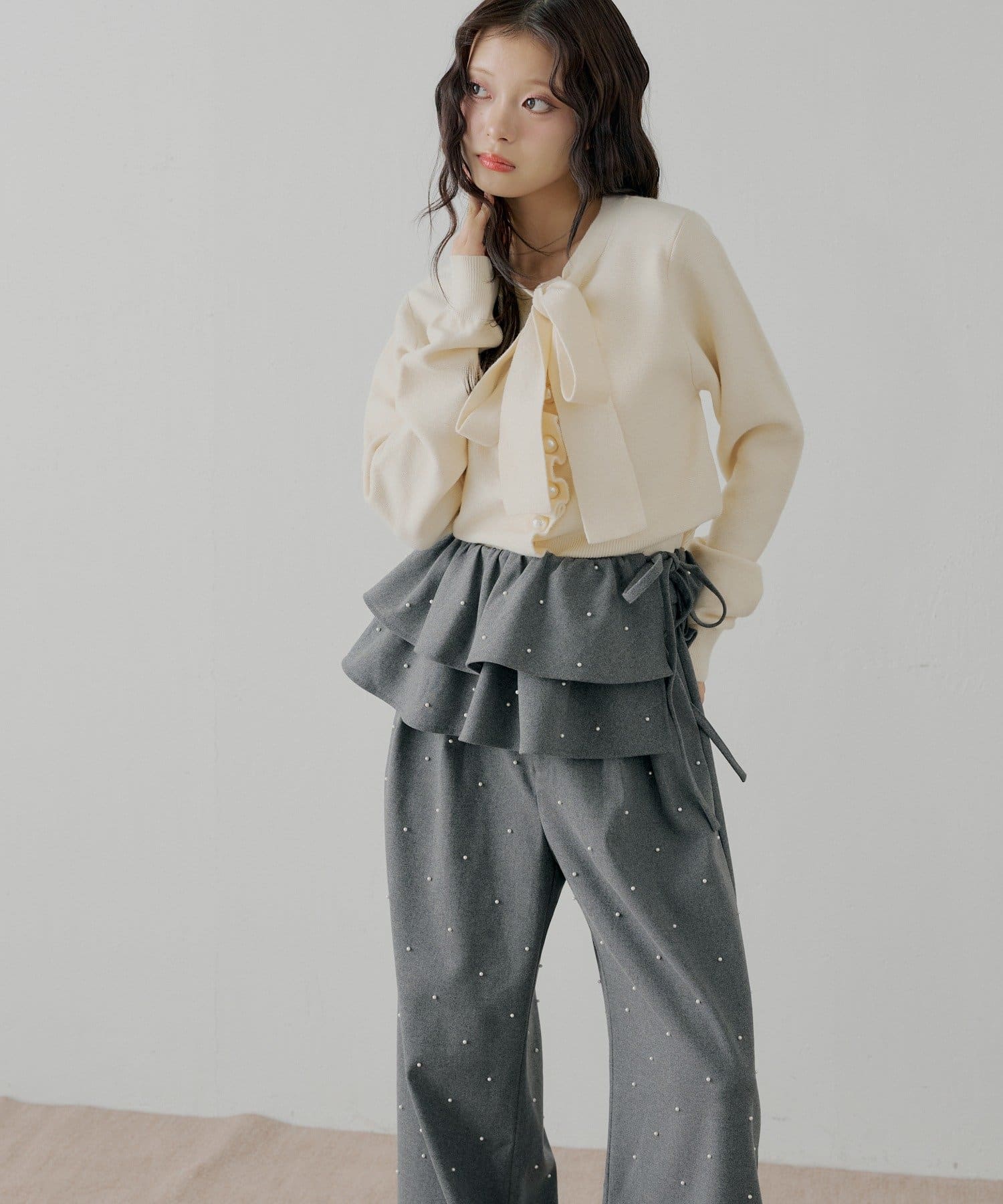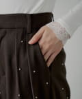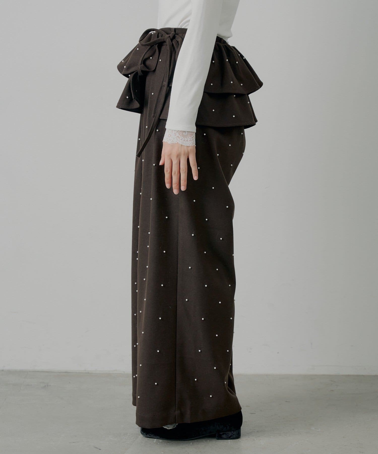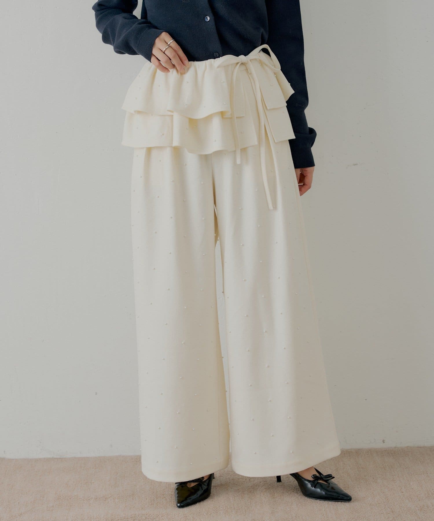 フリルと上品なパールが目を惹くルーズスラックスパンツ登場!