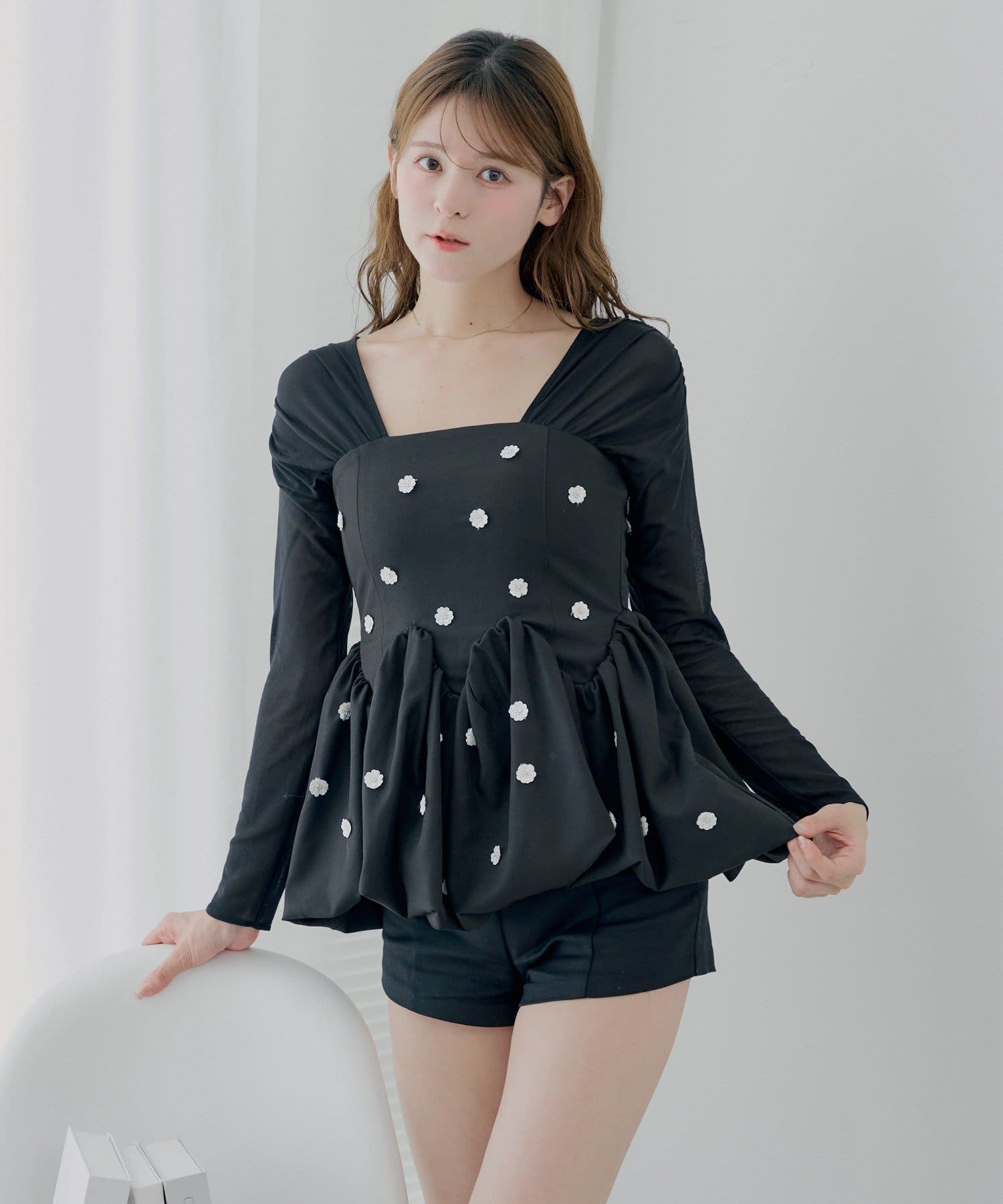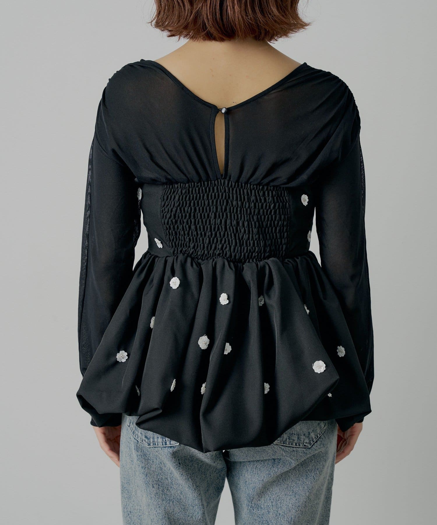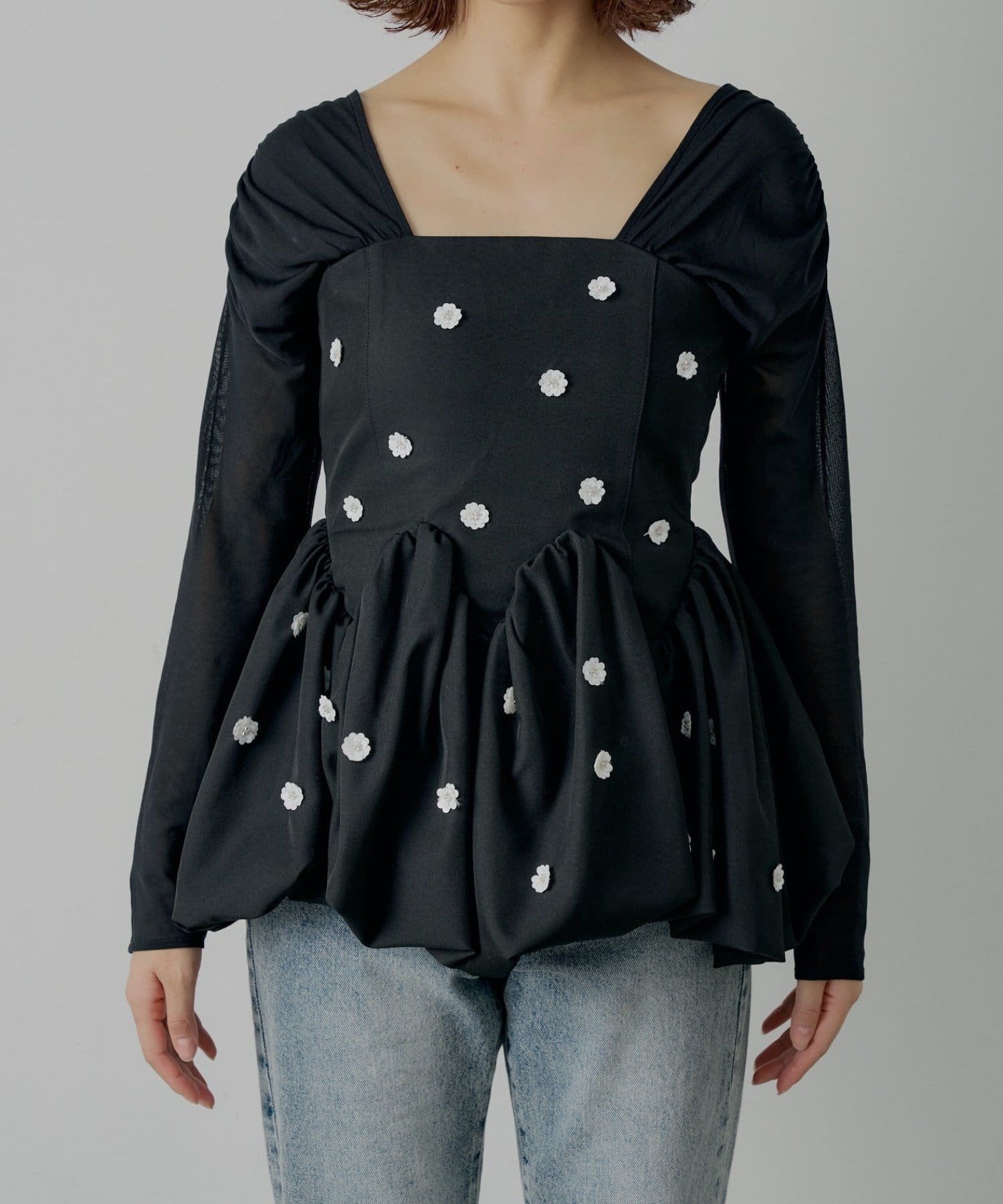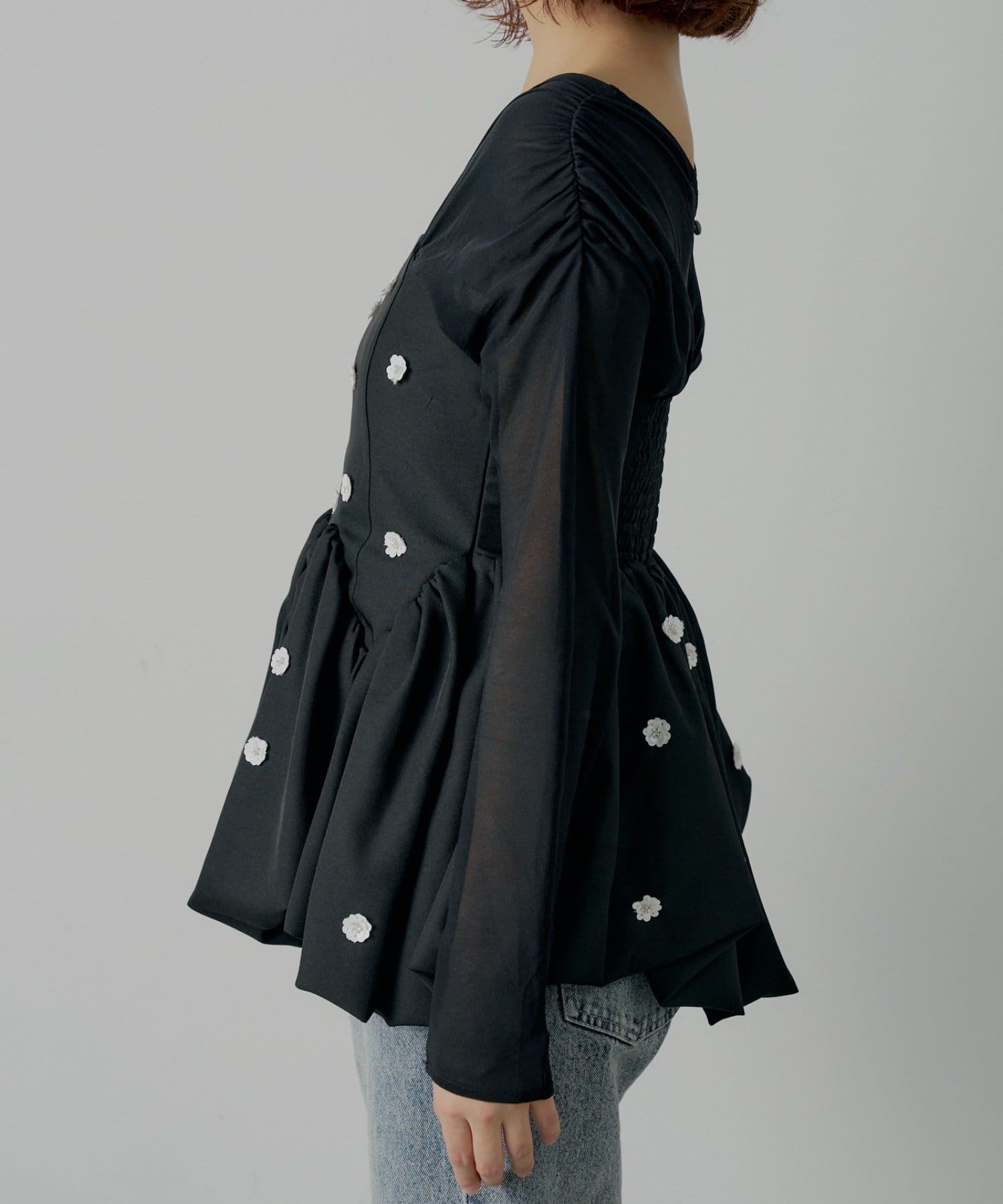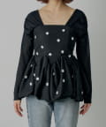 全体に散りばめられたフラワーモチーフが目を惹くペプラムブラウス登場!