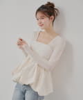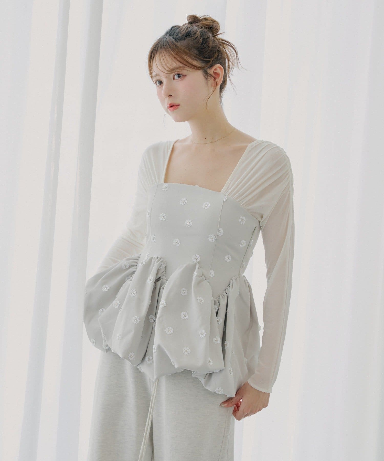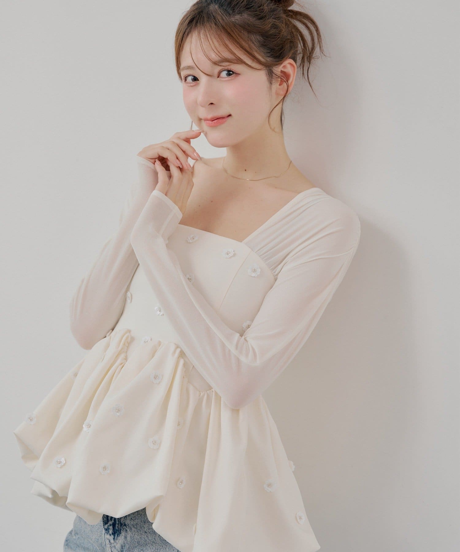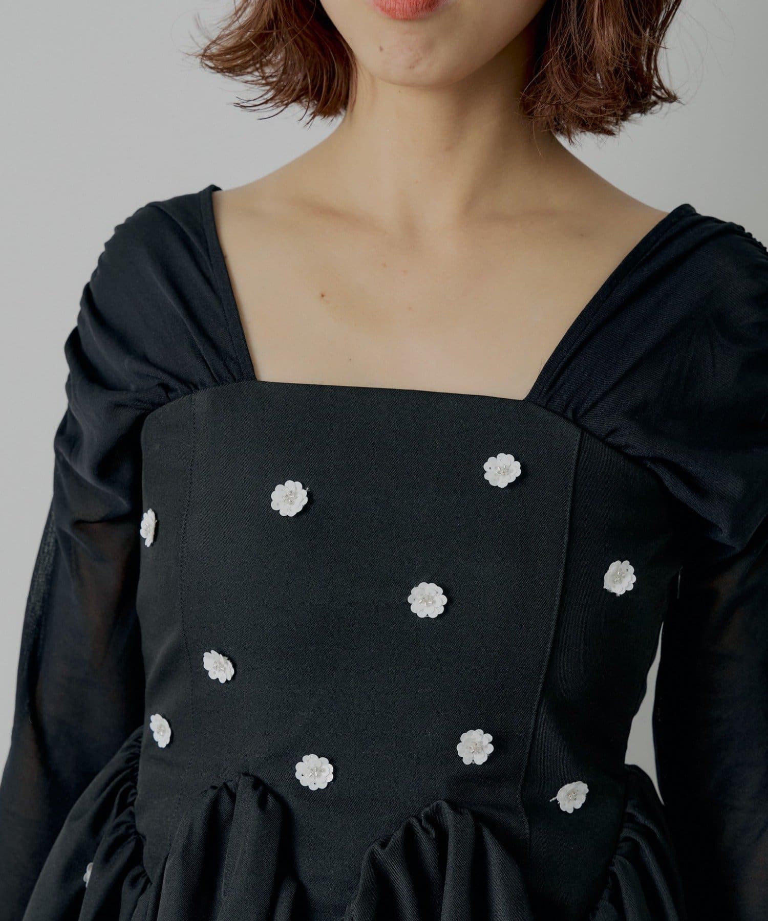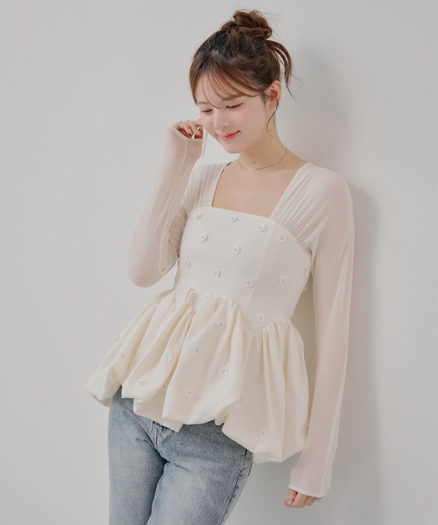 全体に散りばめられたフラワーモチーフが目を惹くペプラムブラウス登場!