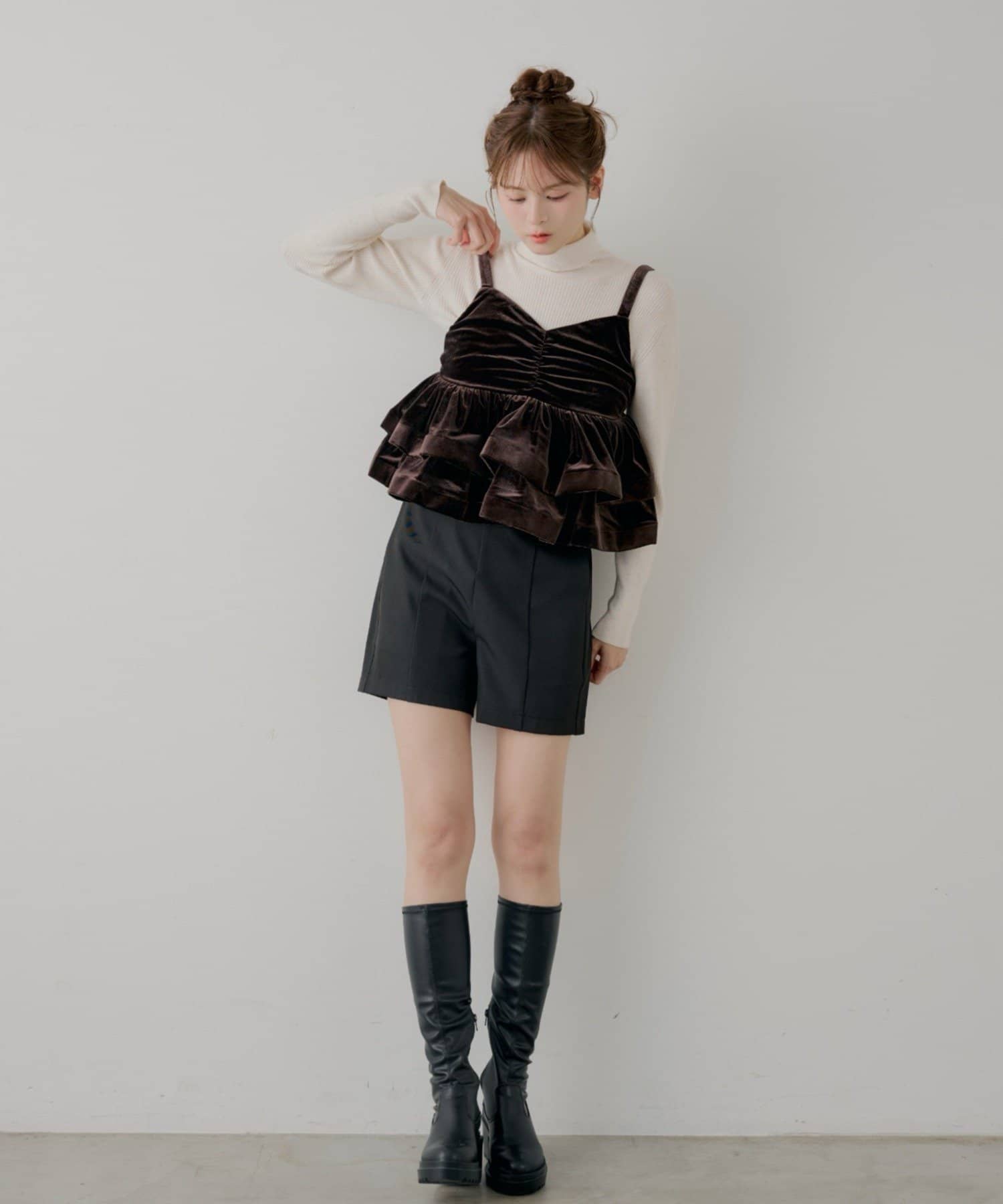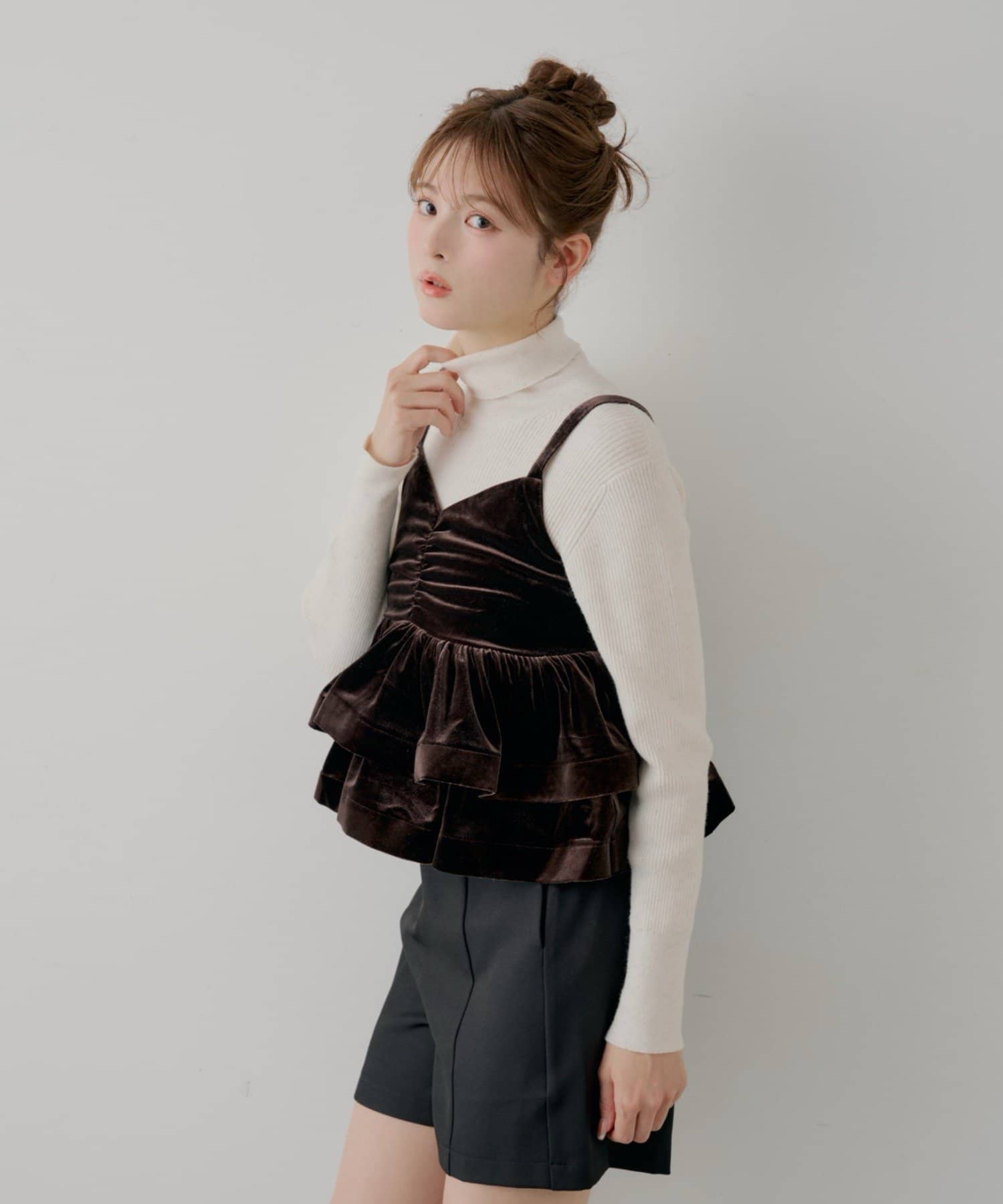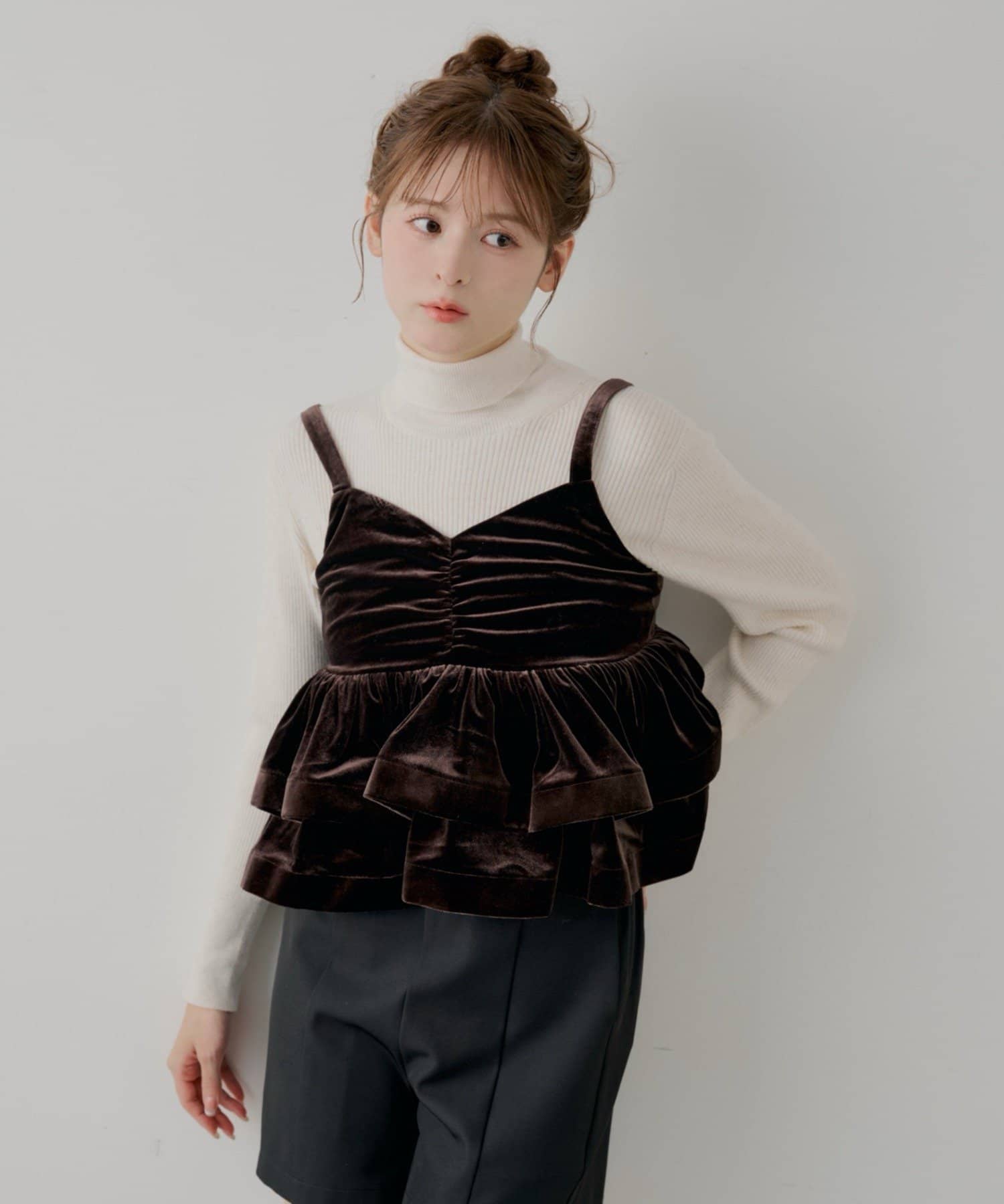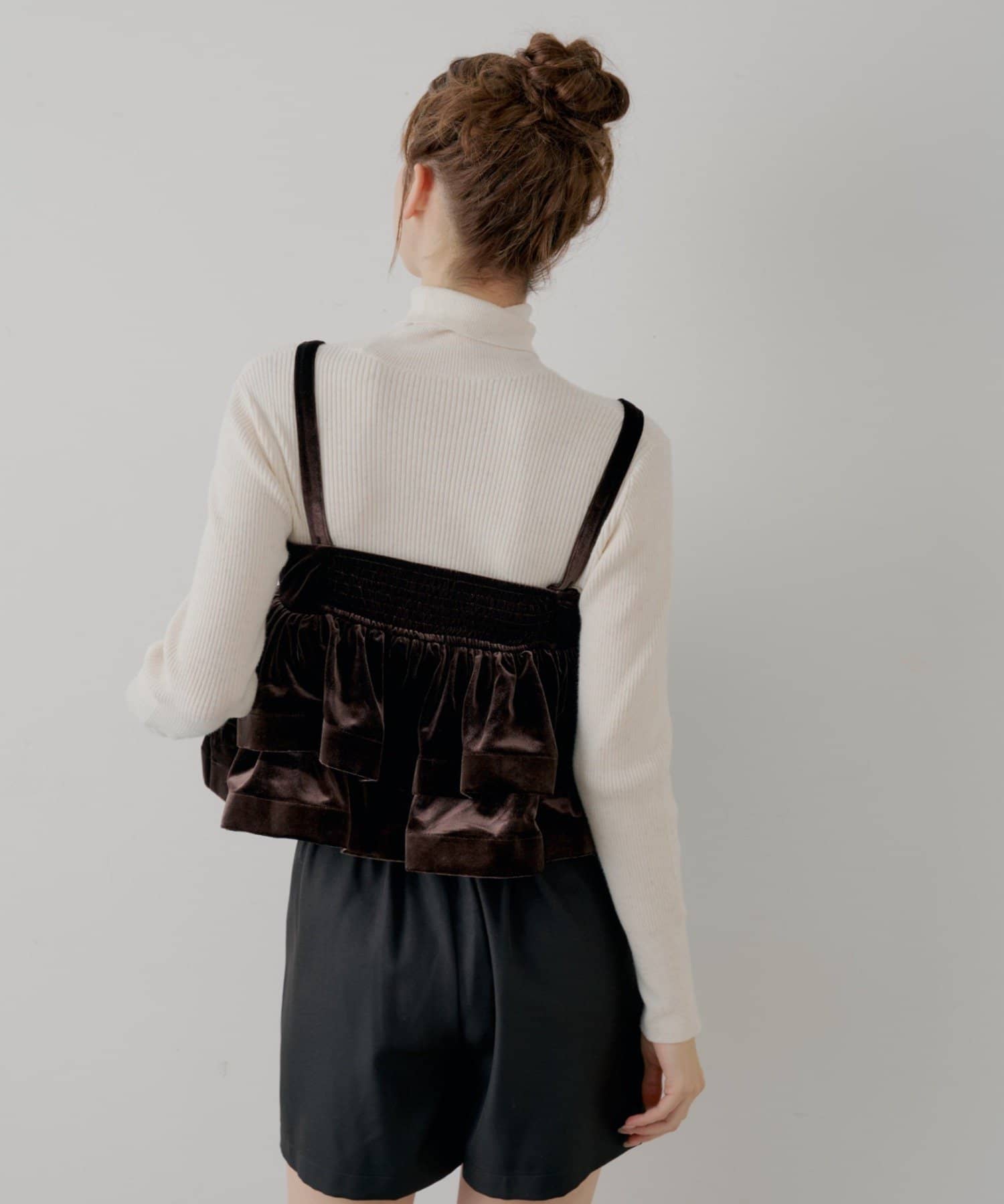 ・上品な光沢と滑らかな肌触りが魅力のベロアラッフルビスチェ。