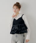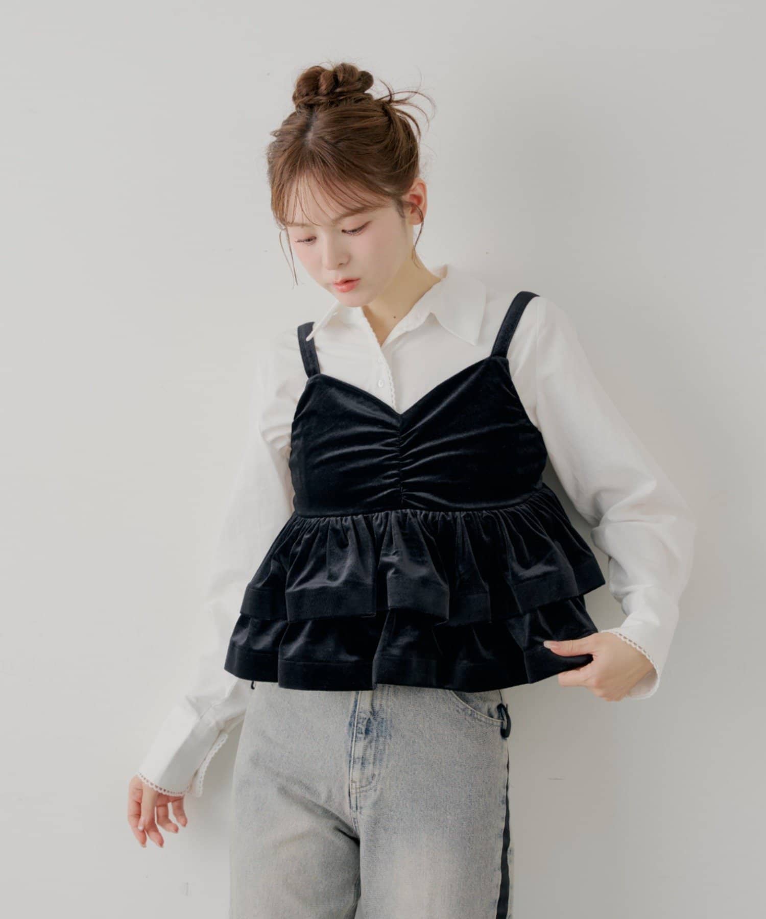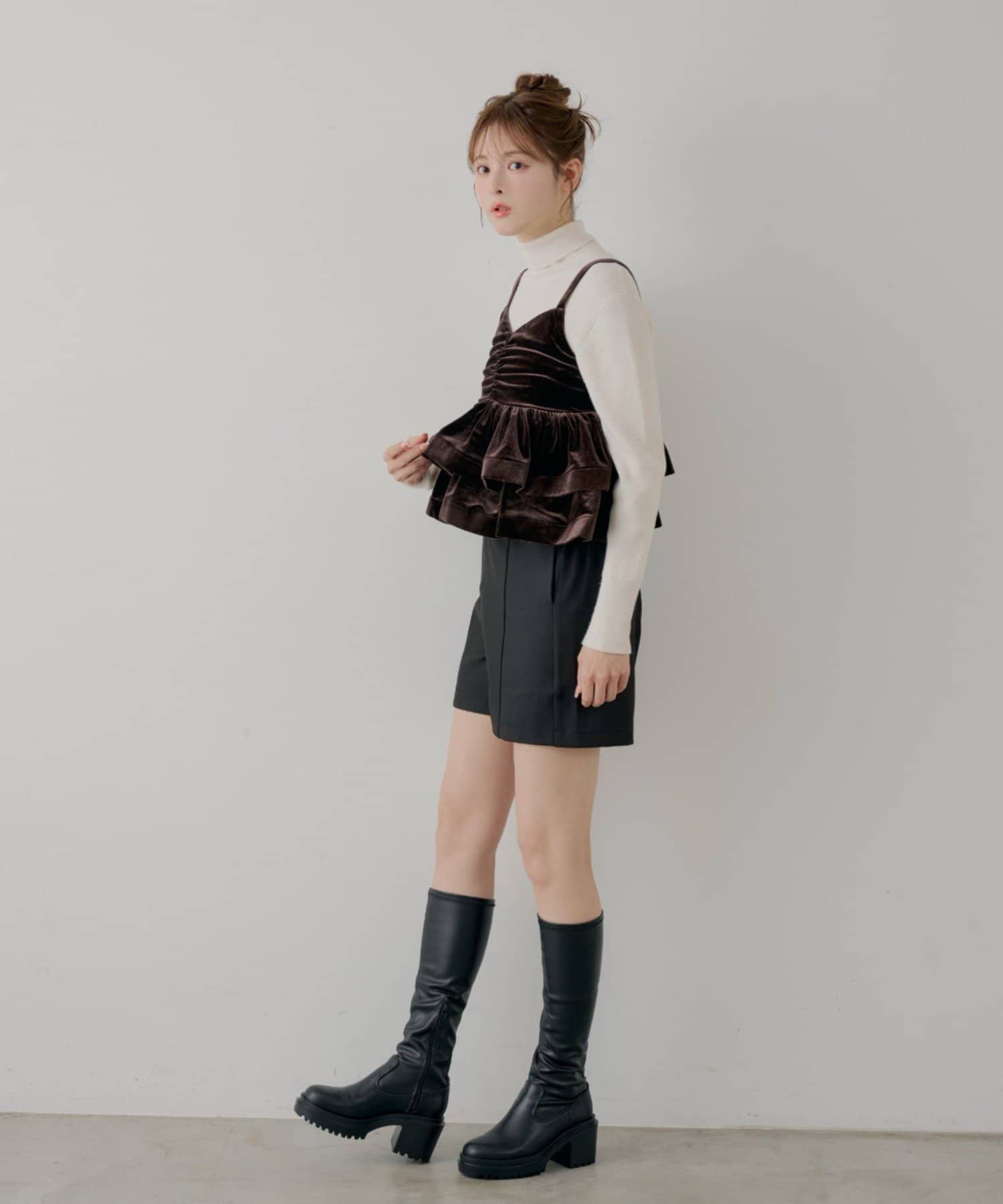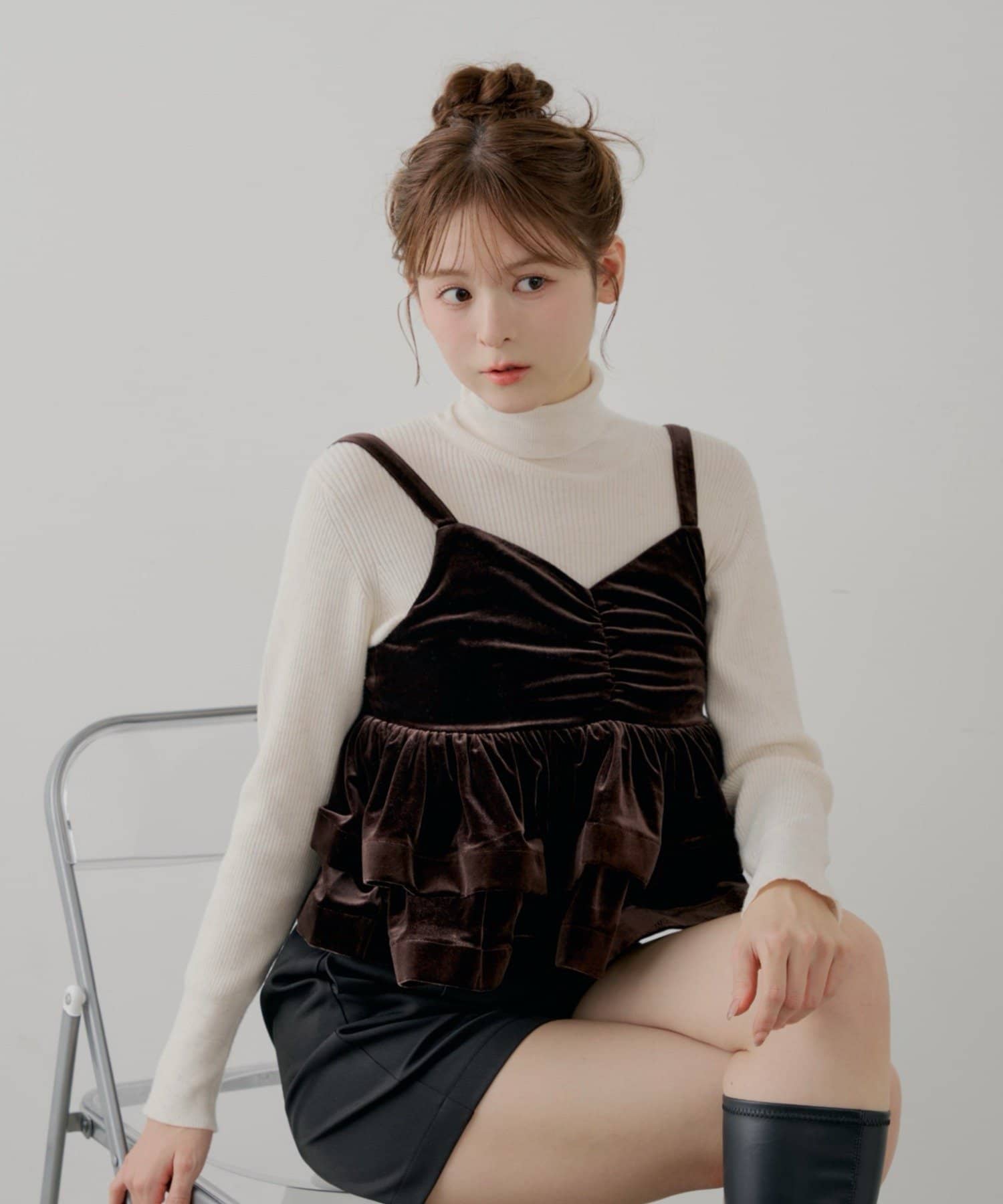 ・上品な光沢と滑らかな肌触りが魅力のベロアラッフルビスチェ。