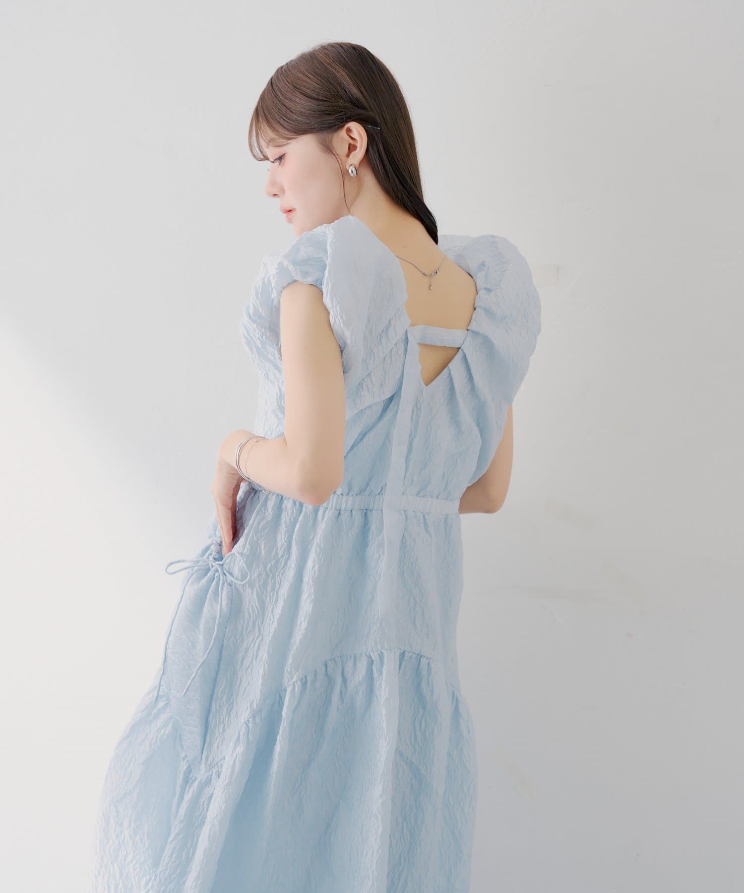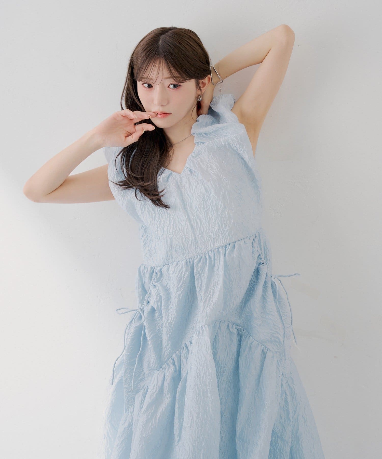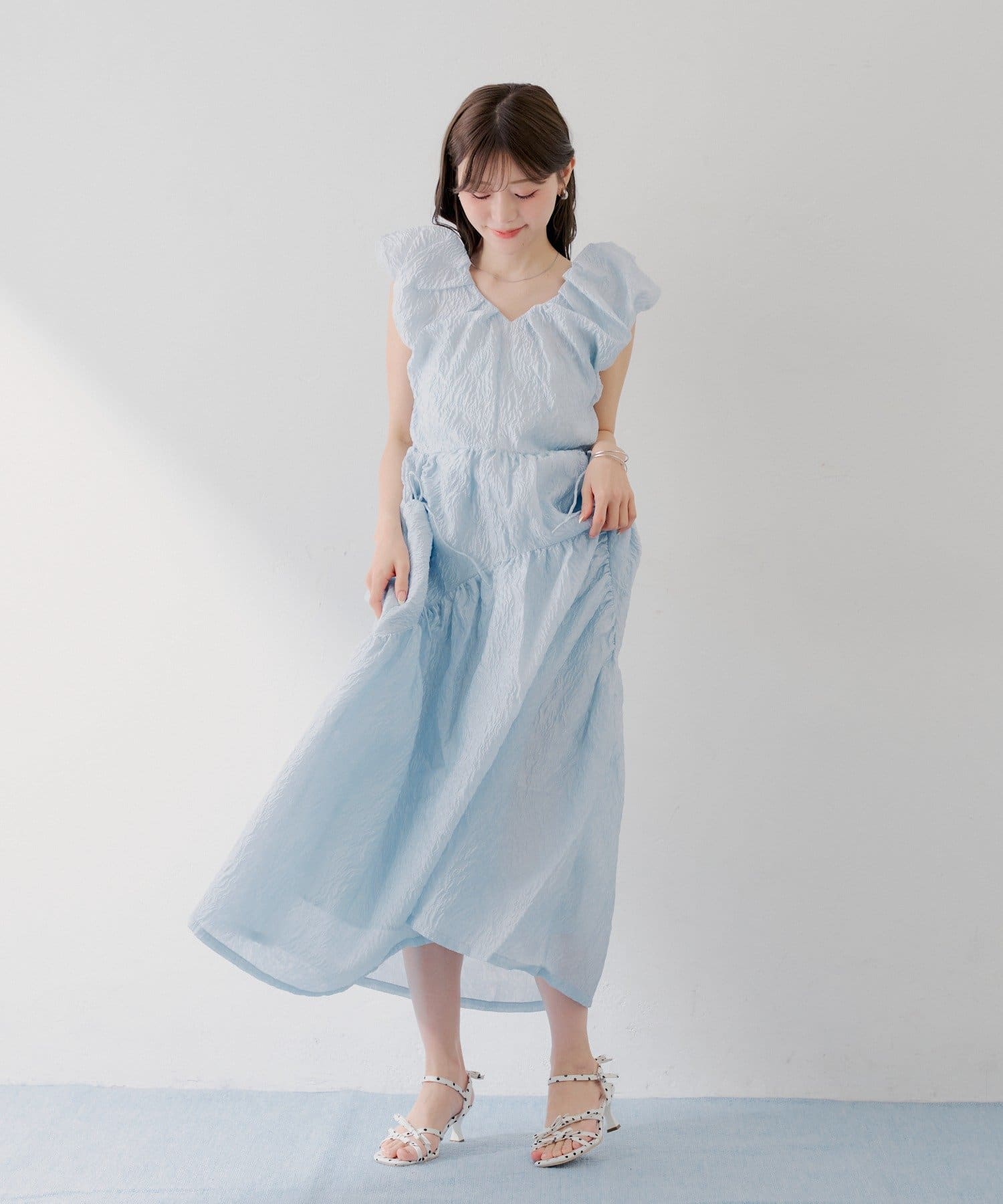 ・軽やかな素材感と程よいボリュームシルエットで、動くたびに女性らしい印象に。ギャザーの切り替えが軽やかなウェーブを描き、カジュアルにも振りやすいワンピースです。