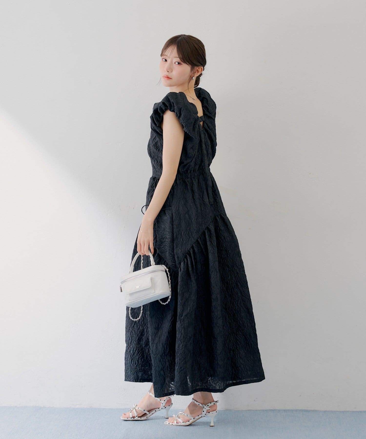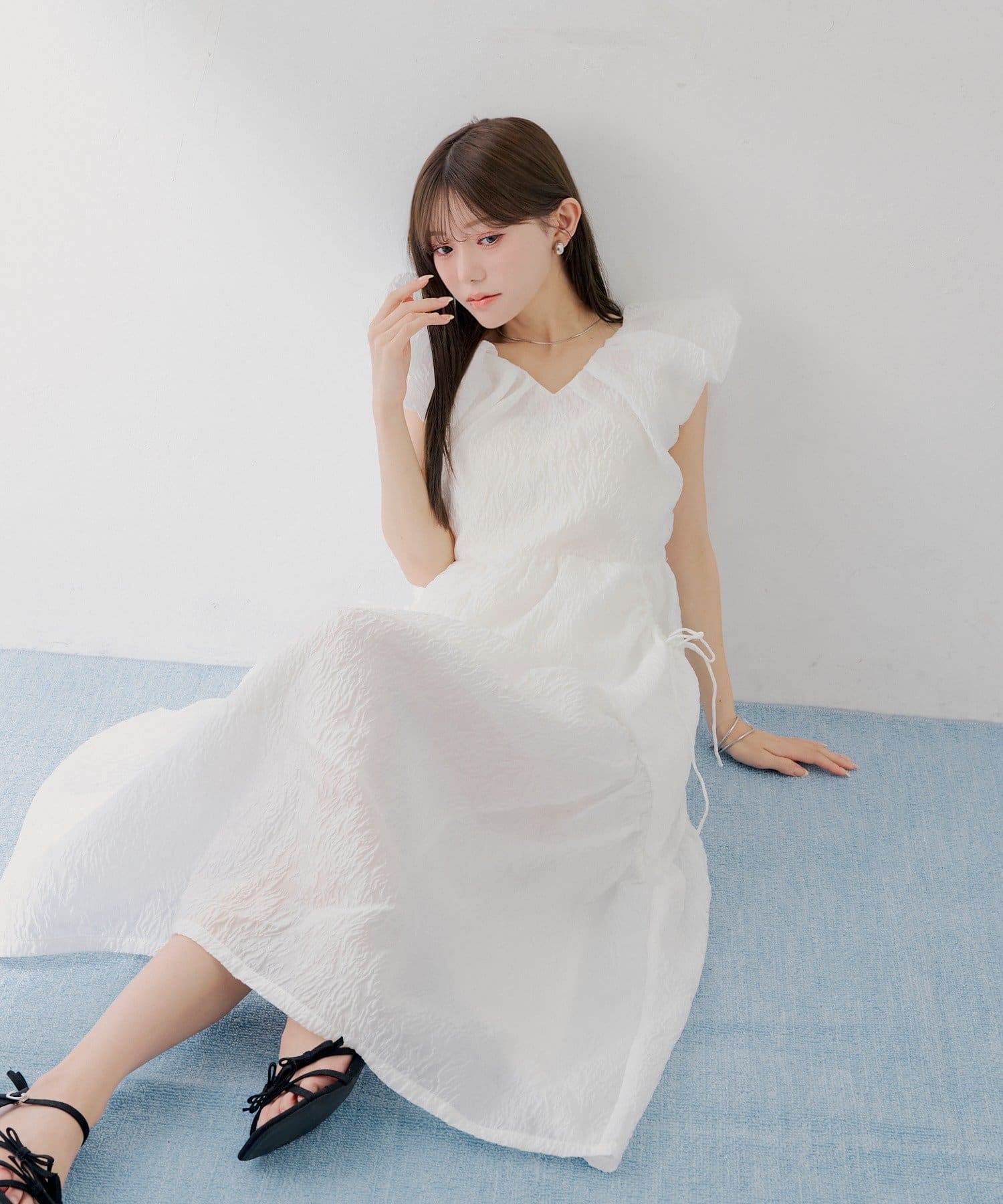 ・ヘアはすっきりまとめて、フリルのデザインを引き立てるのがおすすめです。