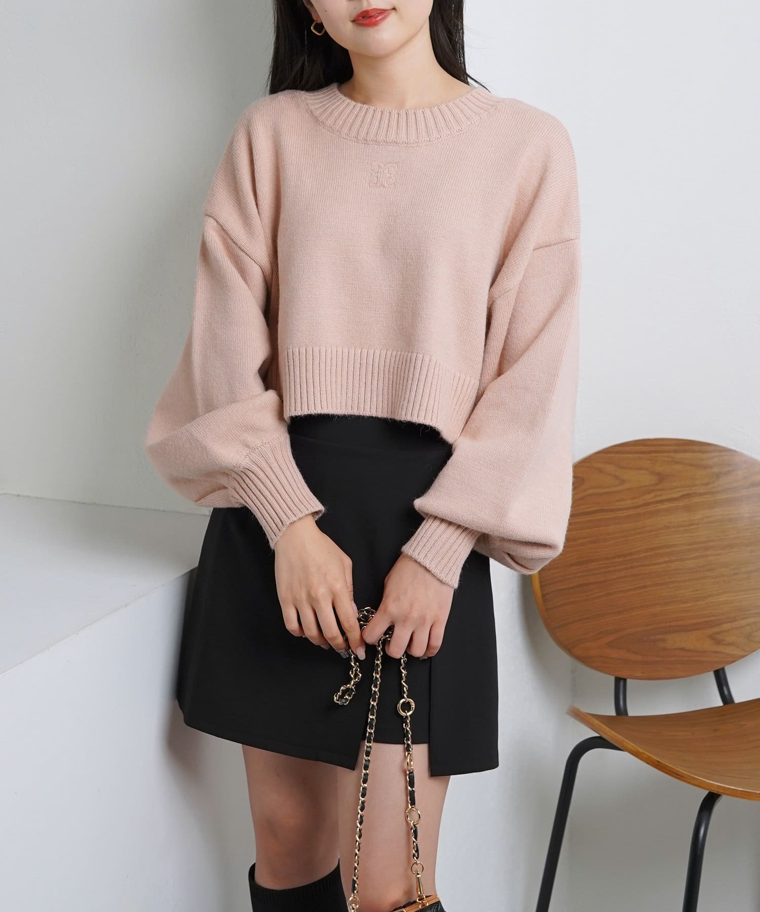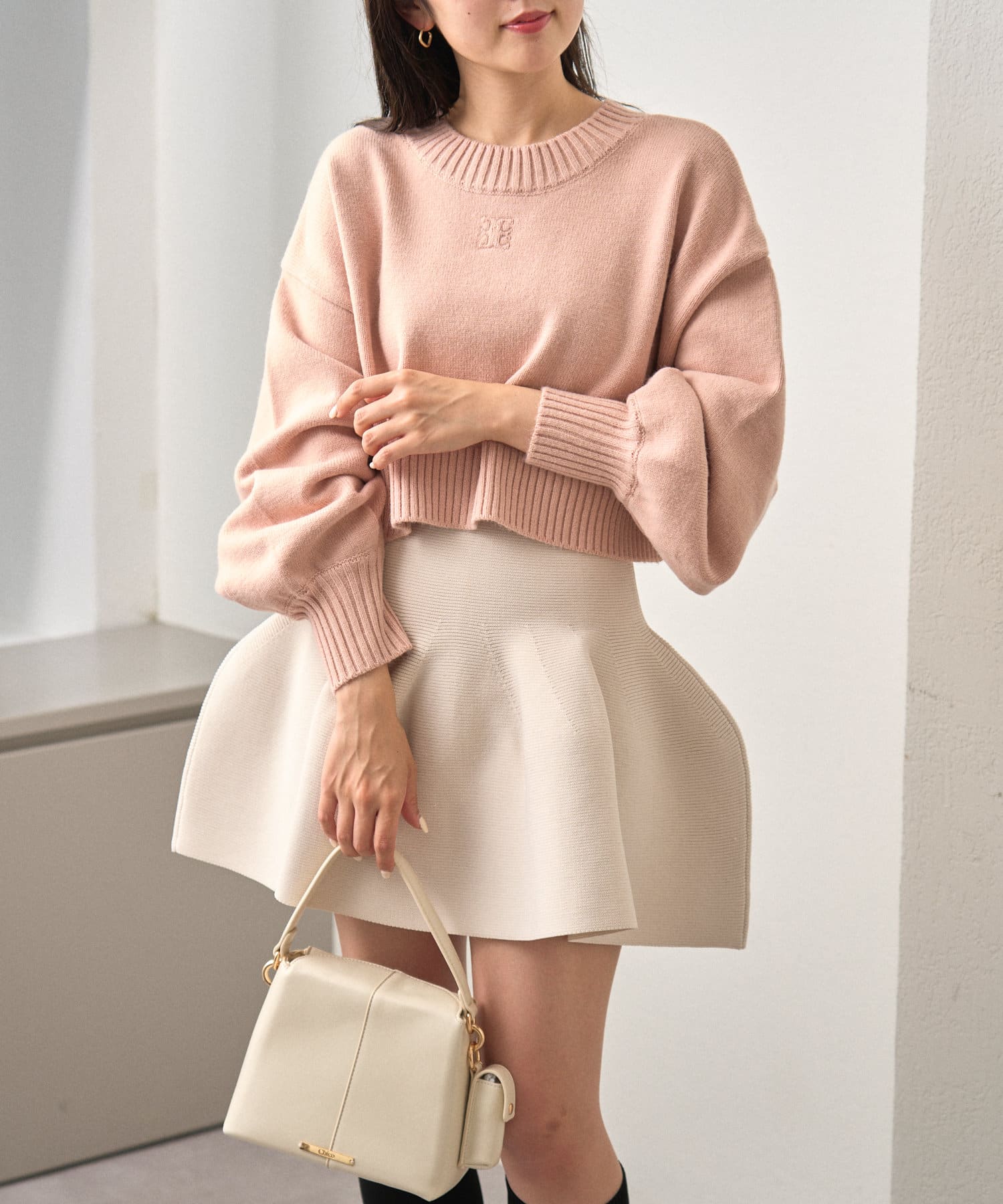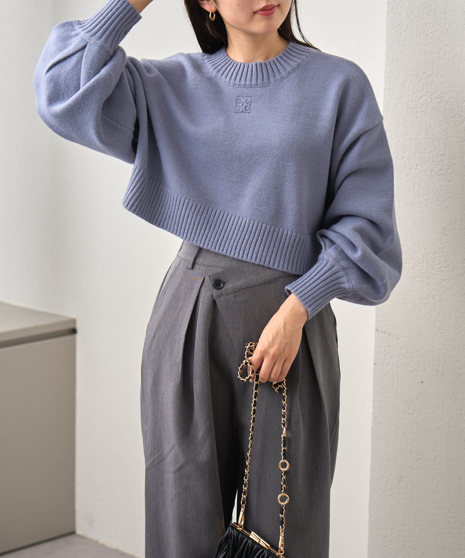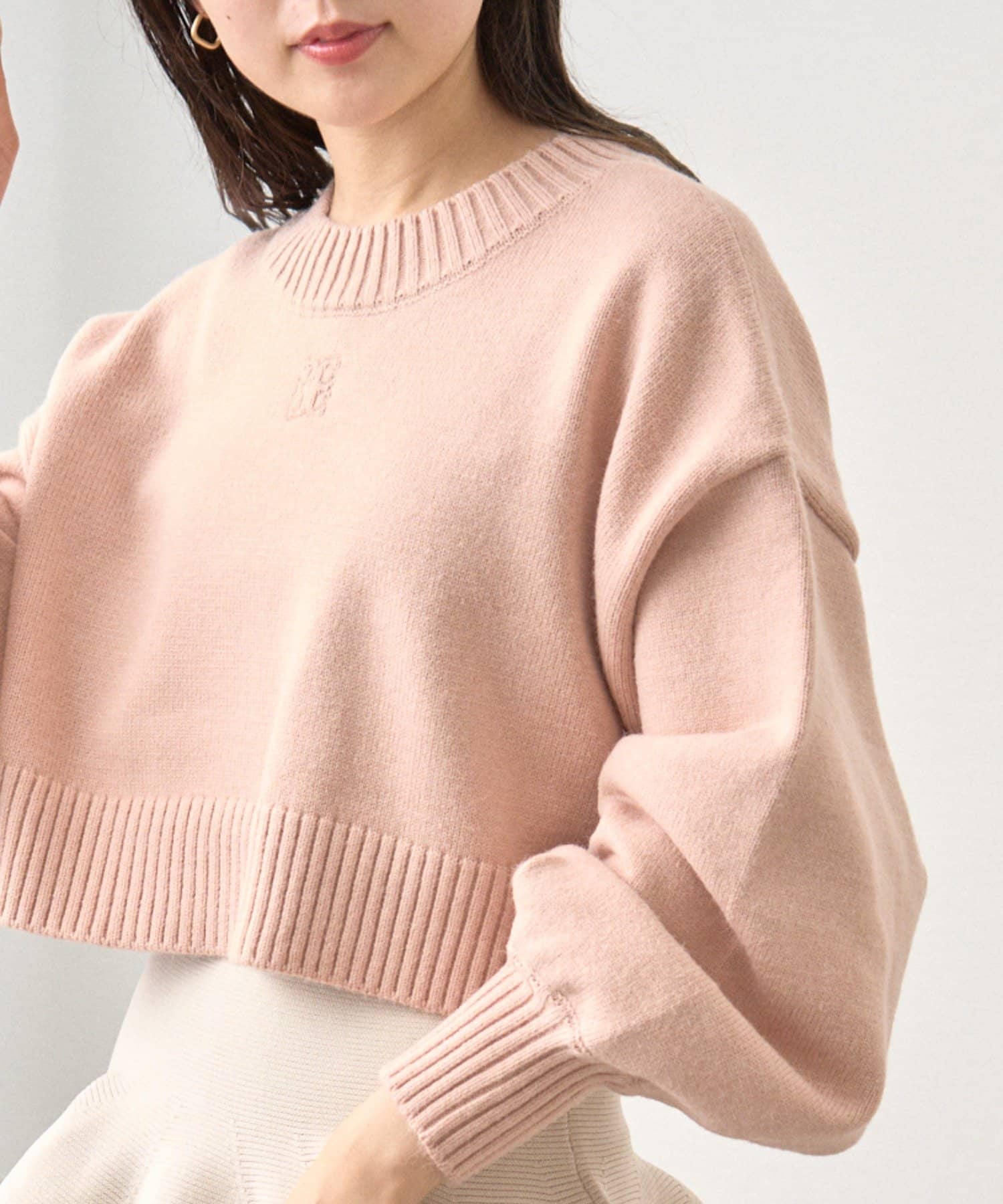 ・同系色のさりげないエンボスロゴが目を惹くニット