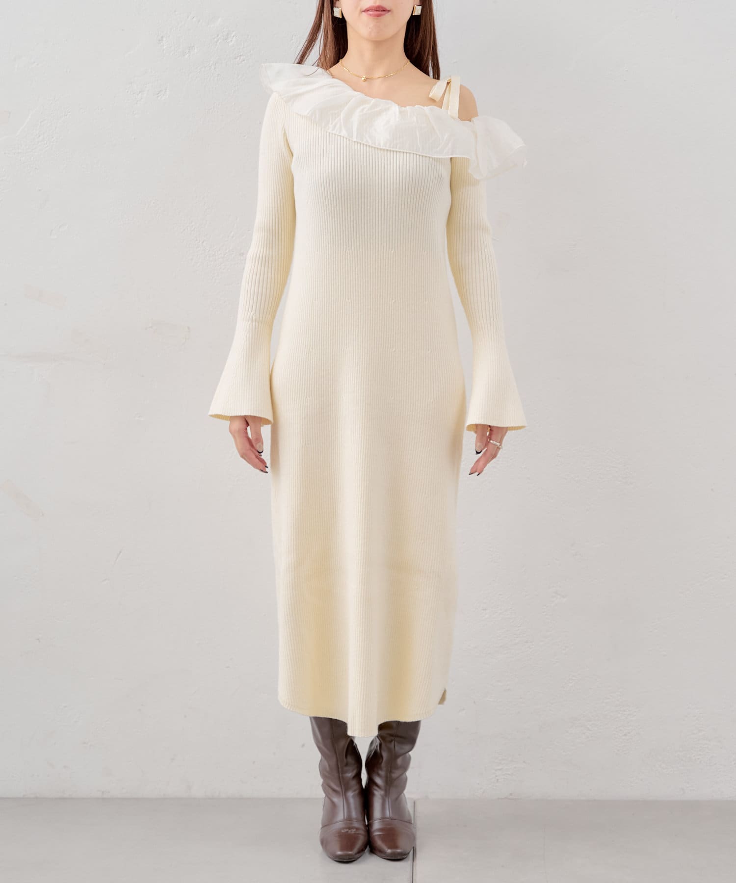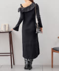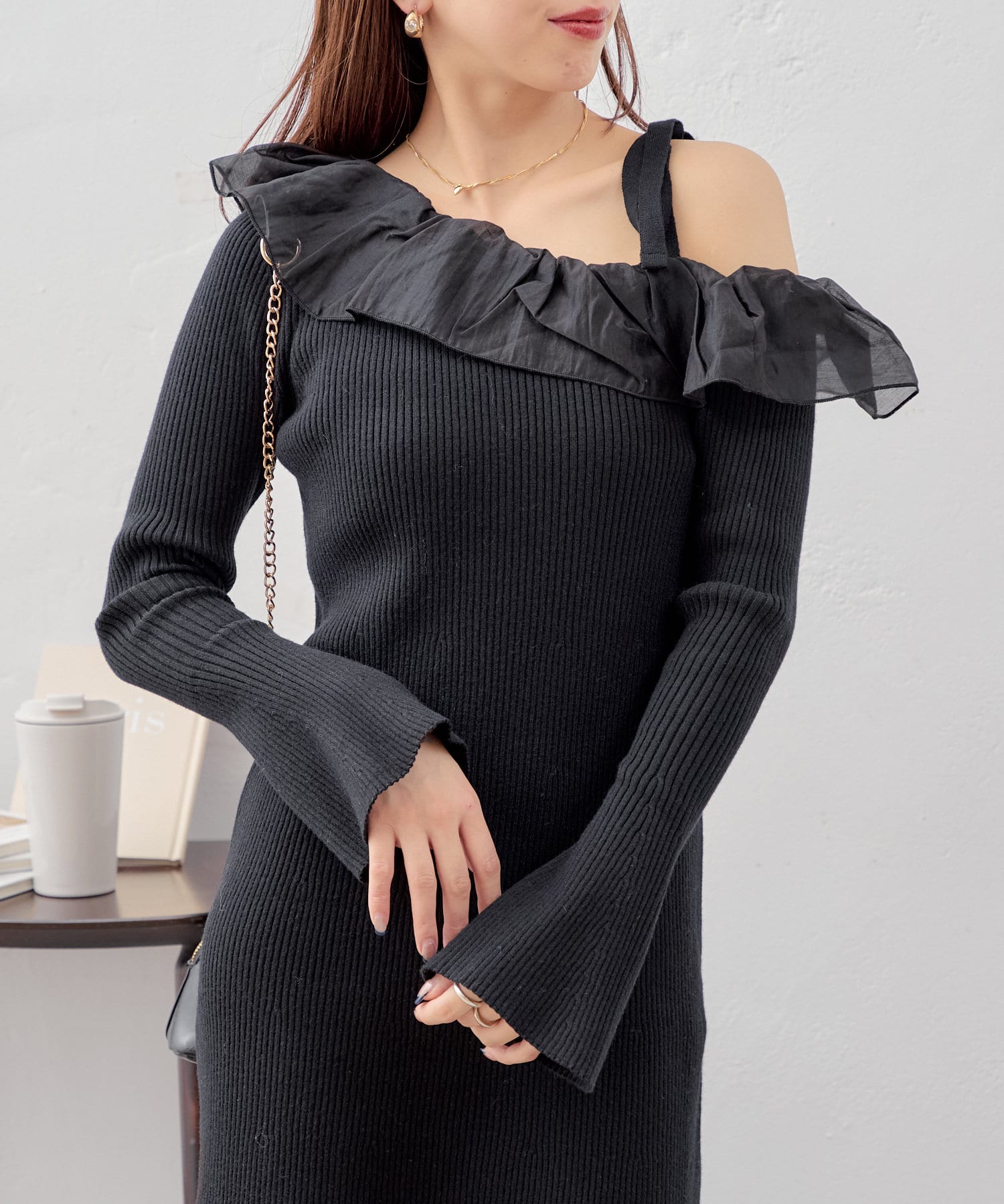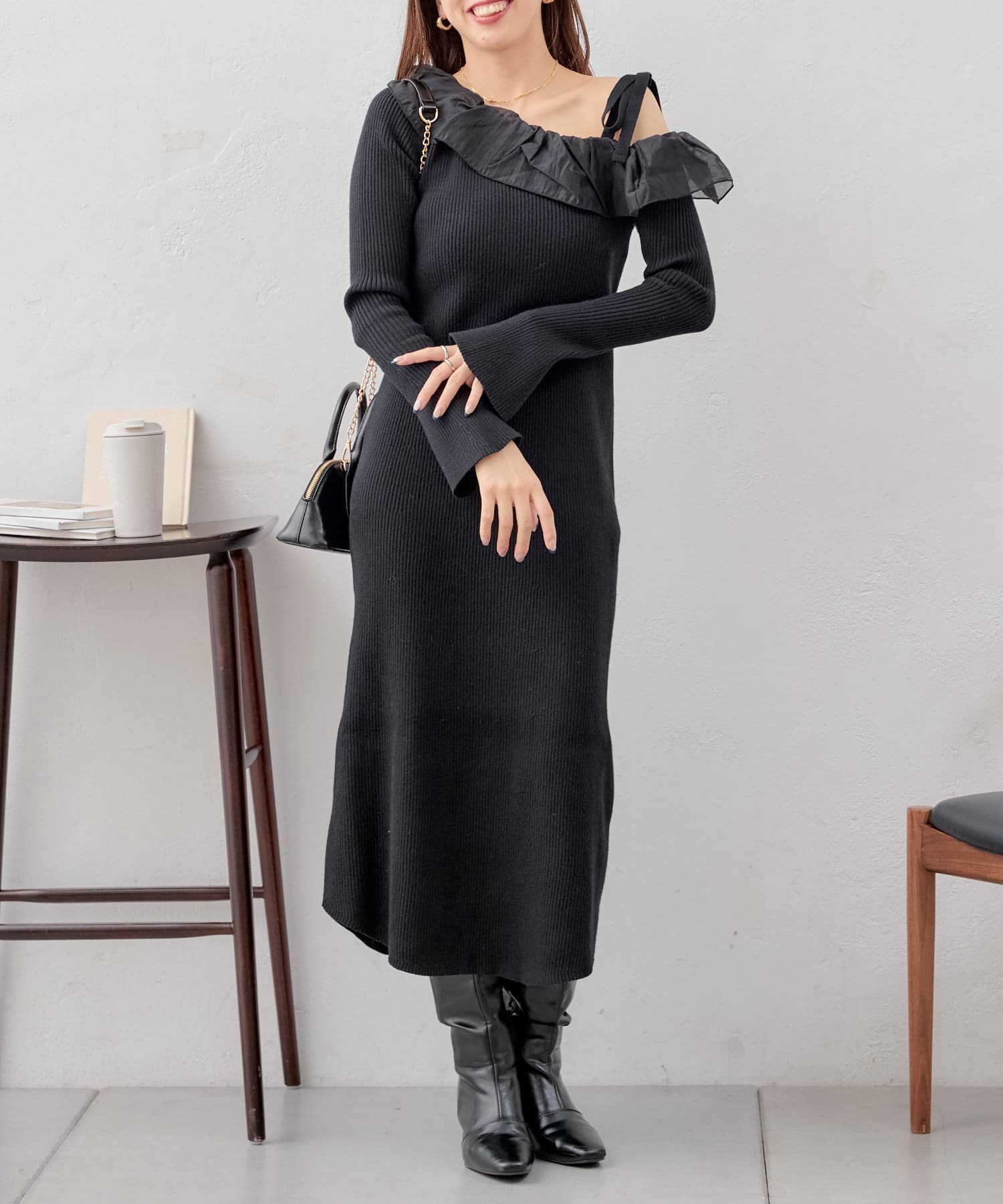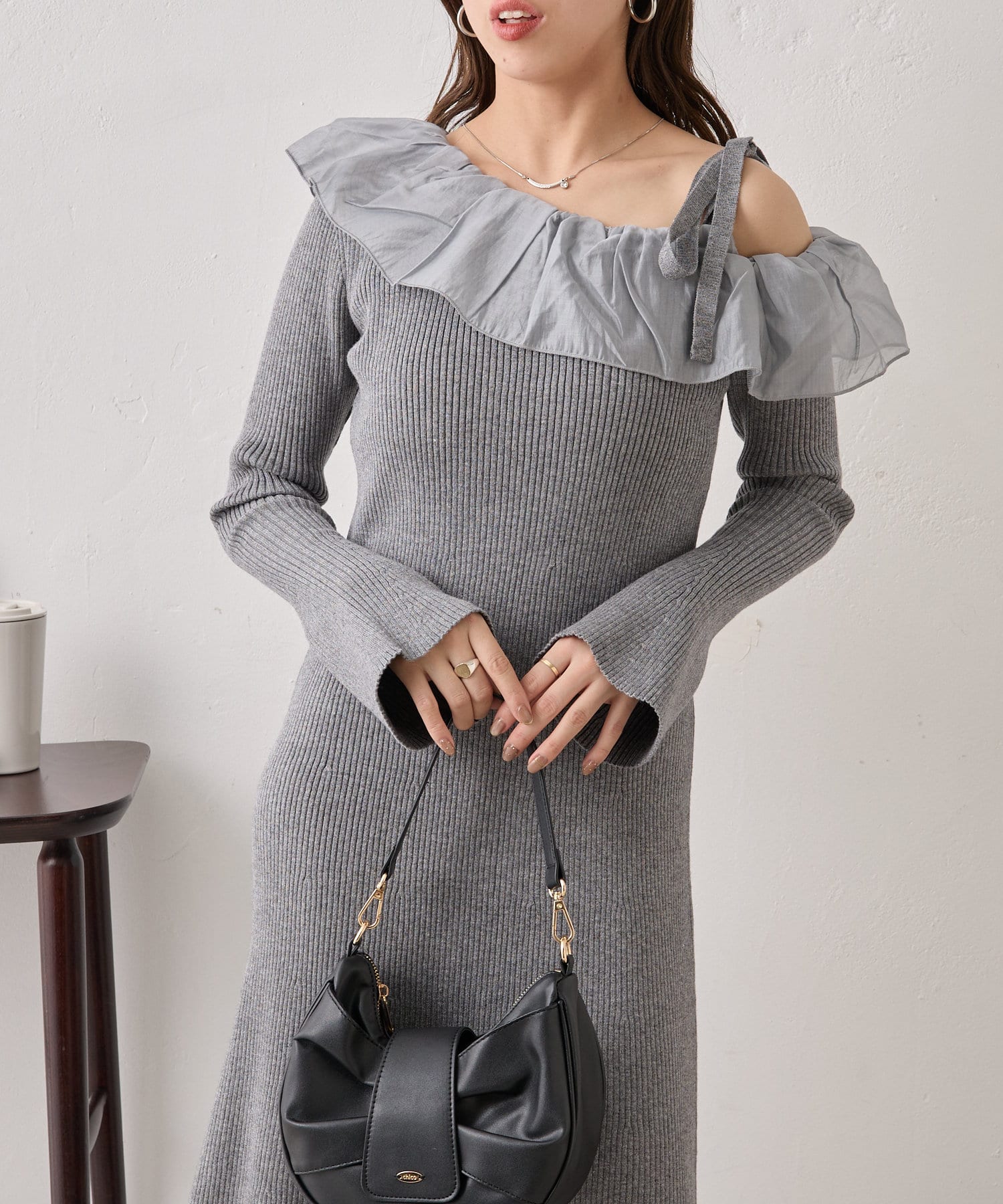 ワンショルのアシメデザインとフリルがエレガントなリブワンピース