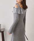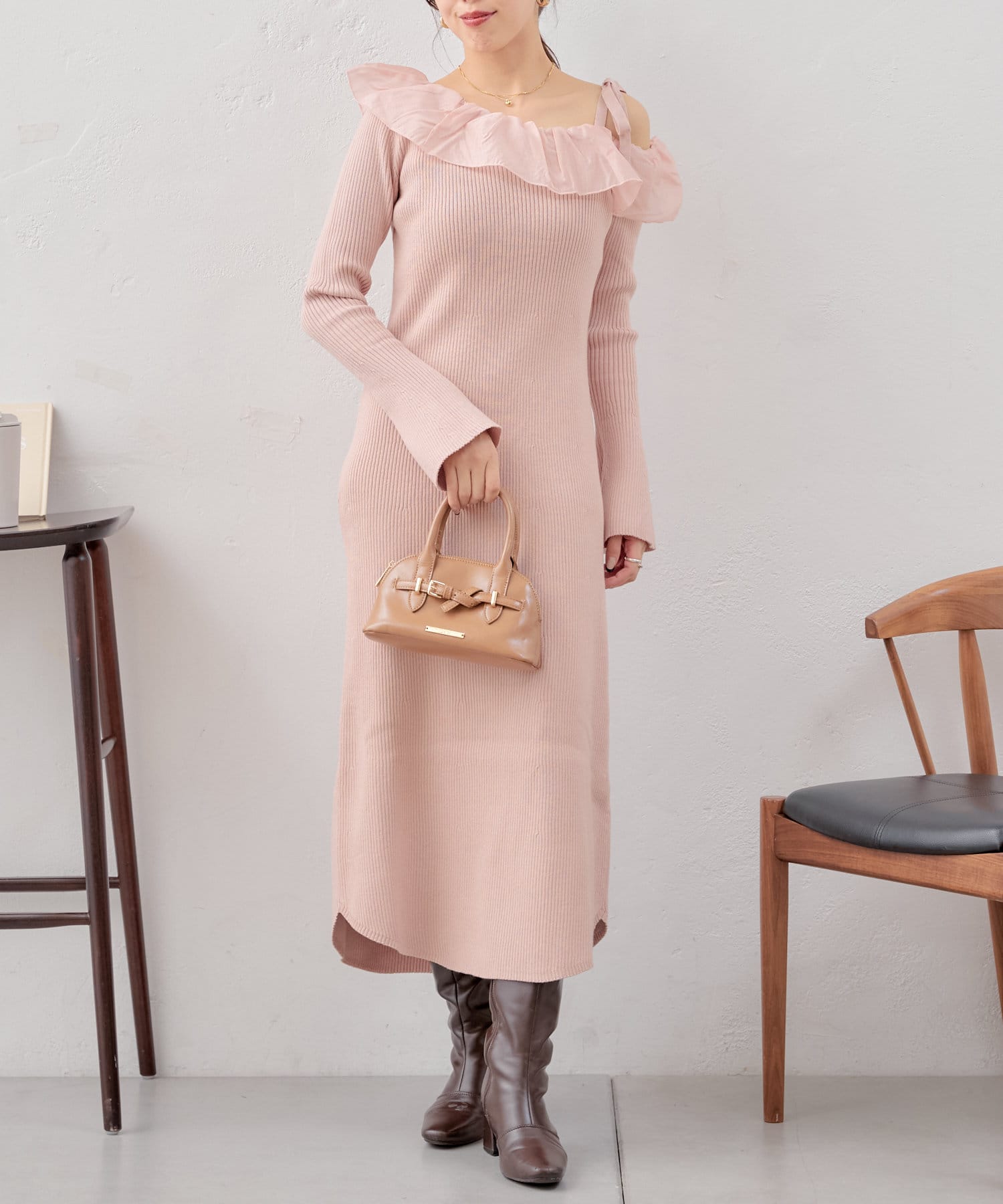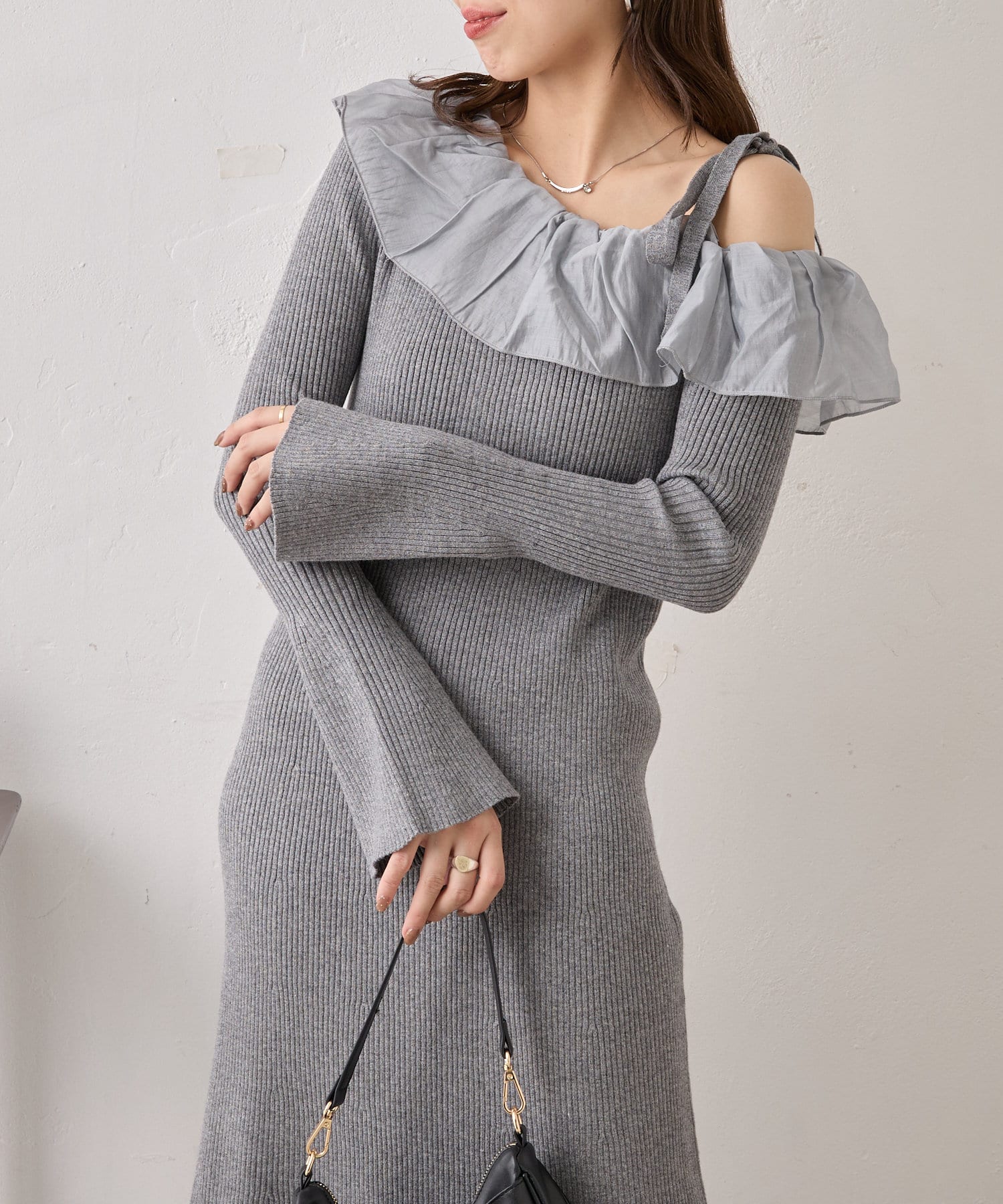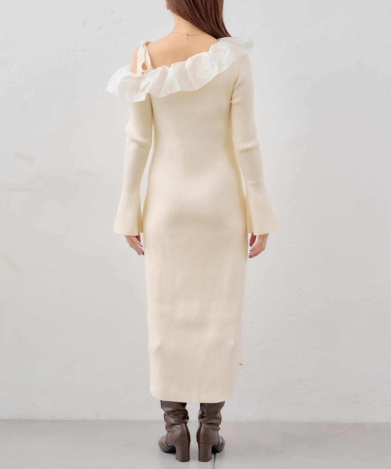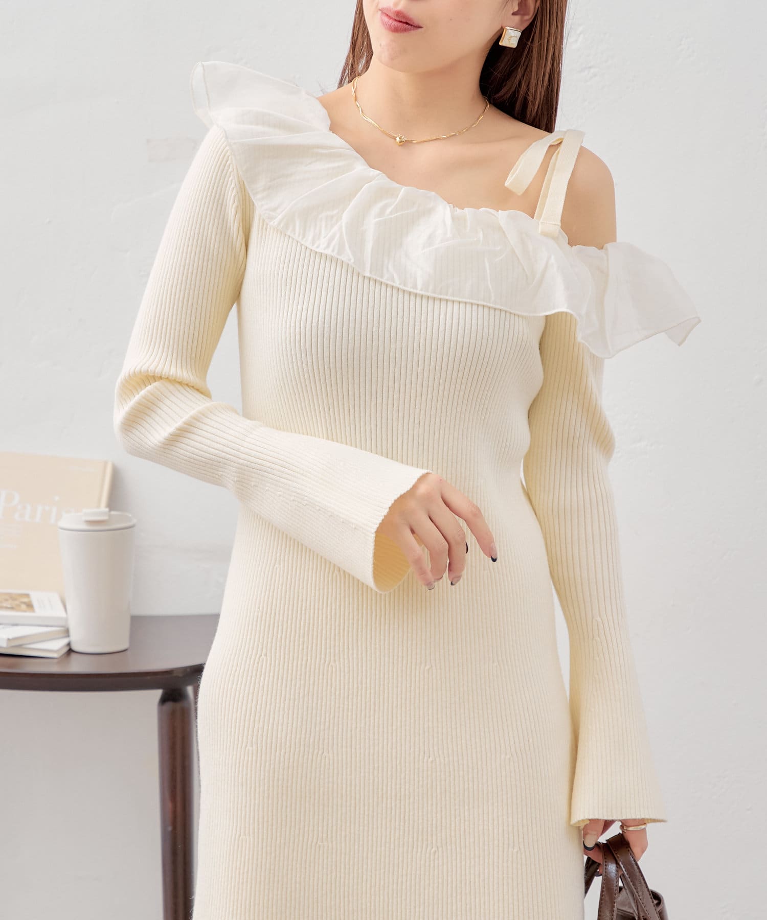 ワンショルのアシメデザインとフリルがエレガントなリブワンピース