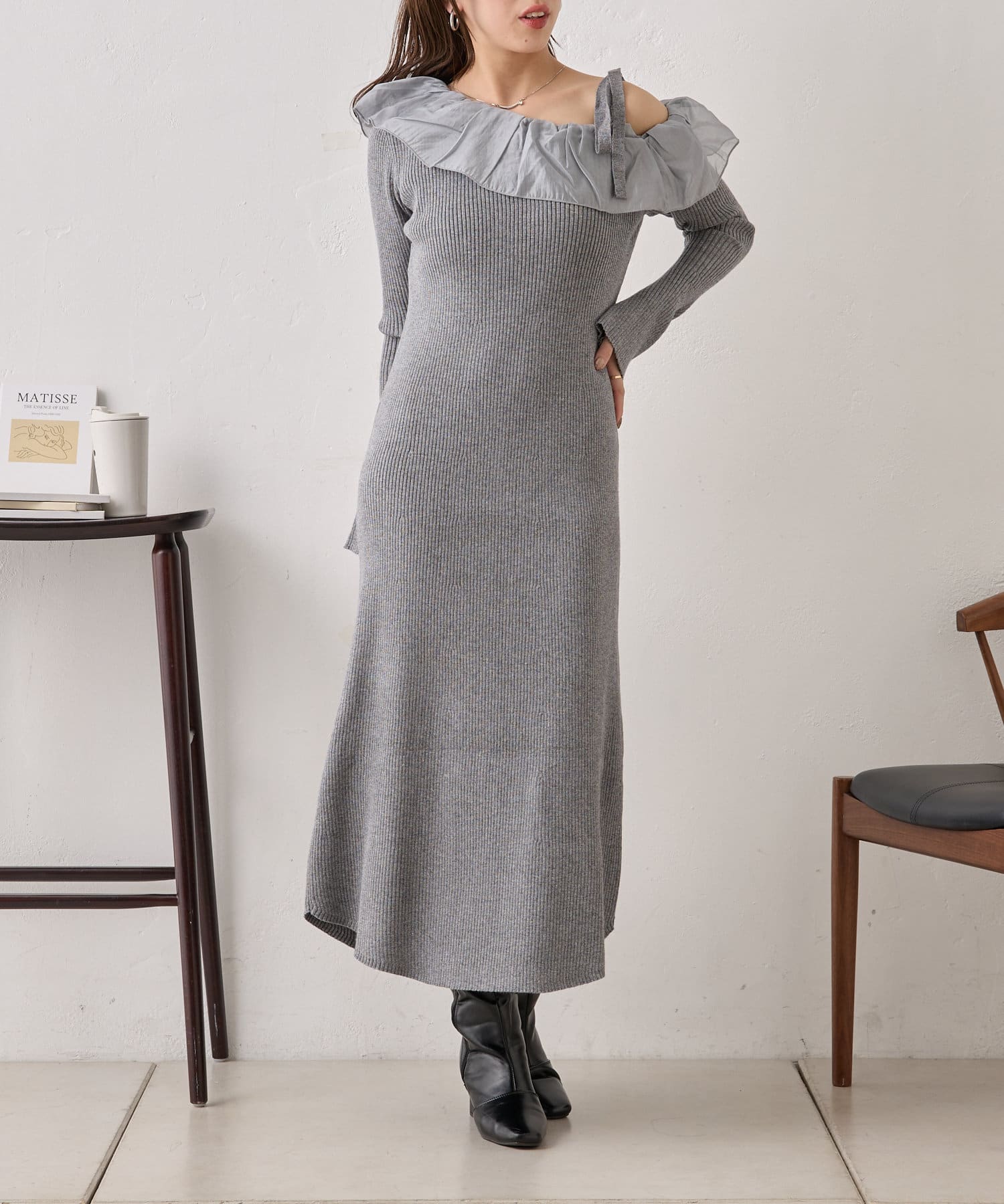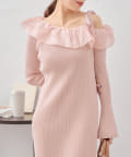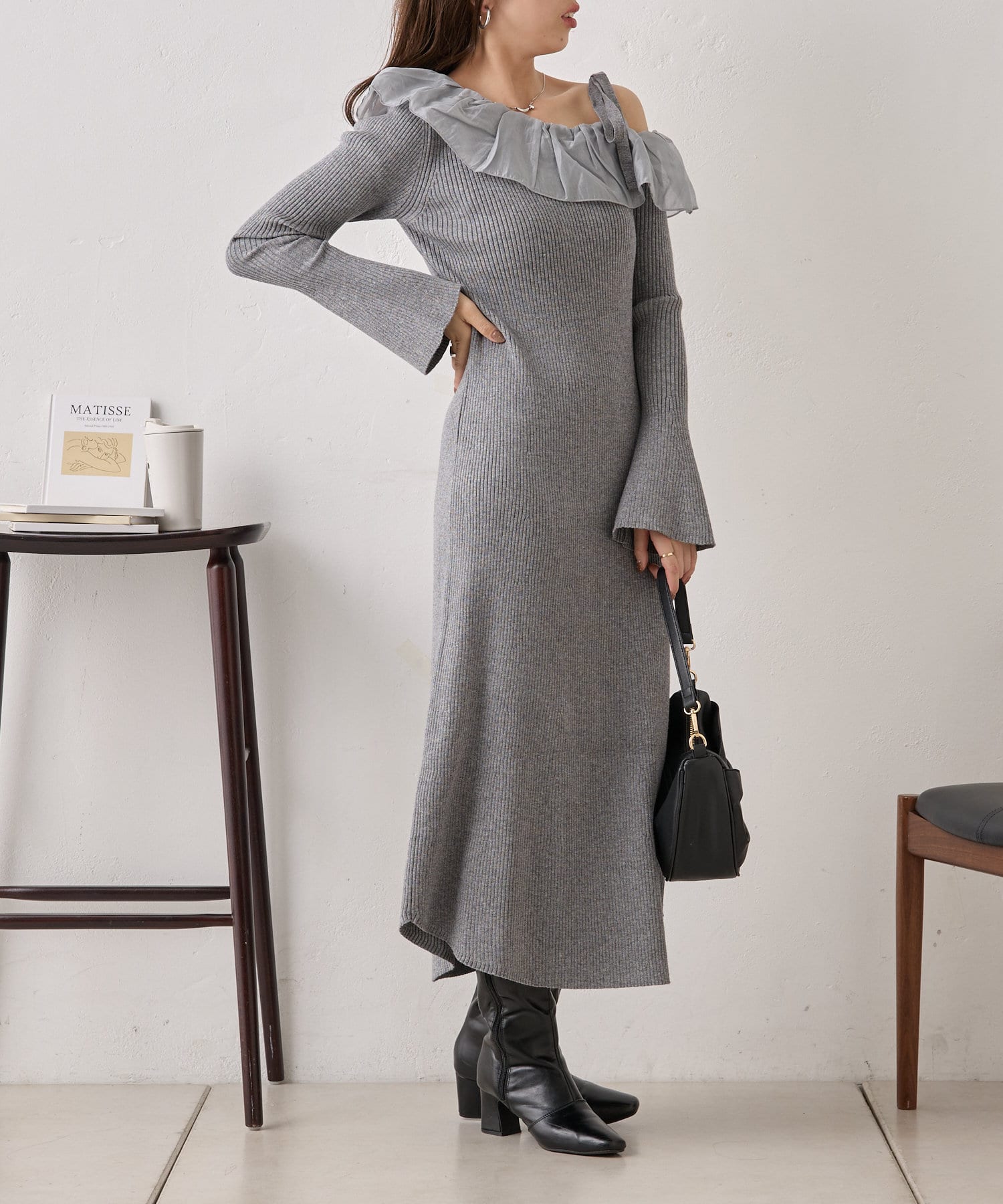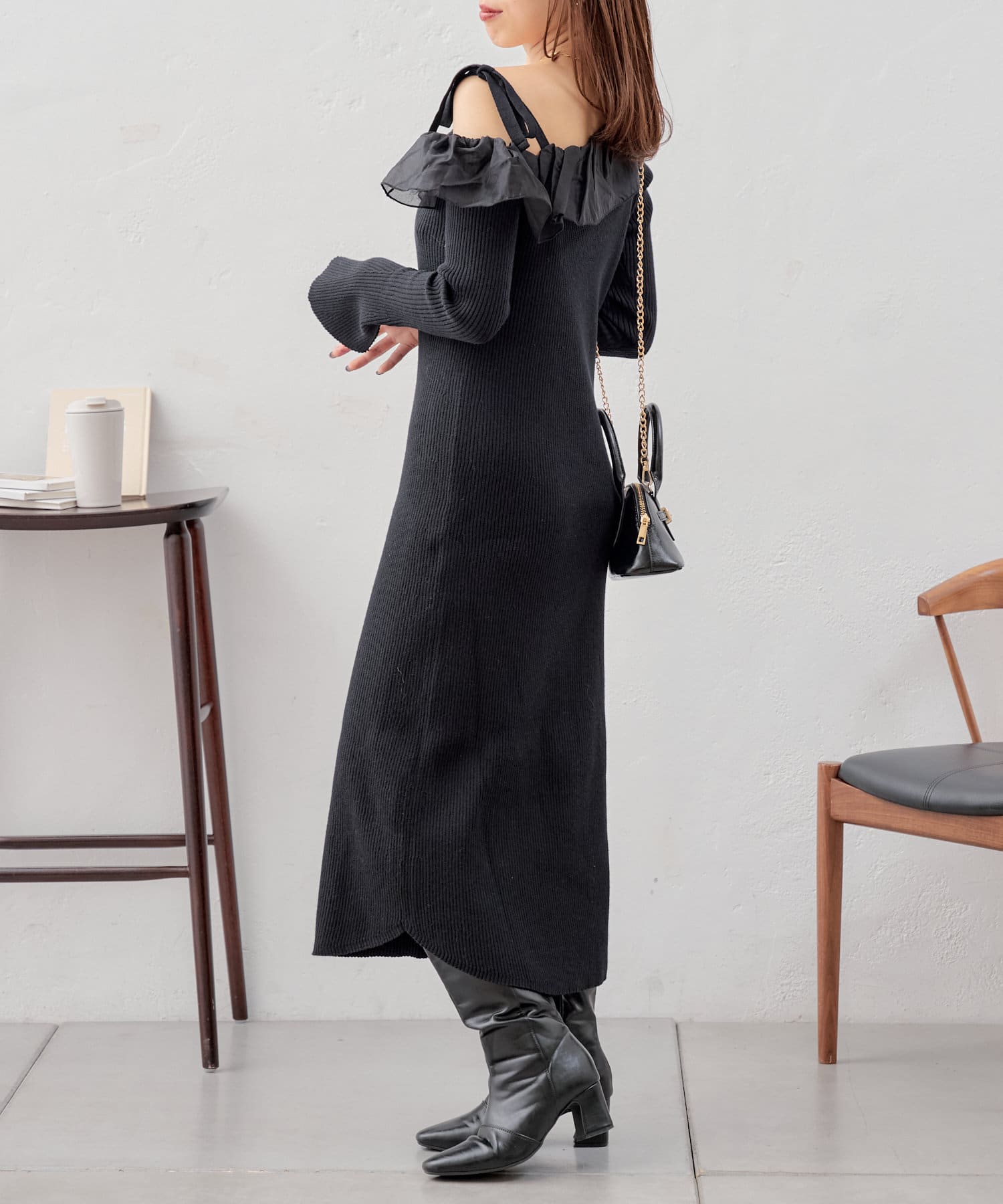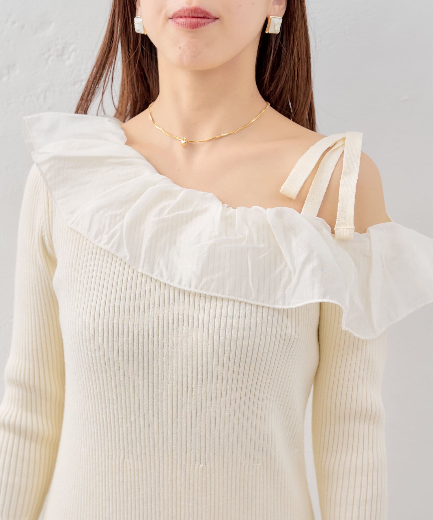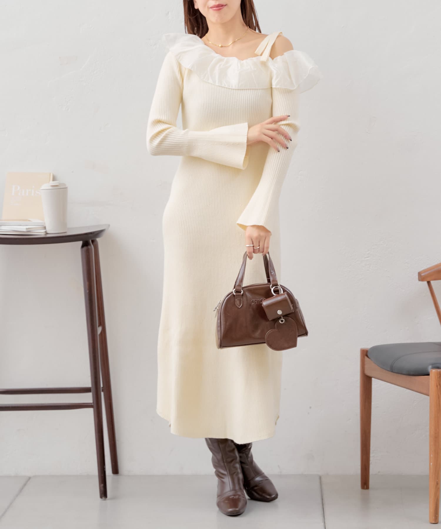 ワンショルのアシメデザインとフリルがエレガントなリブワンピース