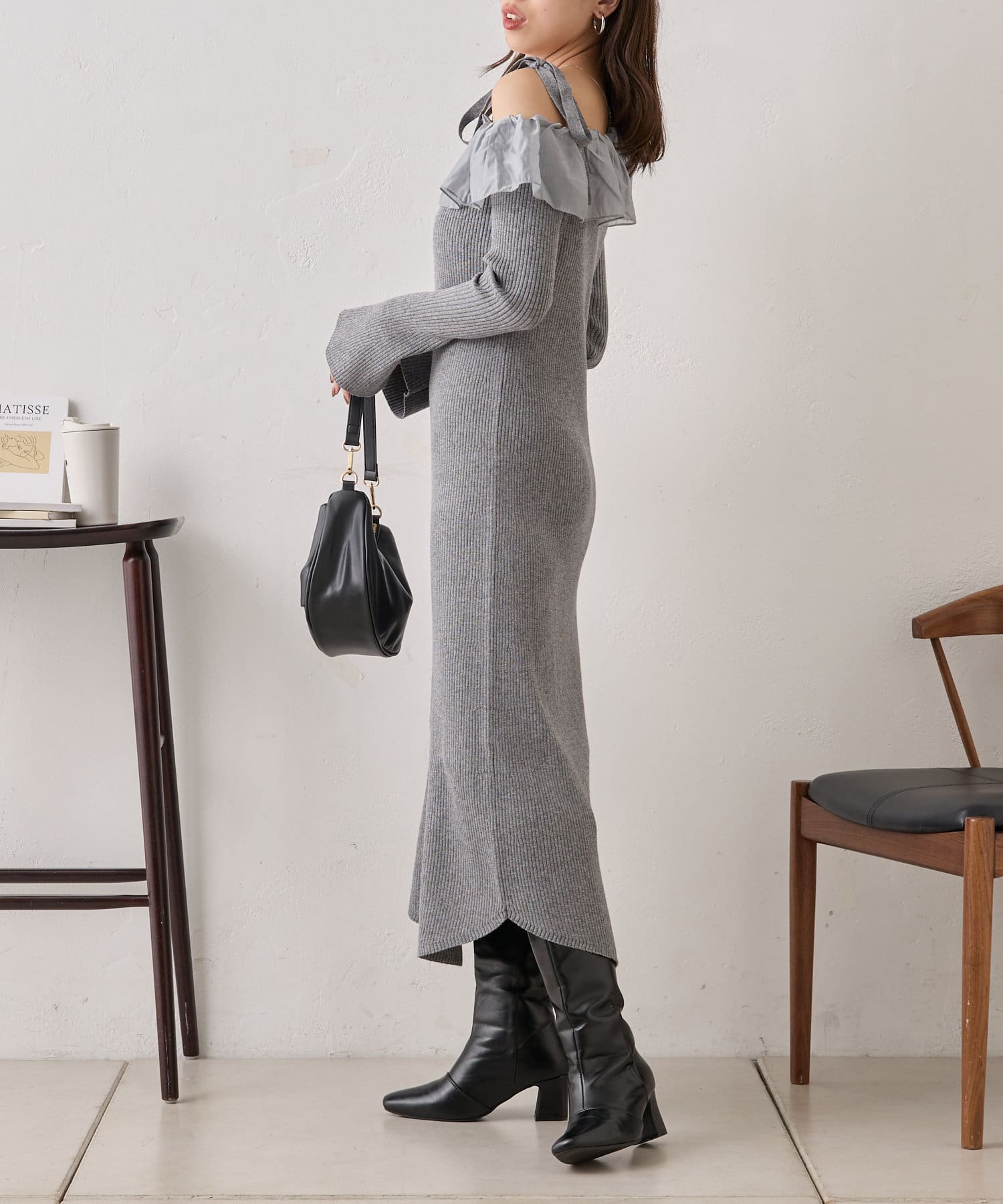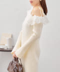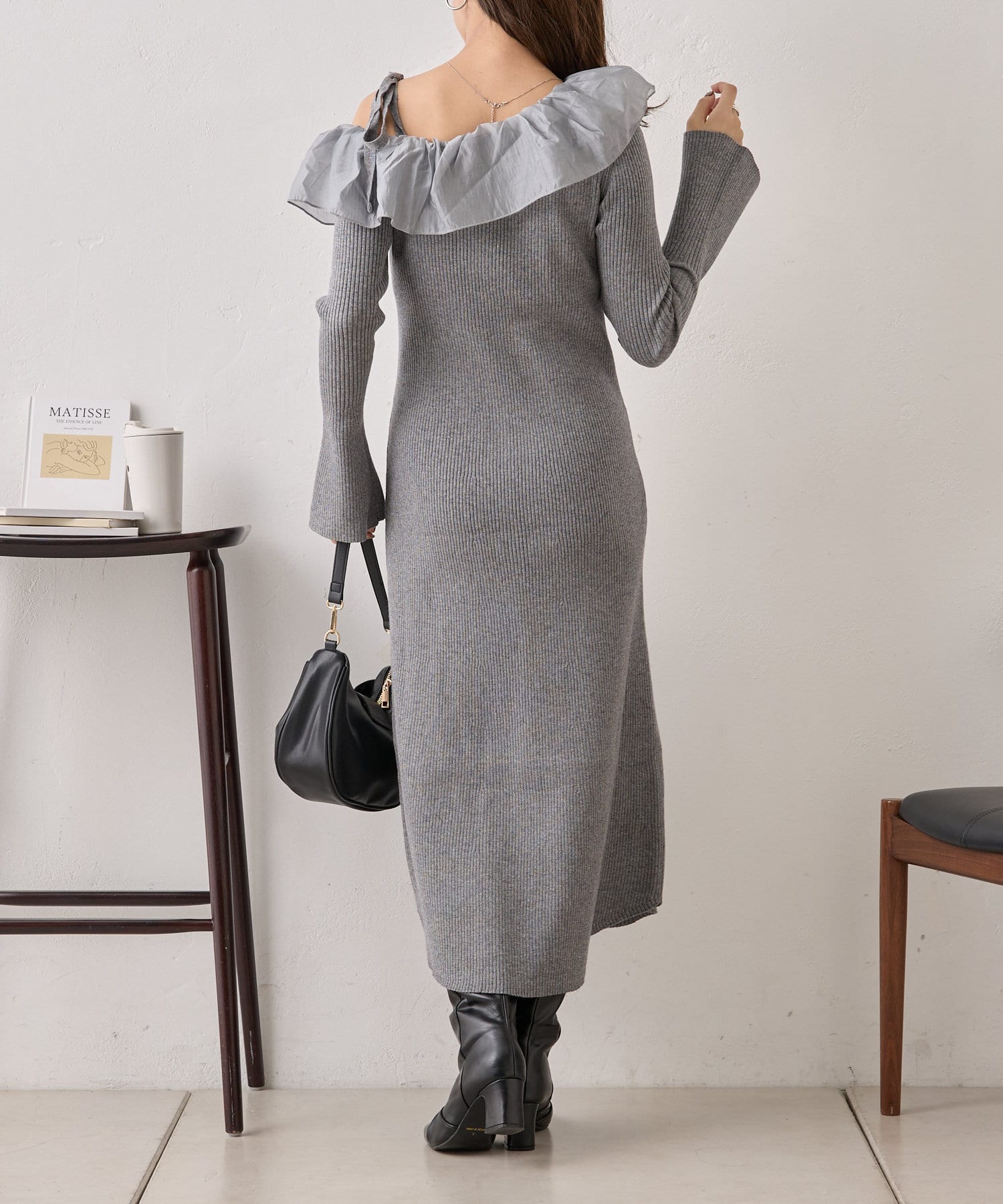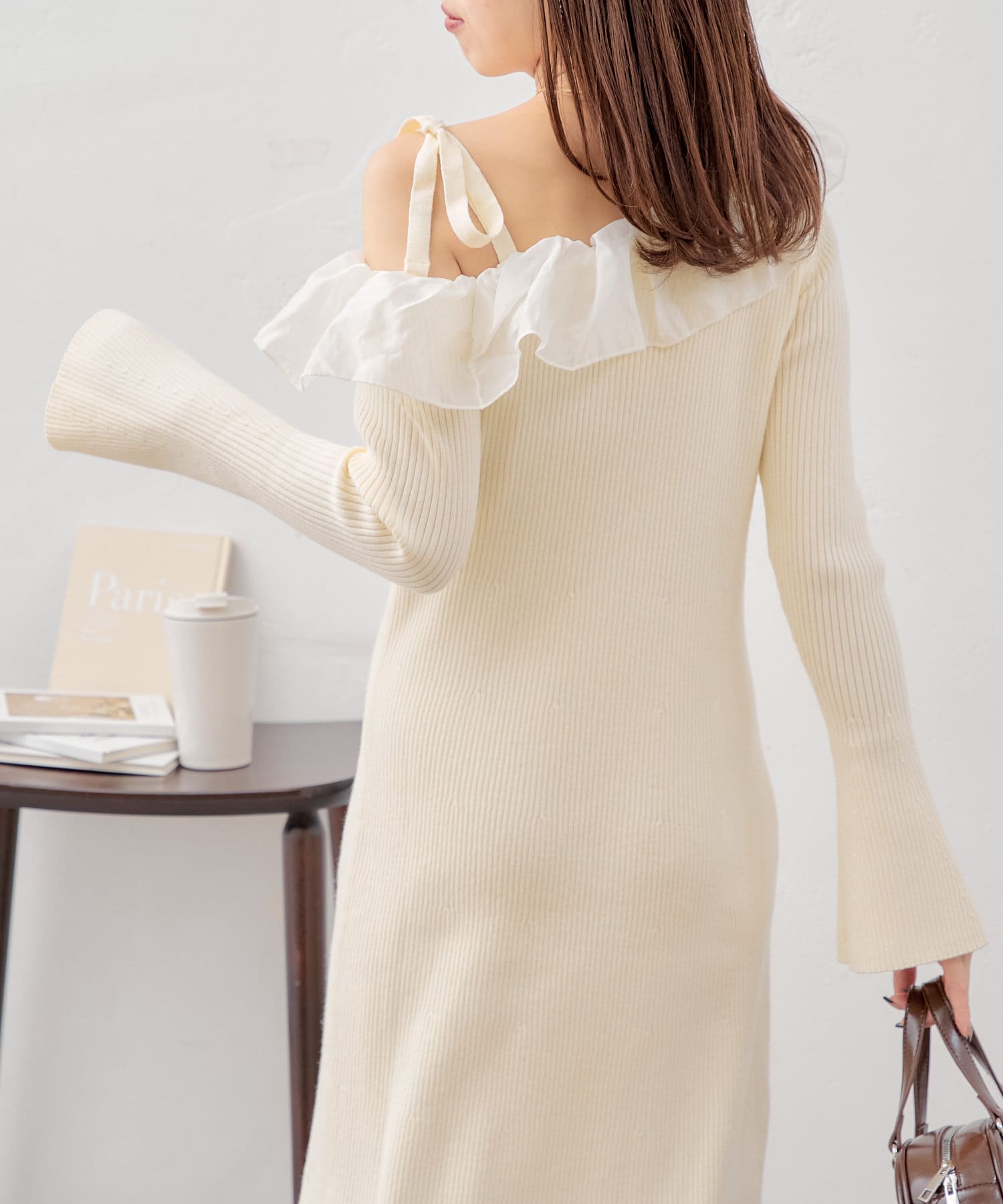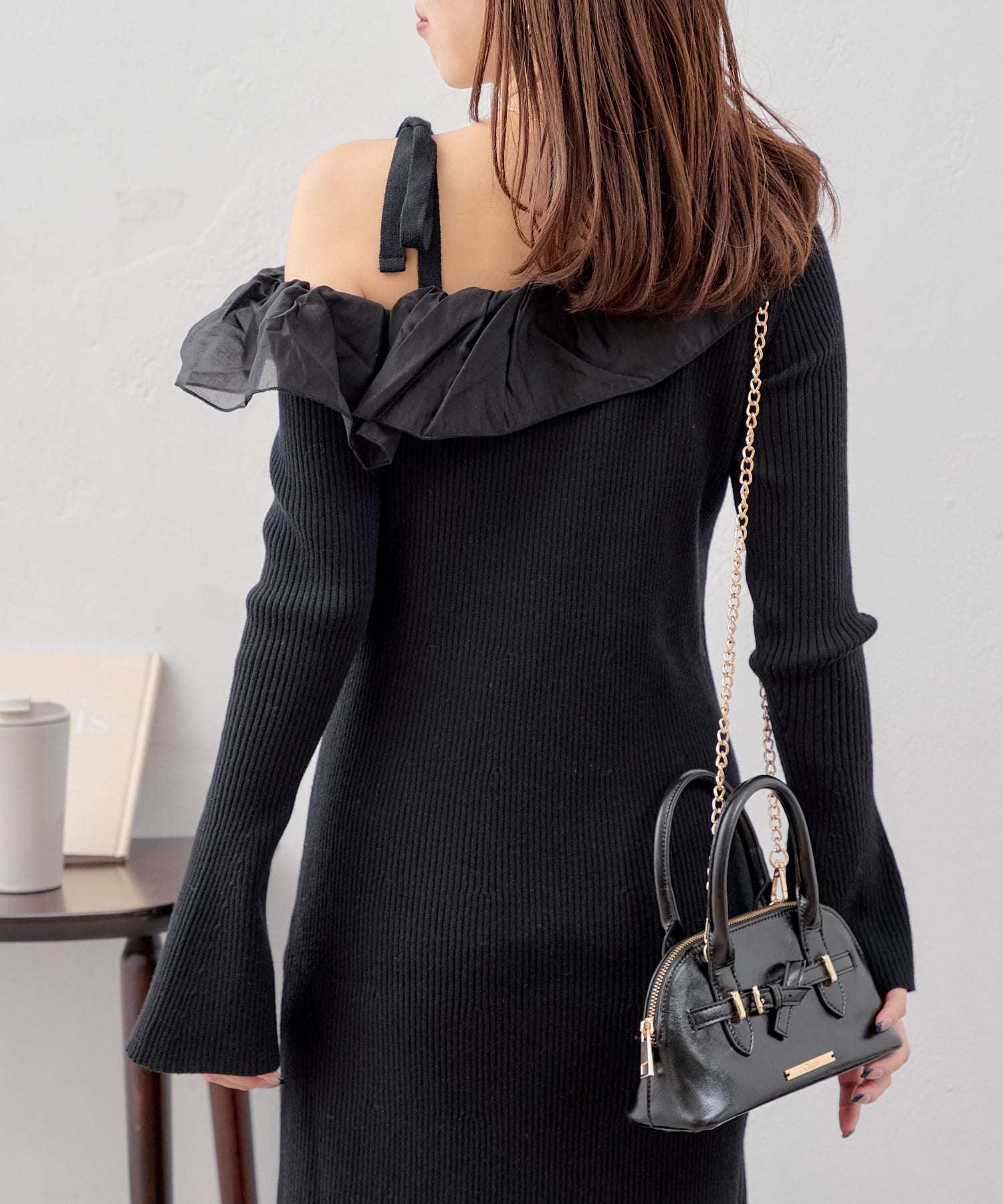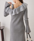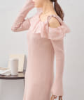 ワンショルのアシメデザインとフリルがエレガントなリブワンピース