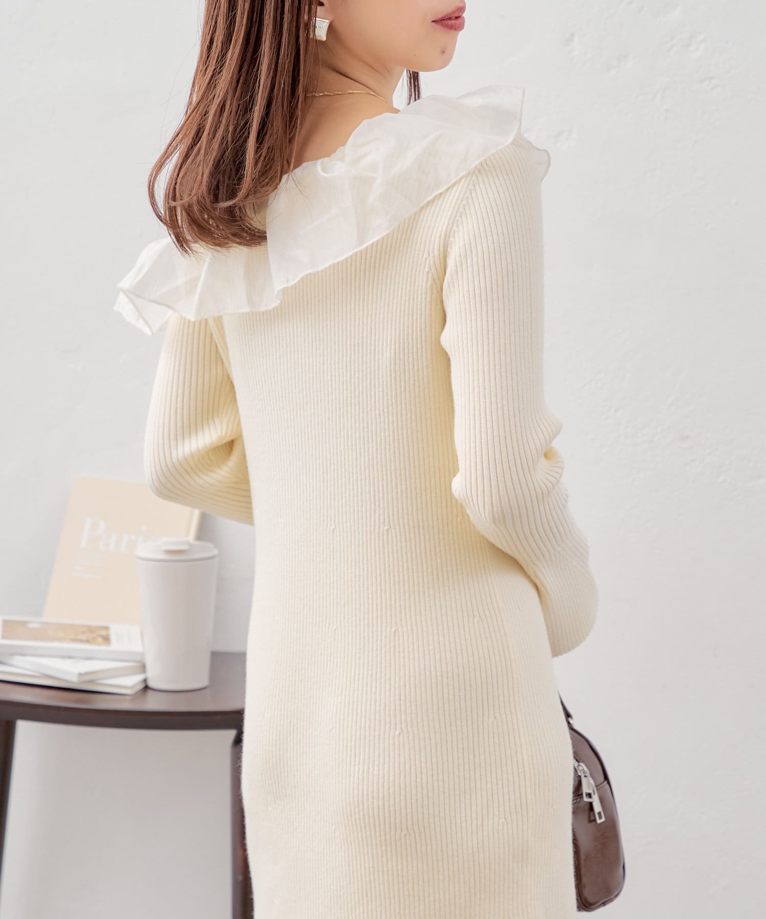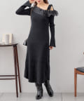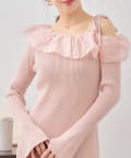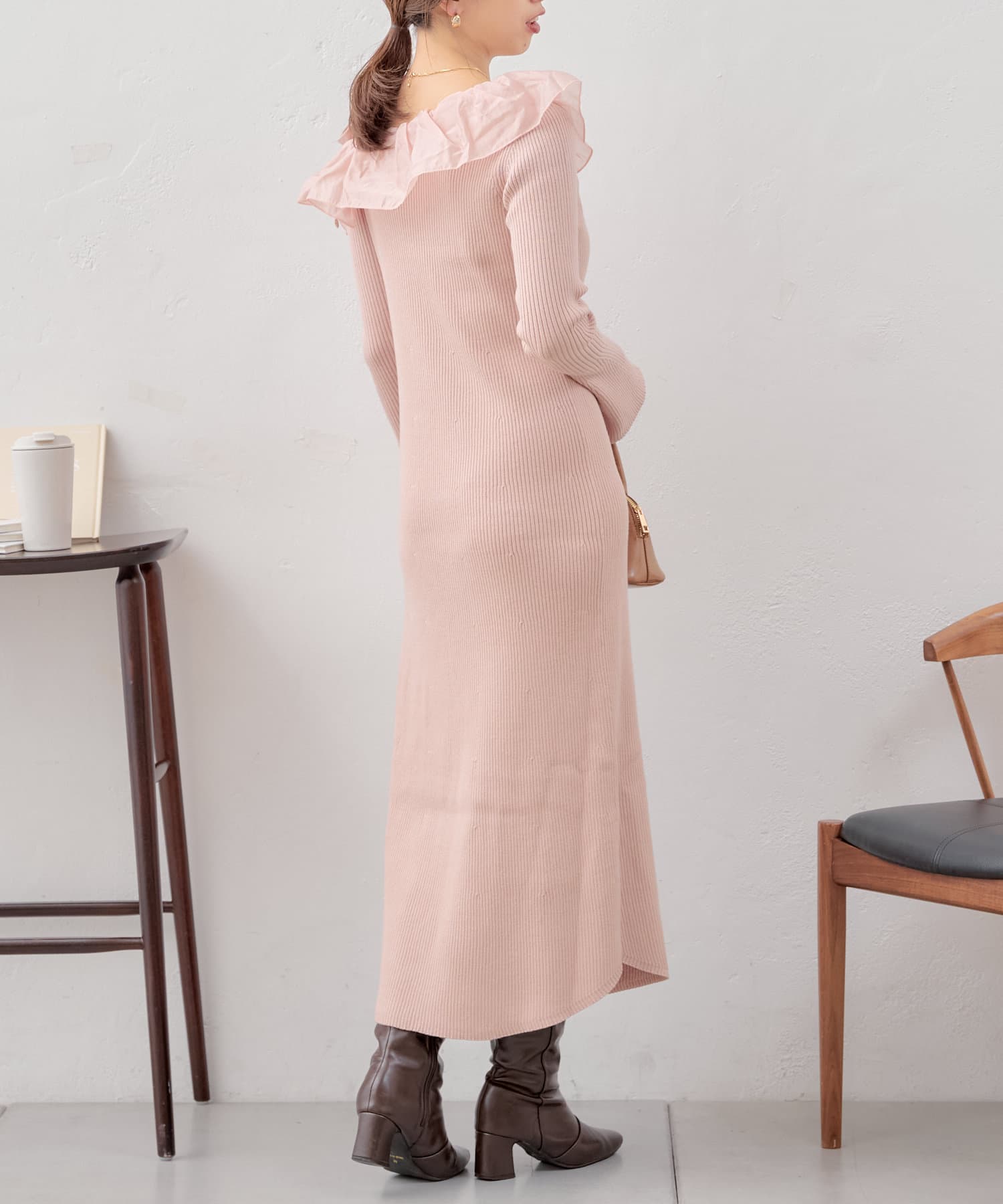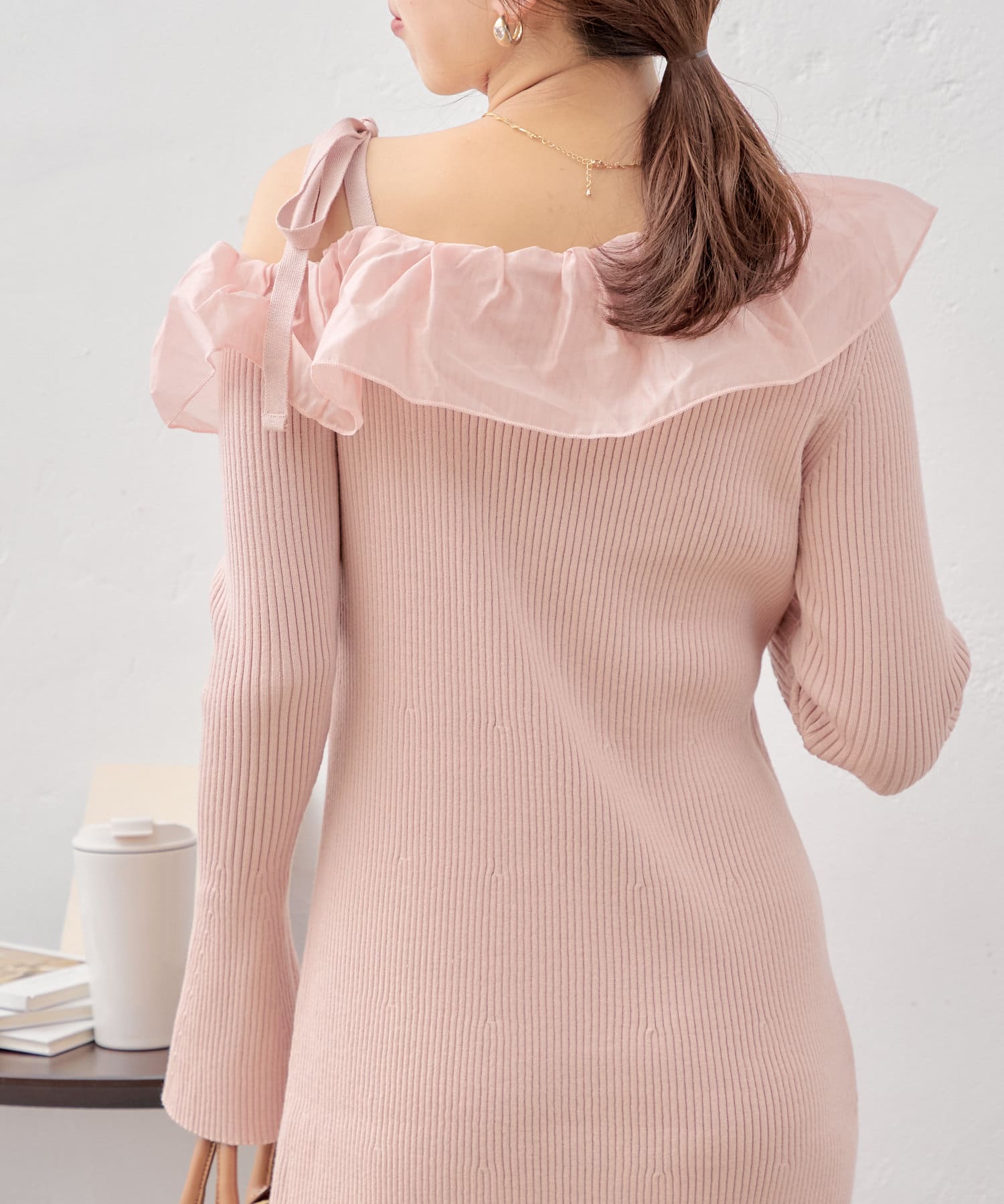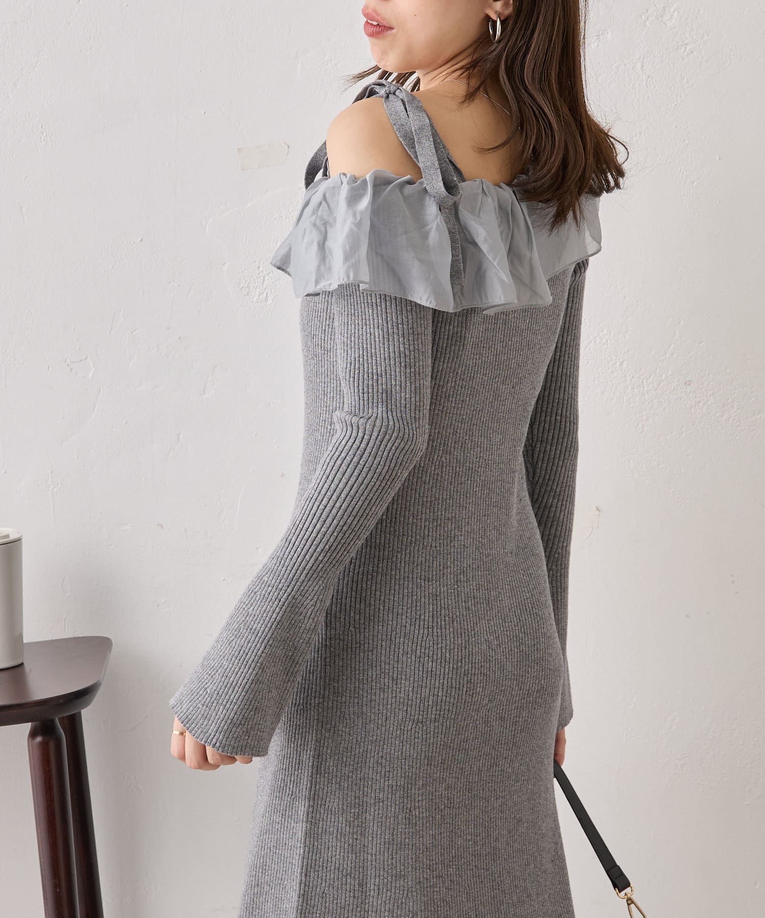 ワンショルのアシメデザインとフリルがエレガントなリブワンピース