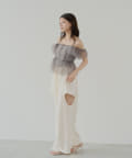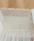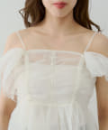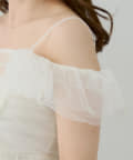 ・肩を覆うようにあしらわれたフリルが、デコルテを美しく演出し、華奢な印象に。