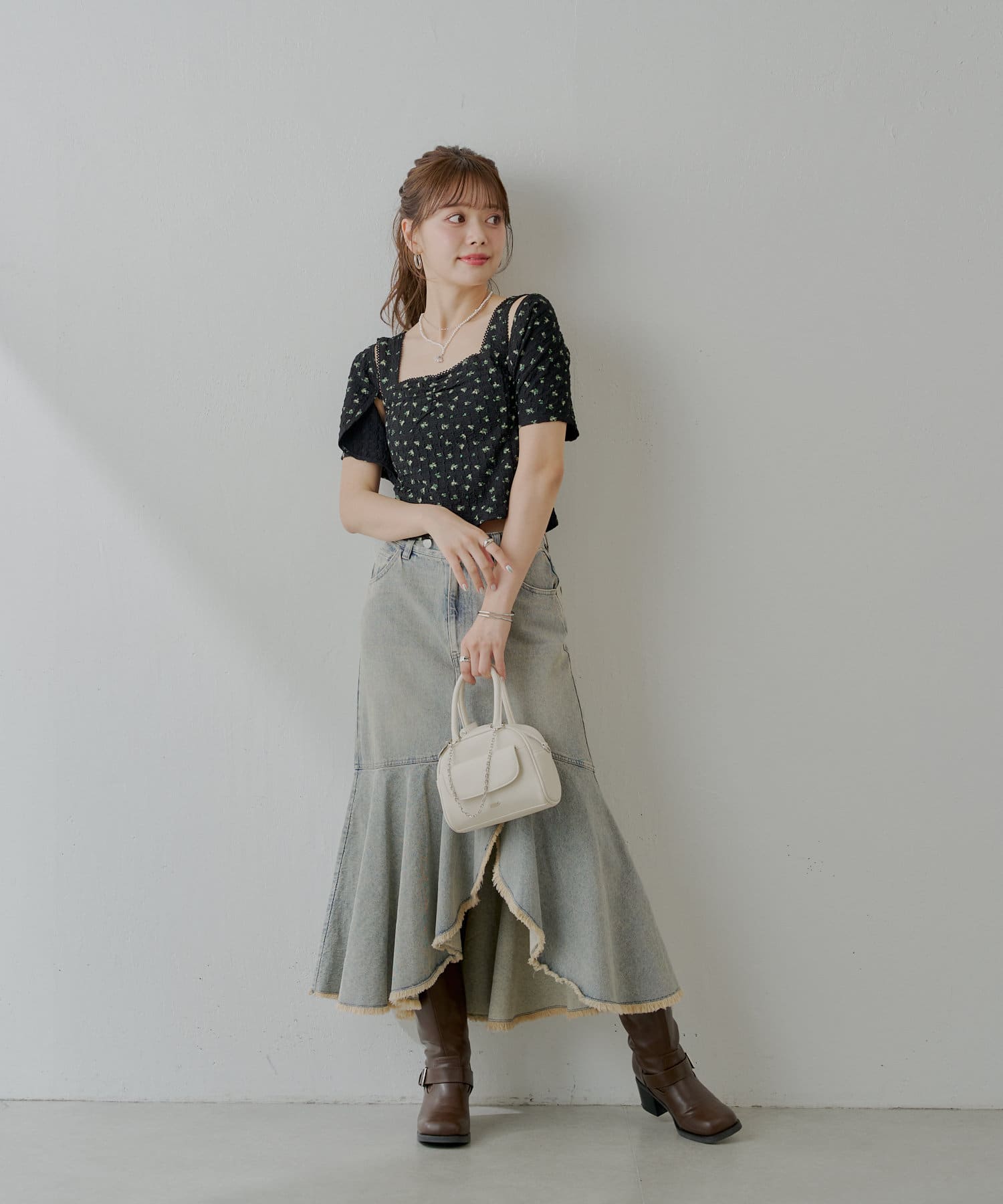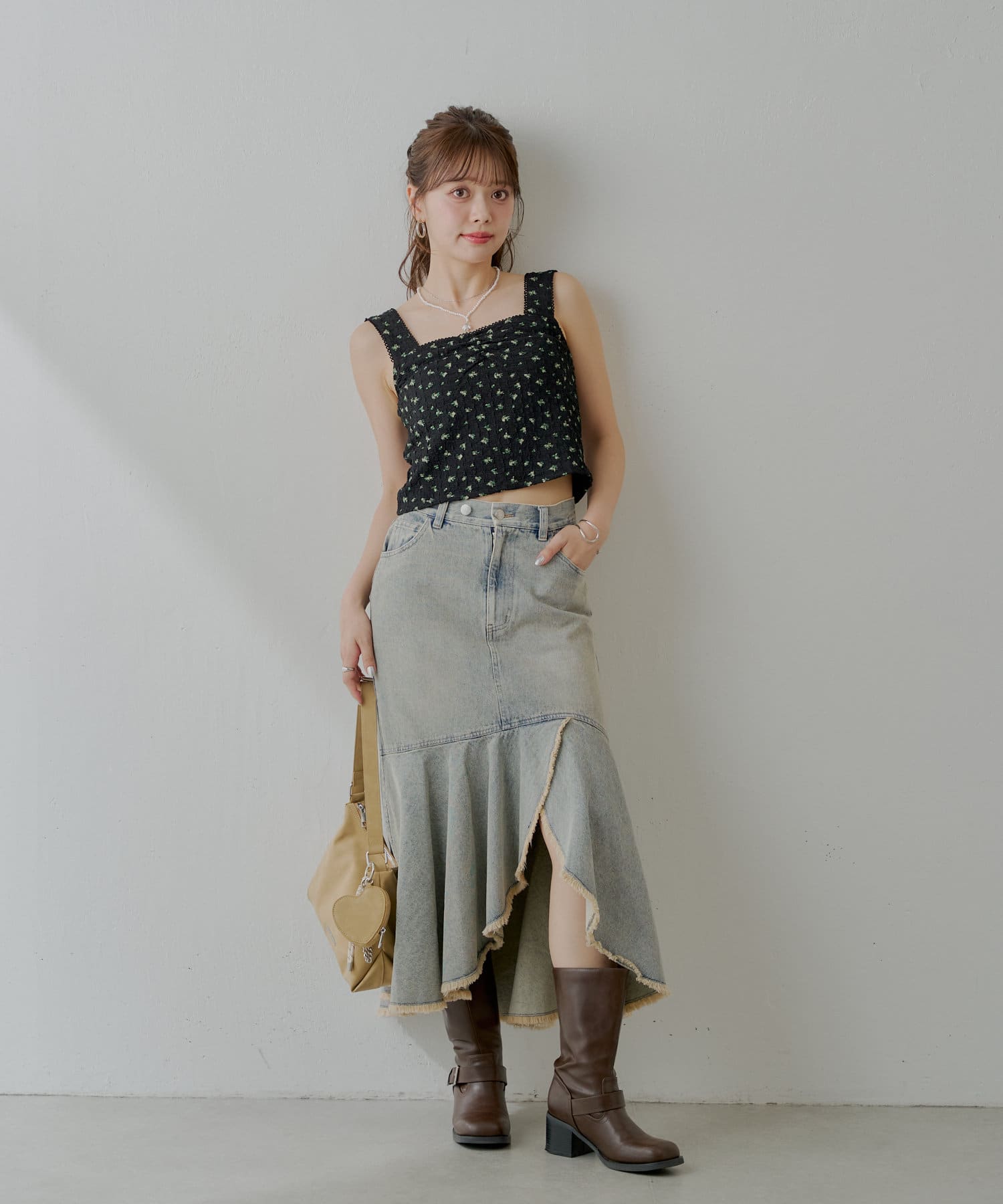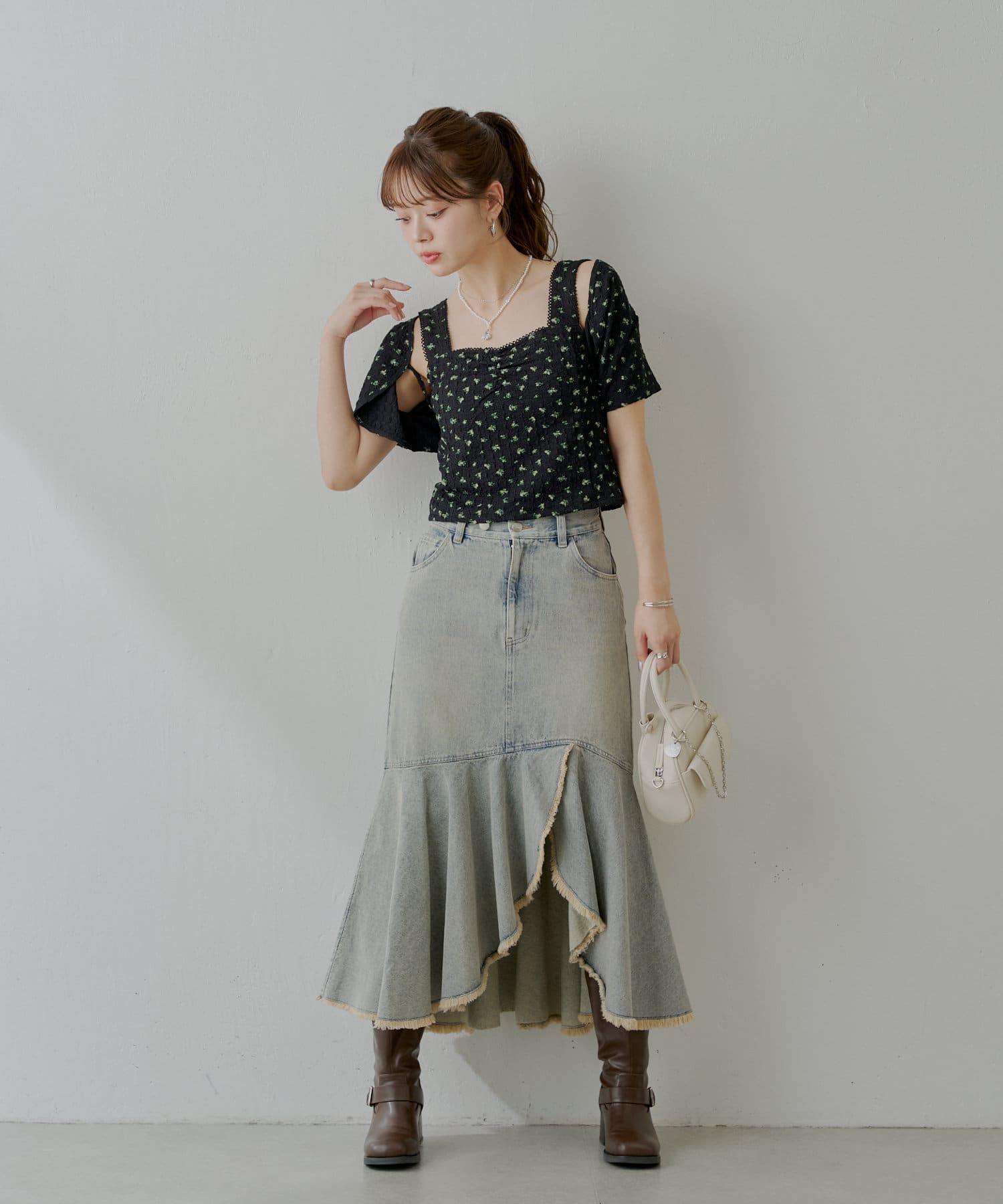 ▶おすすめアイテム:イレヘムフリルミニスカパン、裾フリンジタイトフレアデニムスカート・デニム合わせで、大人っぽいきれいめスタイルに仕上がります。