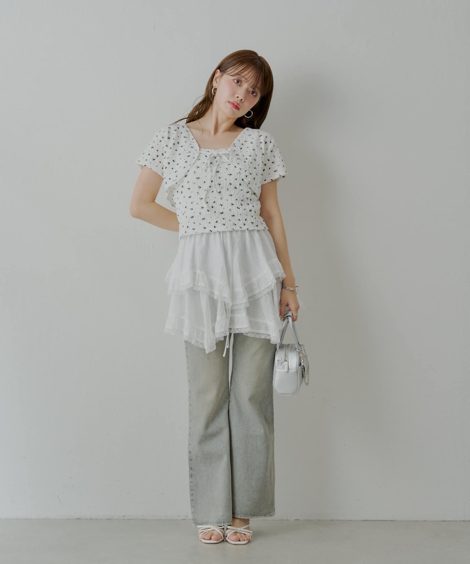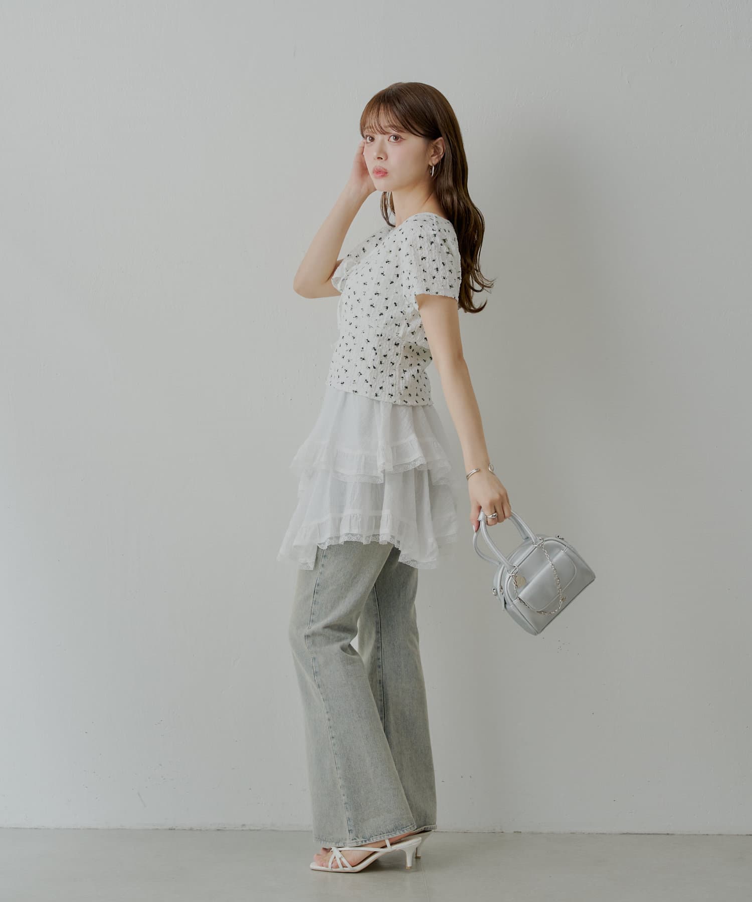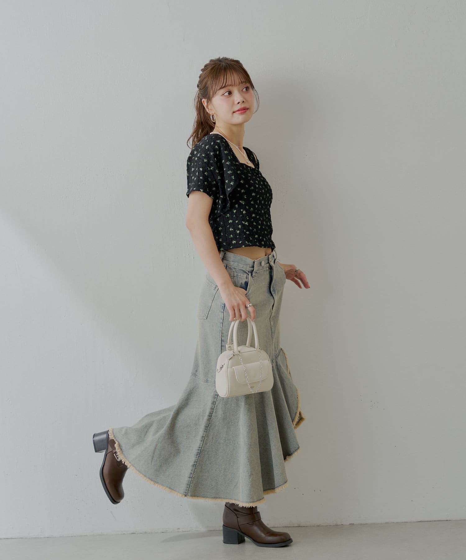 ▶おすすめアイテム:イレヘムフリルミニスカパン、裾フリンジタイトフレアデニムスカート・デニム合わせで、大人っぽいきれいめスタイルに仕上がります。