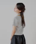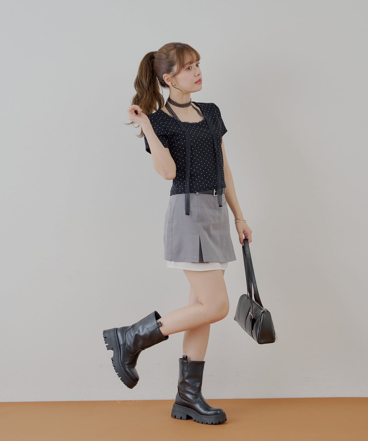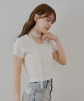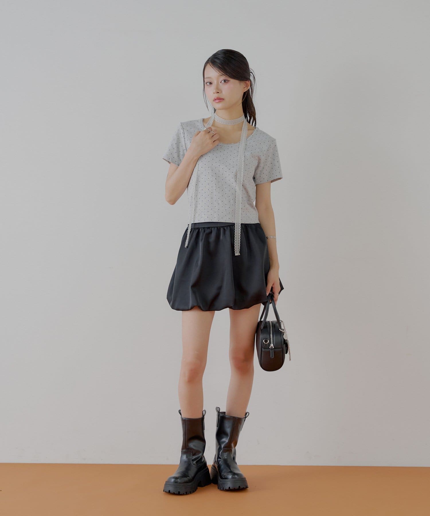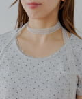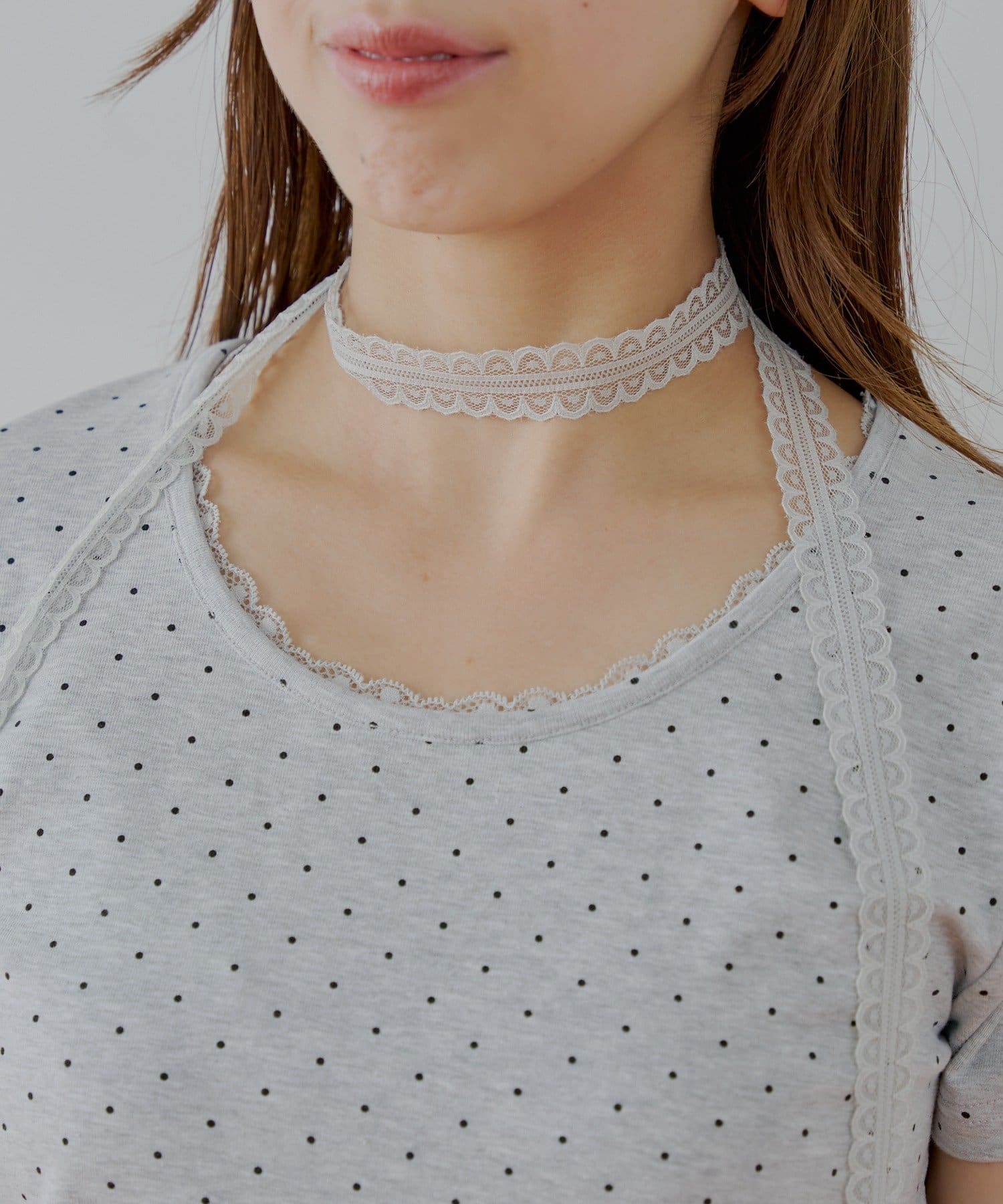 ・ネックラインとチョーカーに施された繊細なレースが、フェミニンな雰囲気にも。