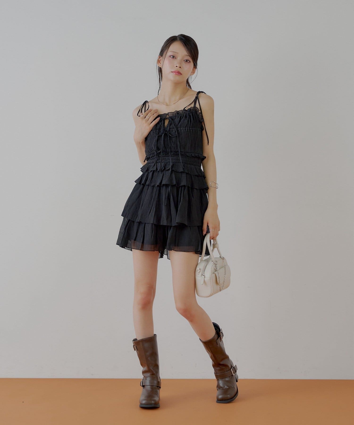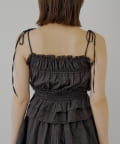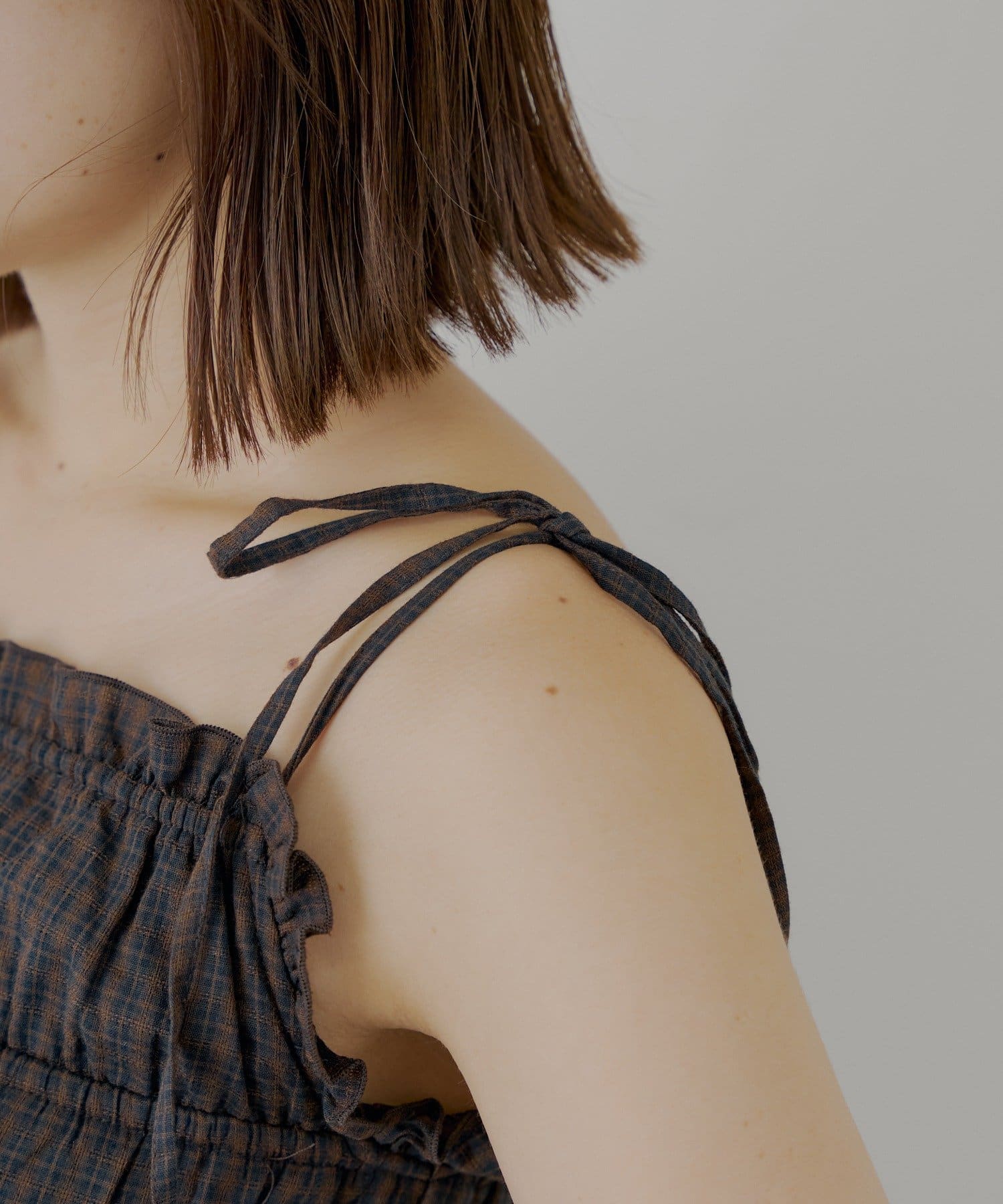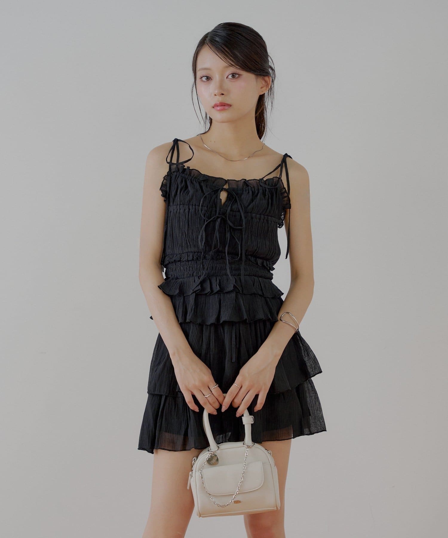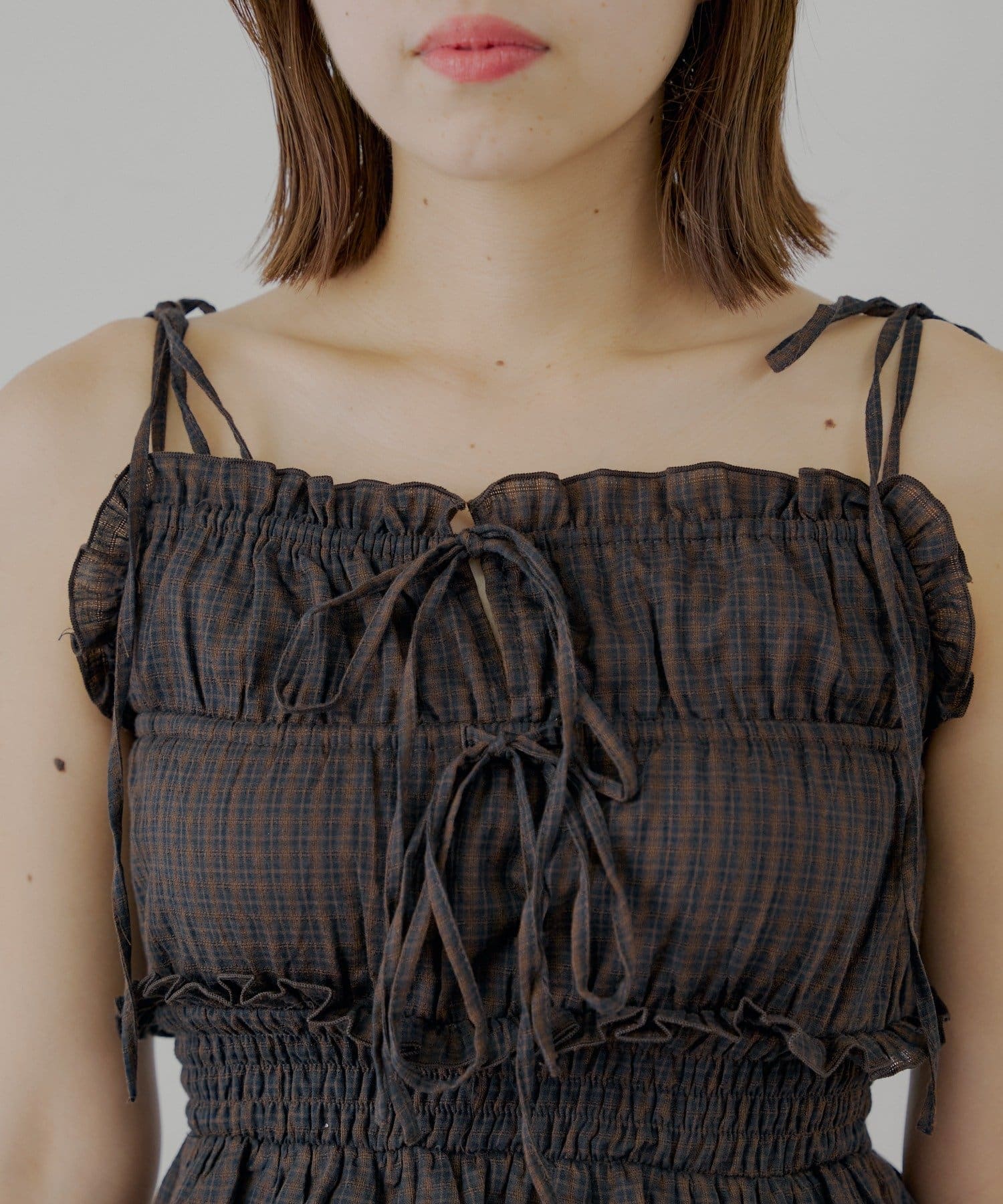 ・胸元のシャーリングとリボンがフェミニンなアクセントをプラスしてくれます。