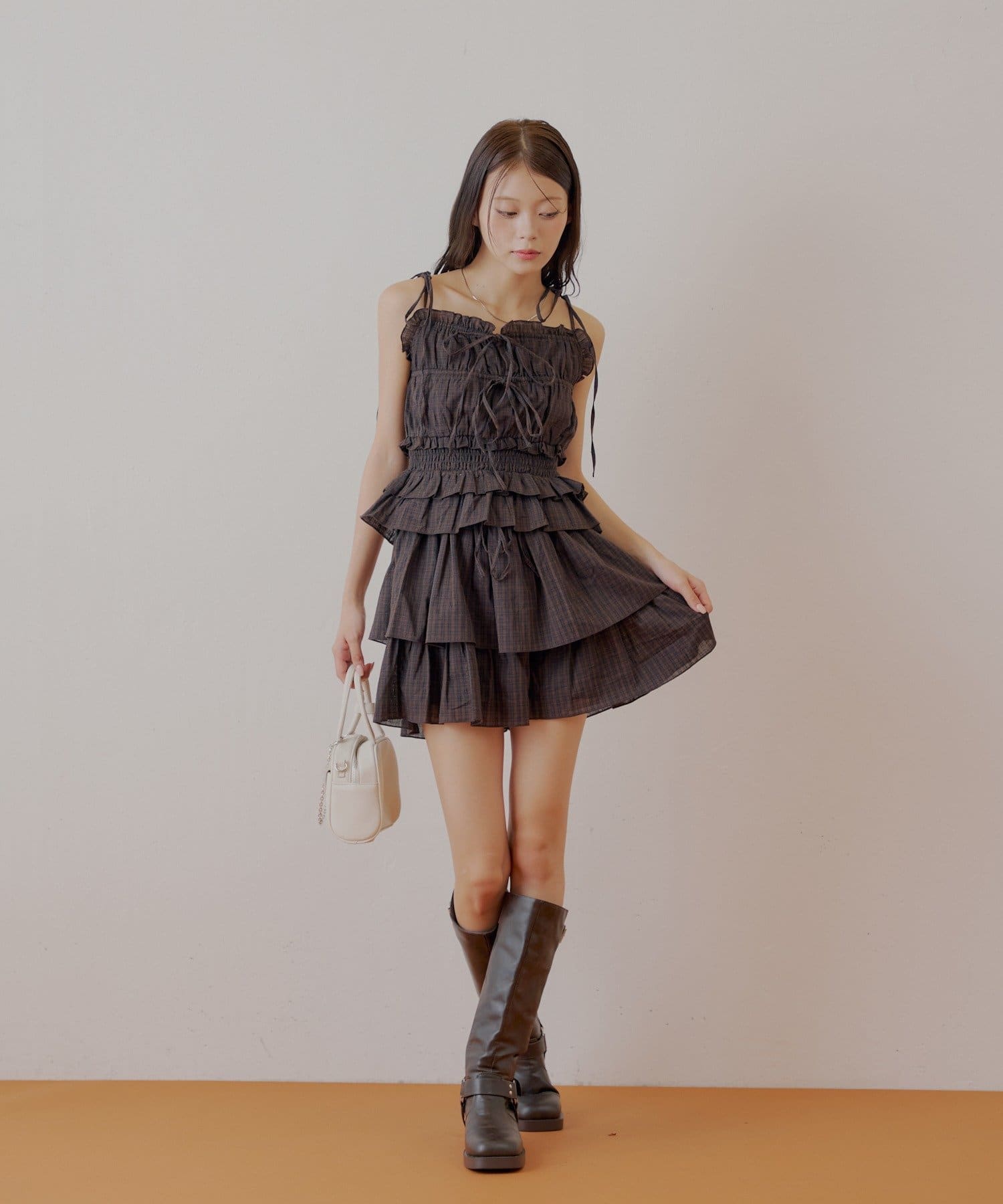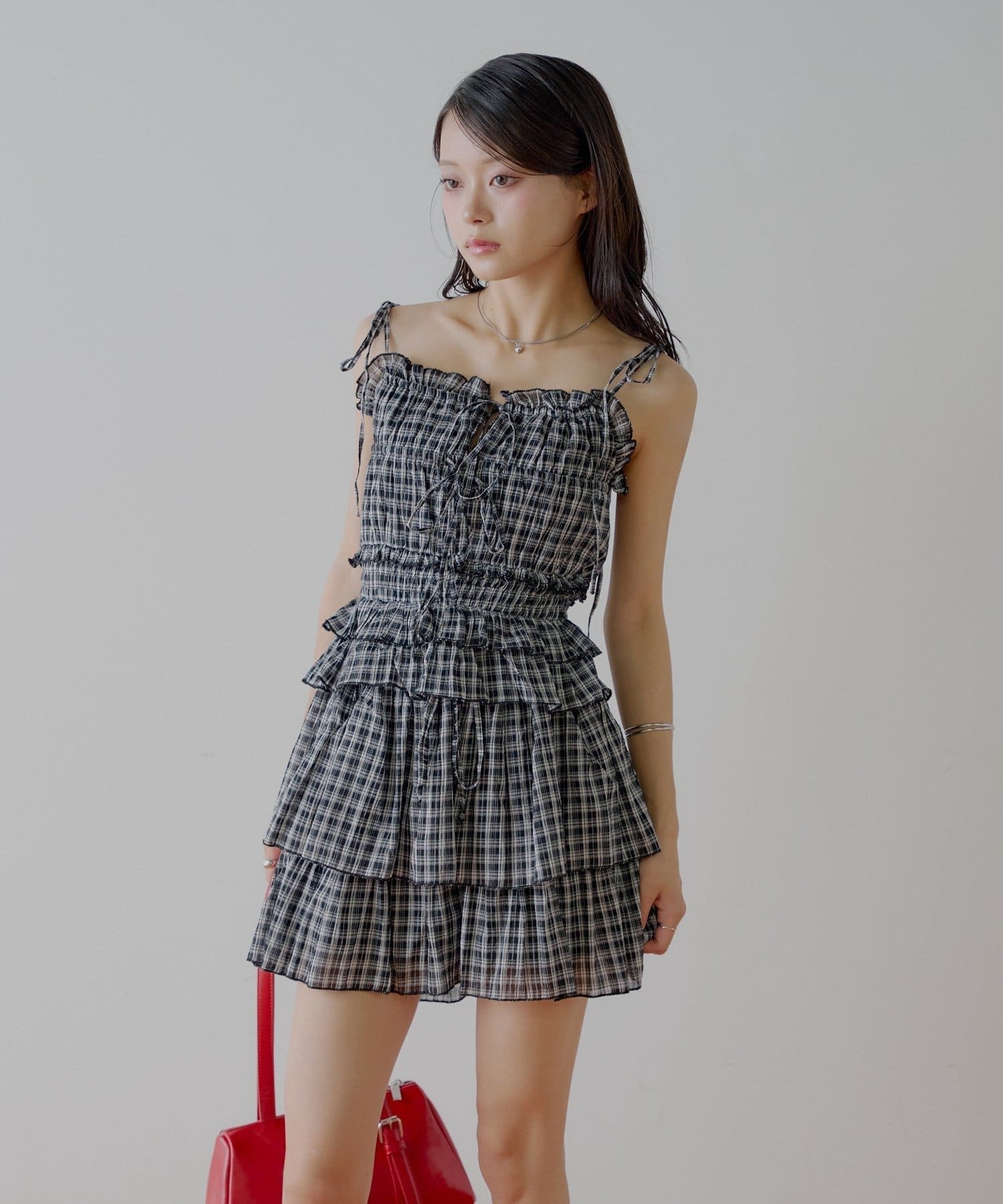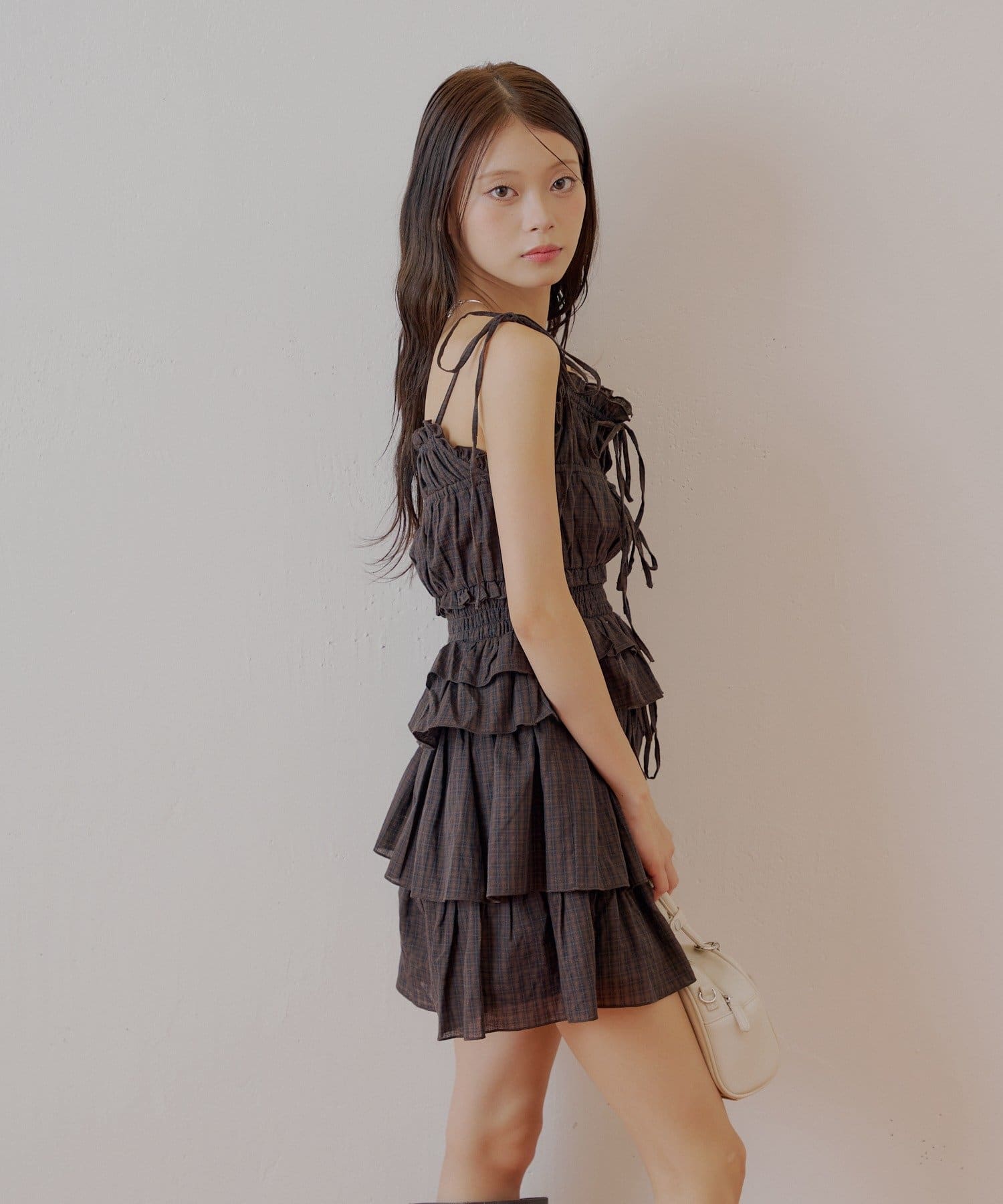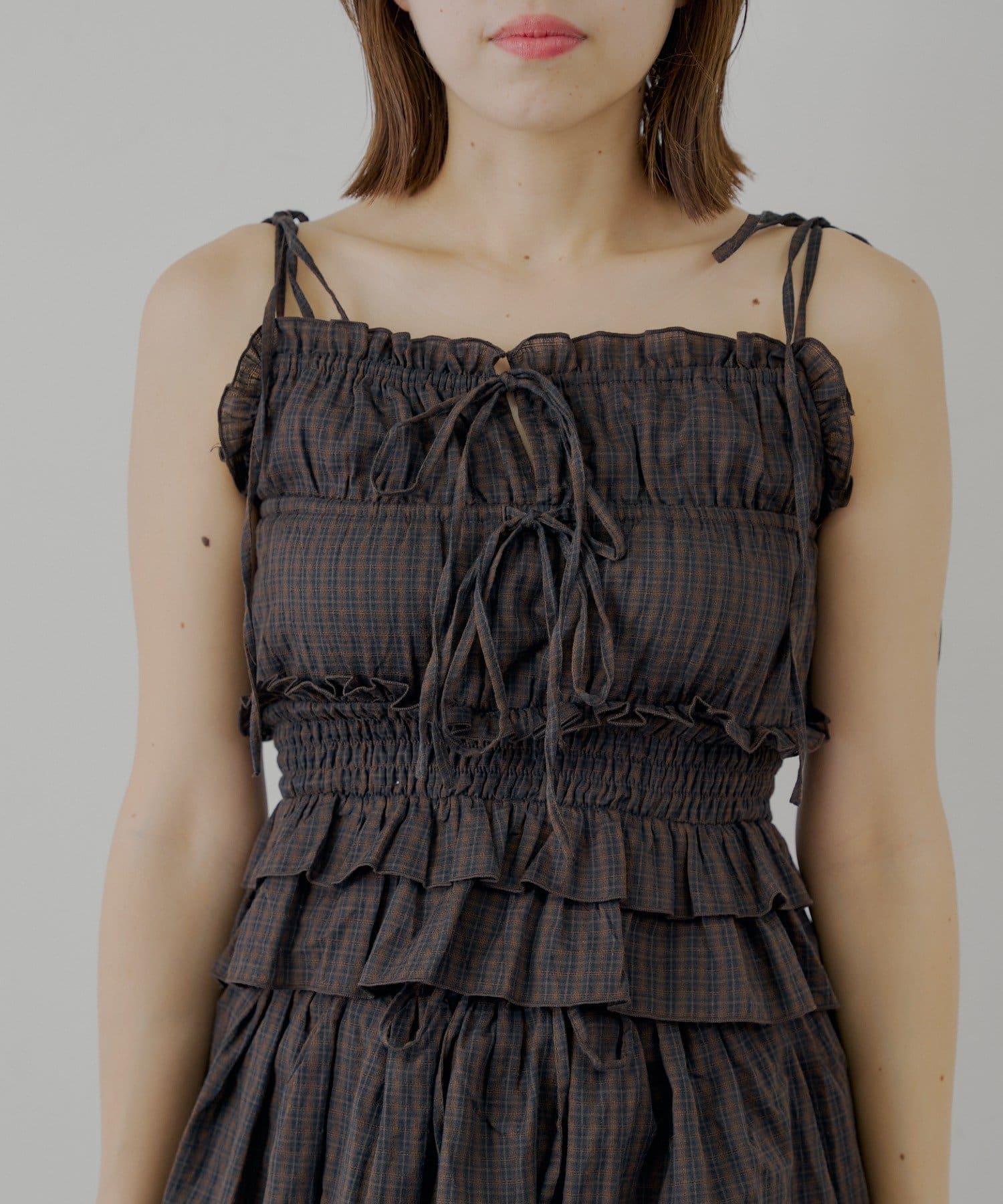 ・胸元のシャーリングとリボンがフェミニンなアクセントをプラスしてくれます。