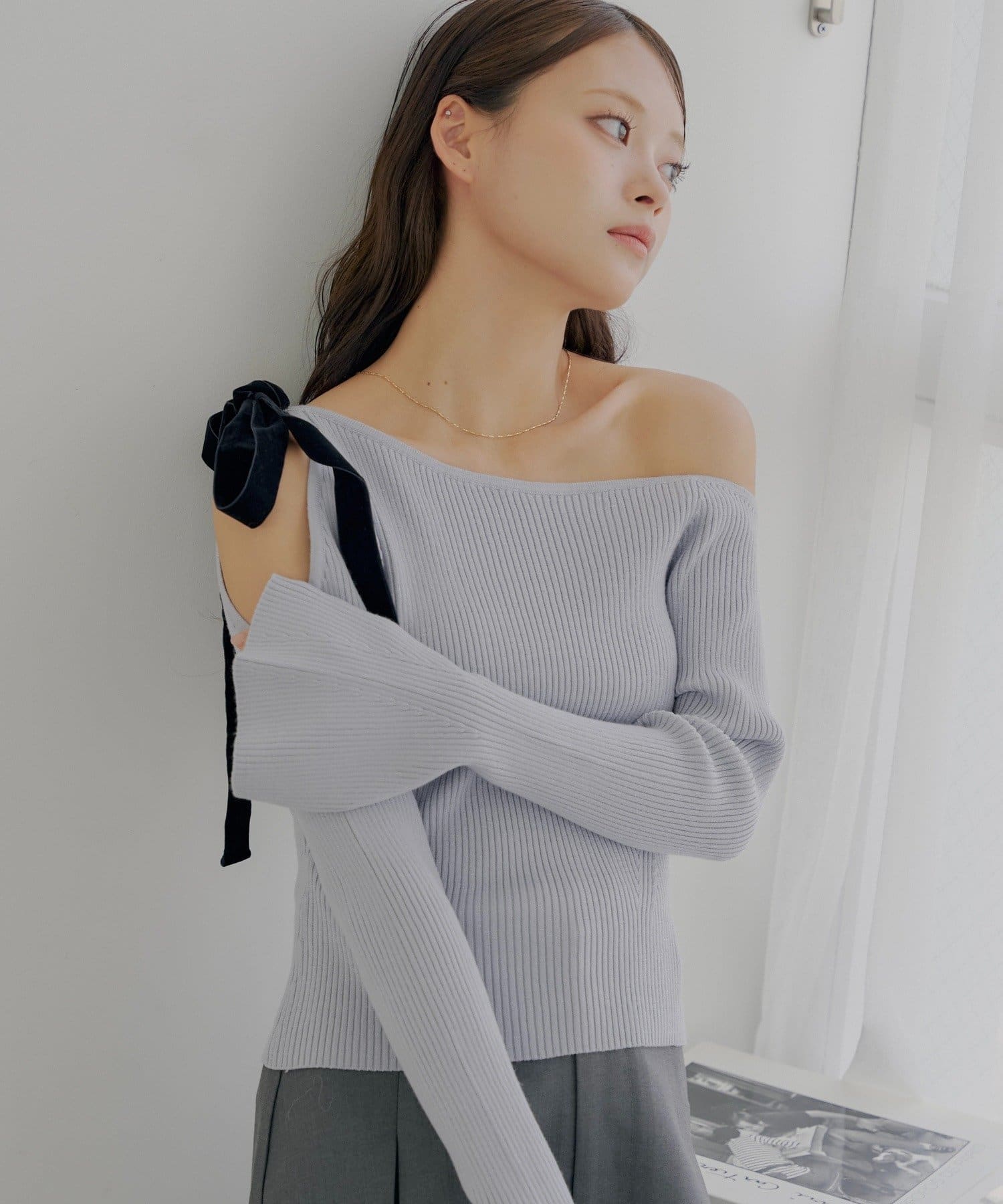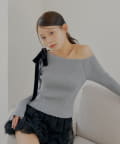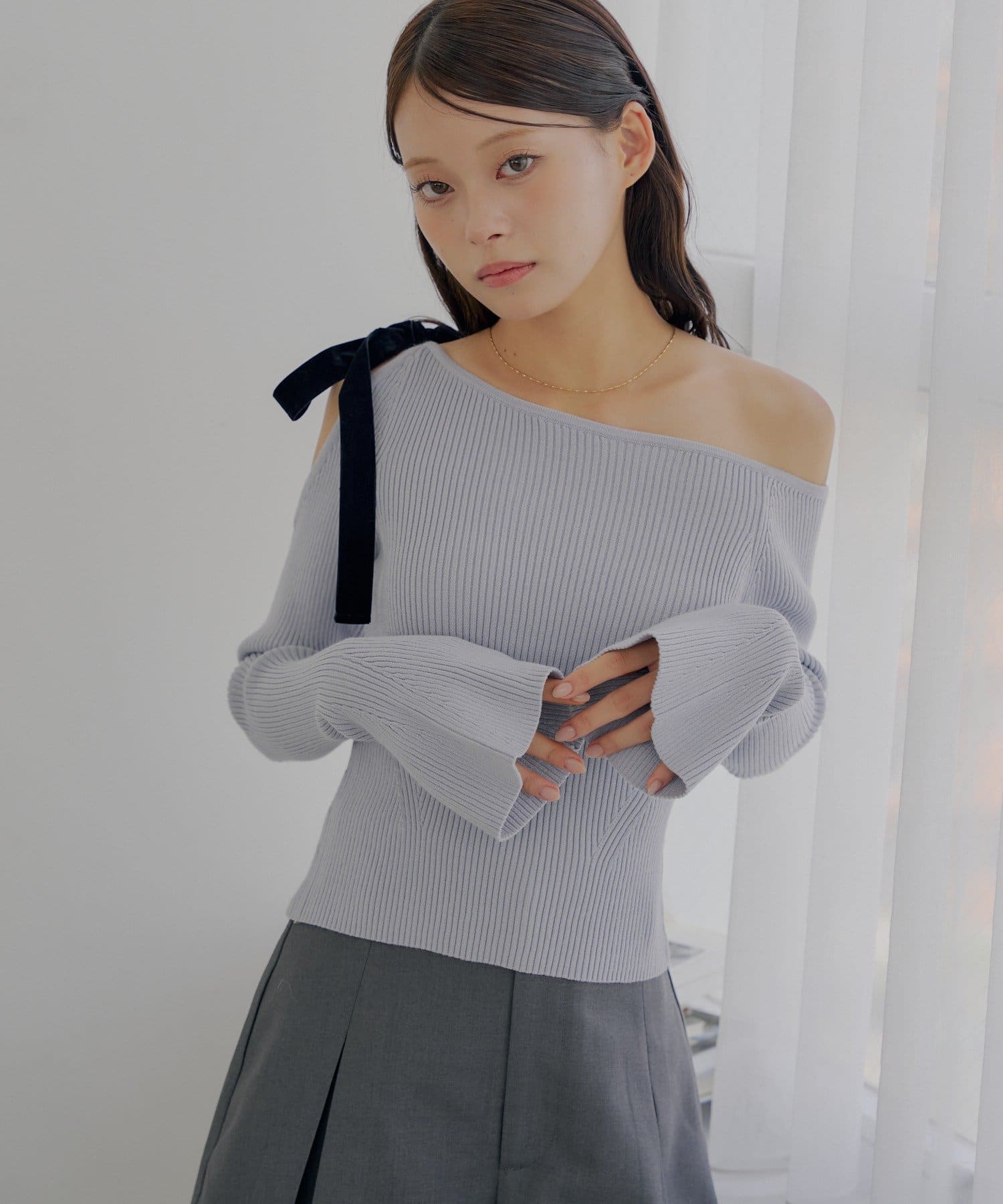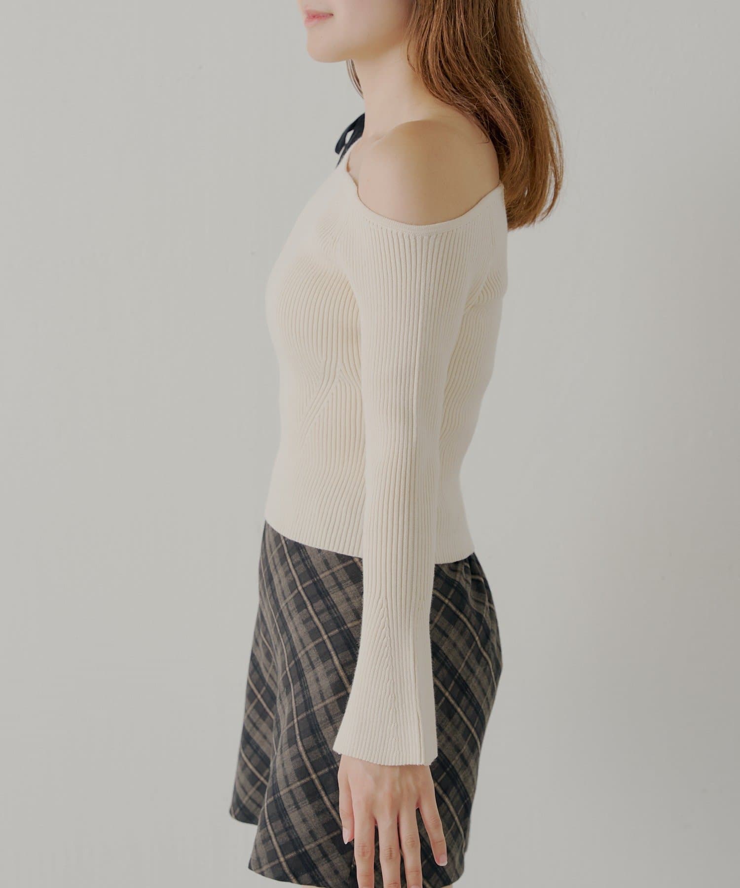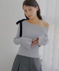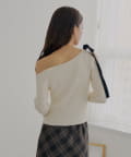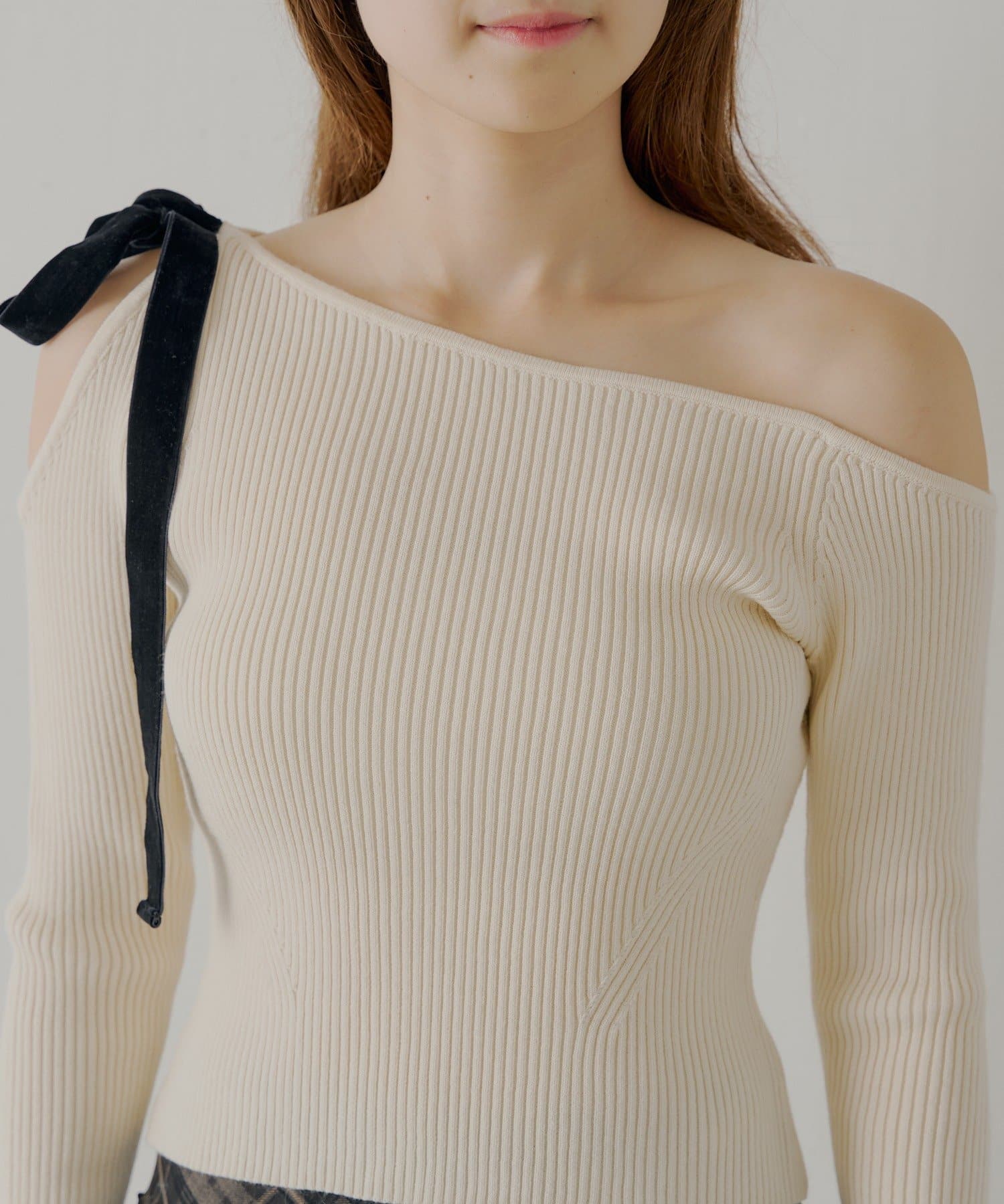 ・片方の肩を大胆に露出した、アシンメトリーなデザインが目を引くリブニット。