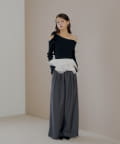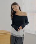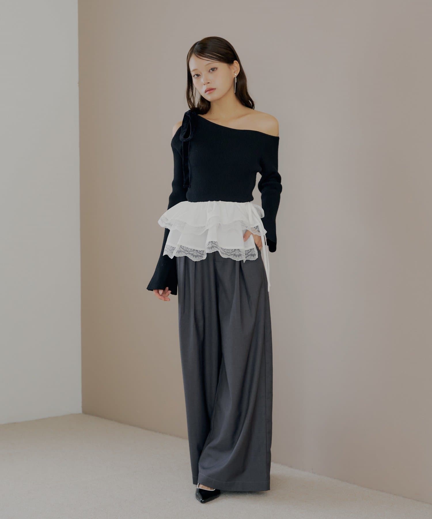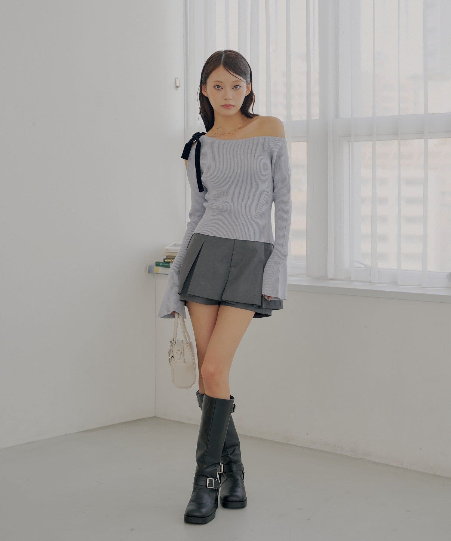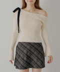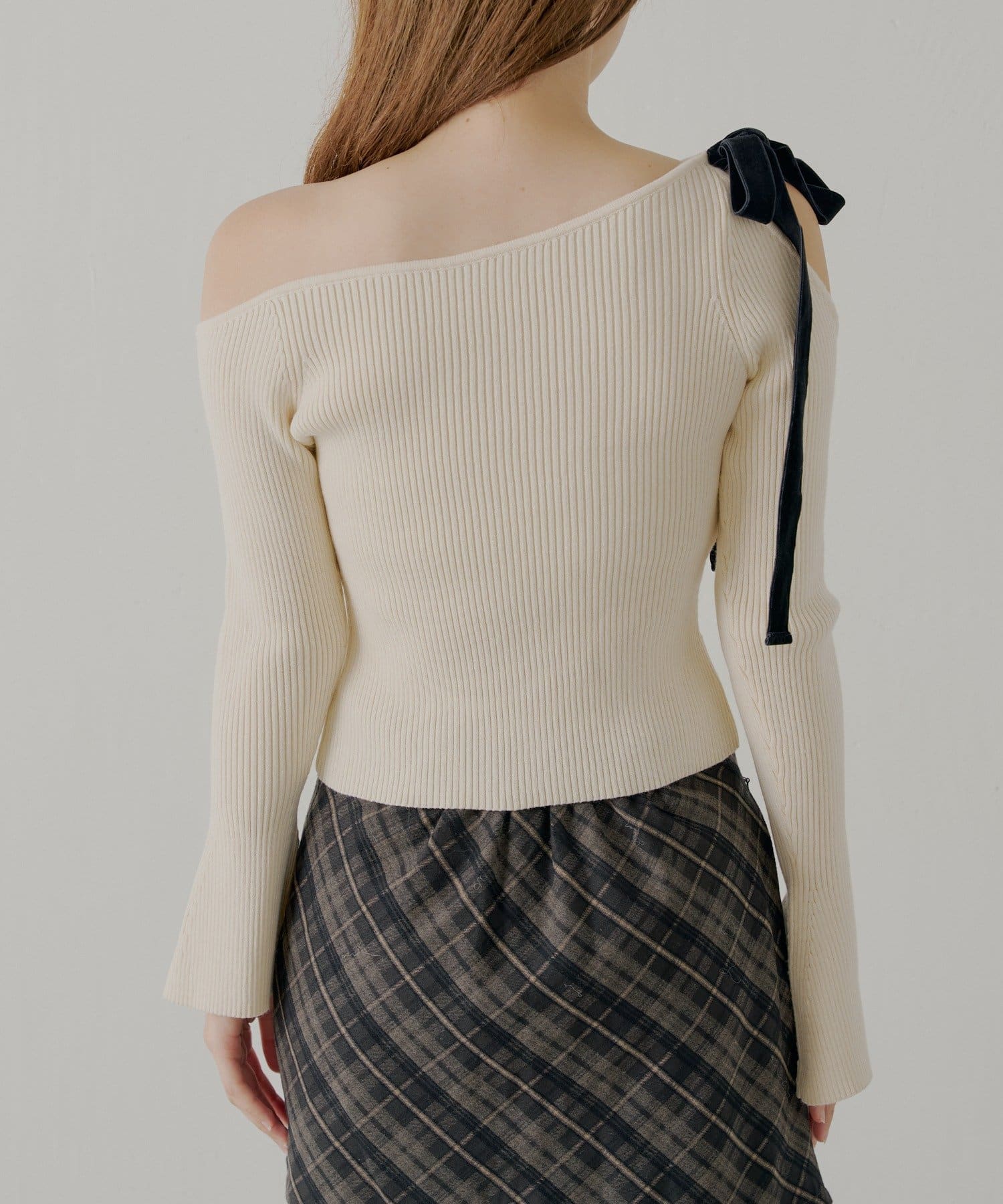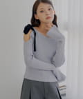 ・片方の肩を大胆に露出した、アシンメトリーなデザインが目を引くリブニット。