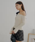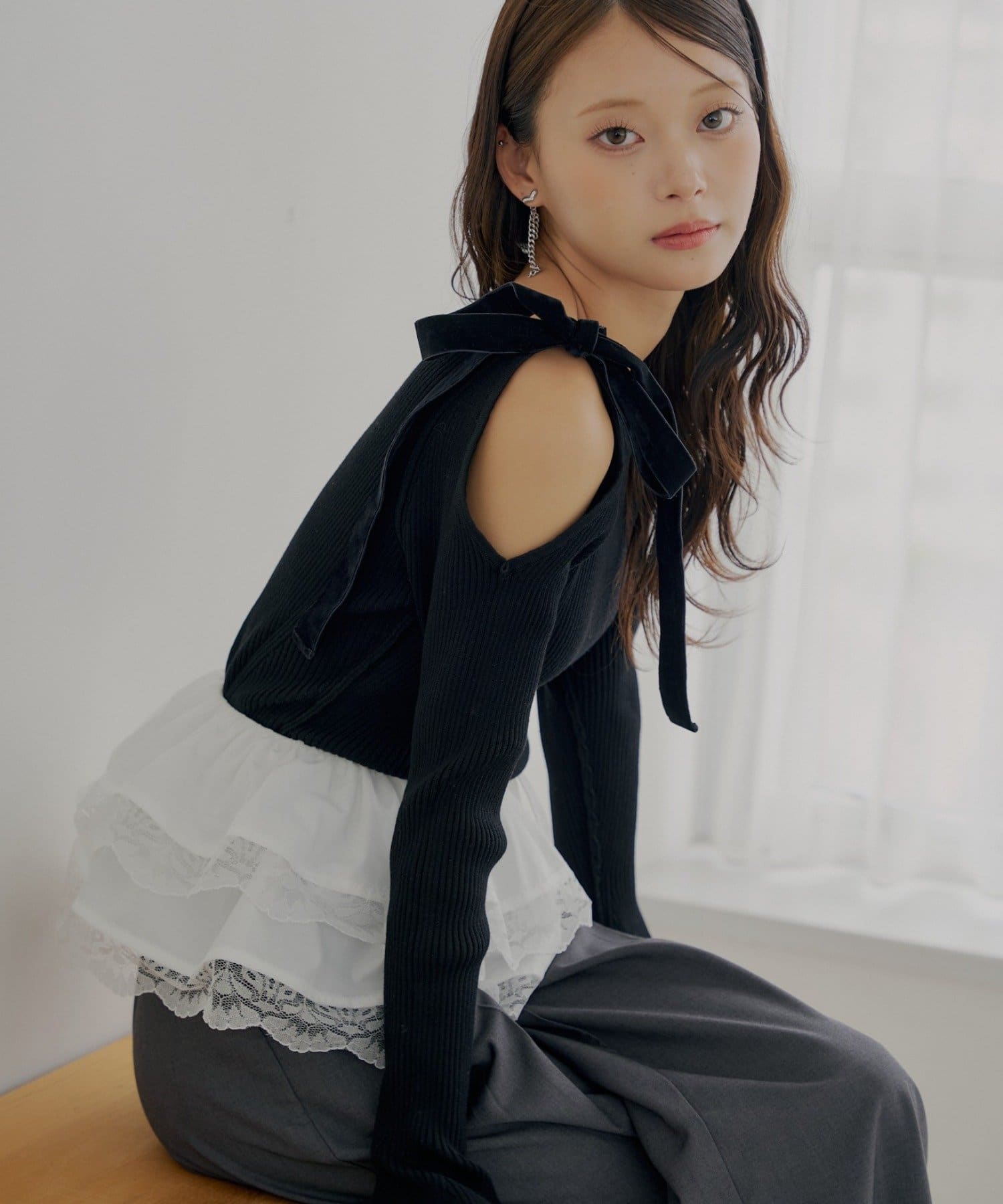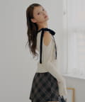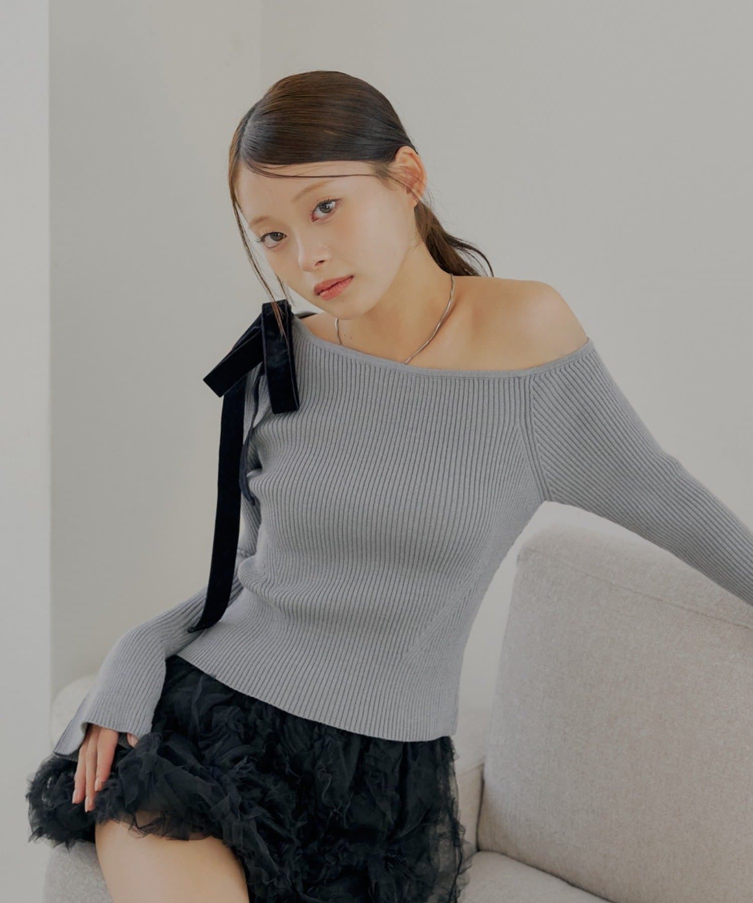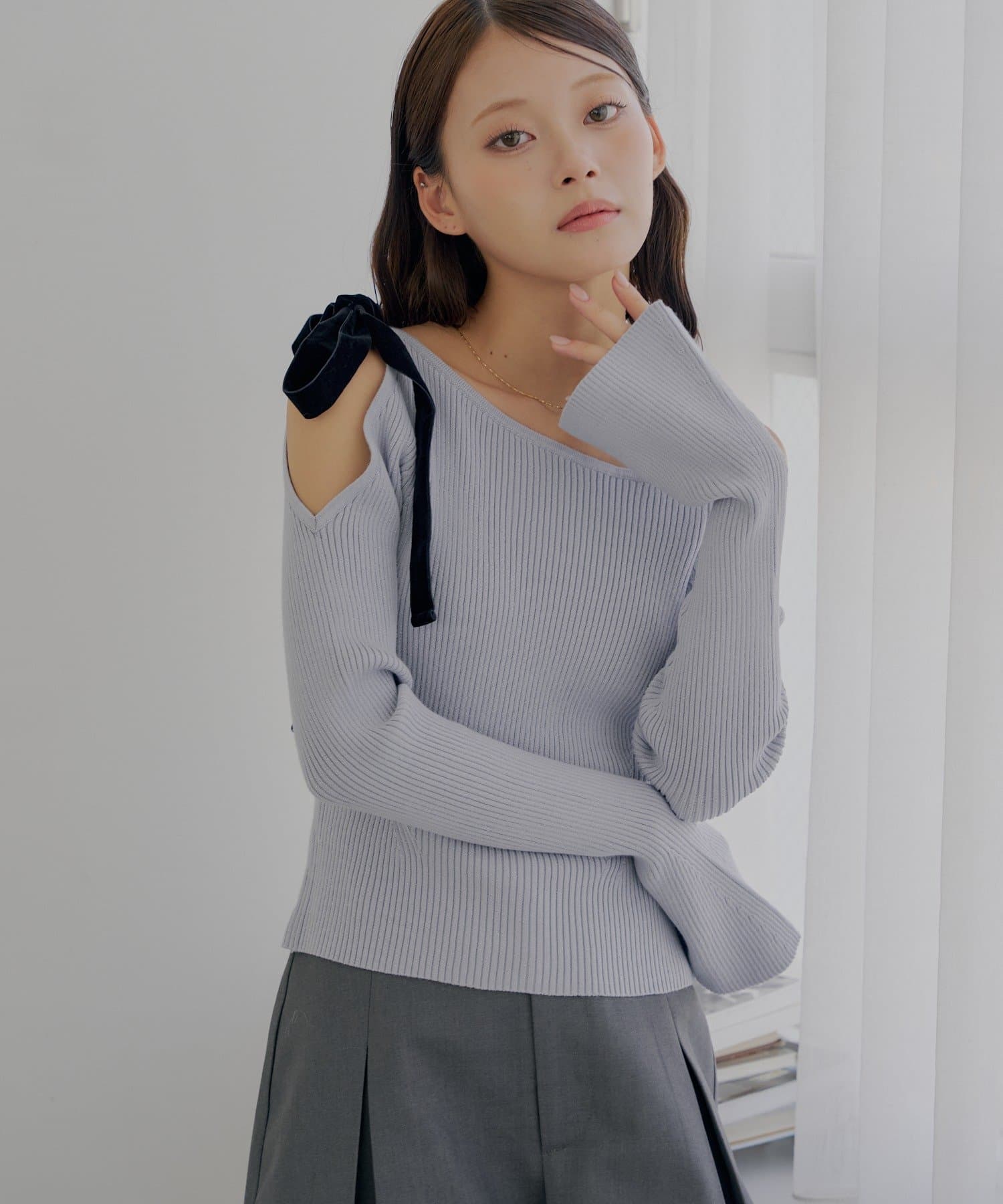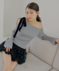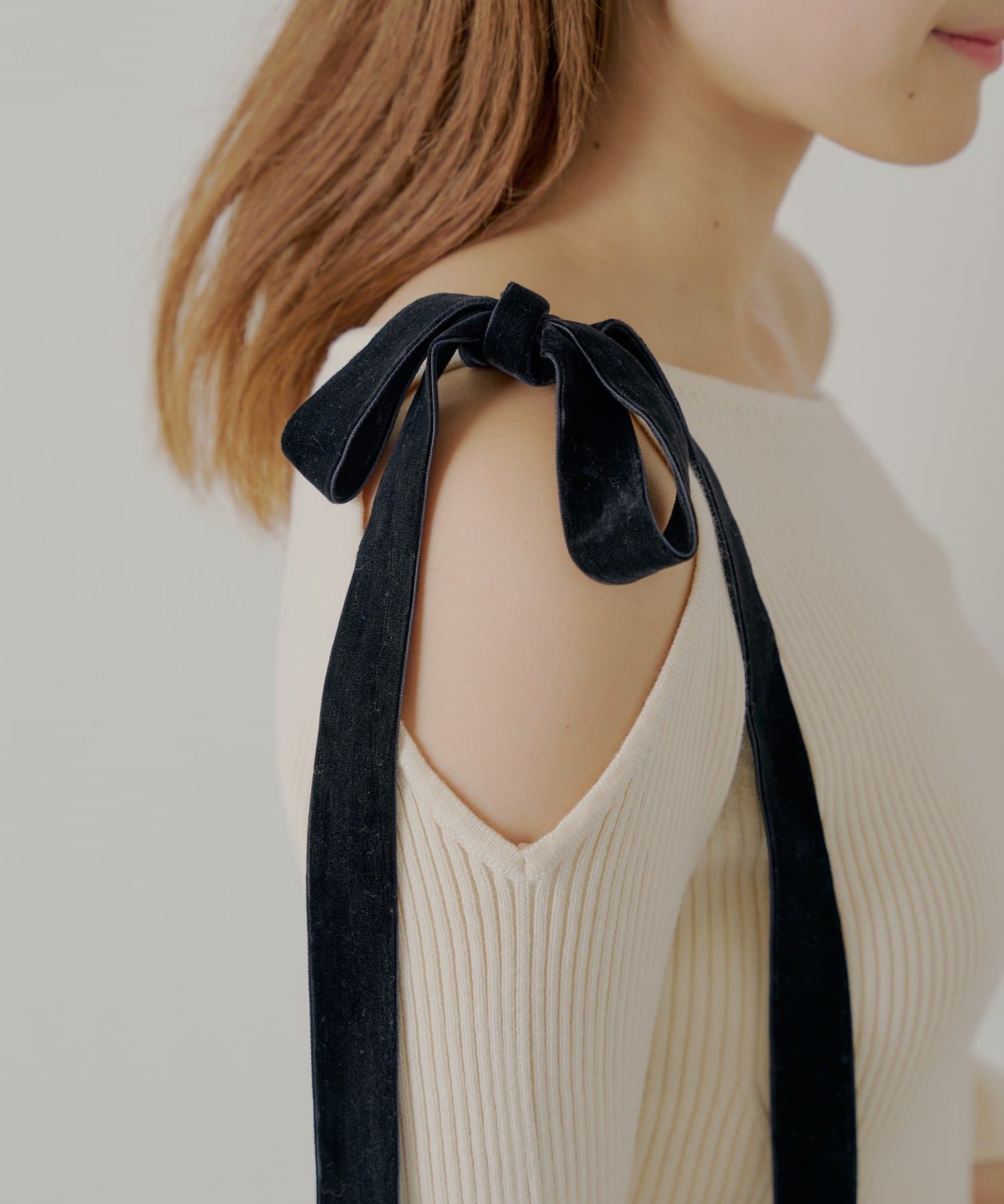 ・肩にあしらわれたベロア調のリボンが、フェミニンなアクセントをプラスしてくれます。