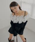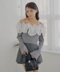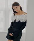 大胆にあしらわれたフリルが目を惹くBIGフリルドッキングオフショルニット