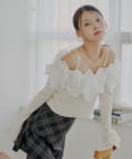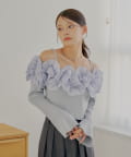 ・デコルテを彩るたっぷりのフリルが、目を惹くオフショルニット。