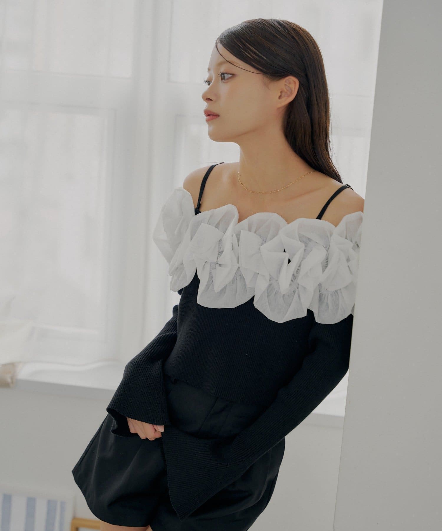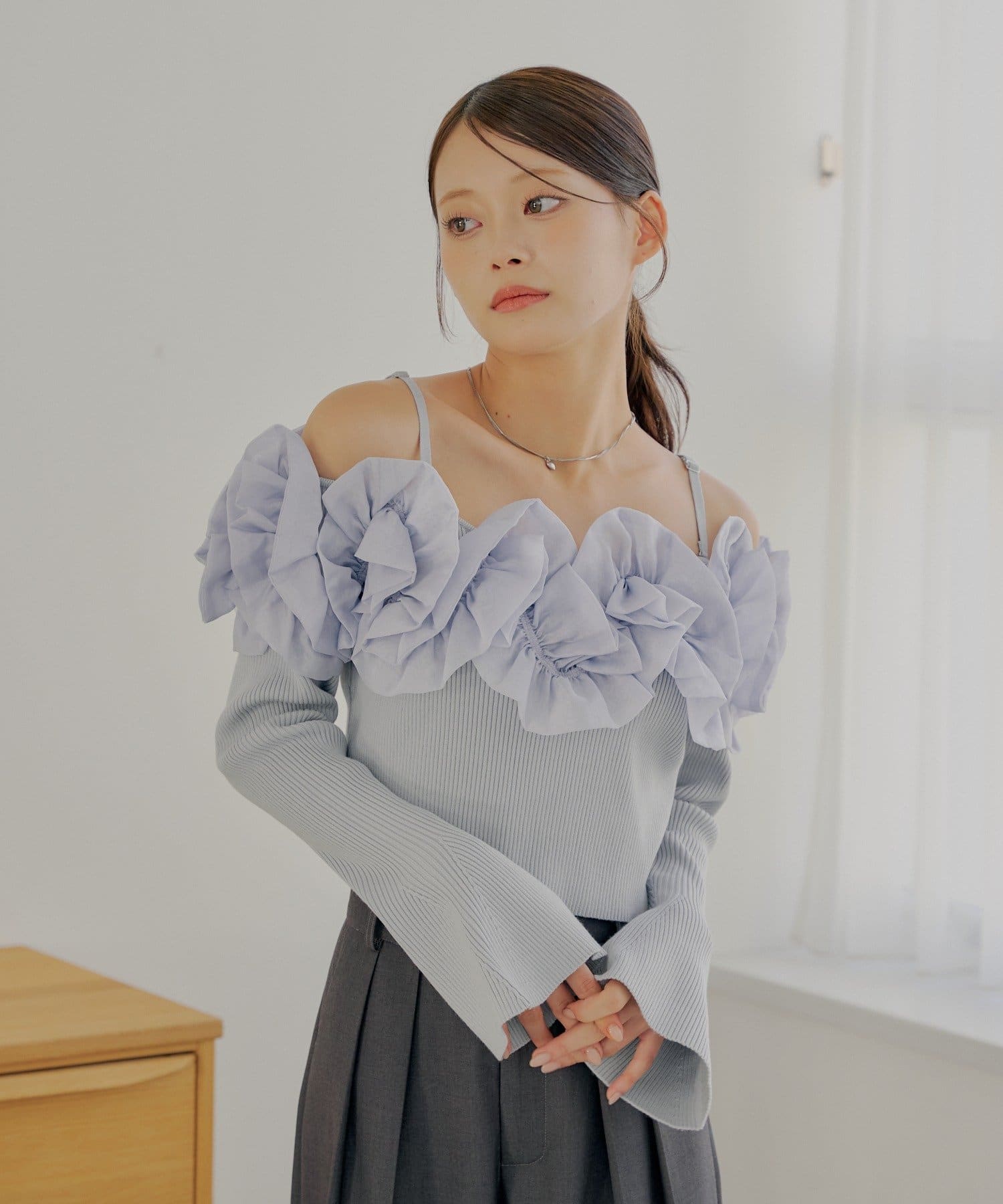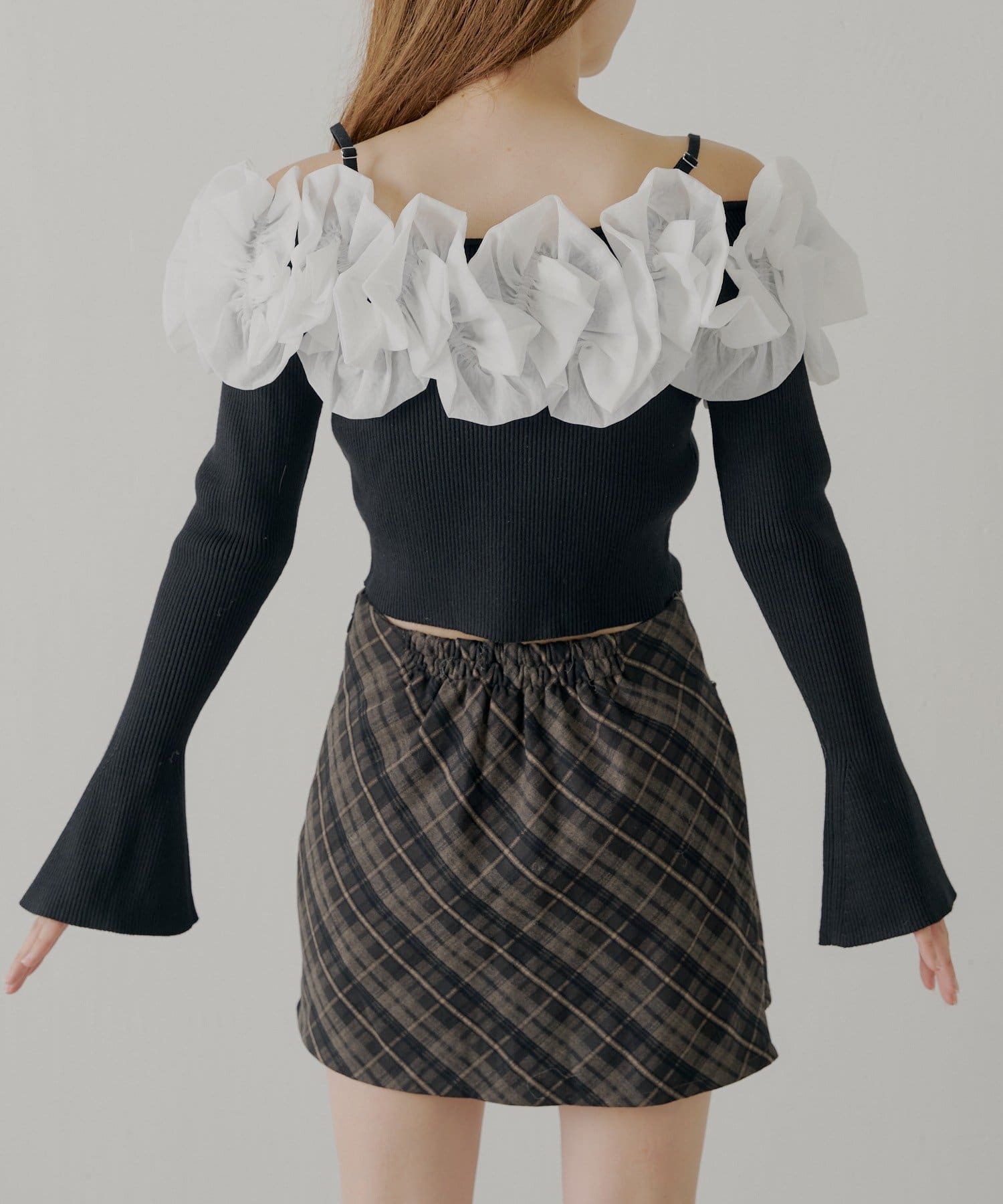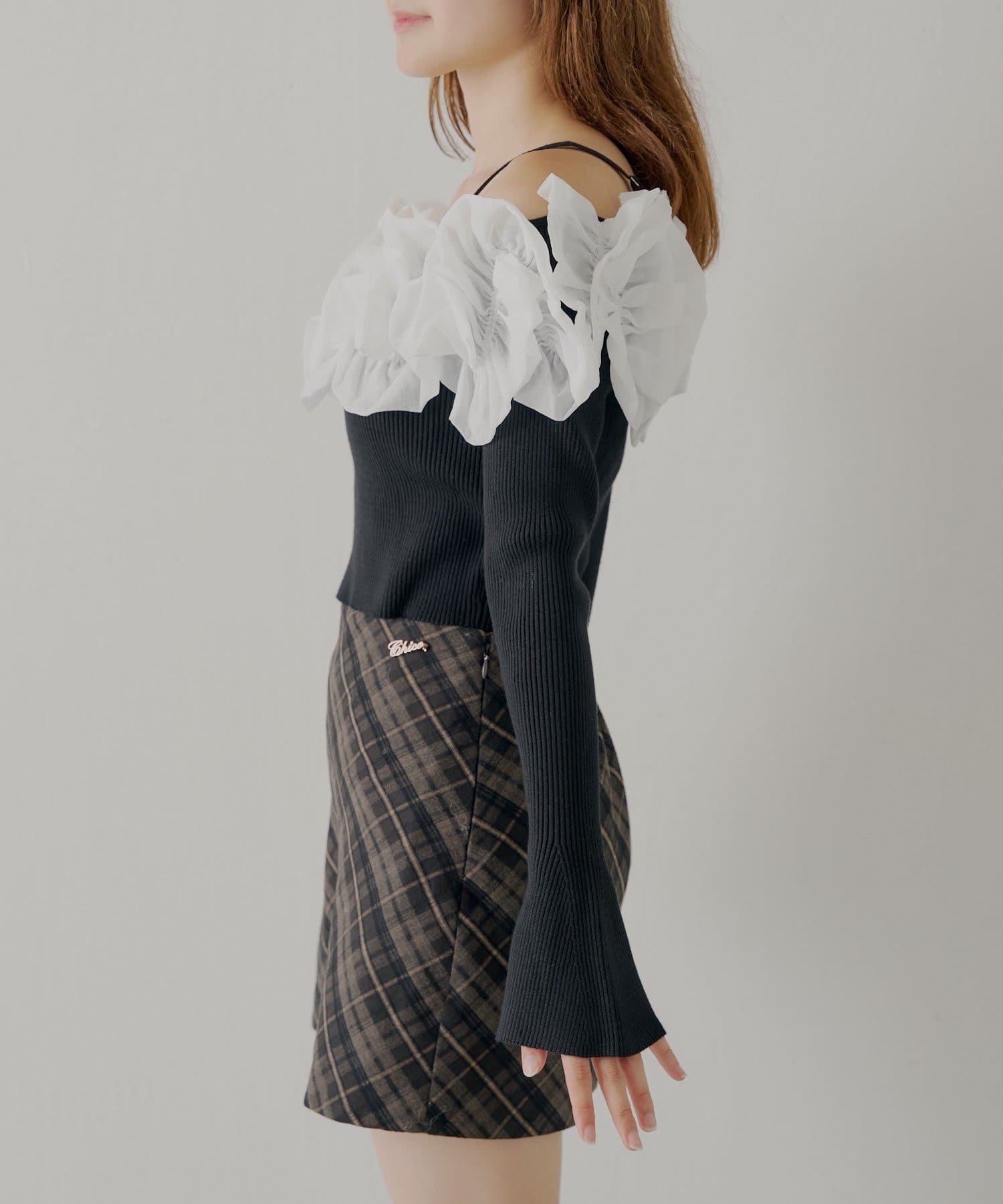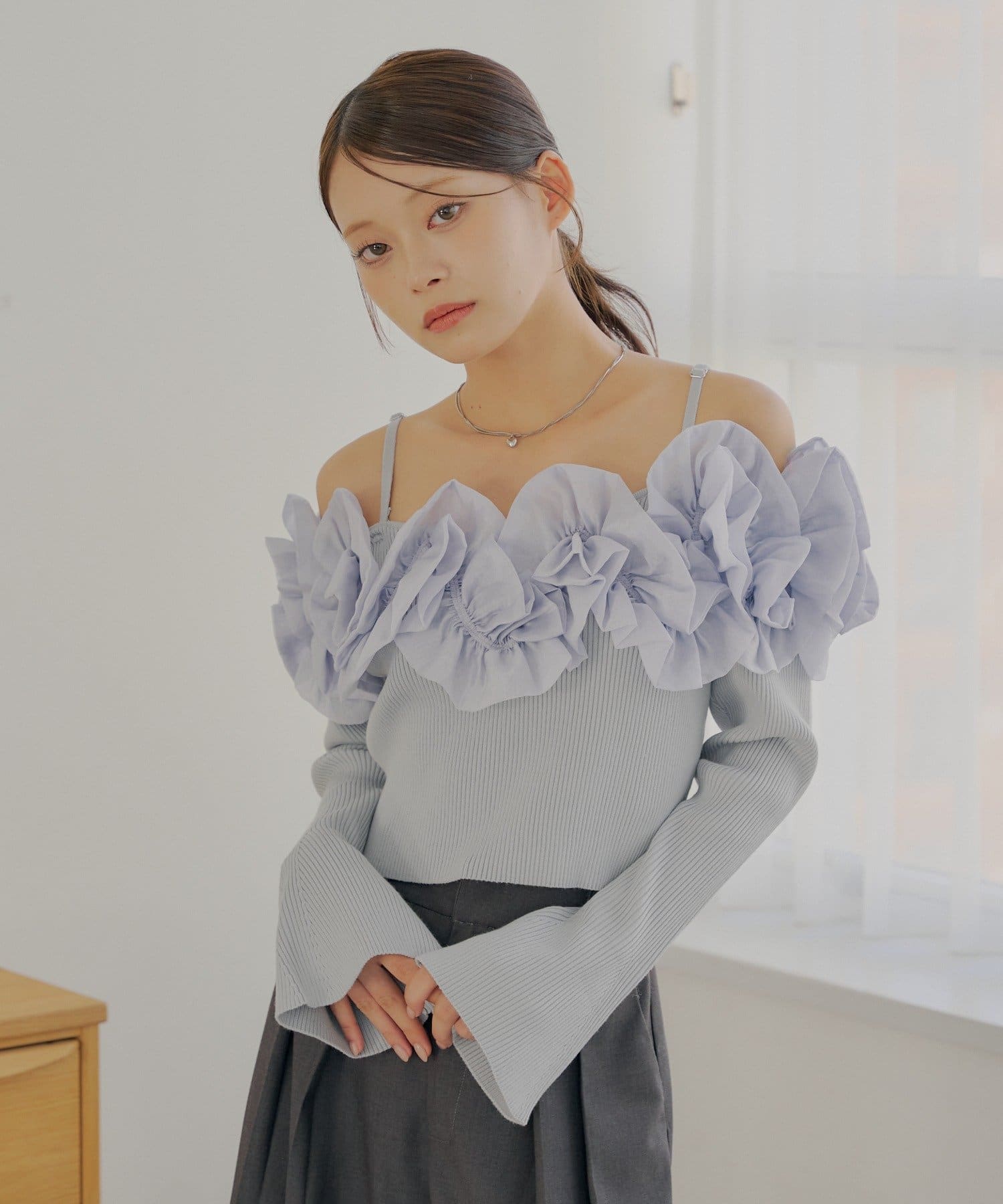 ・すっきりとしたリブニットと、ボリュームのあるフリルとのコントラストが魅力です。