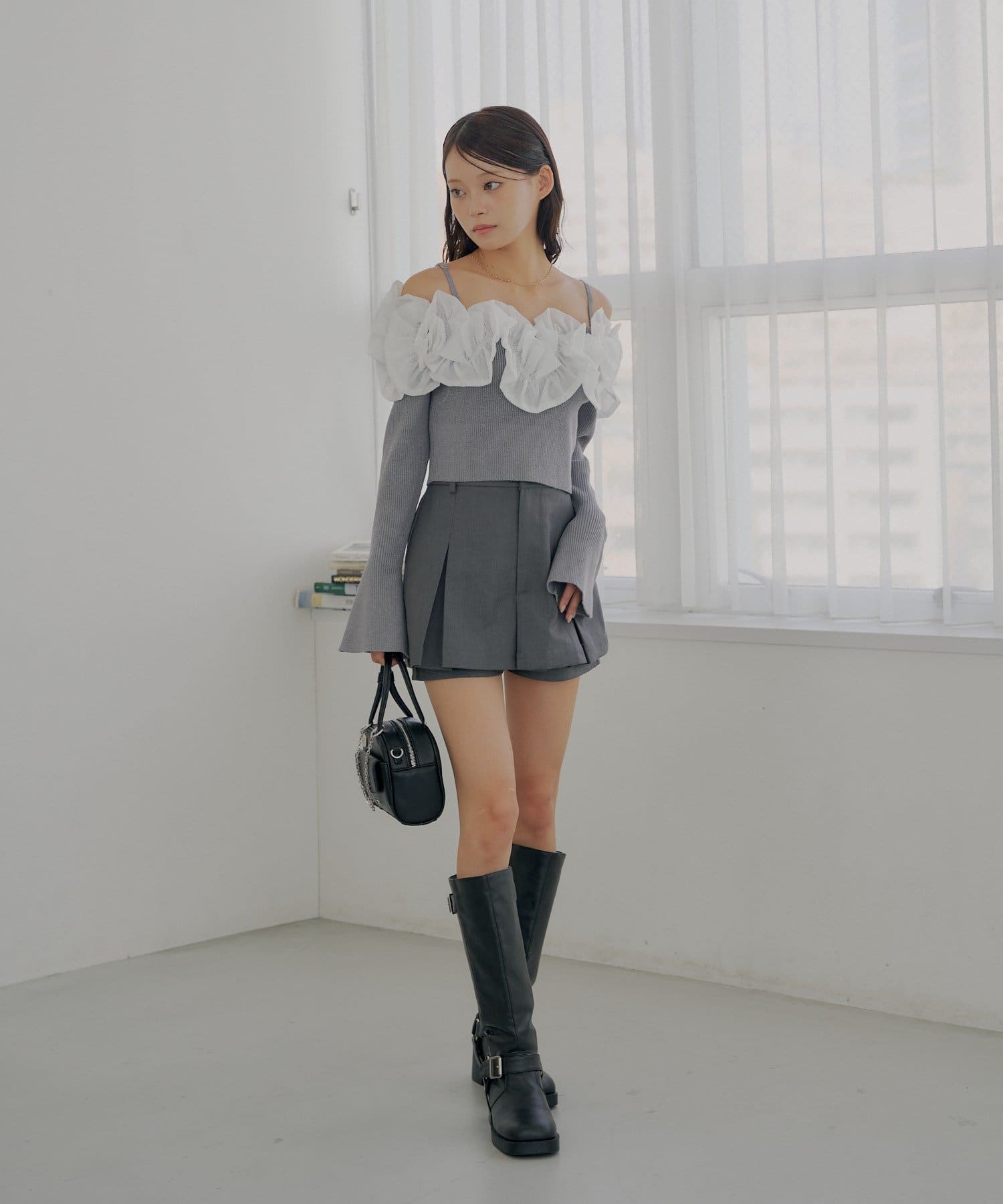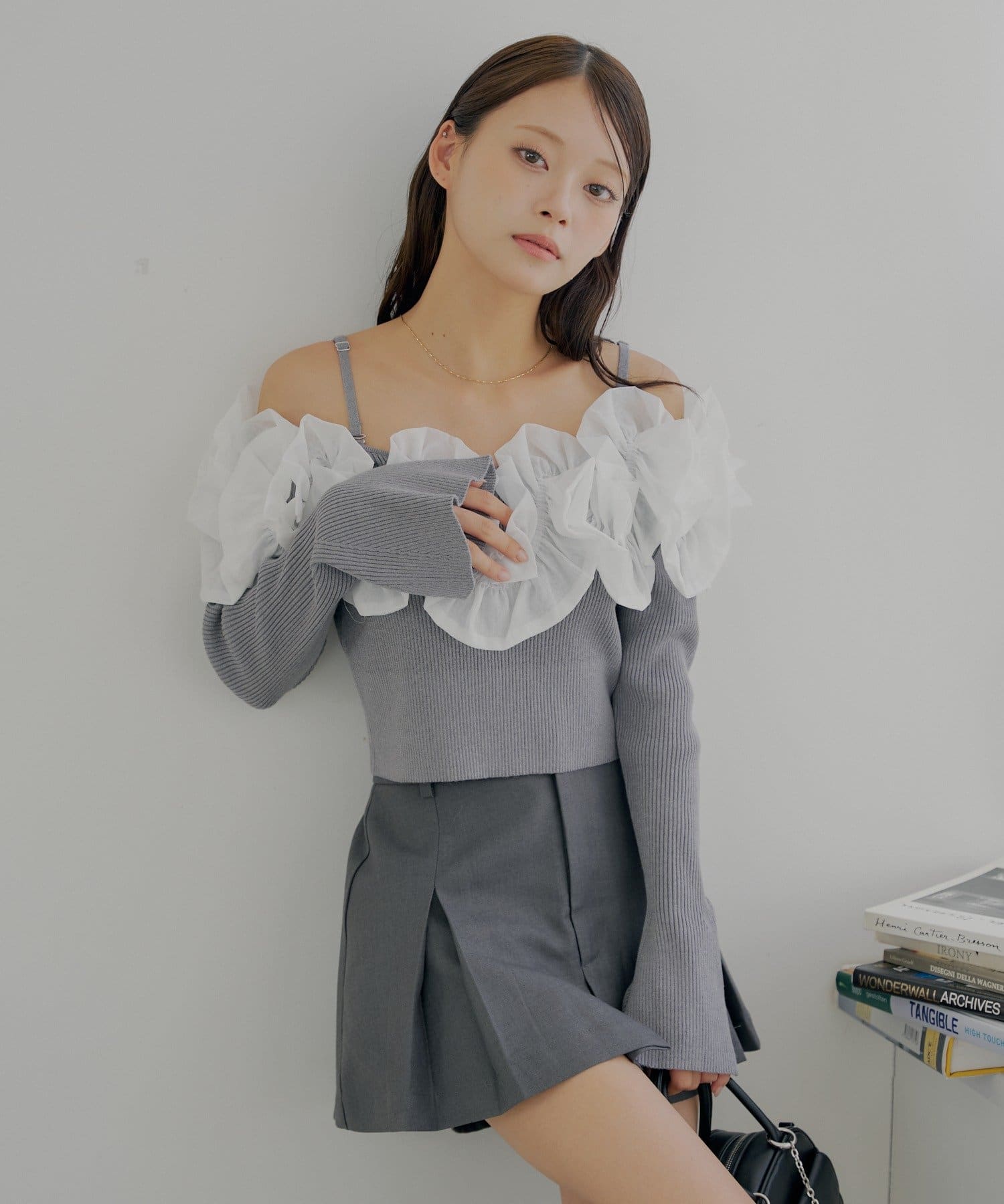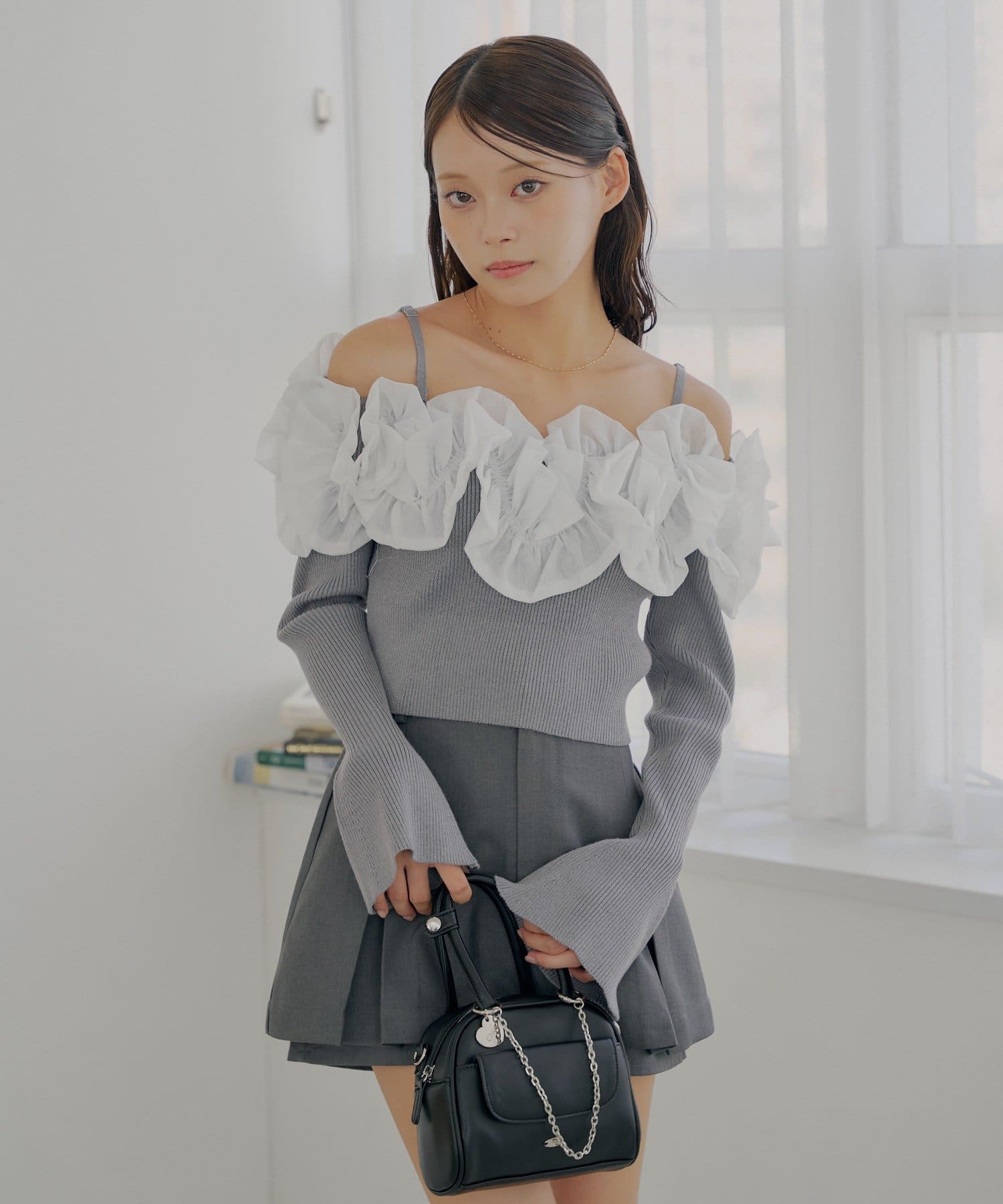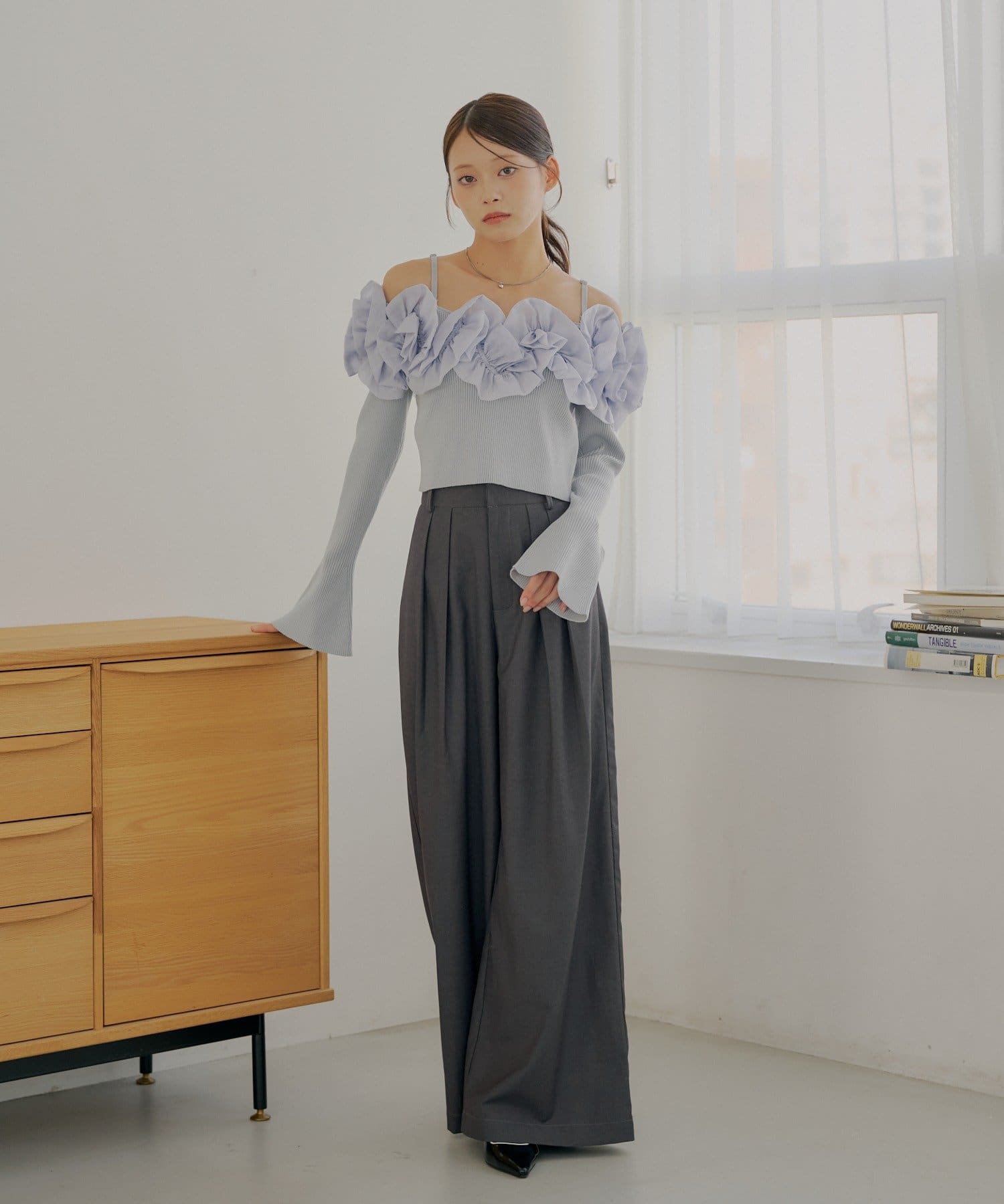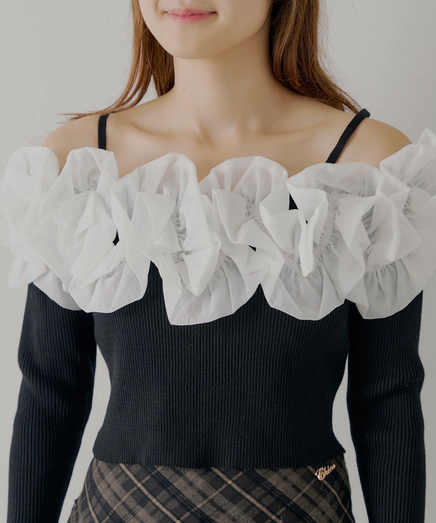 ・すっきりとしたリブニットと、ボリュームのあるフリルとのコントラストが魅力です。