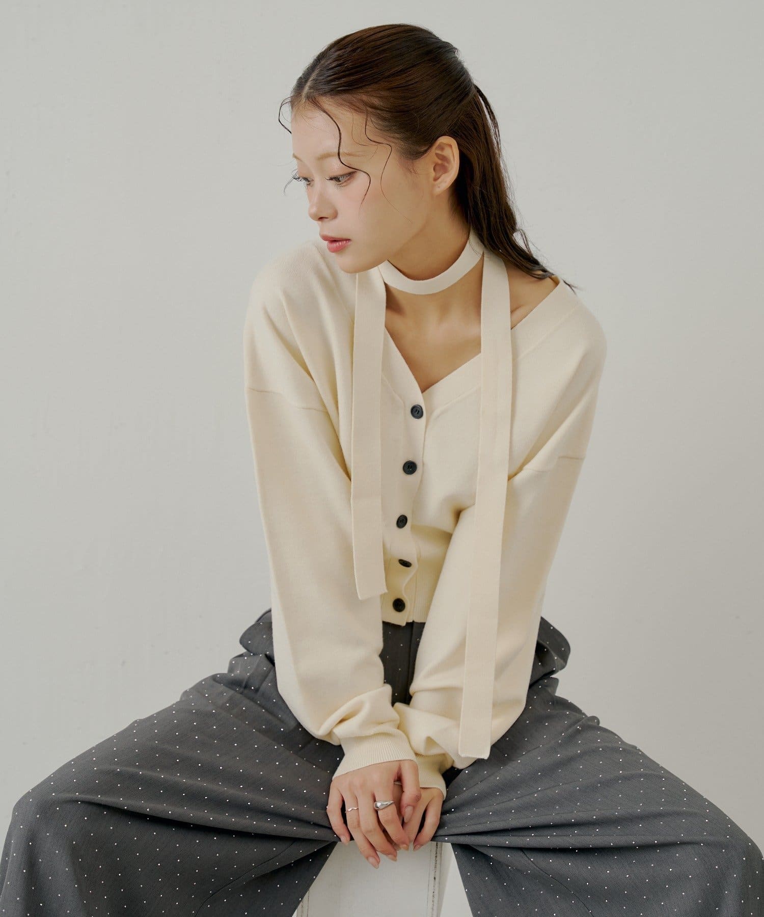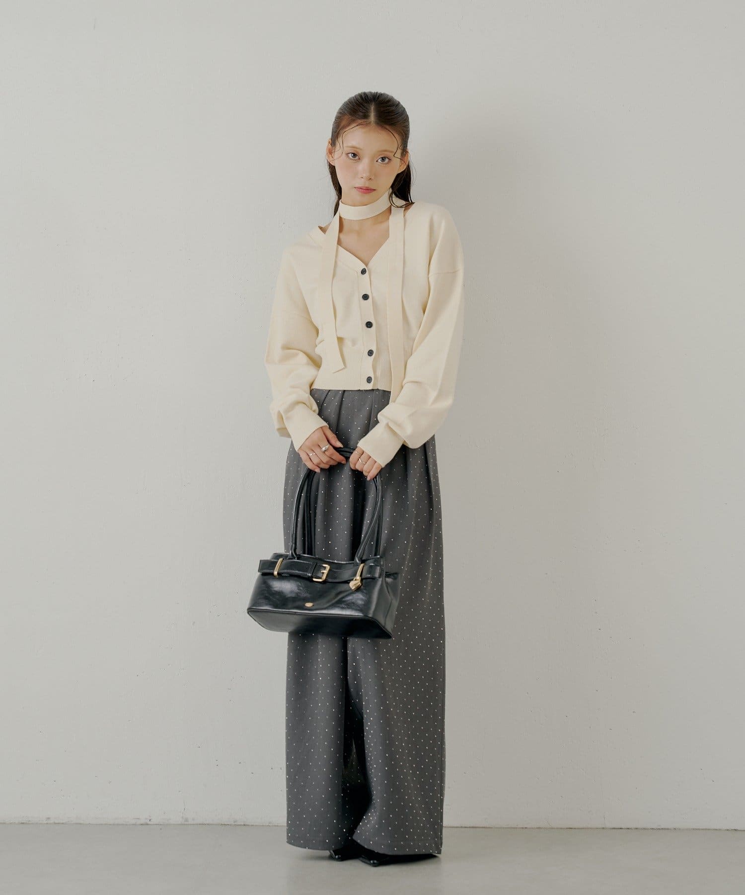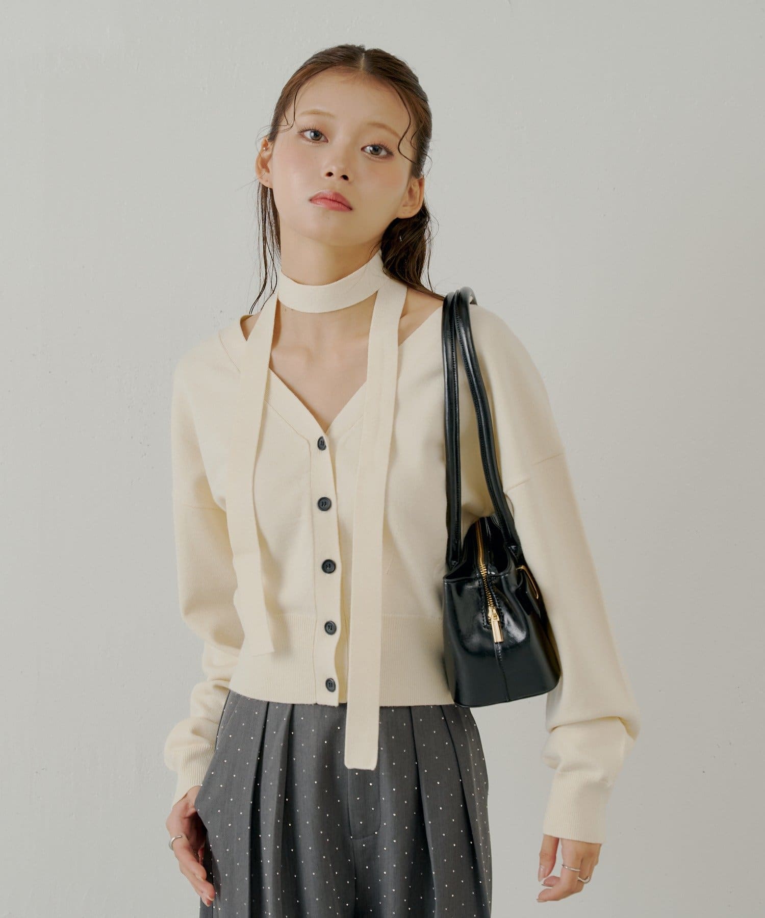 ・取り外し可能なタイは、首元に巻いたり、そのまま垂らしたりと、アレンジ次第で様々な表情を楽しめます。