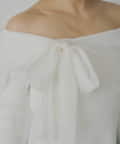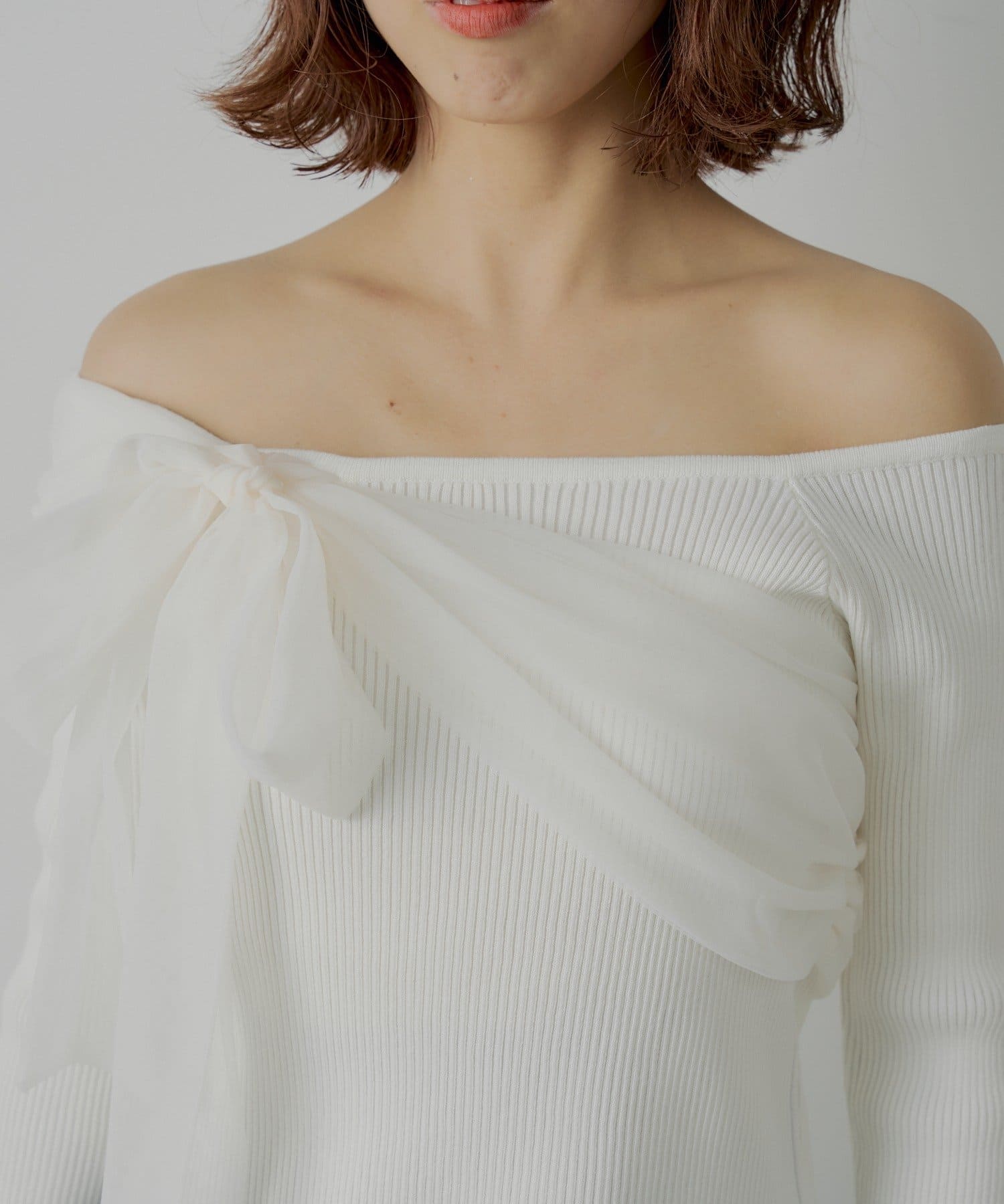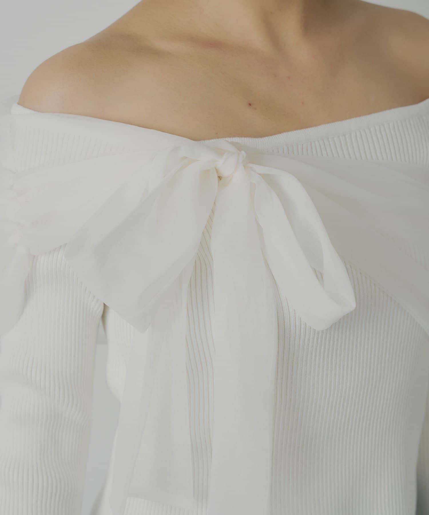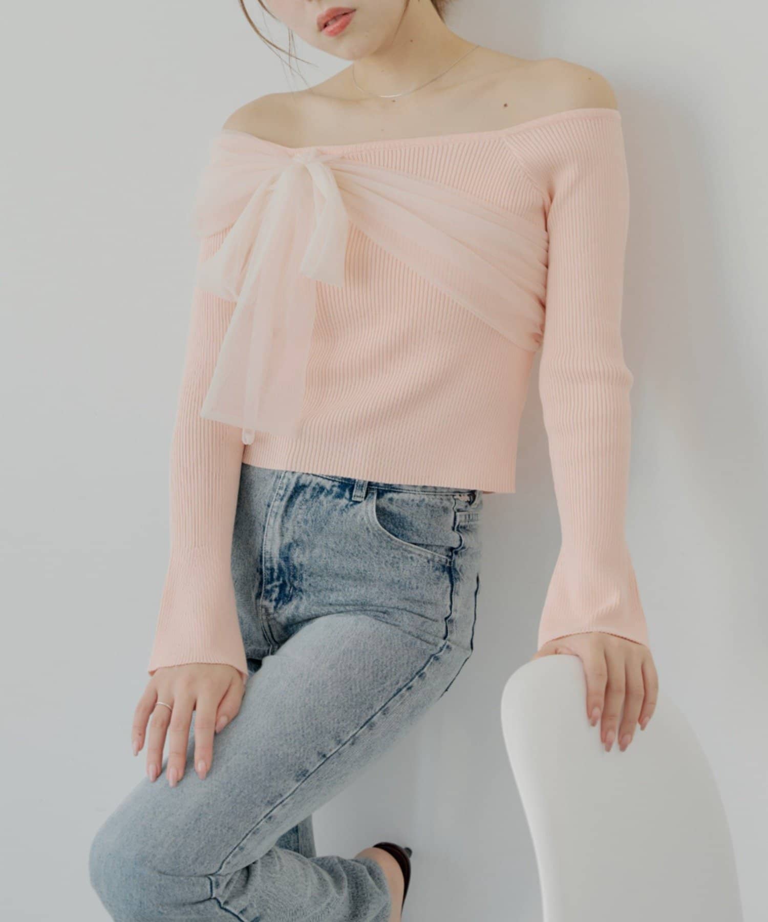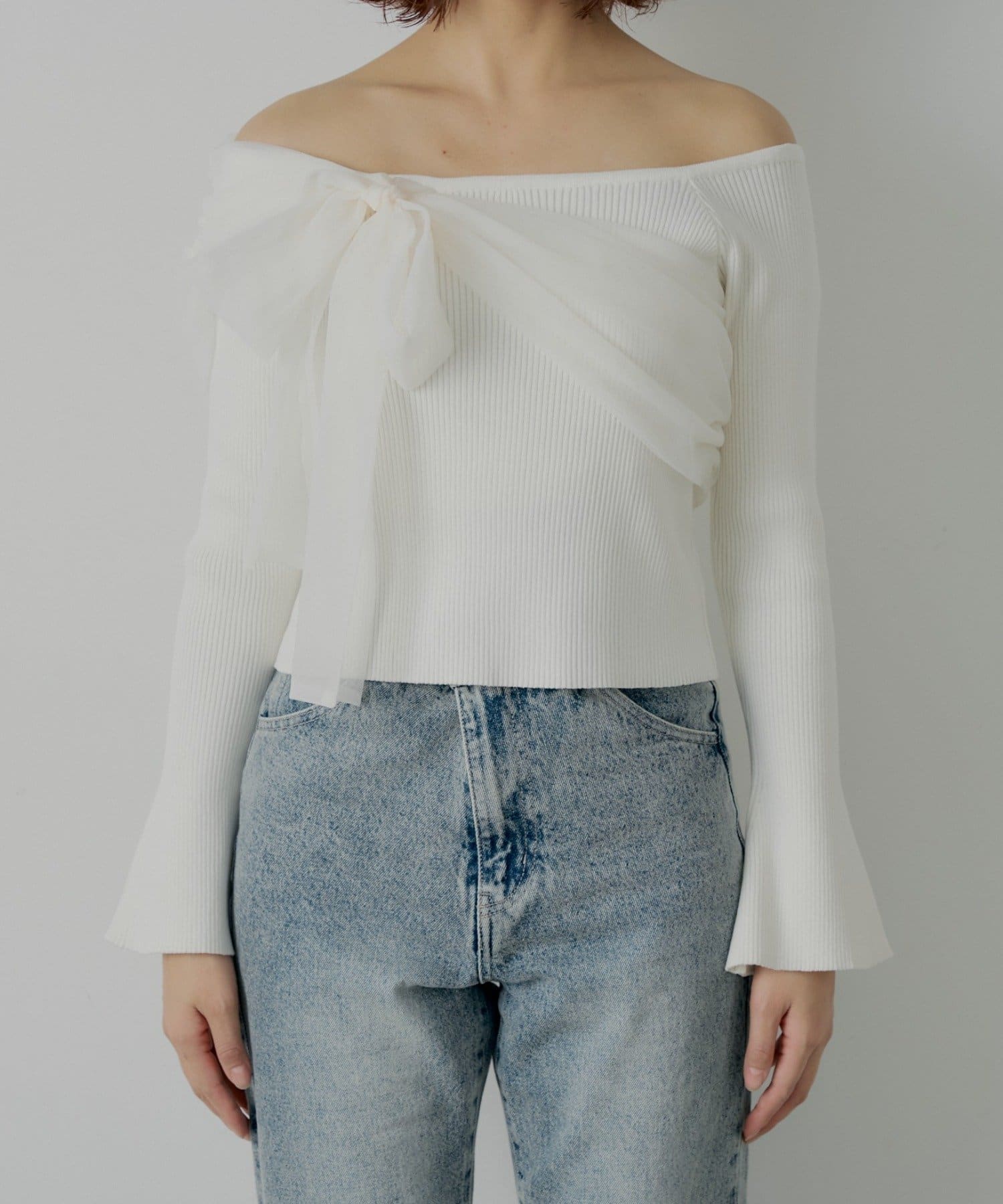 ・目を惹くチュールリボンの程よい透け感と繊細なドレープが、着こなしに華やかさをプラス。