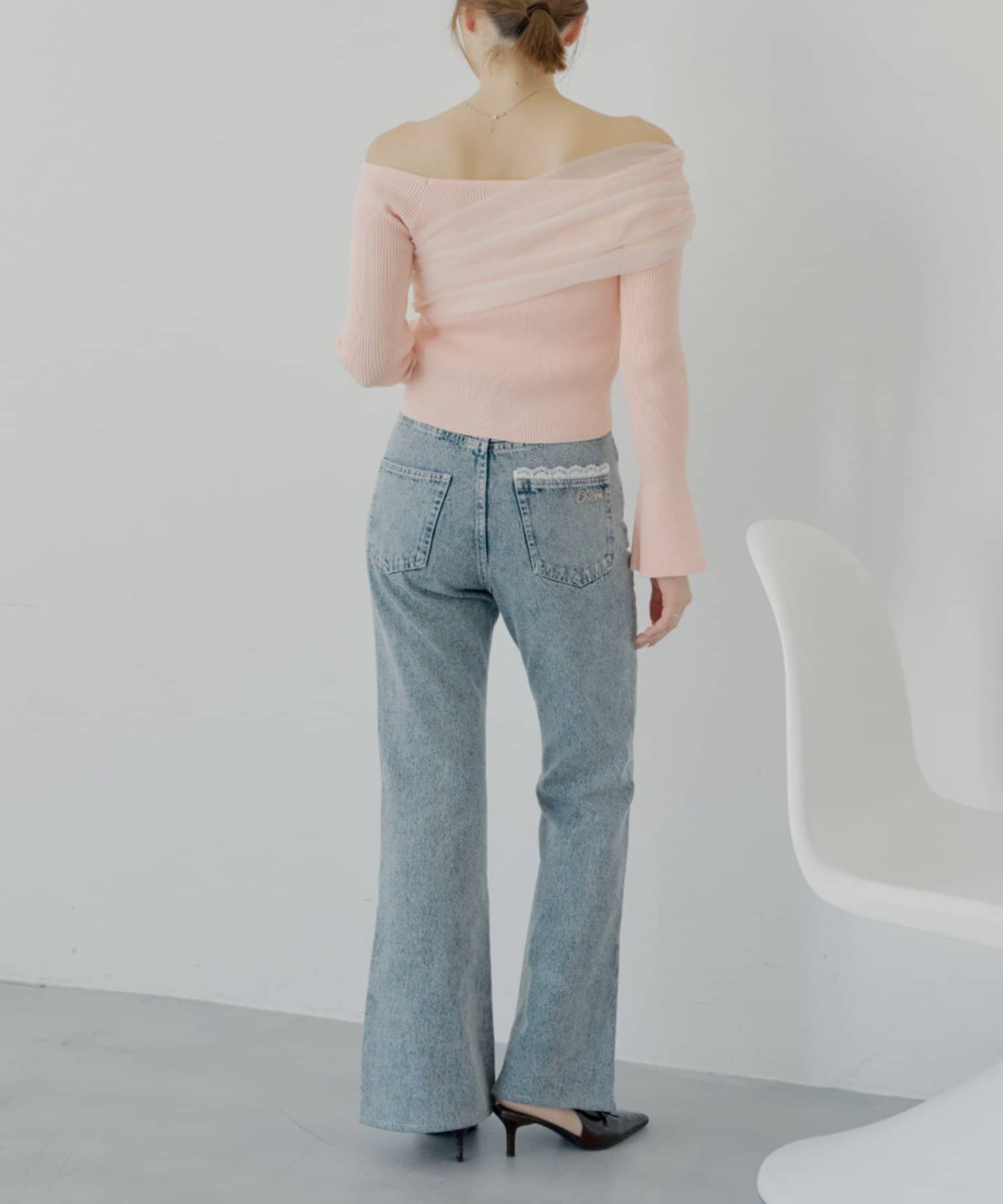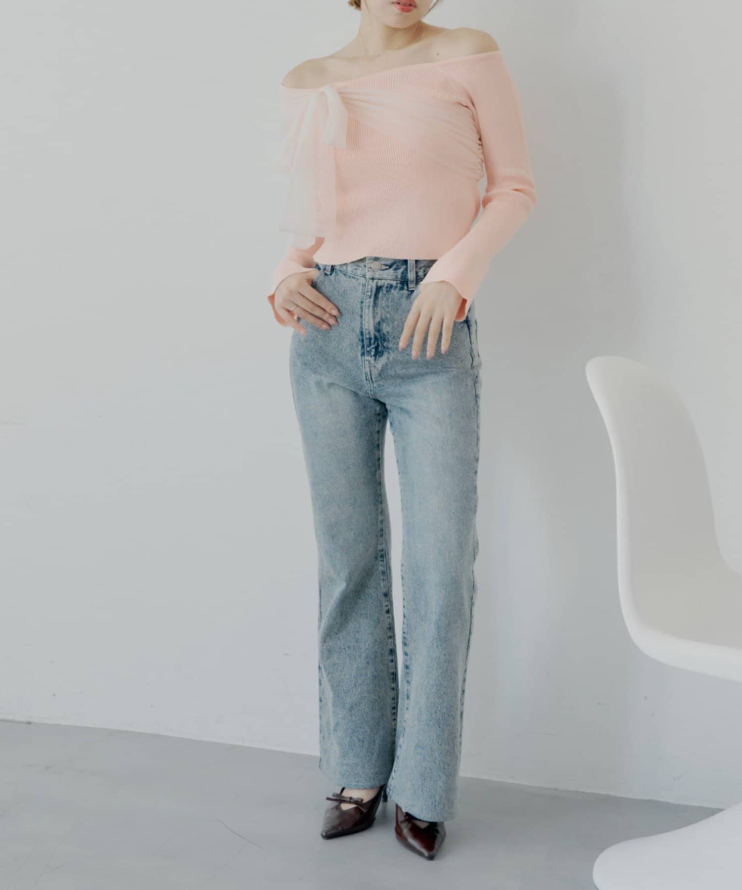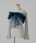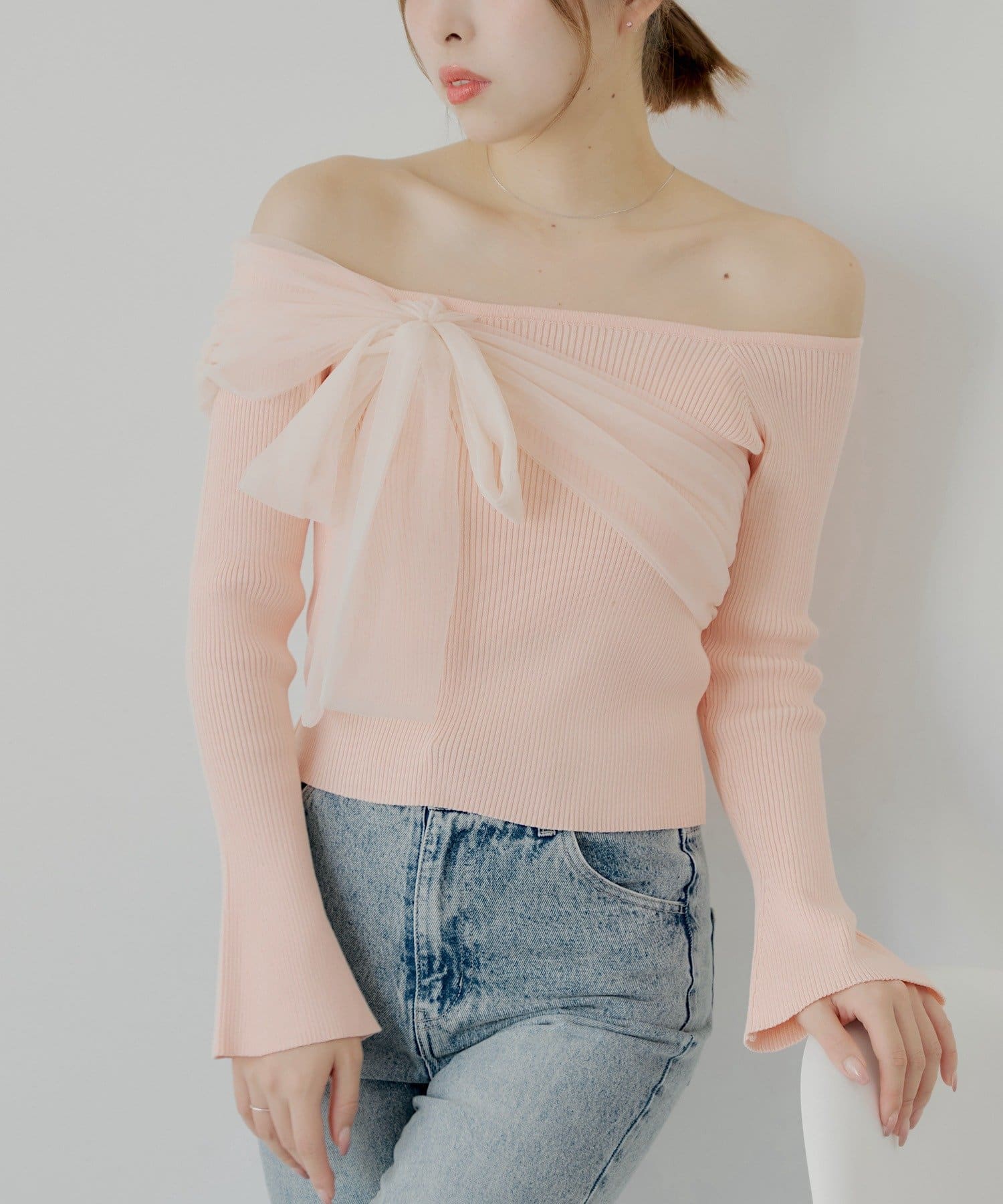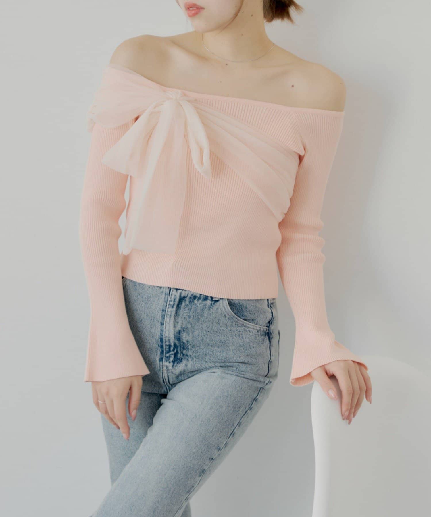 ・目を惹くチュールリボンの程よい透け感と繊細なドレープが、着こなしに華やかさをプラス。