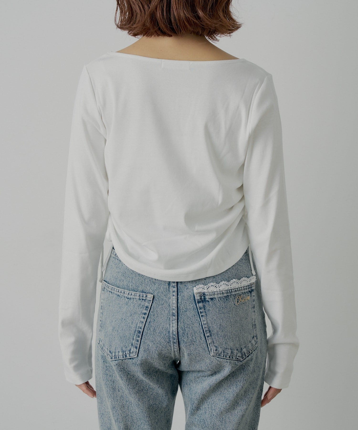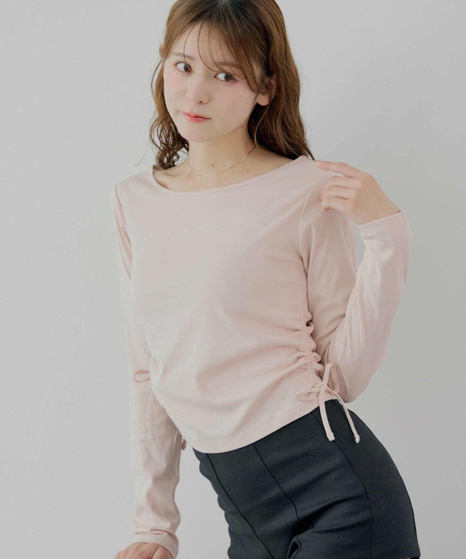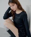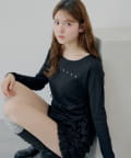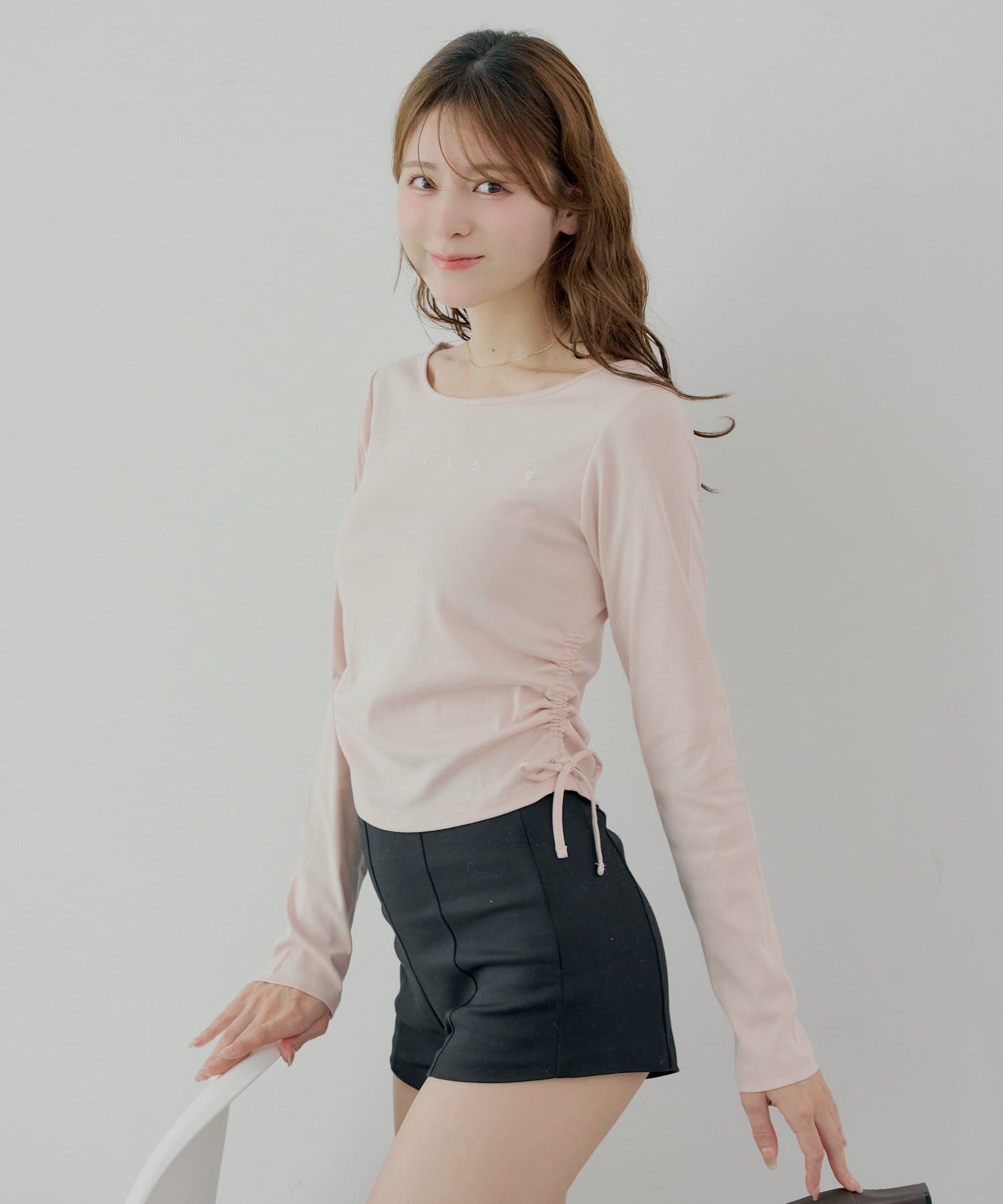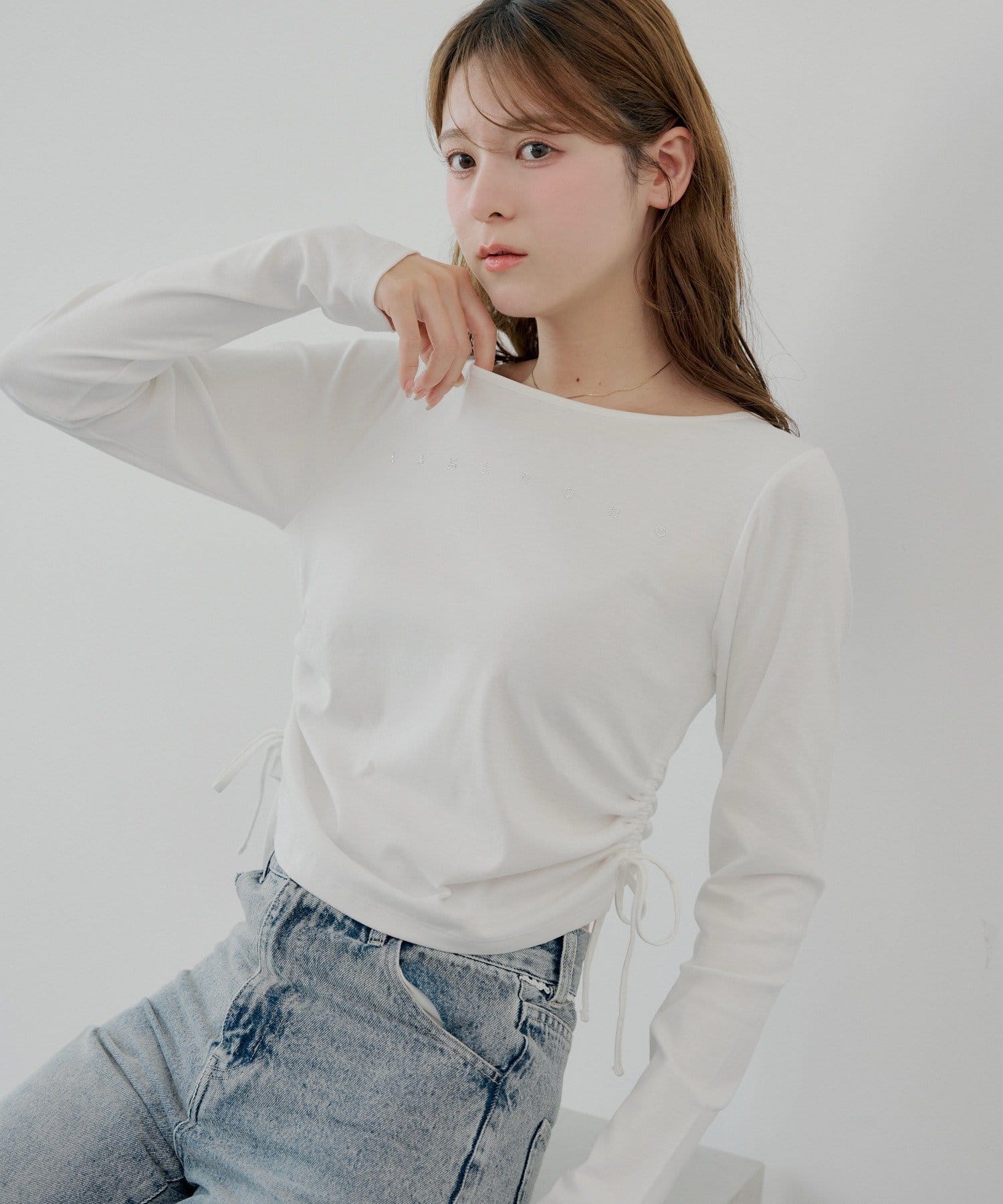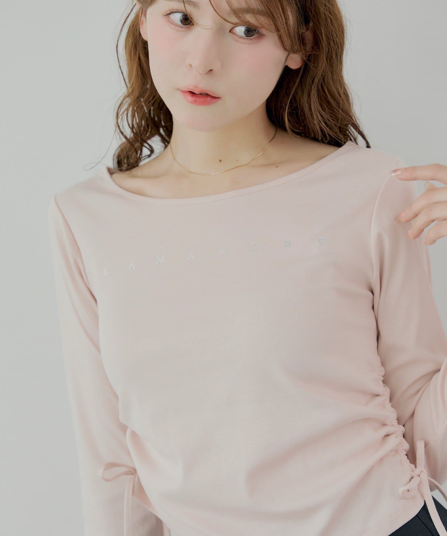 ・胸元にあしらわれたラインストーンが目を惹くロゴロンT。