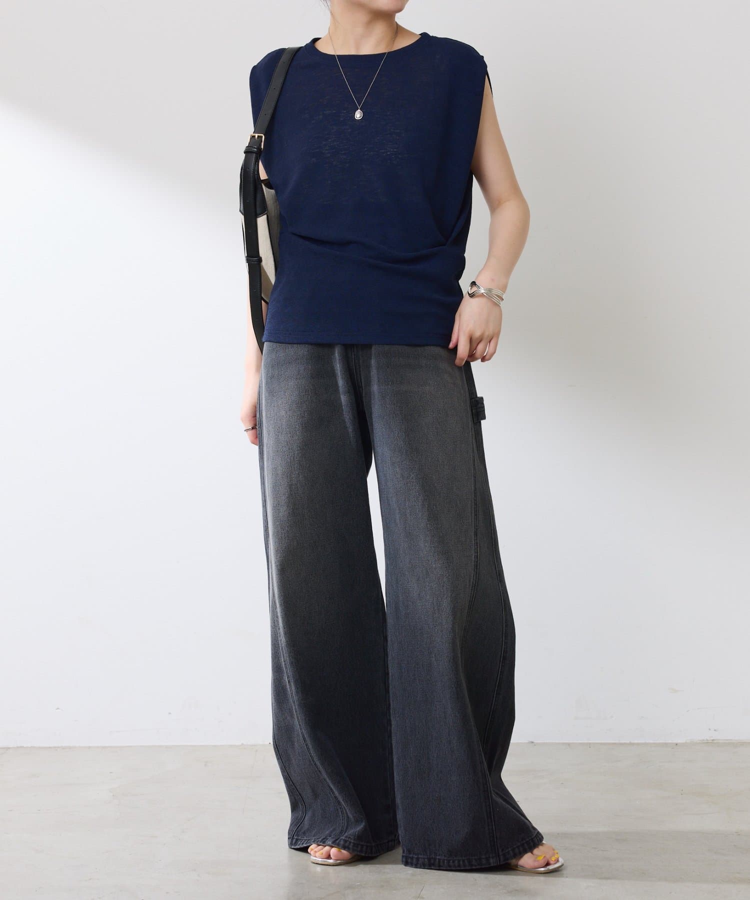 夏場はコンパクトなタンクトップやベストを合わせたヘルシーな着こなしもおすすめです。