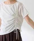 サイドのシャーリングでシルエットを引き締められるデザインTシャツ