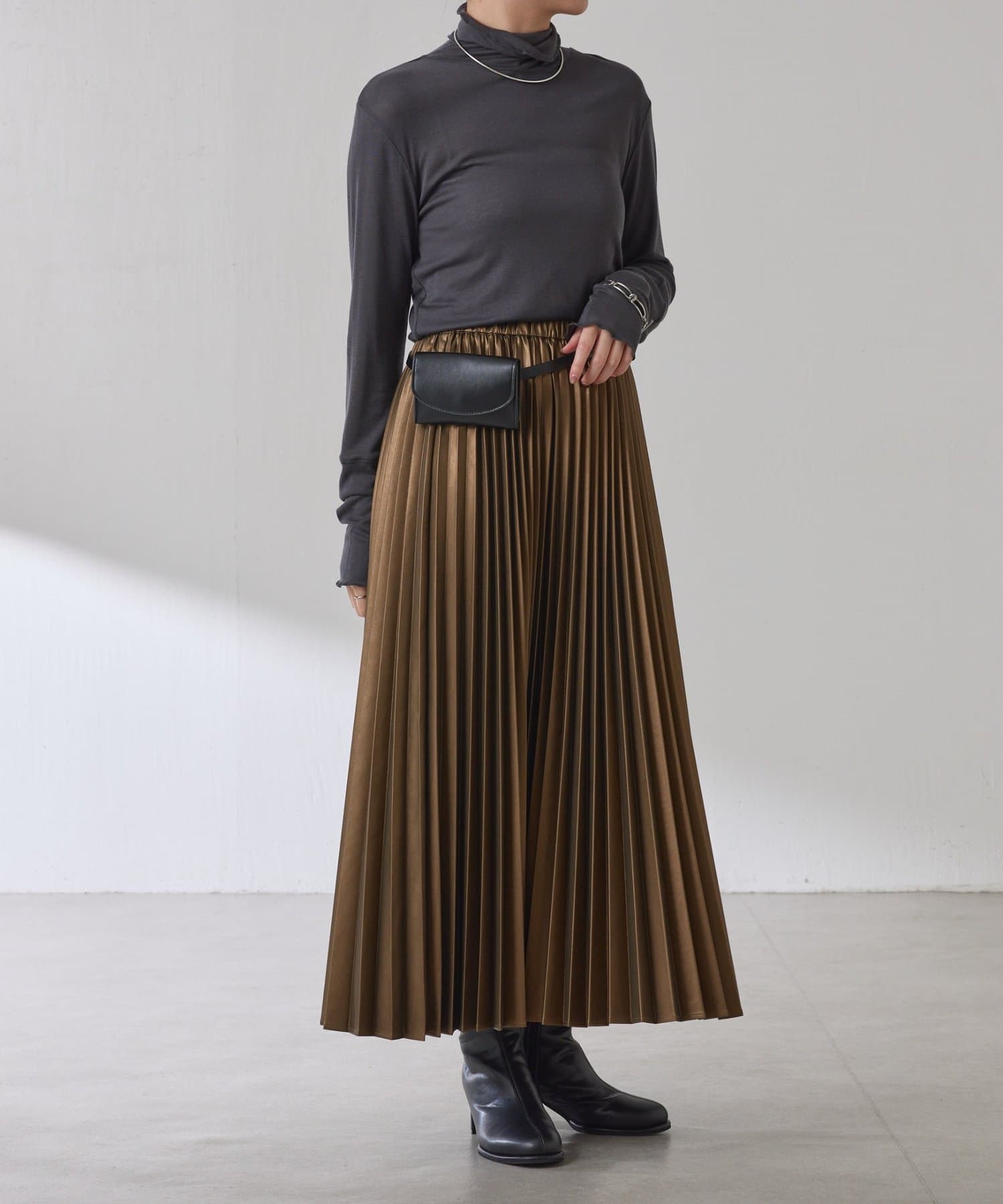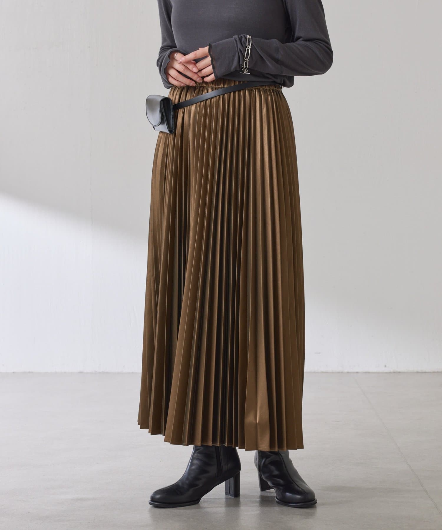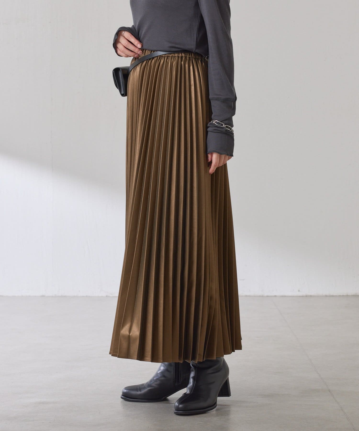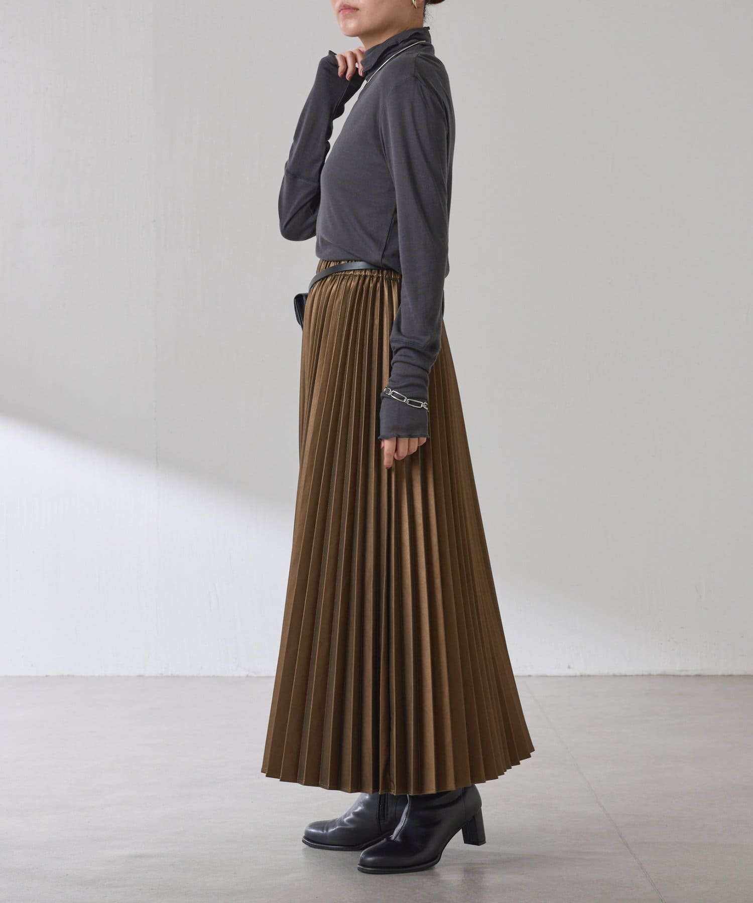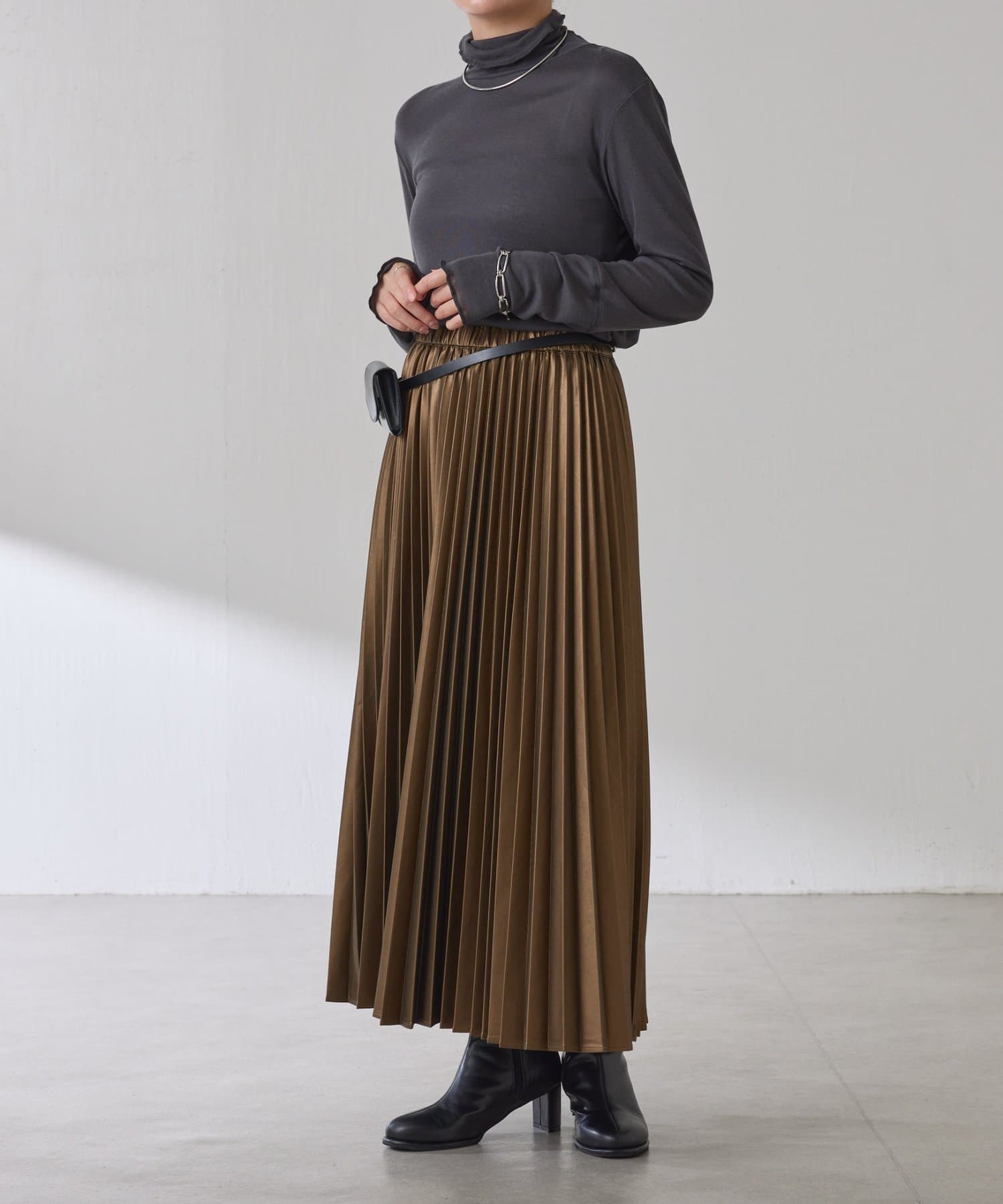 ・甘くなりがちなプリーツをスタイリッシュな印象に仕上げました。