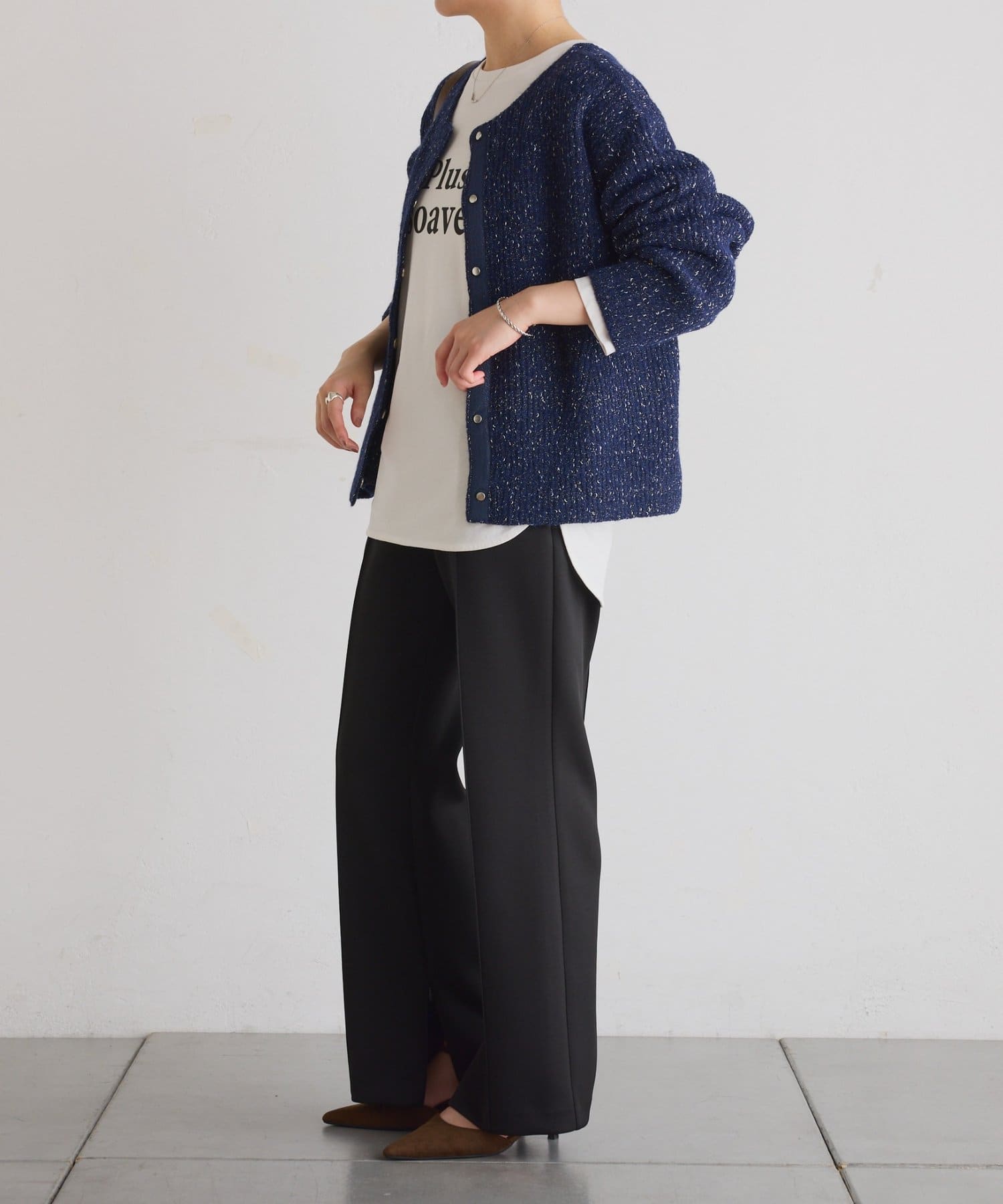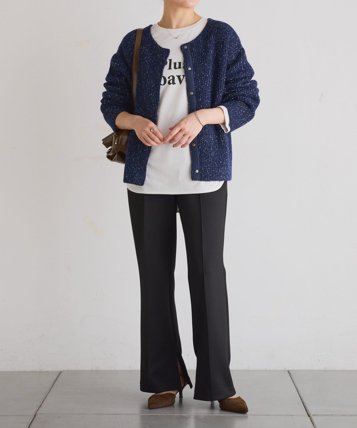 ・着丈が長めのトップスやレイヤードスタイルと合わせてもすっきりとバランス良く着られるようこだわりました。