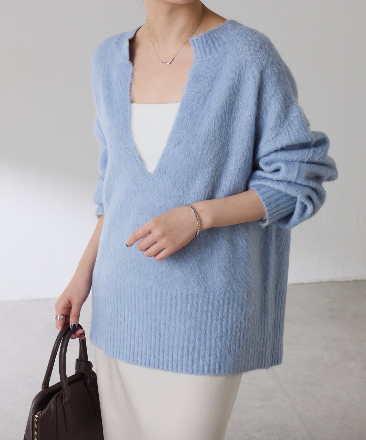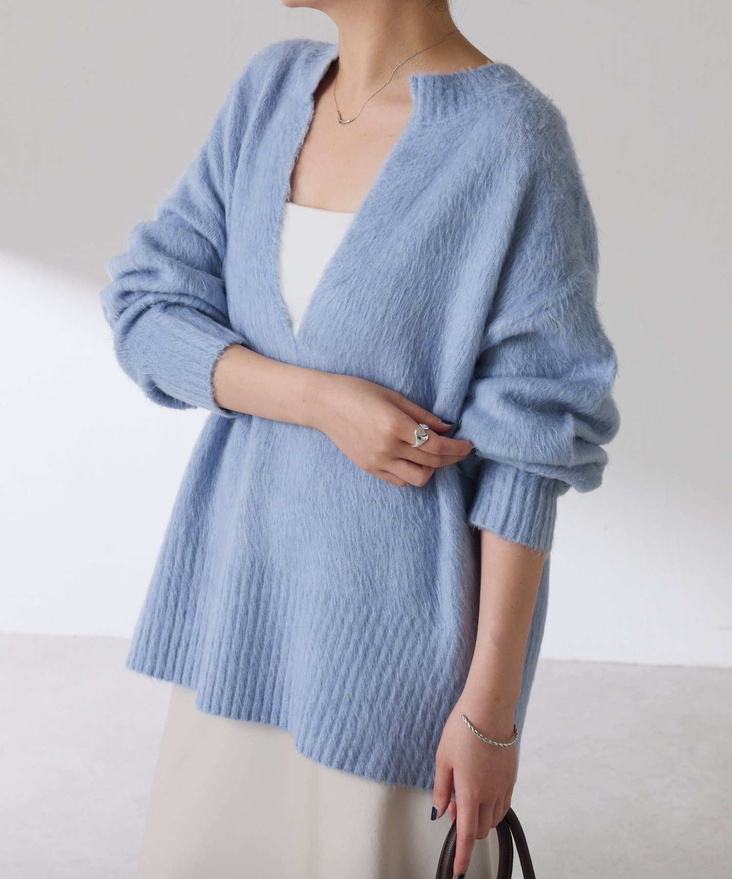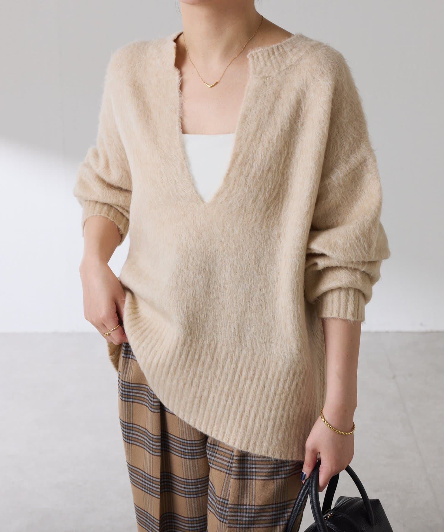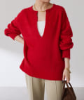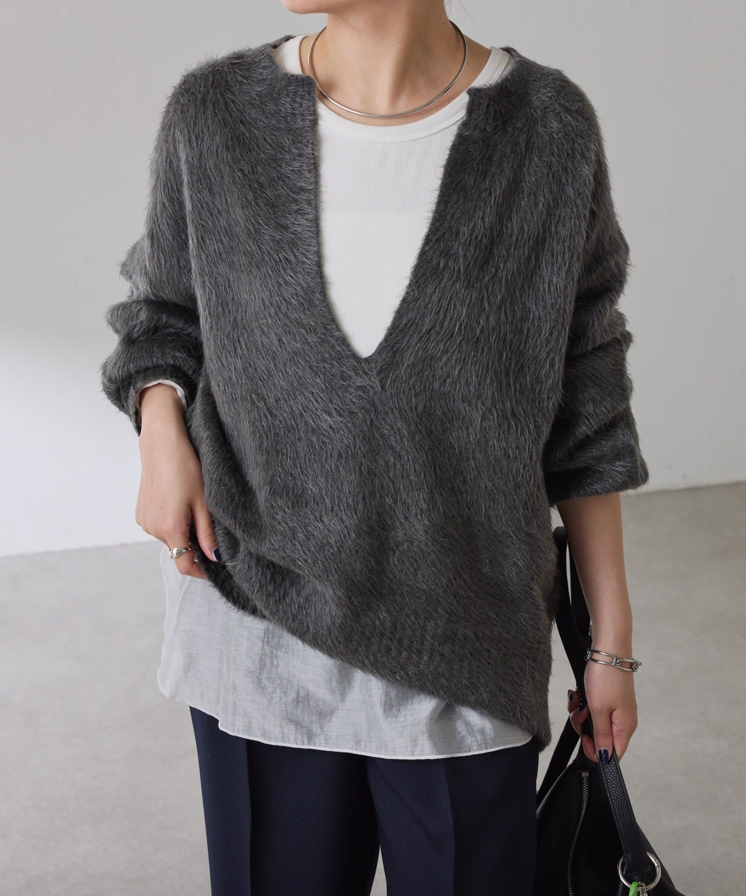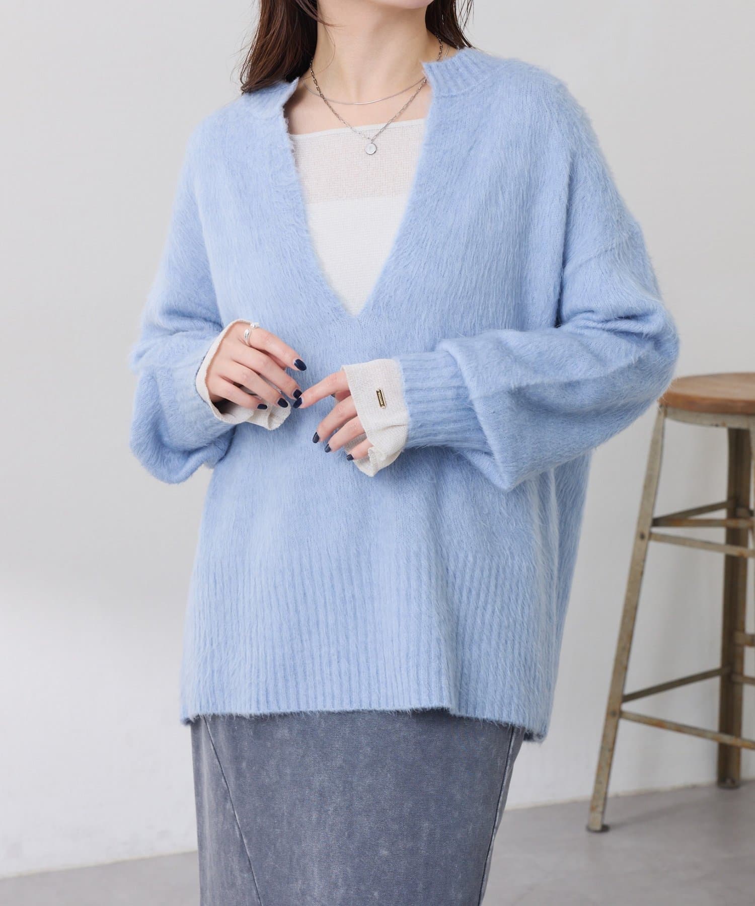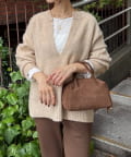 ・とにかく軽いエアリーな糸を使用した深Vニット。着ぶくれ感もなく、ストレスフリーな着心地です。