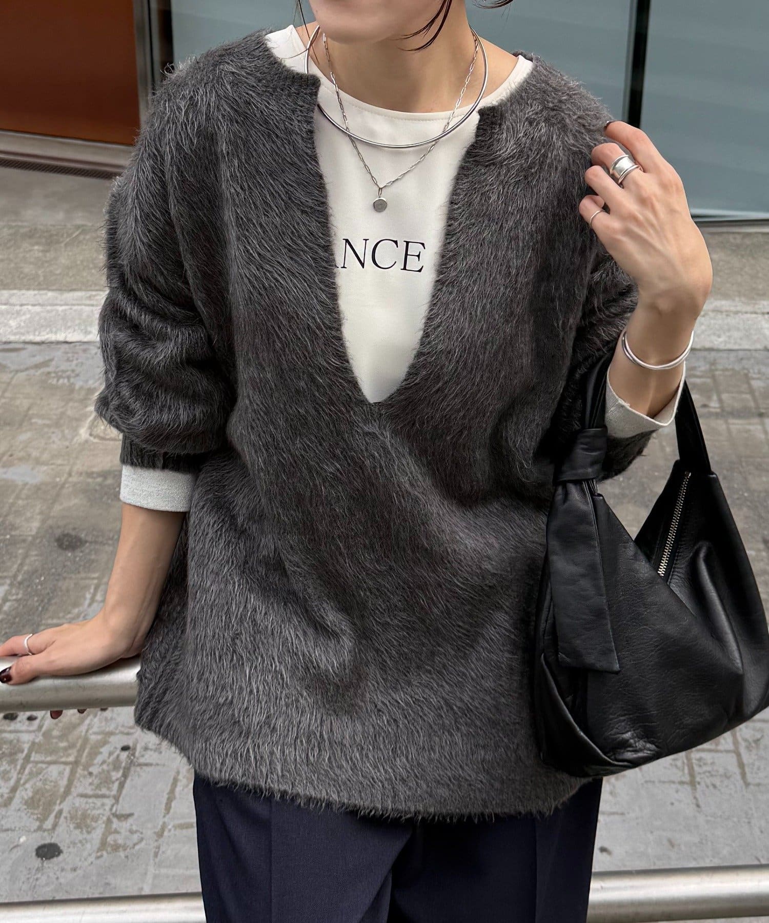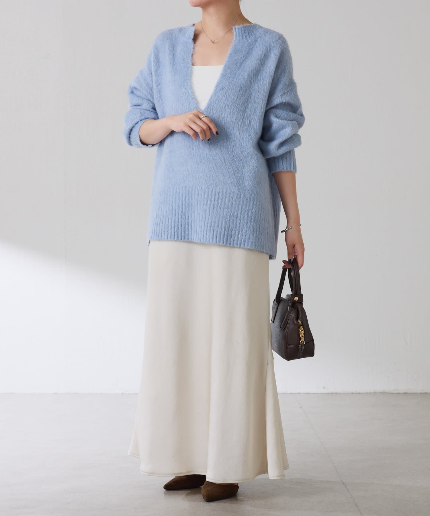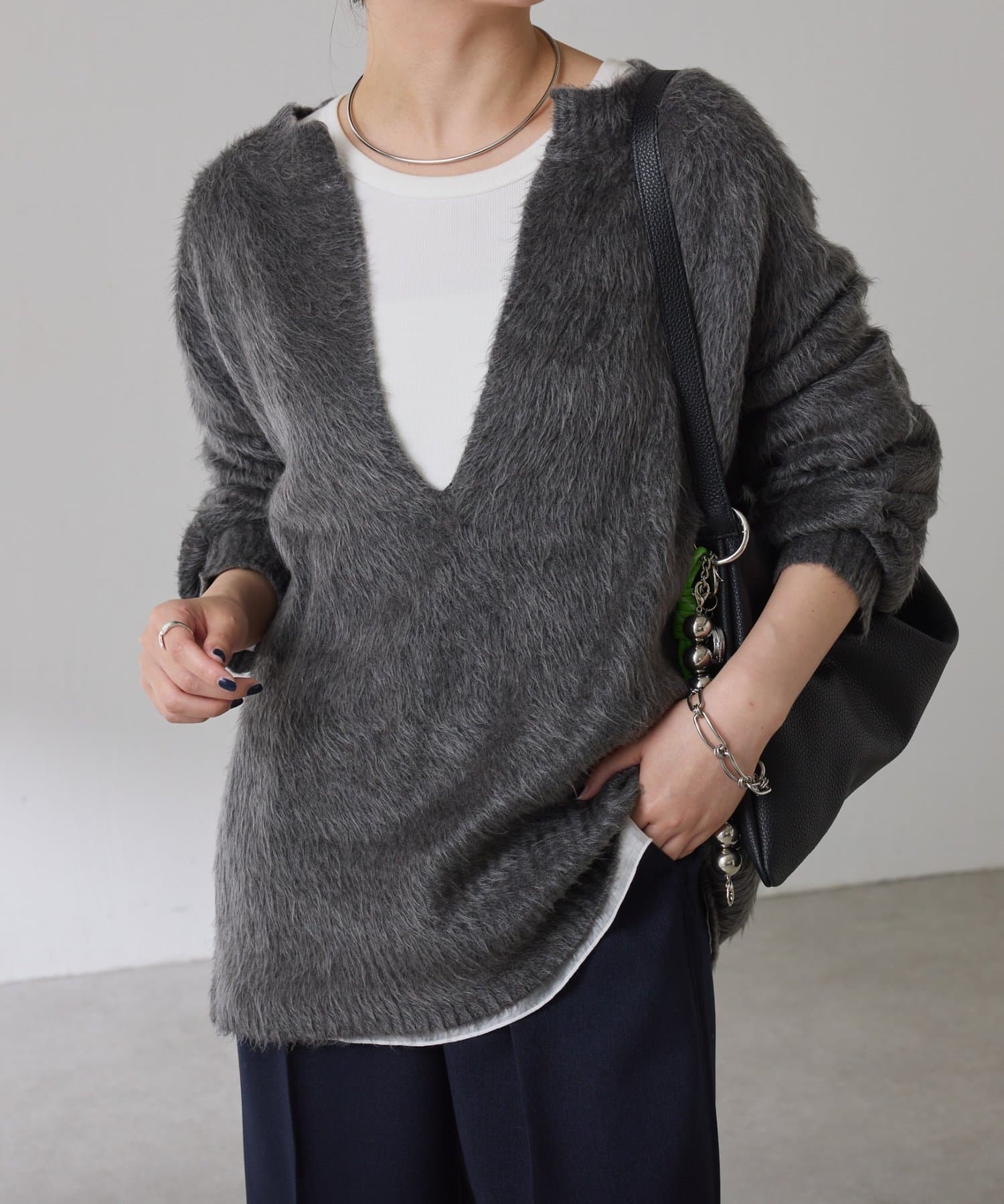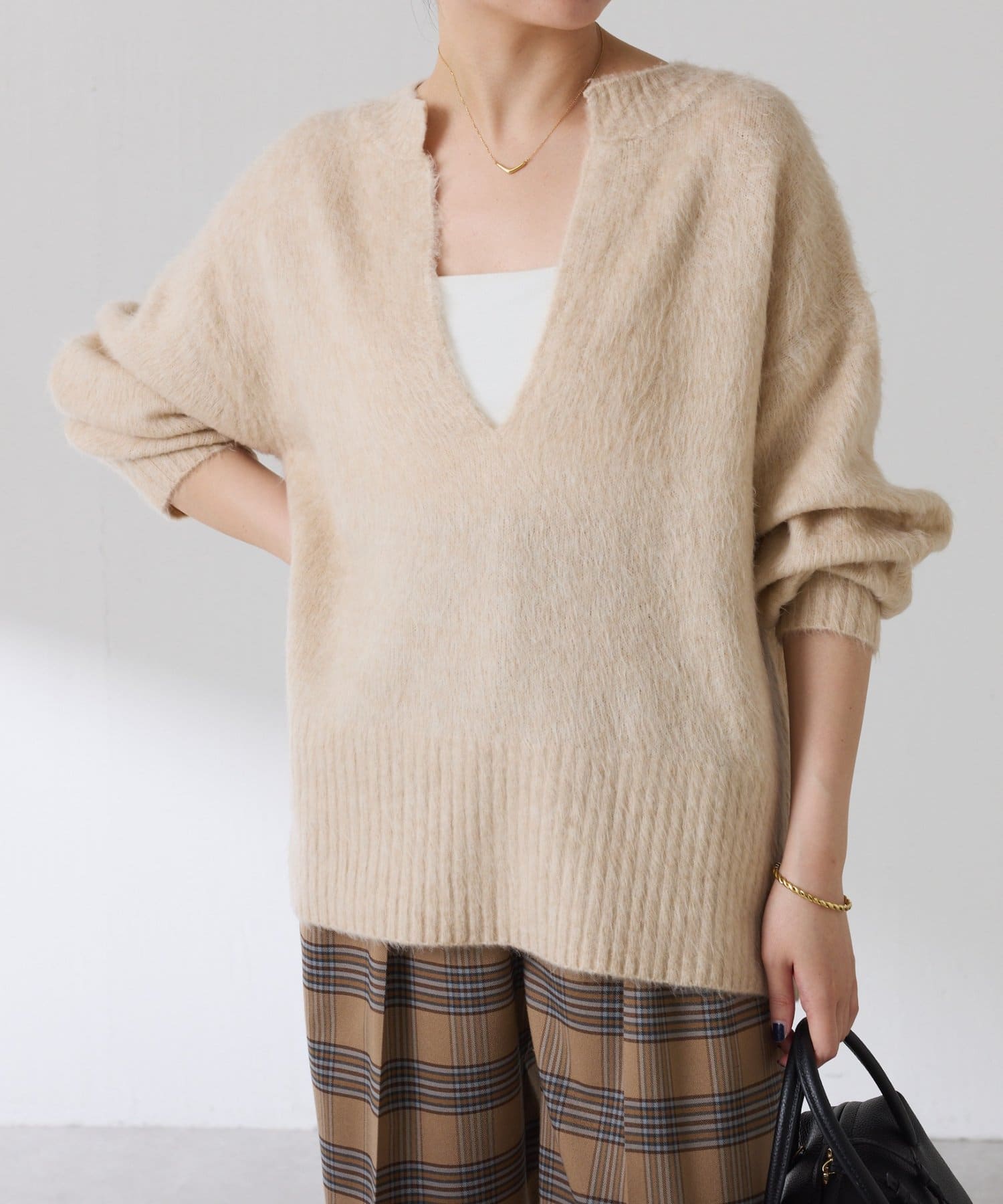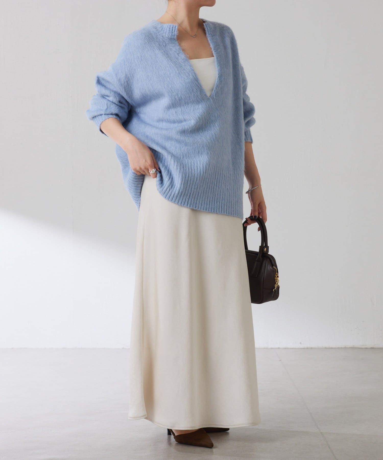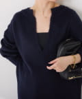 ・とにかく軽いエアリーな糸を使用した深Vニット。着ぶくれ感もなく、ストレスフリーな着心地です。