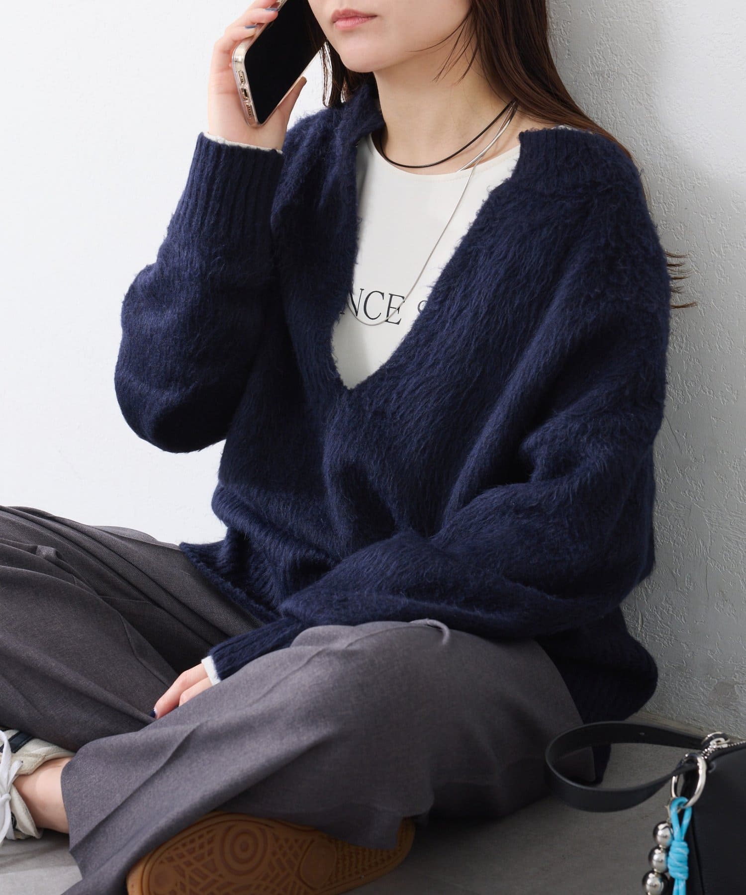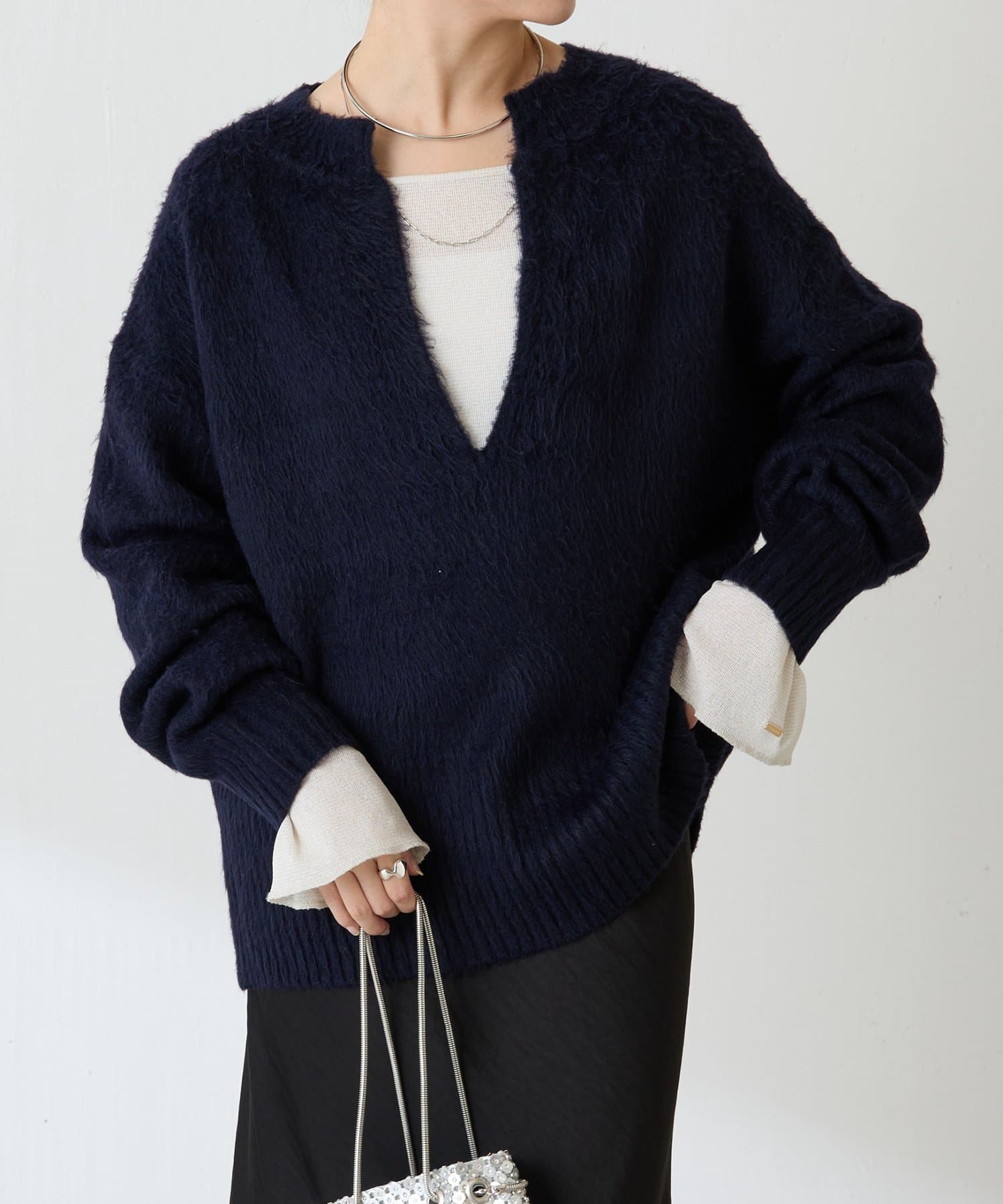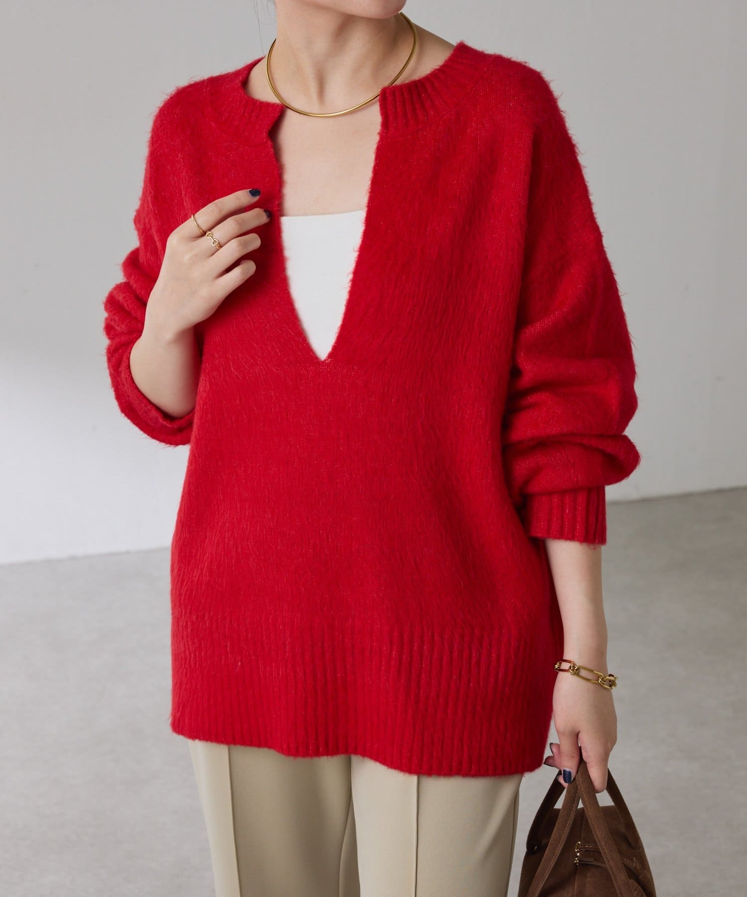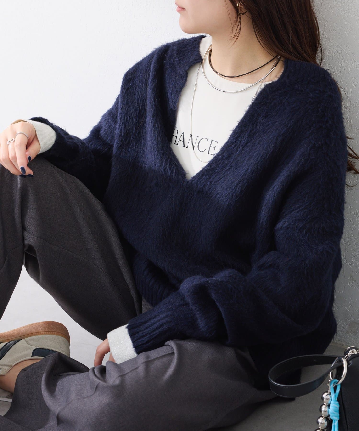 ・とにかく軽いエアリーな糸を使用した深Vニット。着ぶくれ感もなく、ストレスフリーな着心地です。