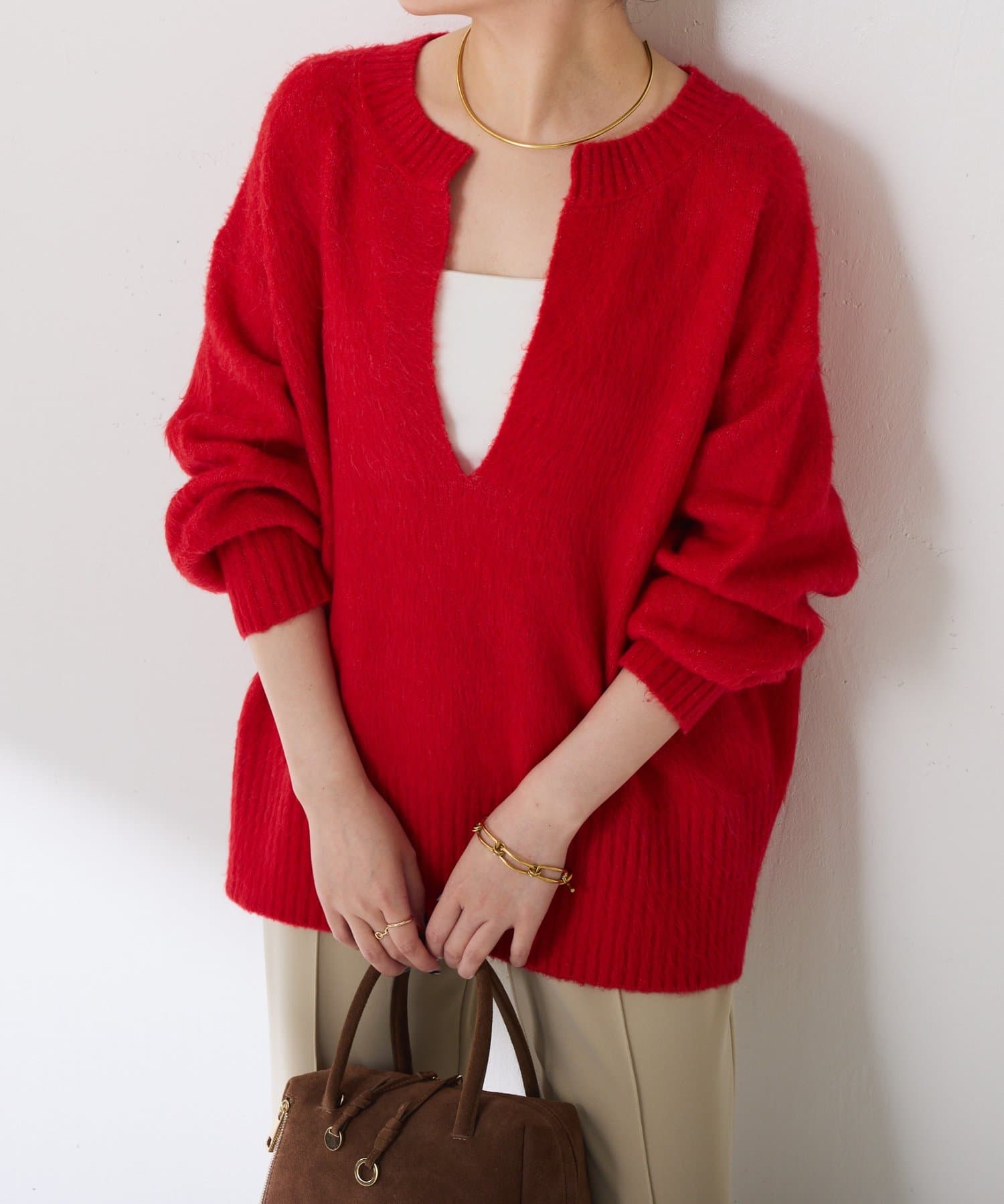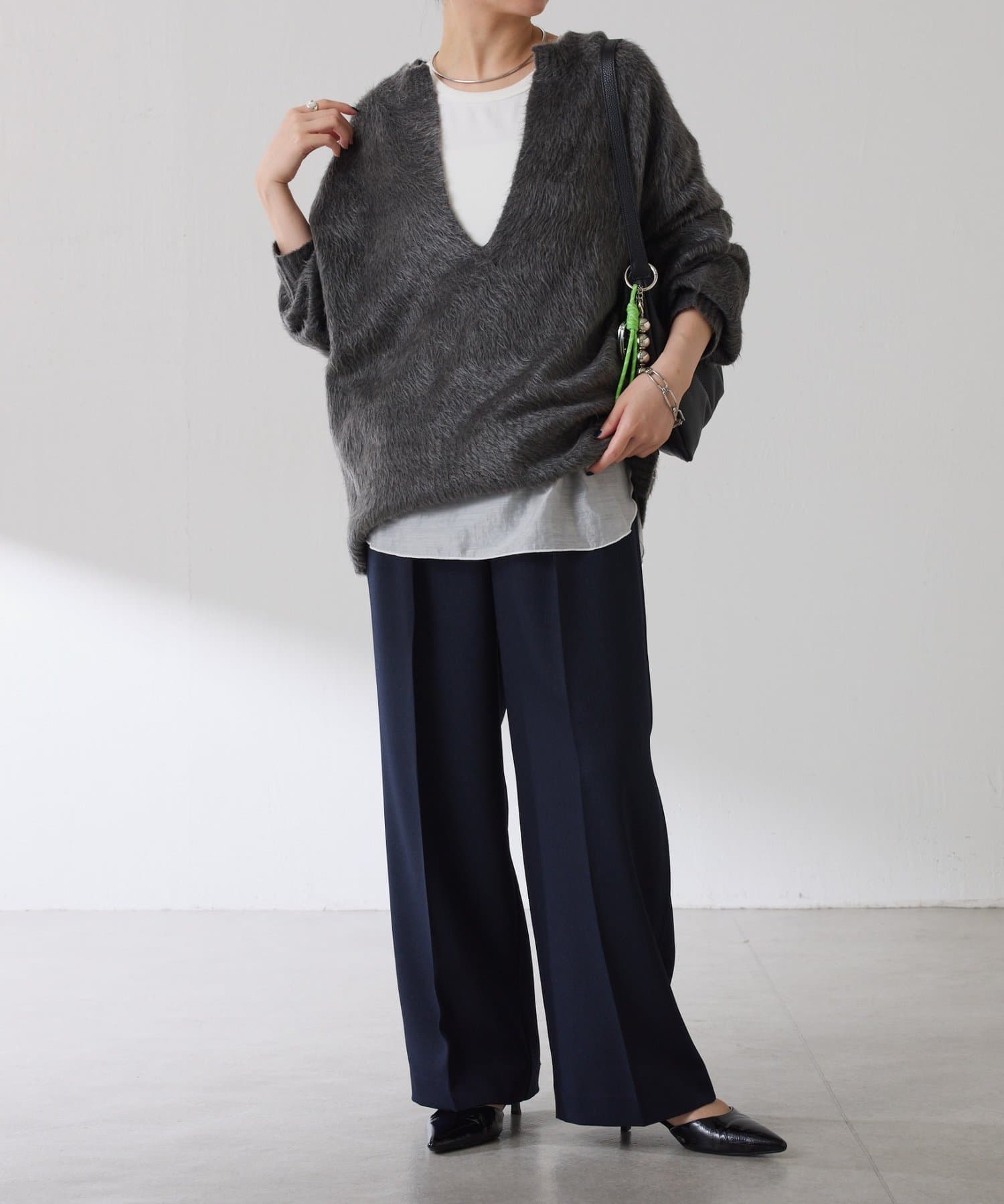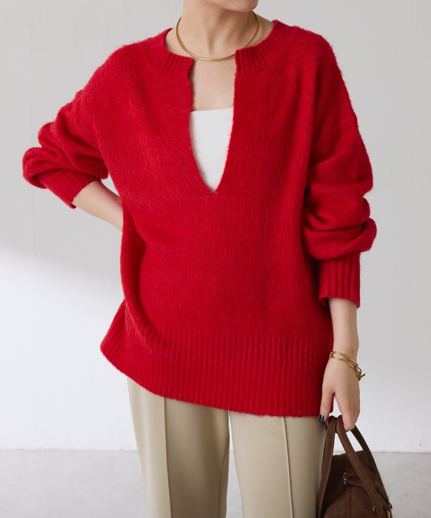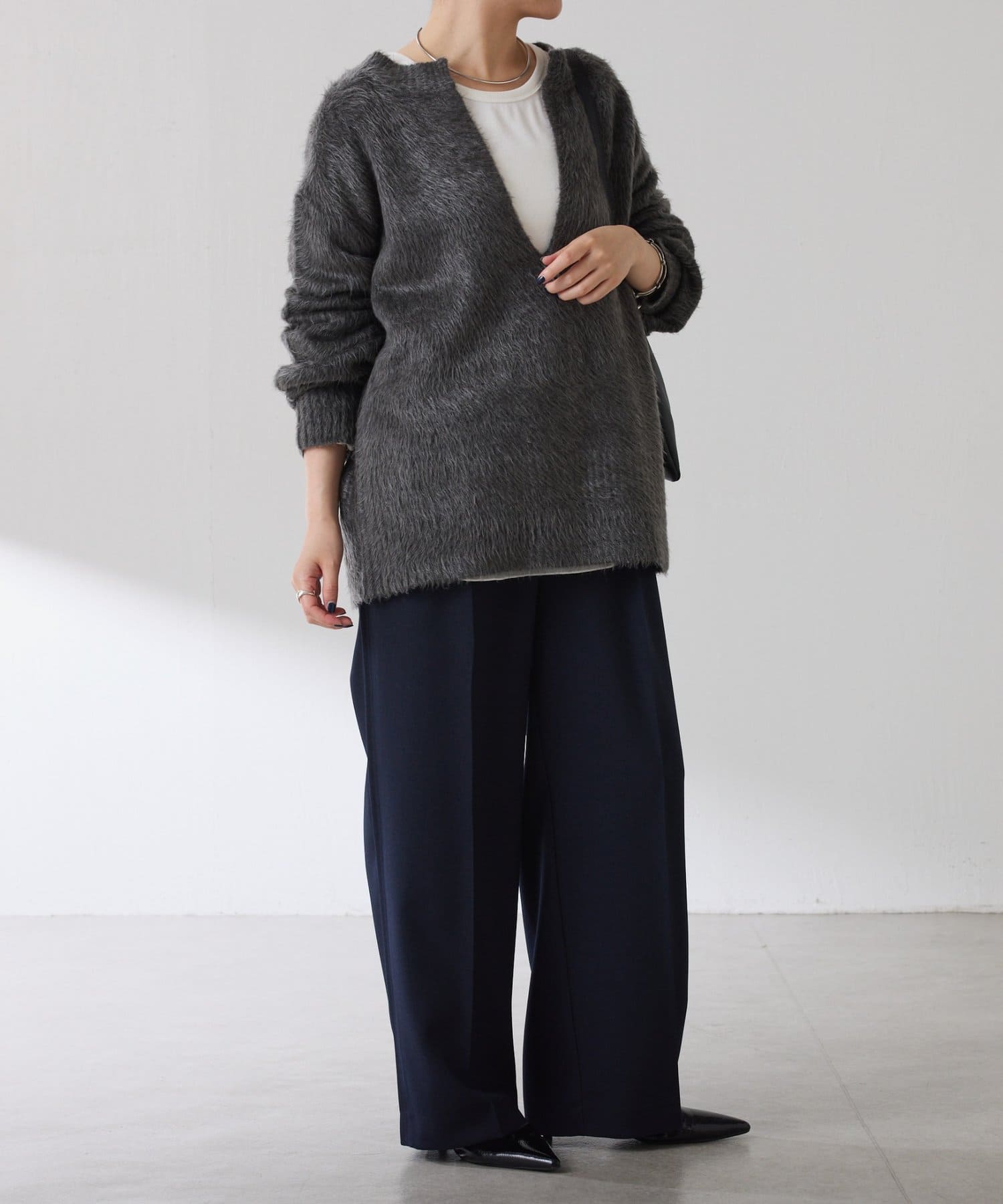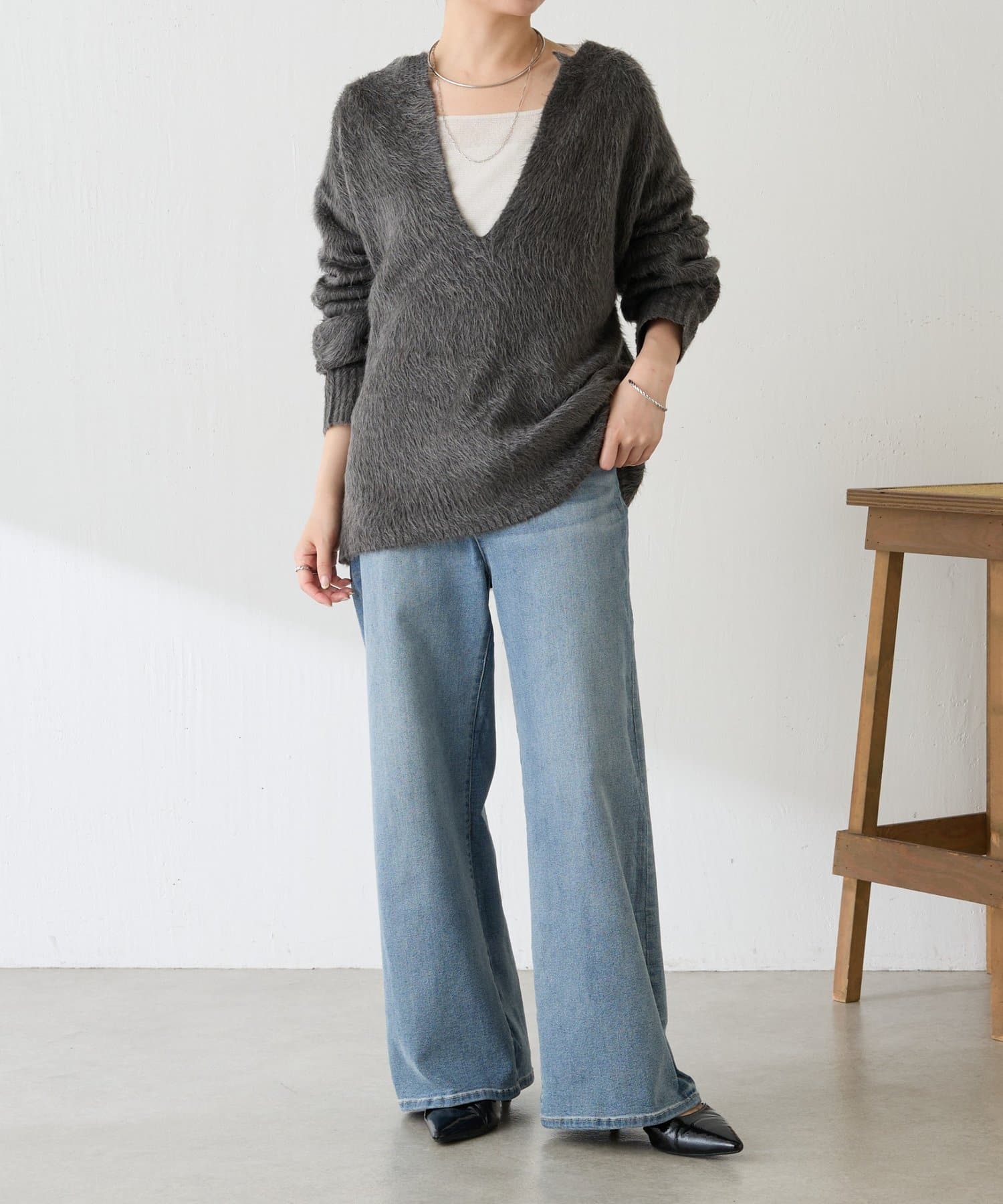 ・とにかく軽いエアリーな糸を使用した深Vニット。着ぶくれ感もなく、ストレスフリーな着心地です。