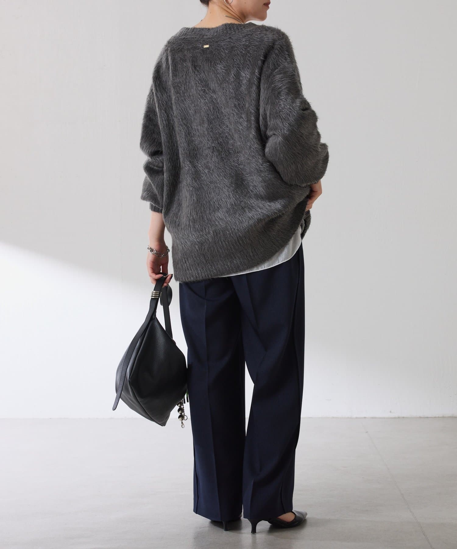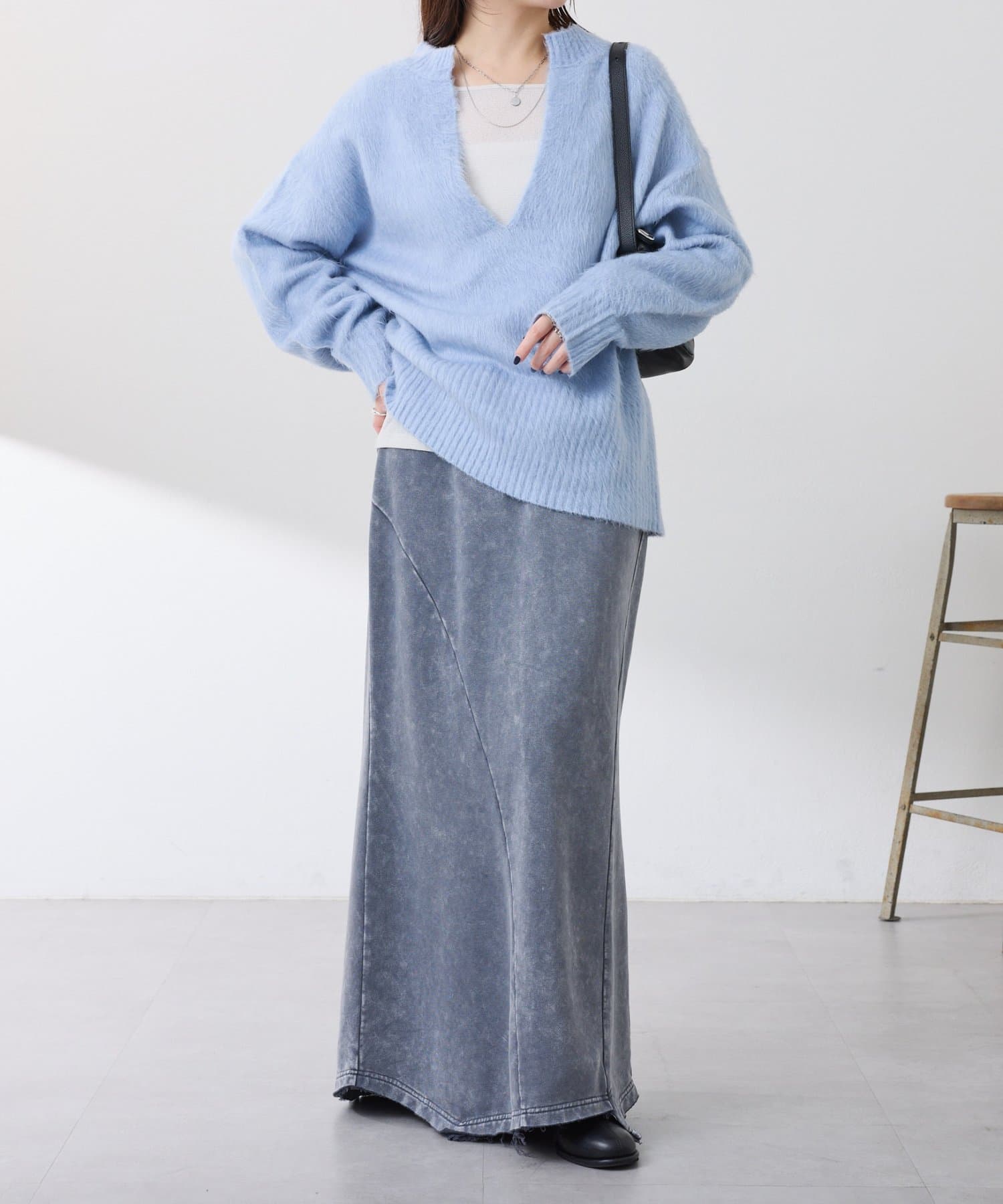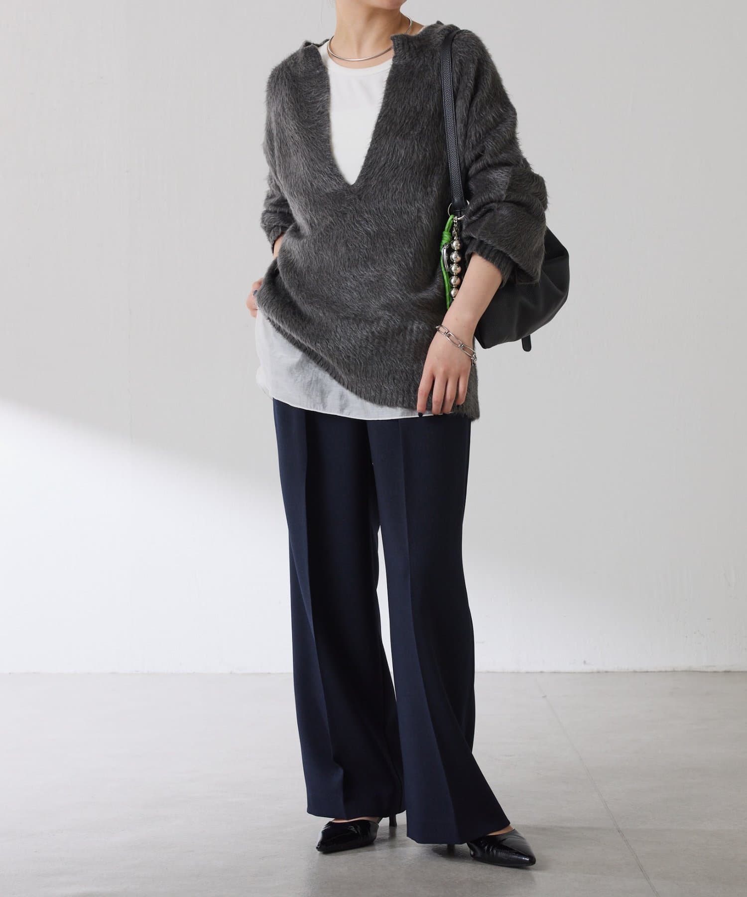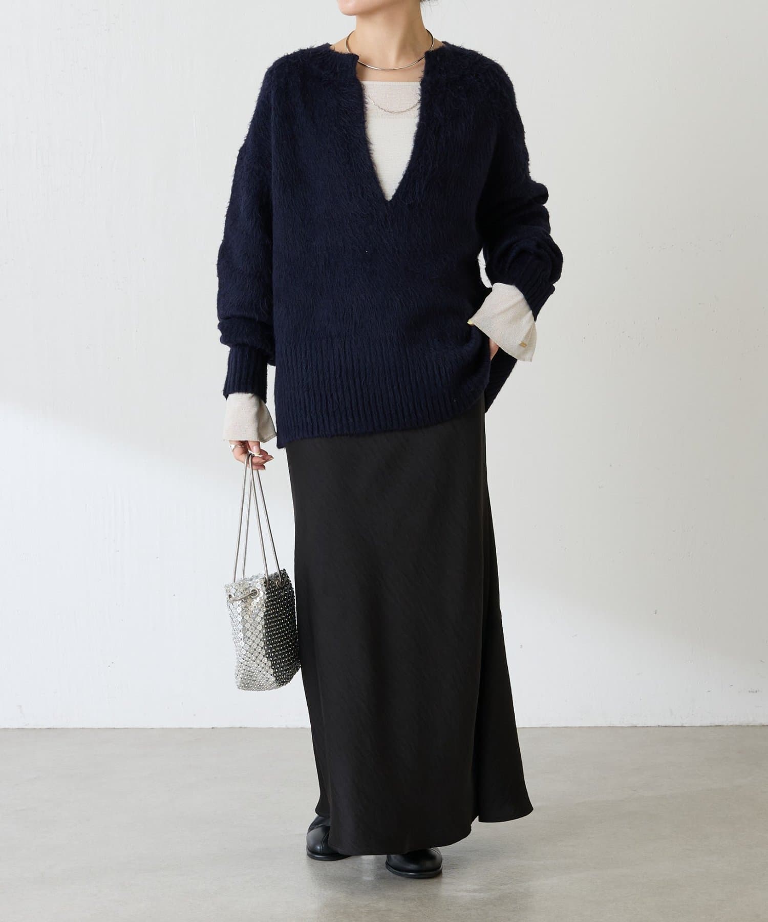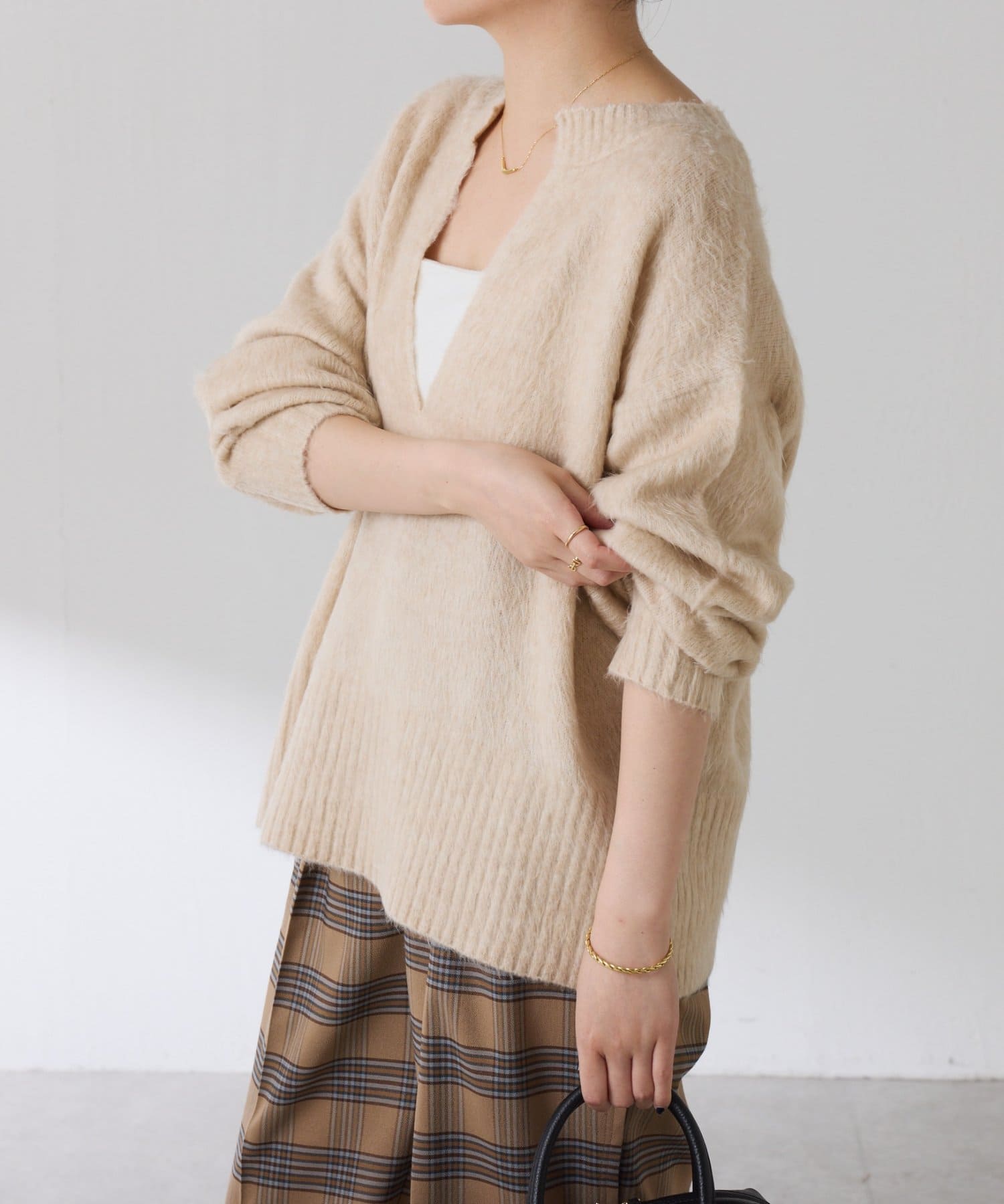 ・とにかく軽いエアリーな糸を使用した深Vニット。着ぶくれ感もなく、ストレスフリーな着心地です。