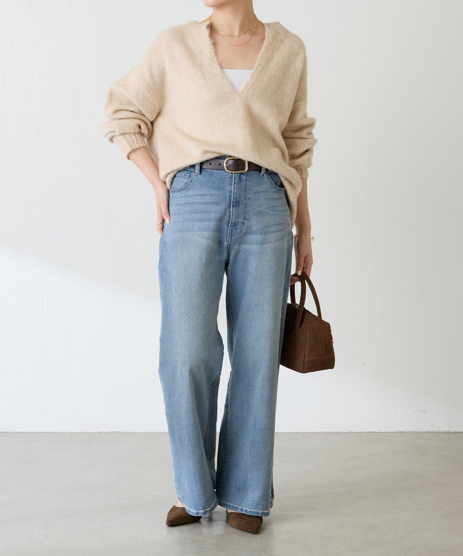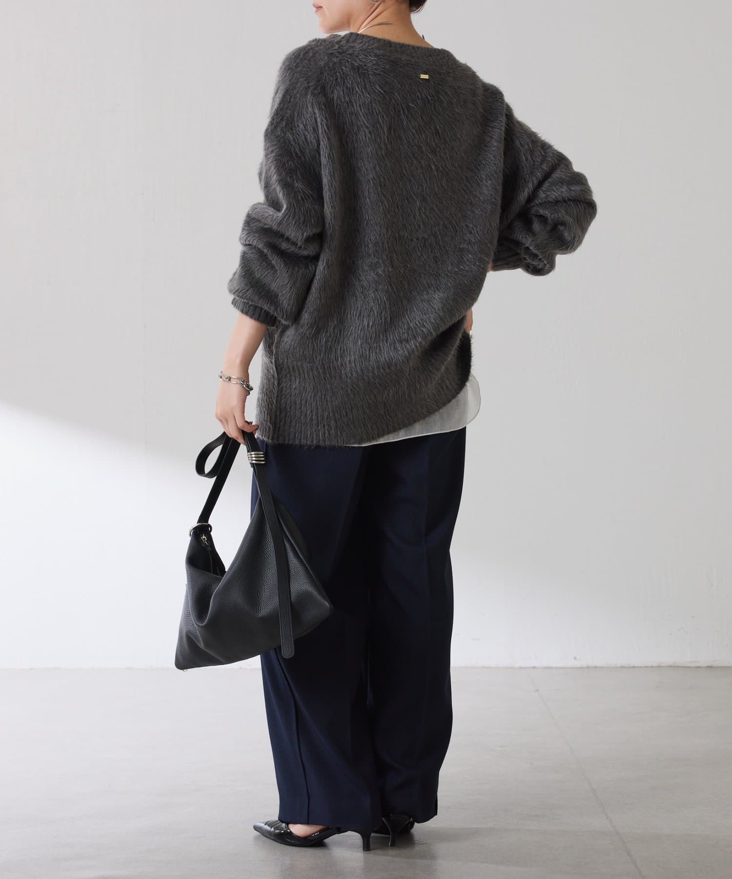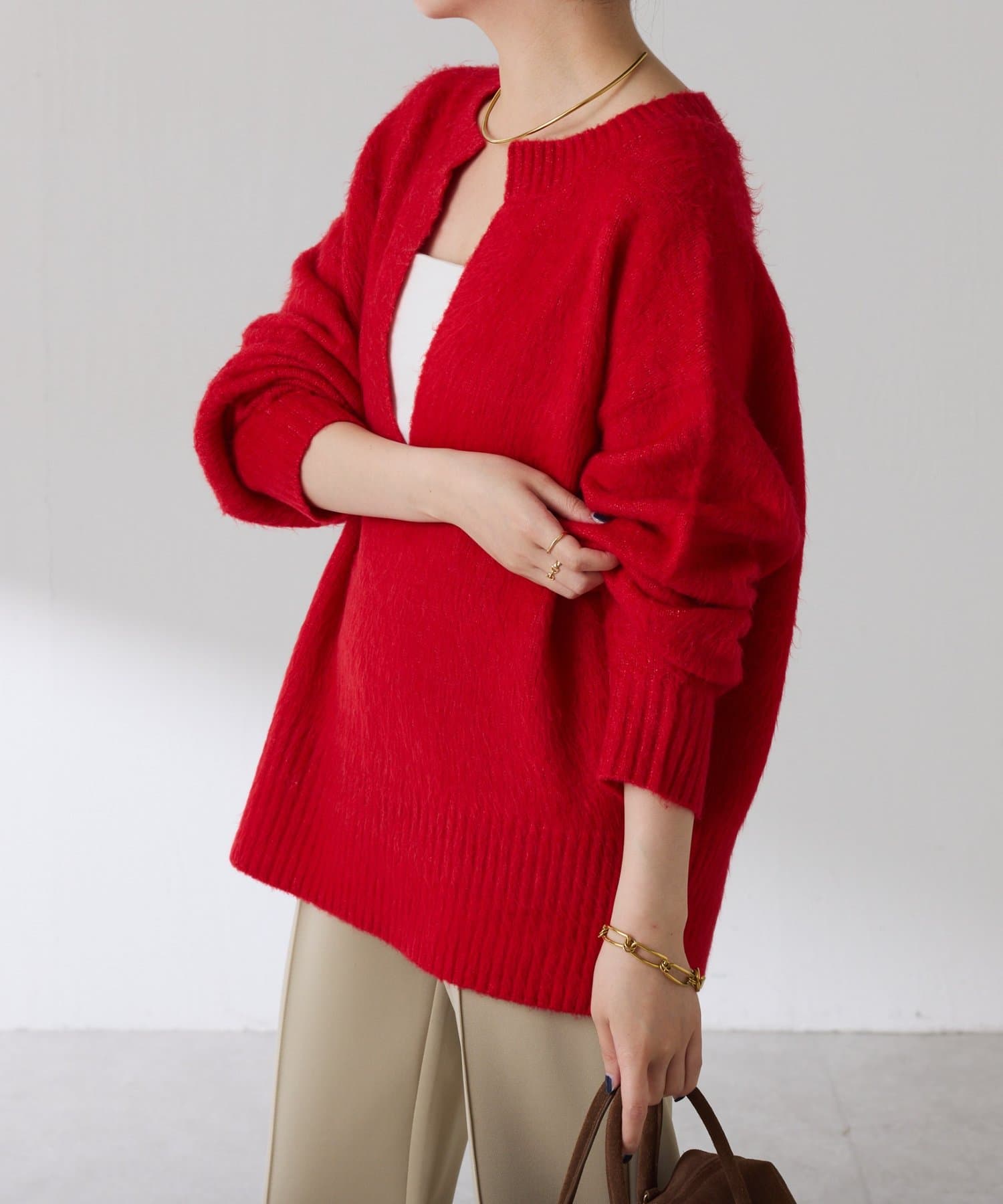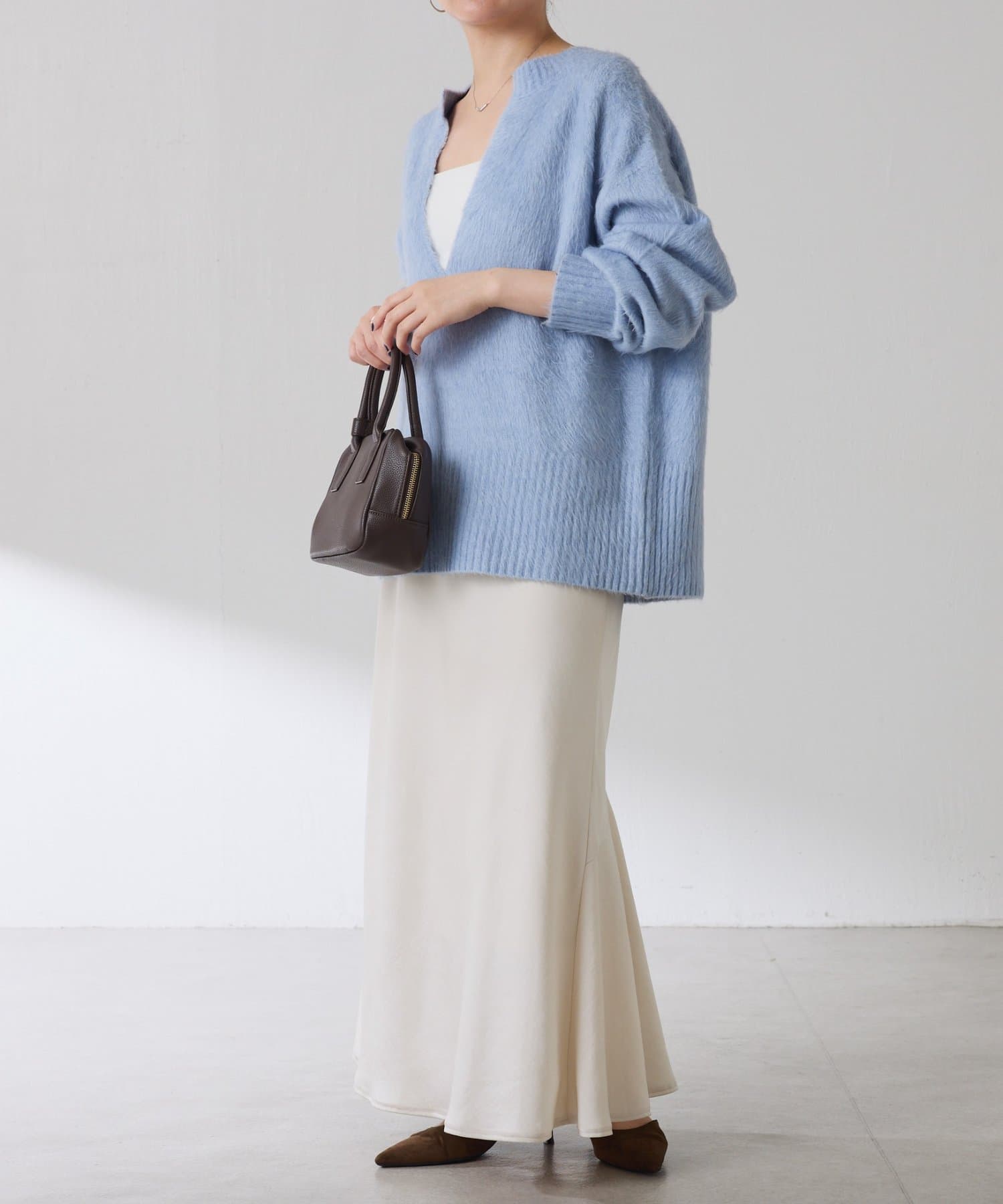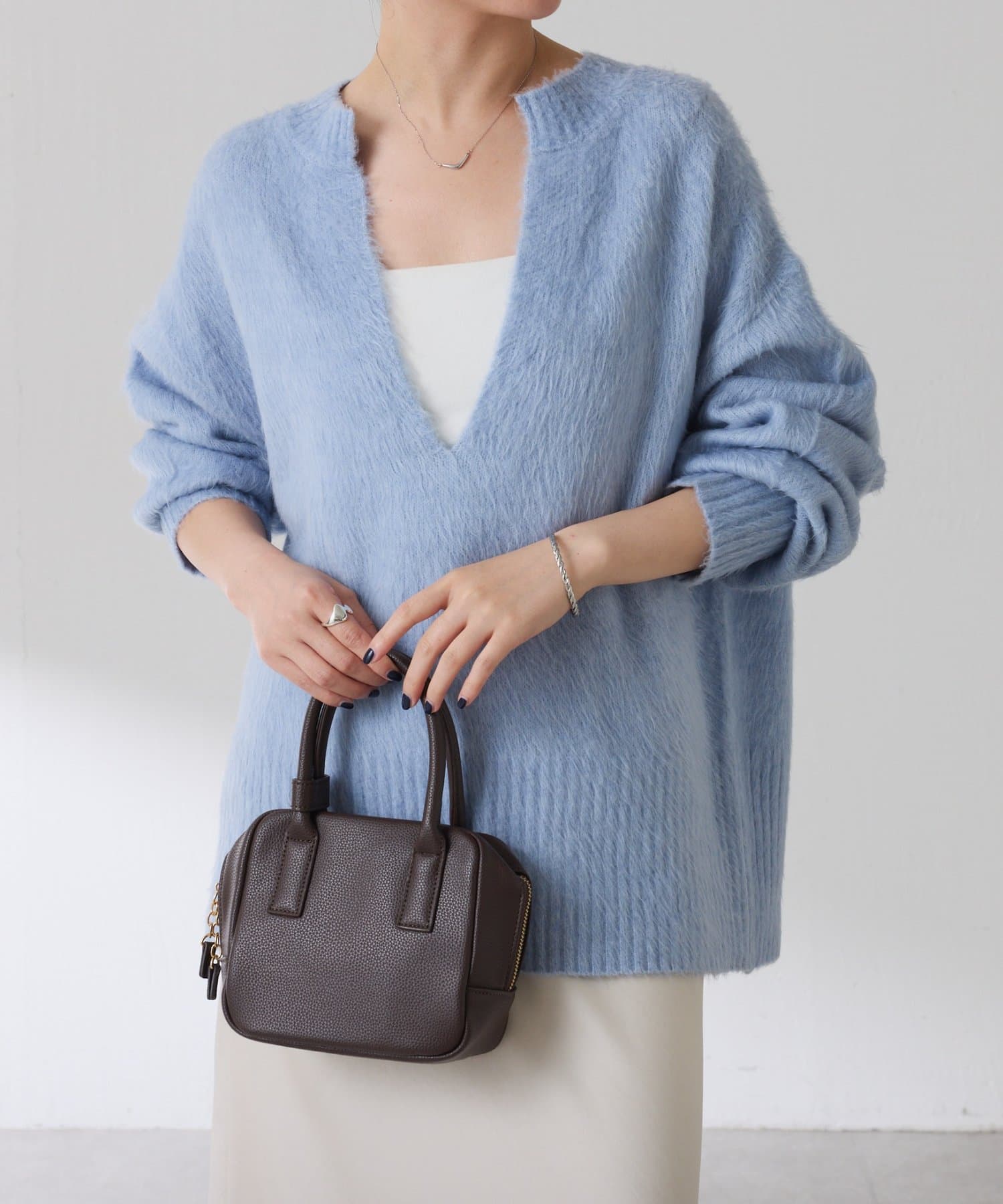 ・とにかく軽いエアリーな糸を使用した深Vニット。着ぶくれ感もなく、ストレスフリーな着心地です。