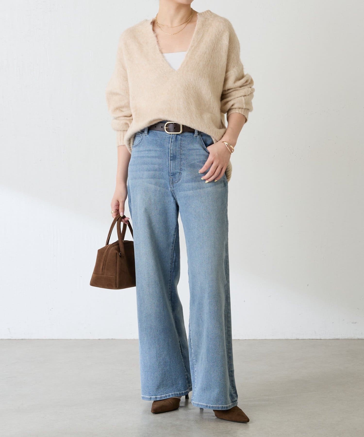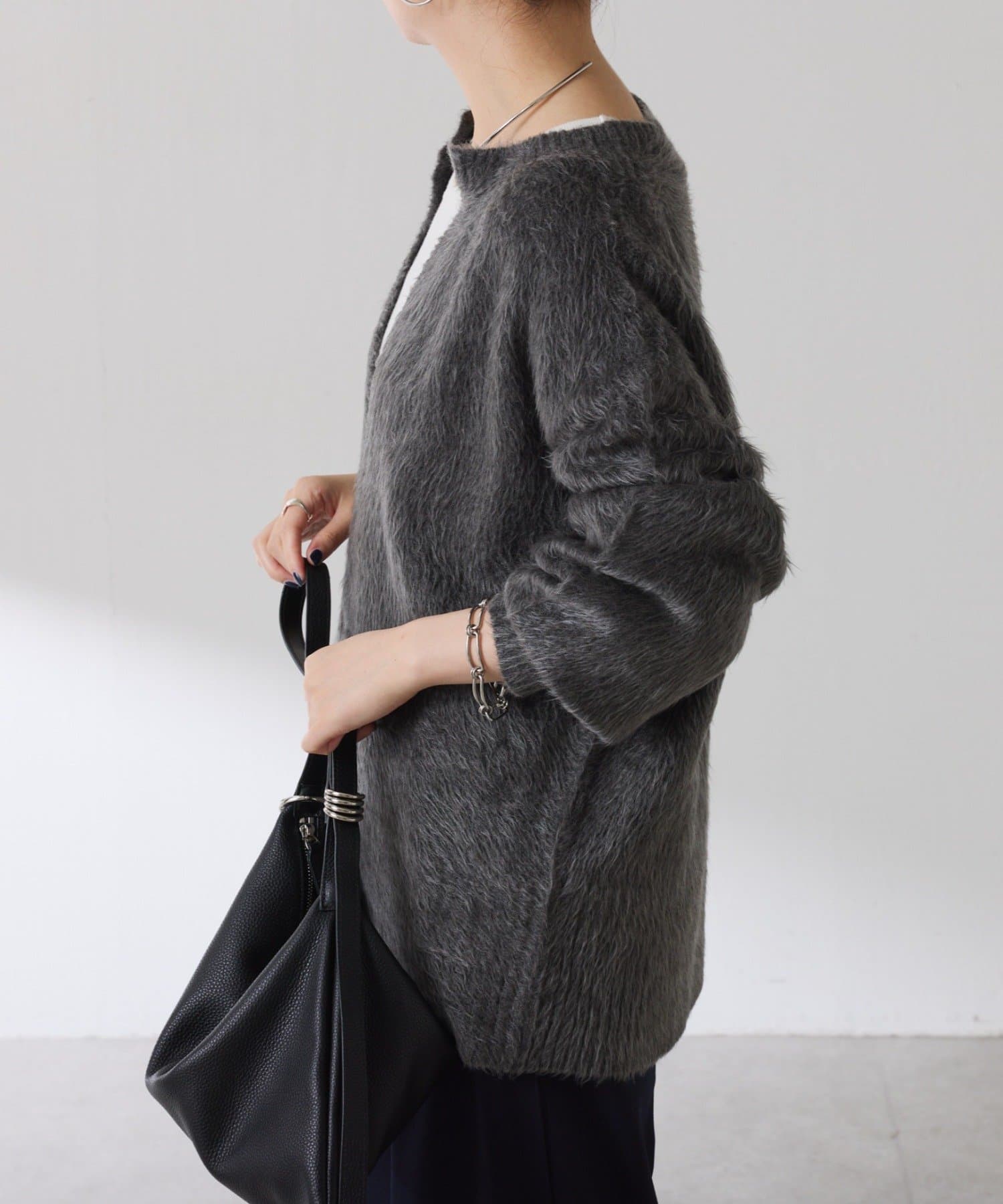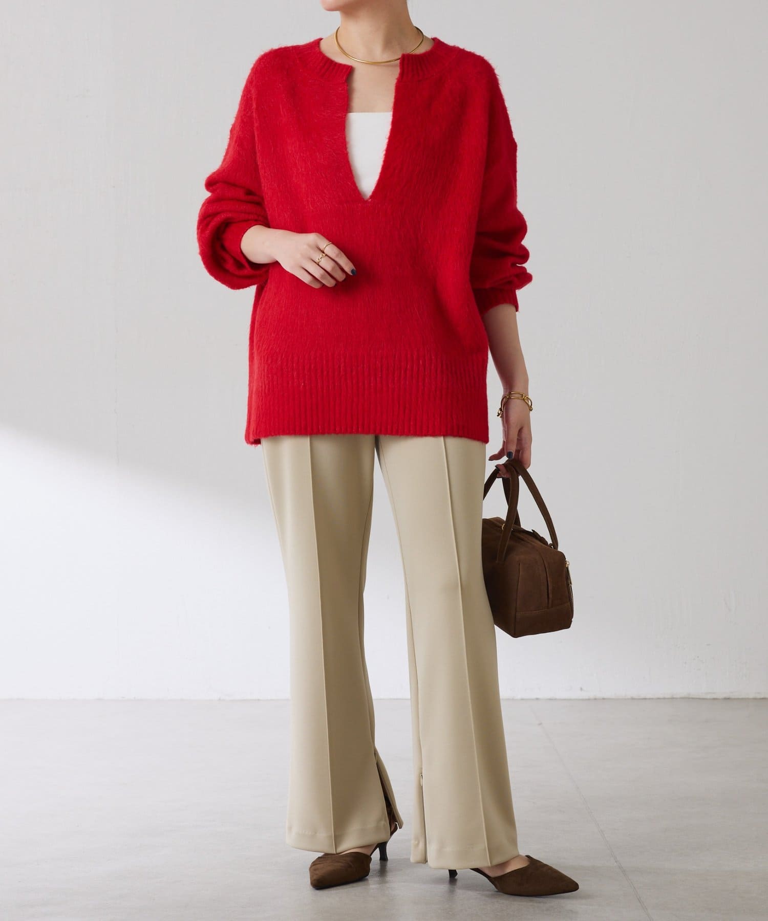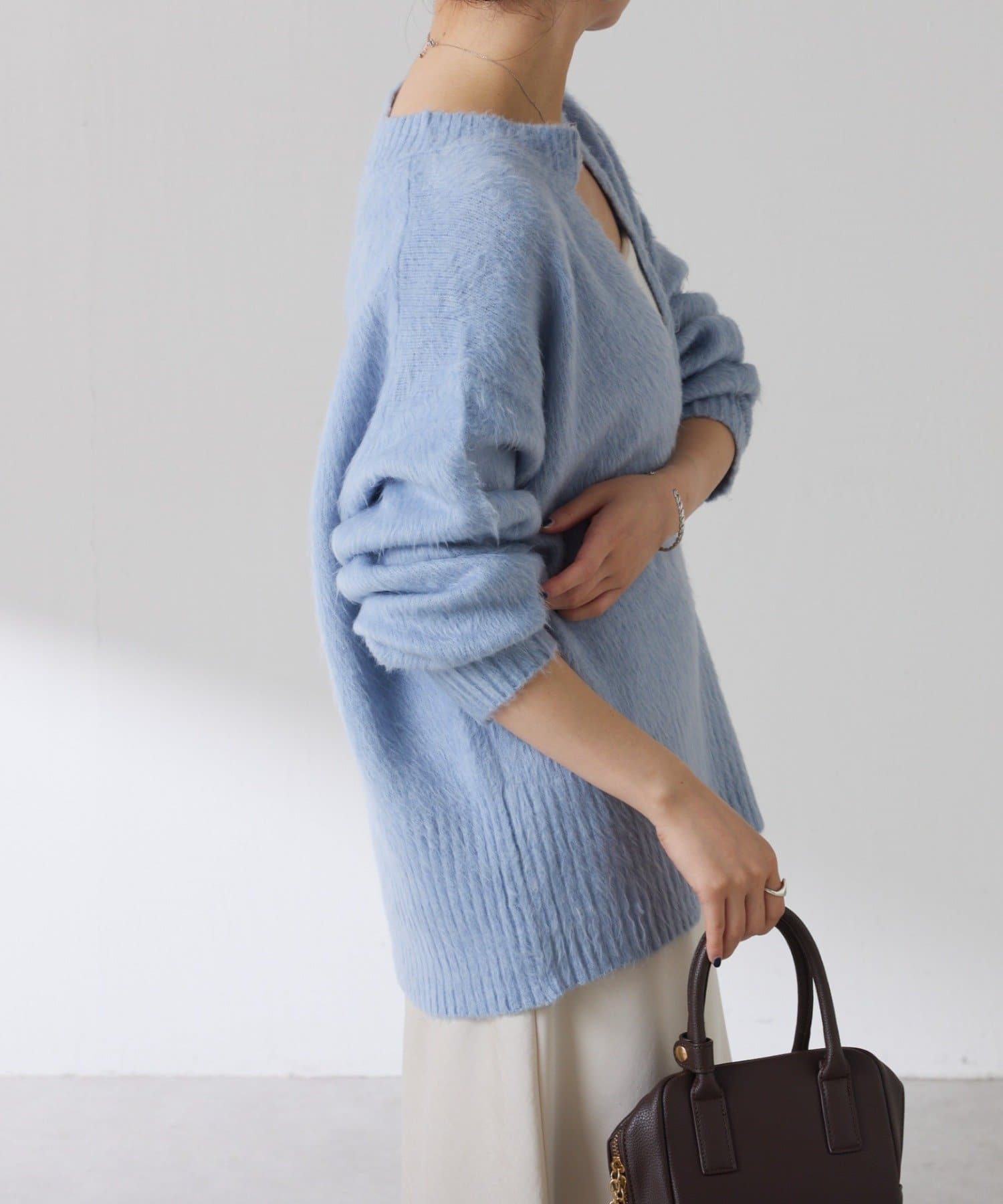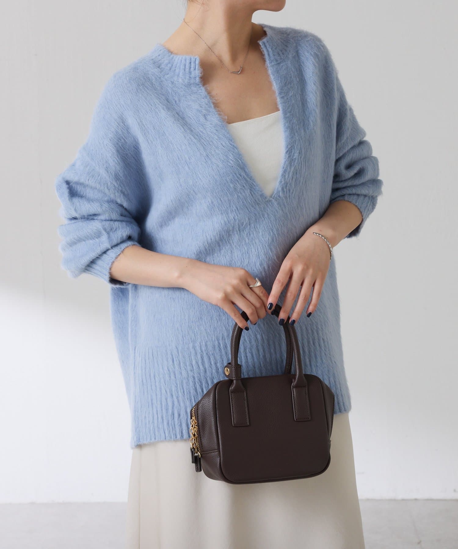 ・とにかく軽いエアリーな糸を使用した深Vニット。着ぶくれ感もなく、ストレスフリーな着心地です。